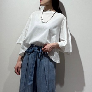 5分袖が二の腕周りをさりげなくカバーし、ショート丈でスカートやワイドボトムとも合わせやすい丈感になっています。