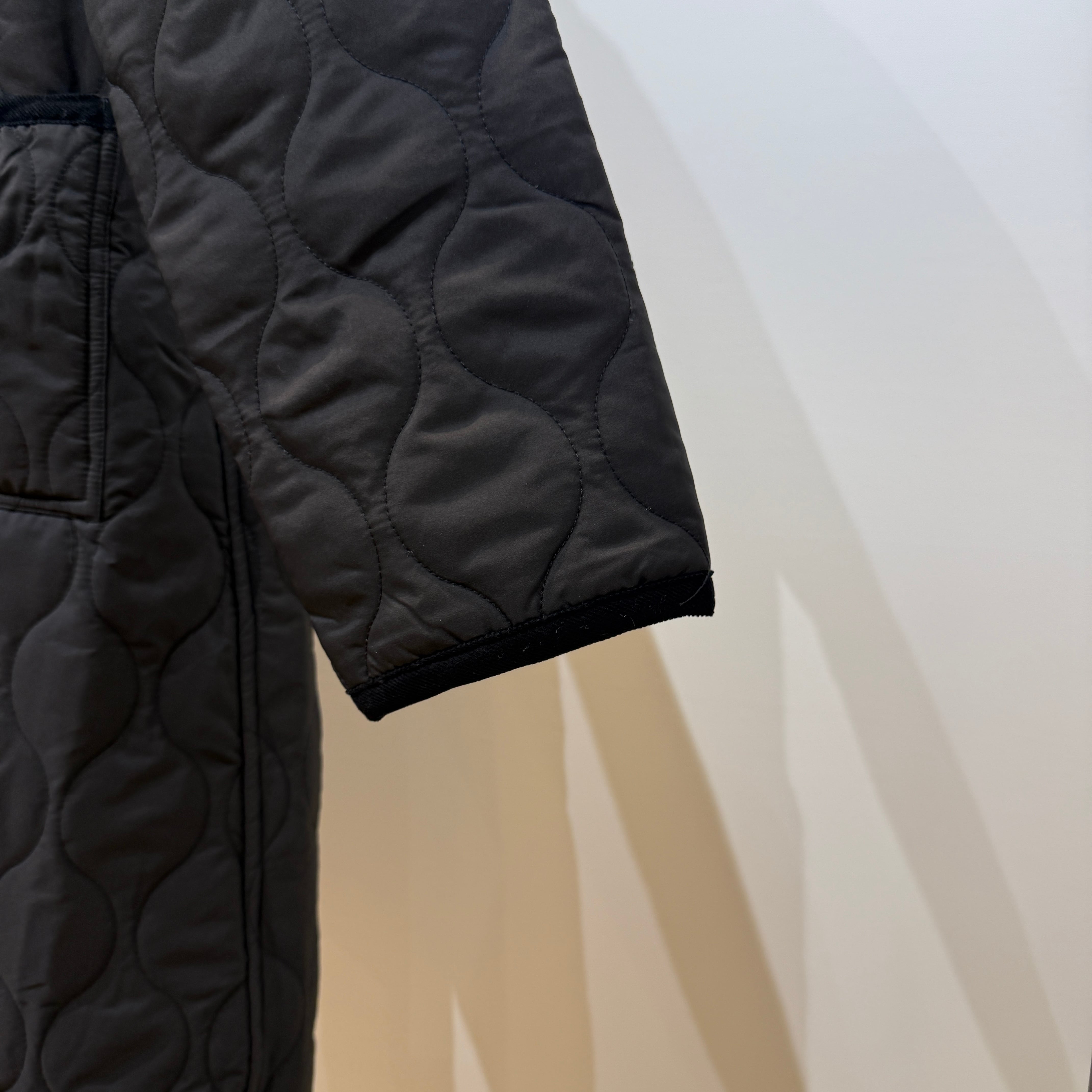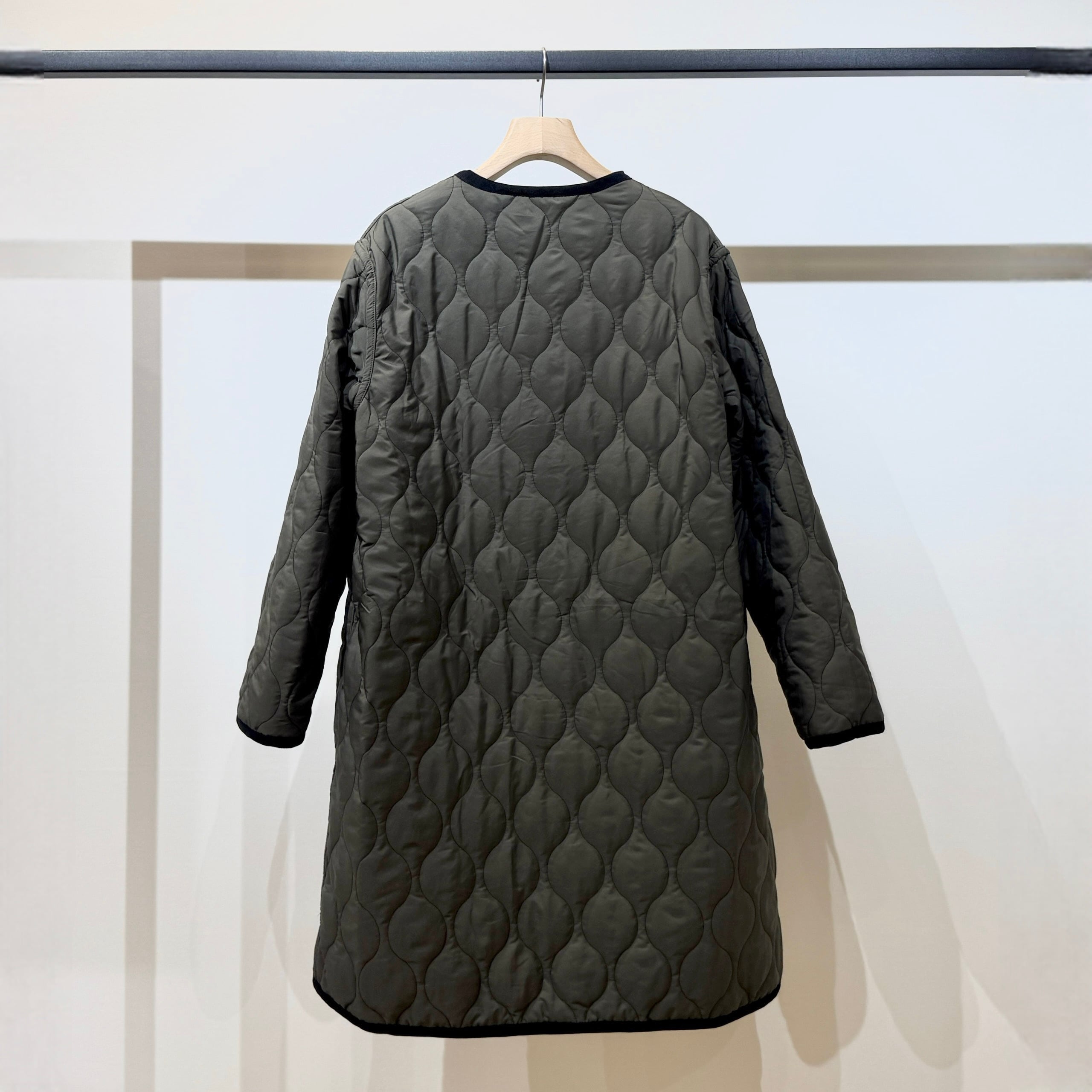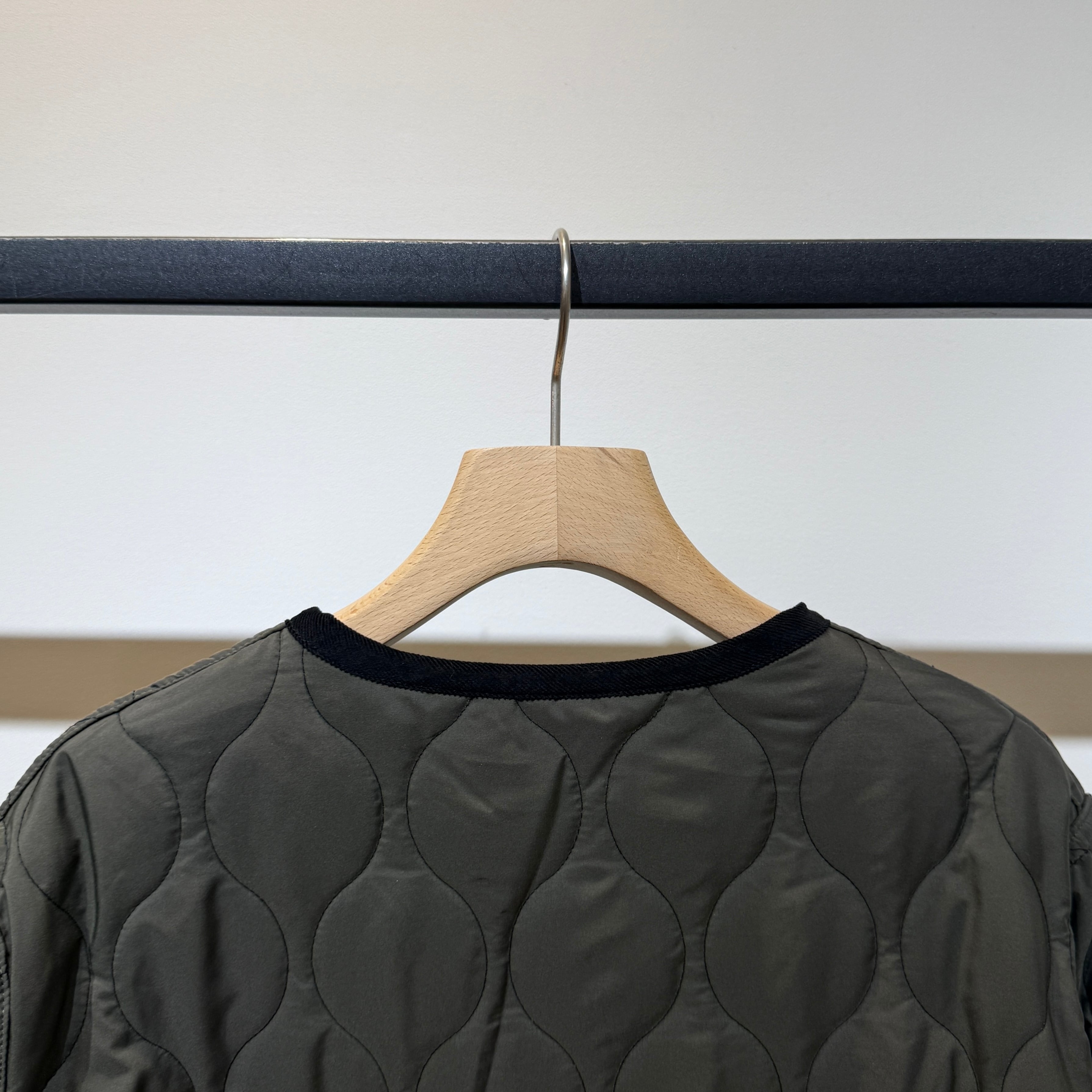 トリミングやくるみボタンに使用したコーデュロイはどちらの面でも映えるカラーをチョイス。カジュアル過ぎないやや小さめのオリジナルオニオンキルティングで上品な雰囲気に仕上げています。