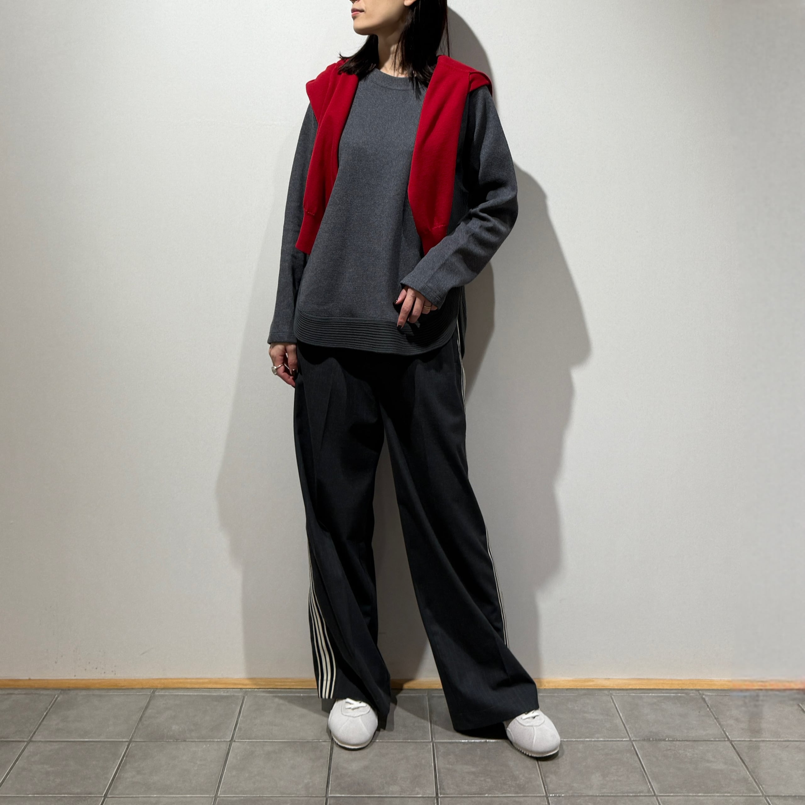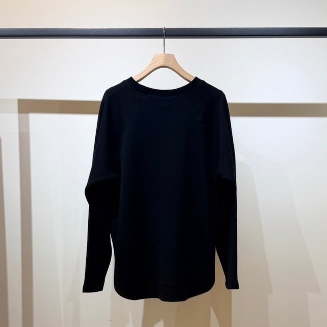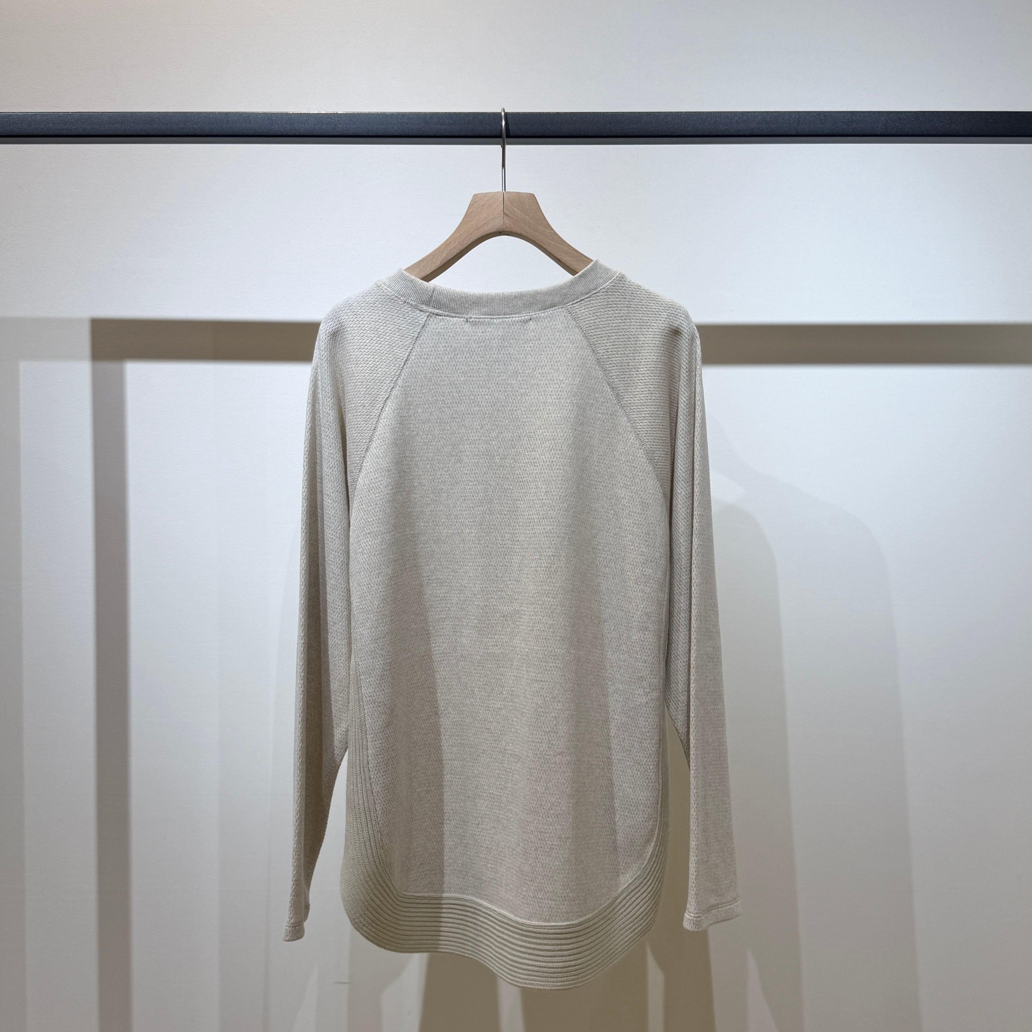 ラウンドヘムにテープ状で編み立てたニットを施した、ラグラン袖のプルオーバー。