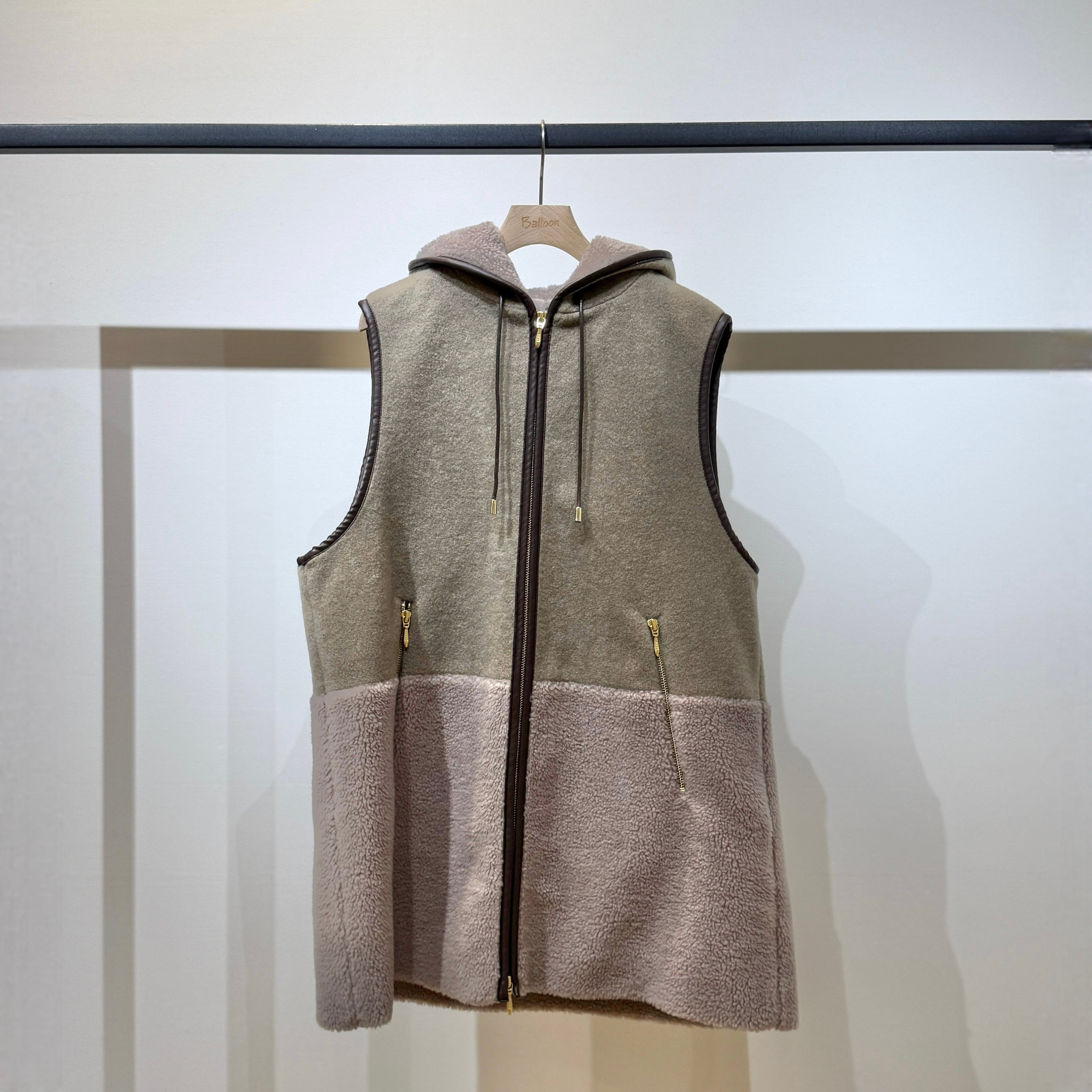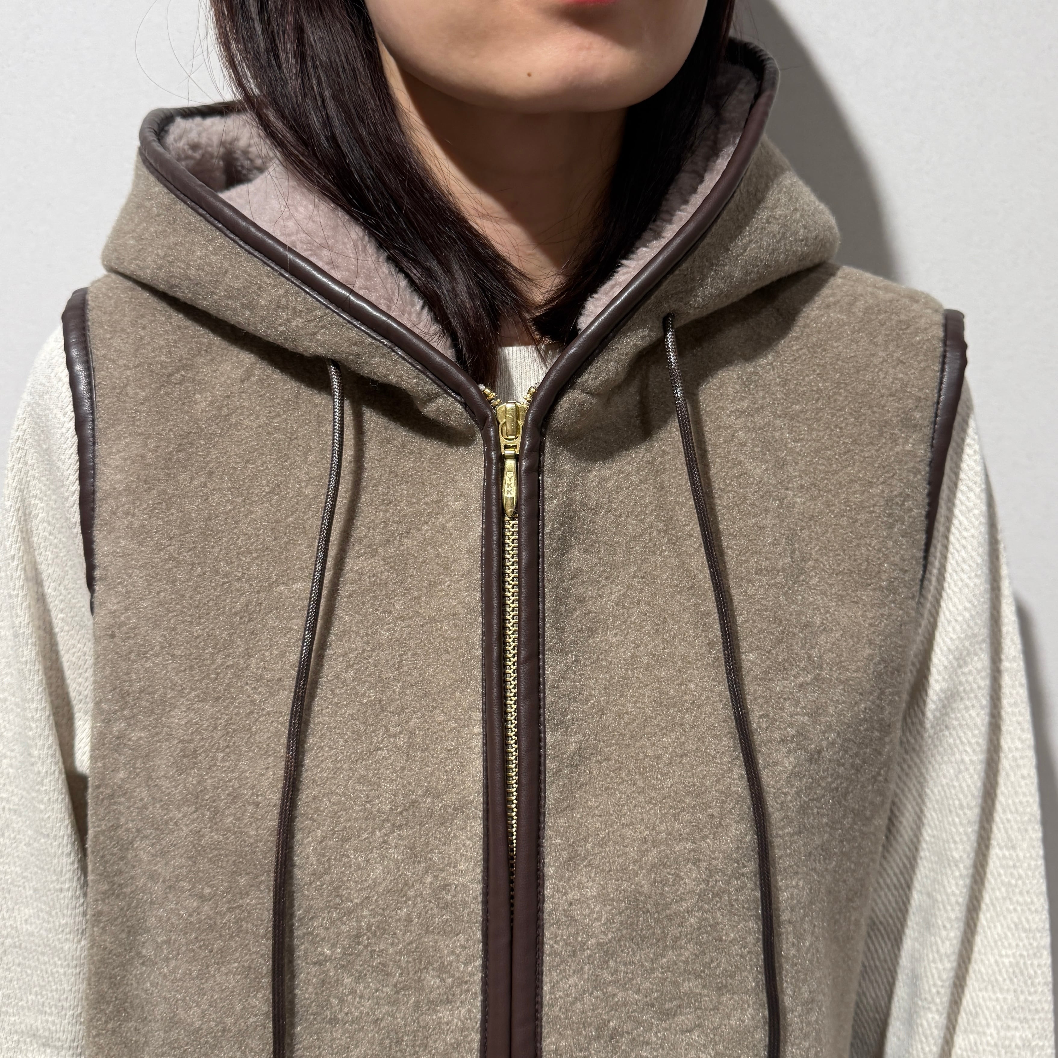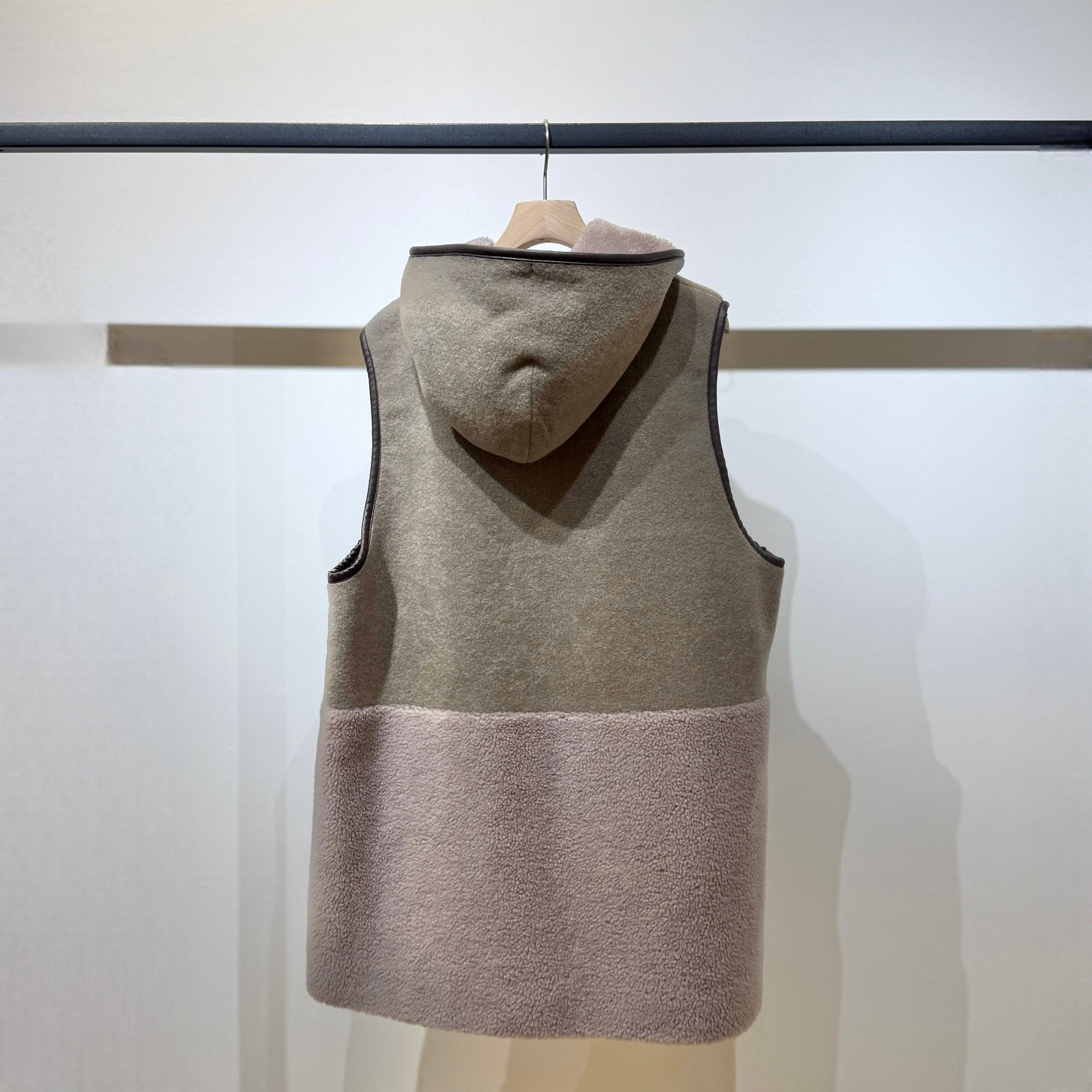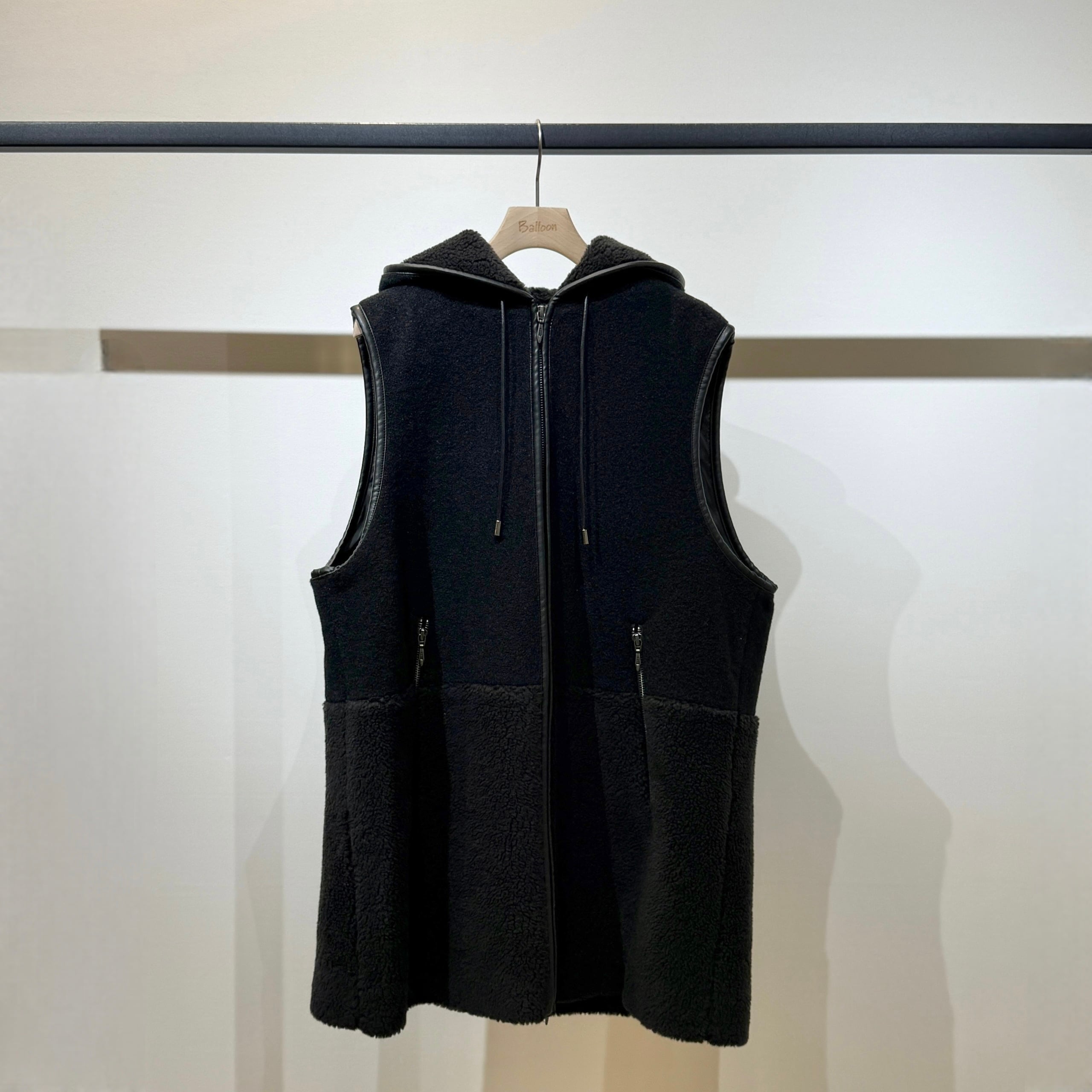 リサイクル原料を使用したウール混のエコファー素材で仕立てた、季節感あふれるフード付きベスト。