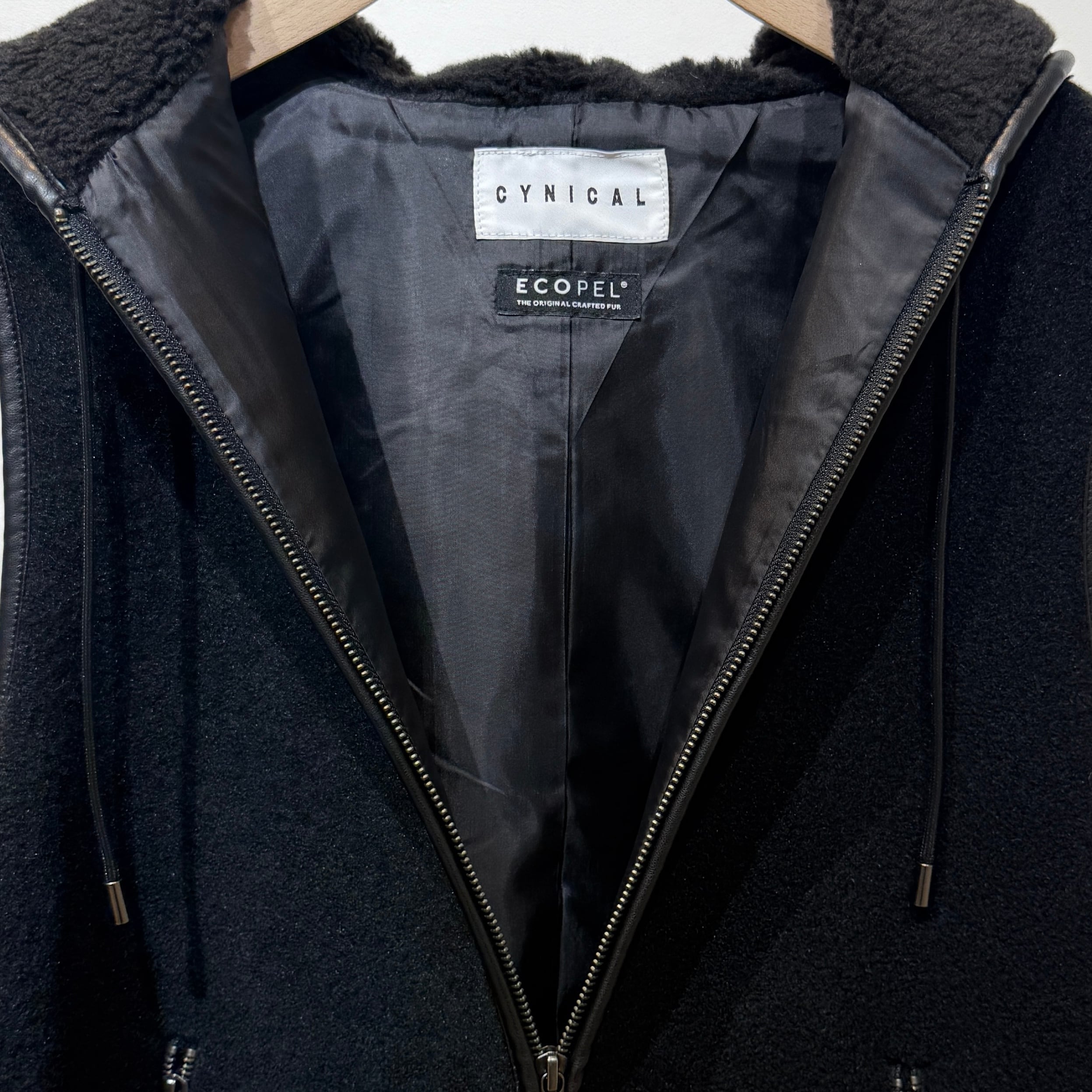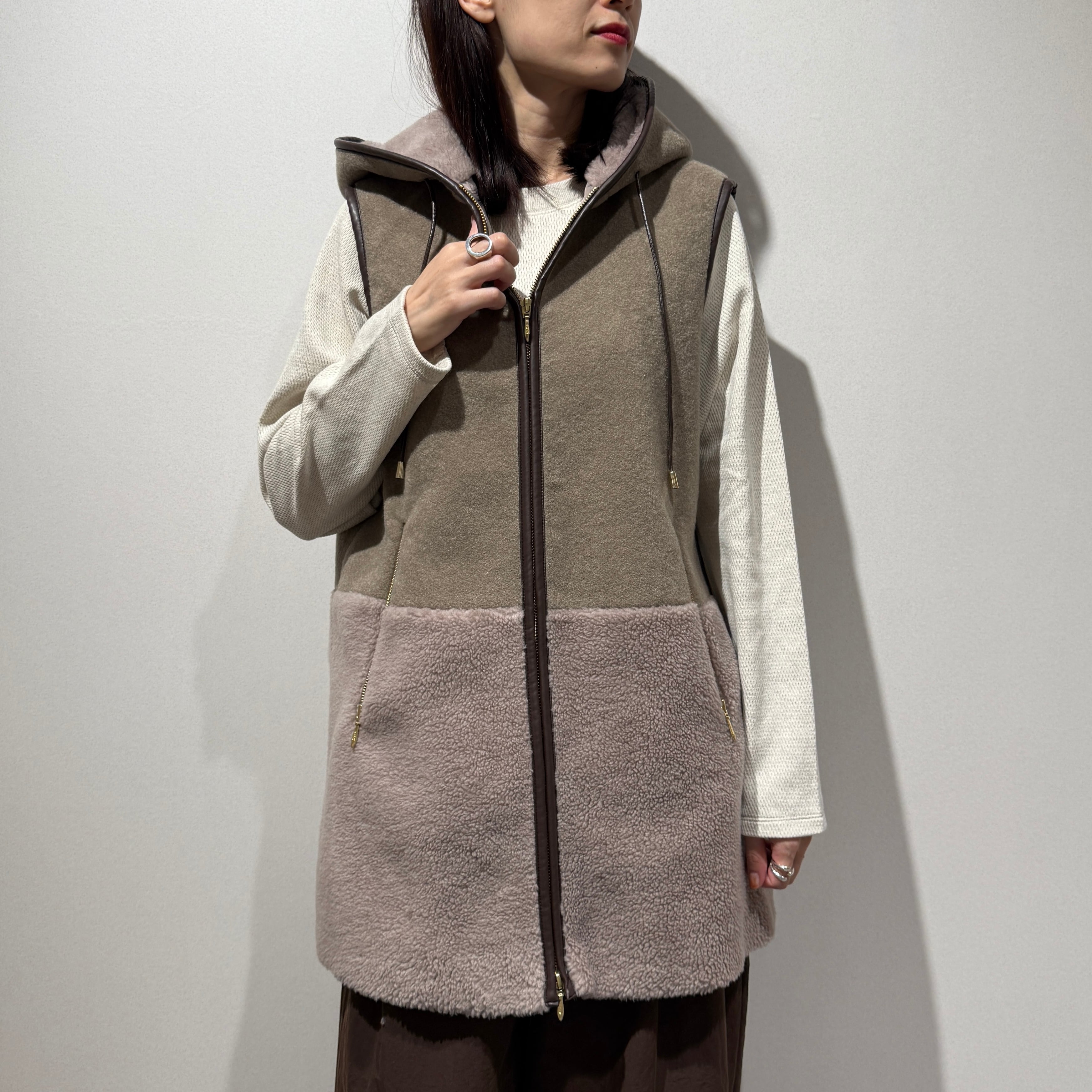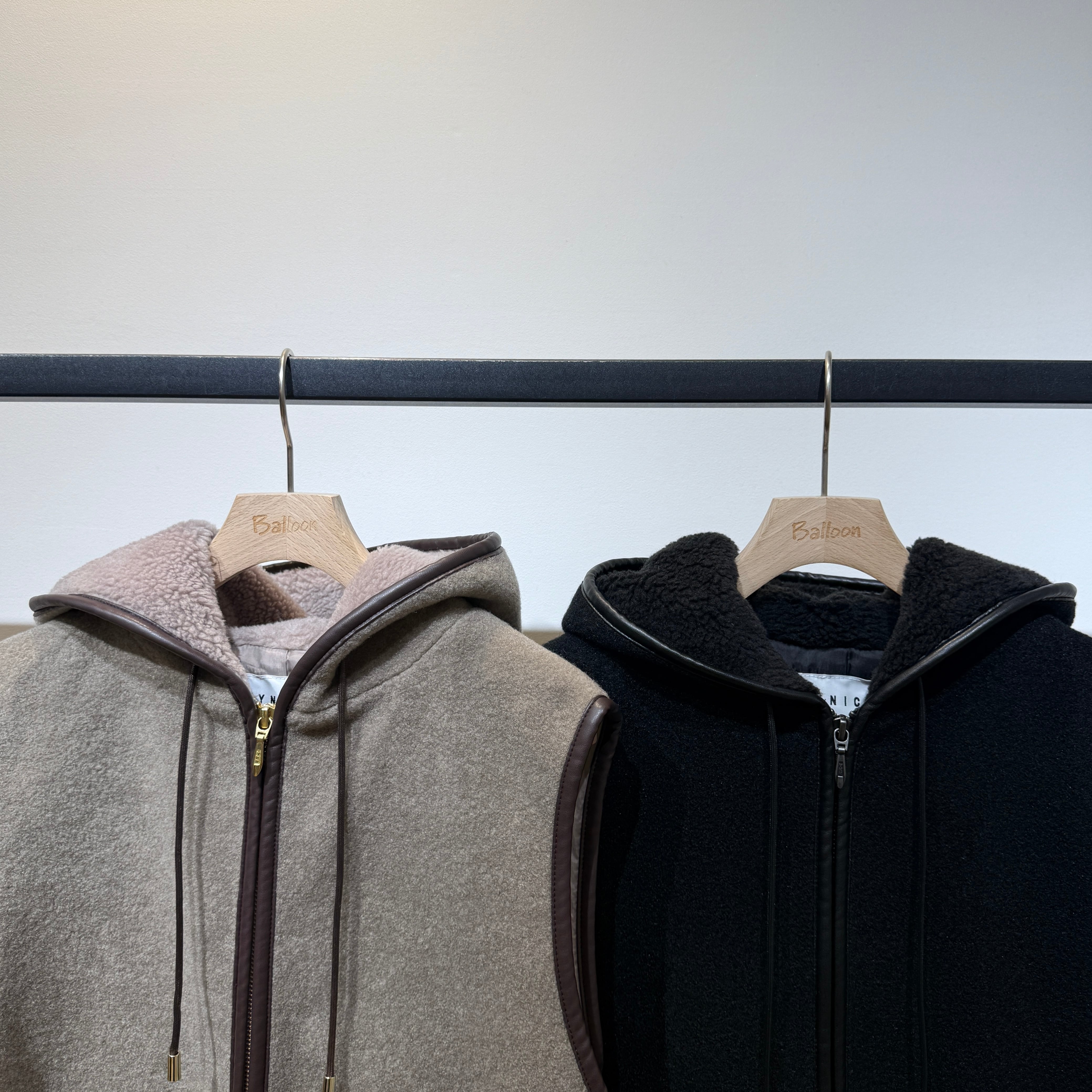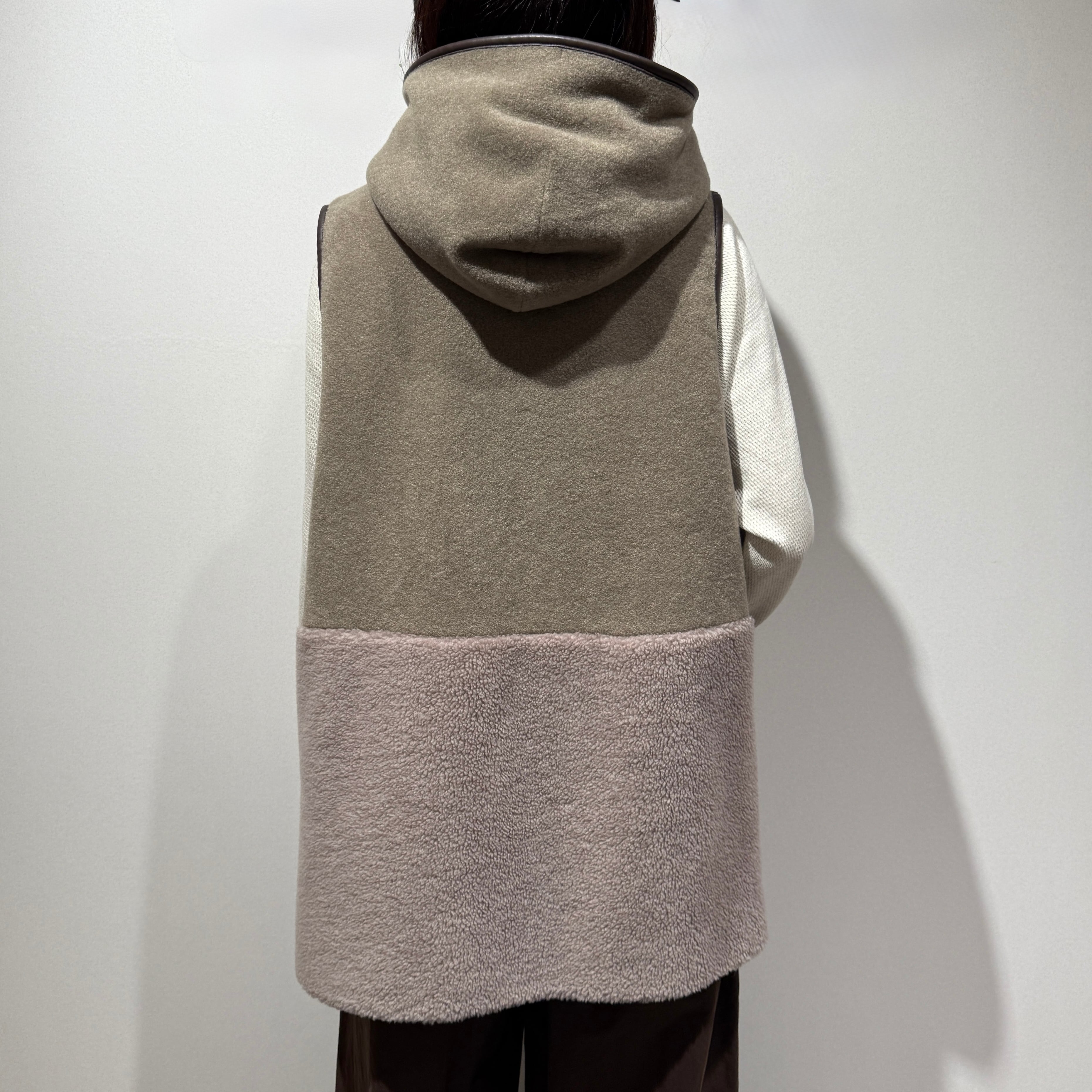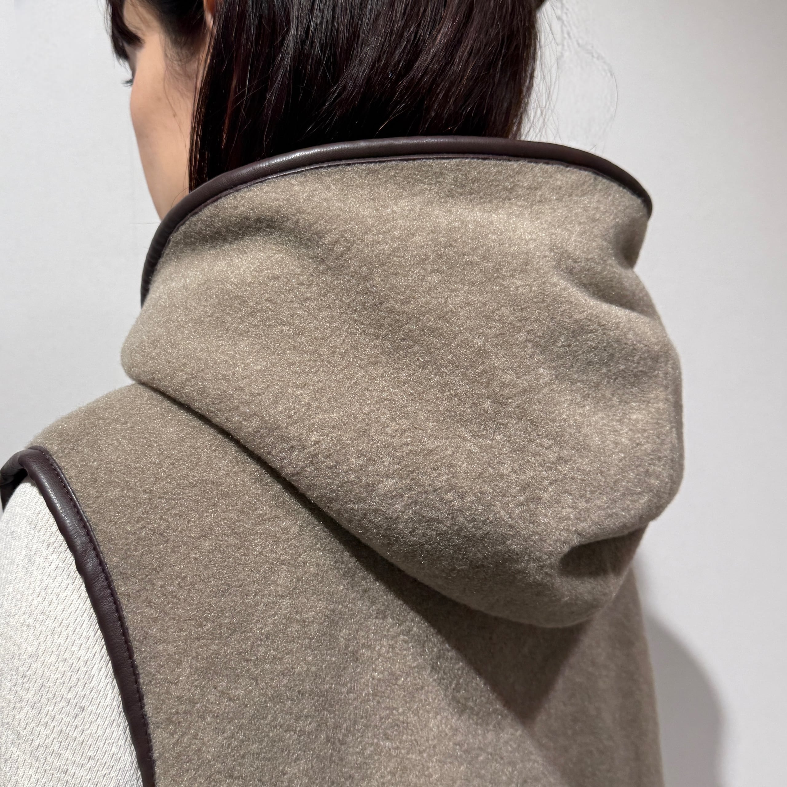 リサイクル原料を使用したウール混のエコファー素材で仕立てた、季節感あふれるフード付きベスト。