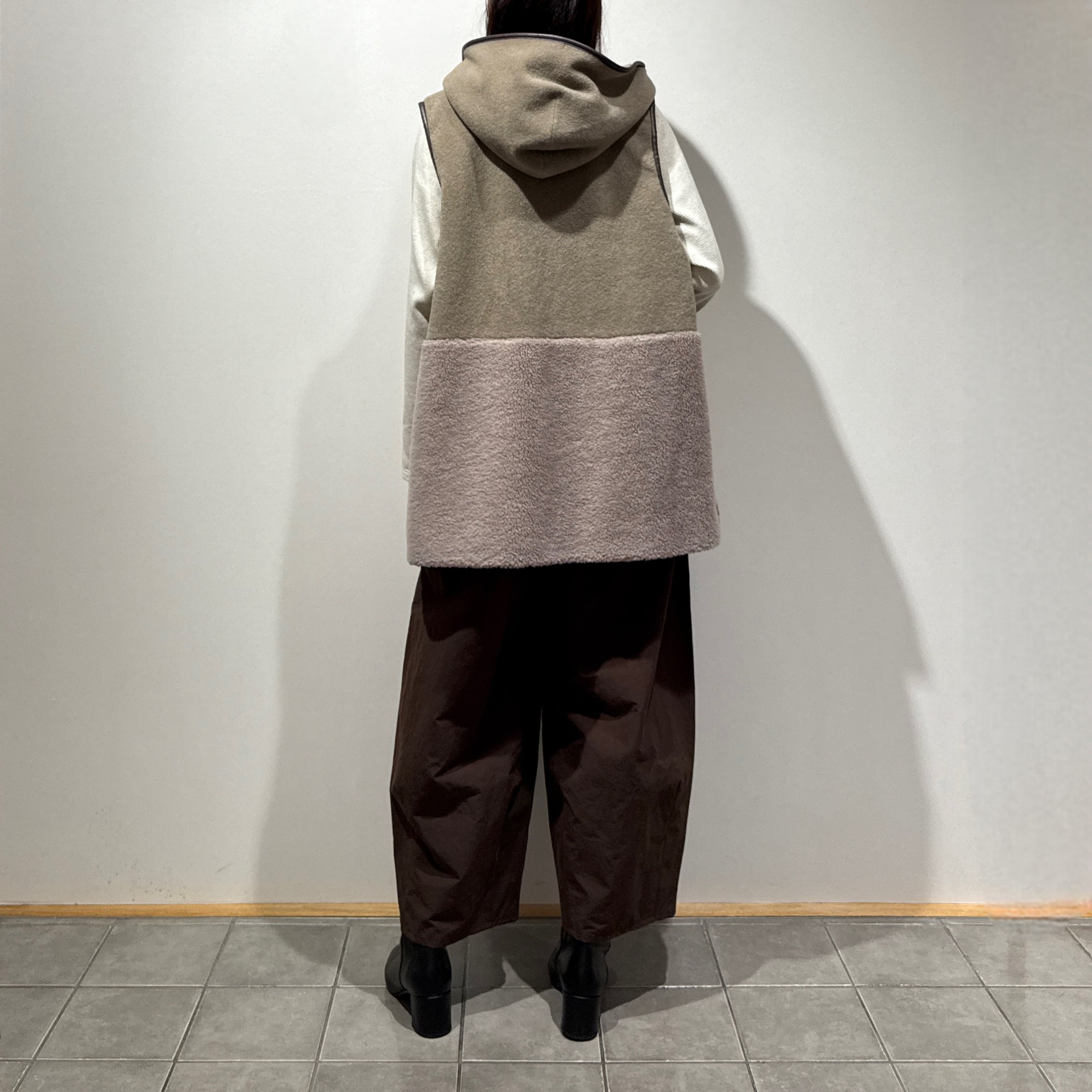 切り替えデザインが印象的で、立体感のあるボア素材がふっくらとした温もりを演出。フード付きでカジュアルさもありつつ、上品に仕上げた大人のリラックススタイルにぴったりです。