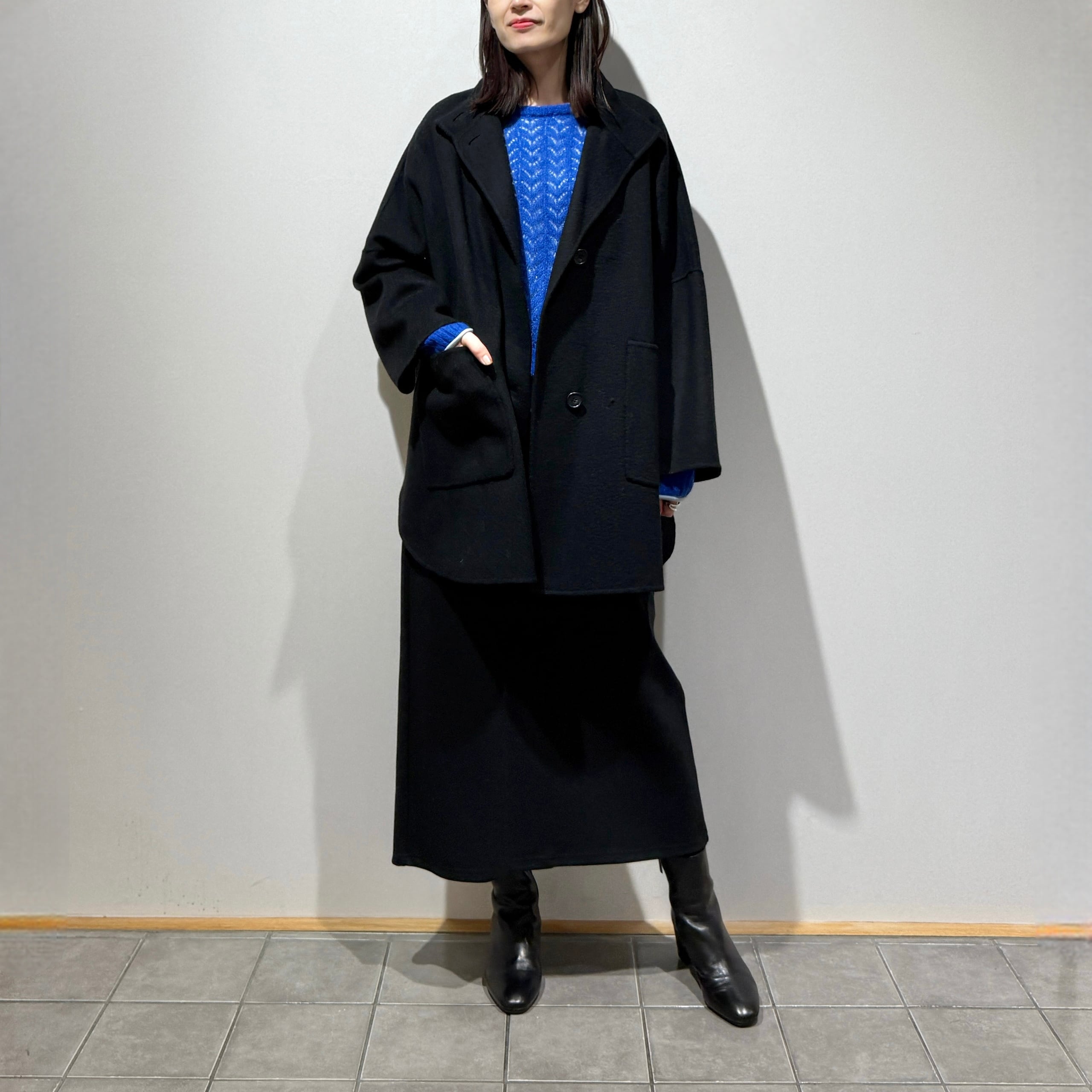 柔らかくしっとりとしたタッチで、ウール特有のチクチク感が少なくとてもなめらか。ふくらみがありながらも軽く、着膨れしにくい上質素材です。