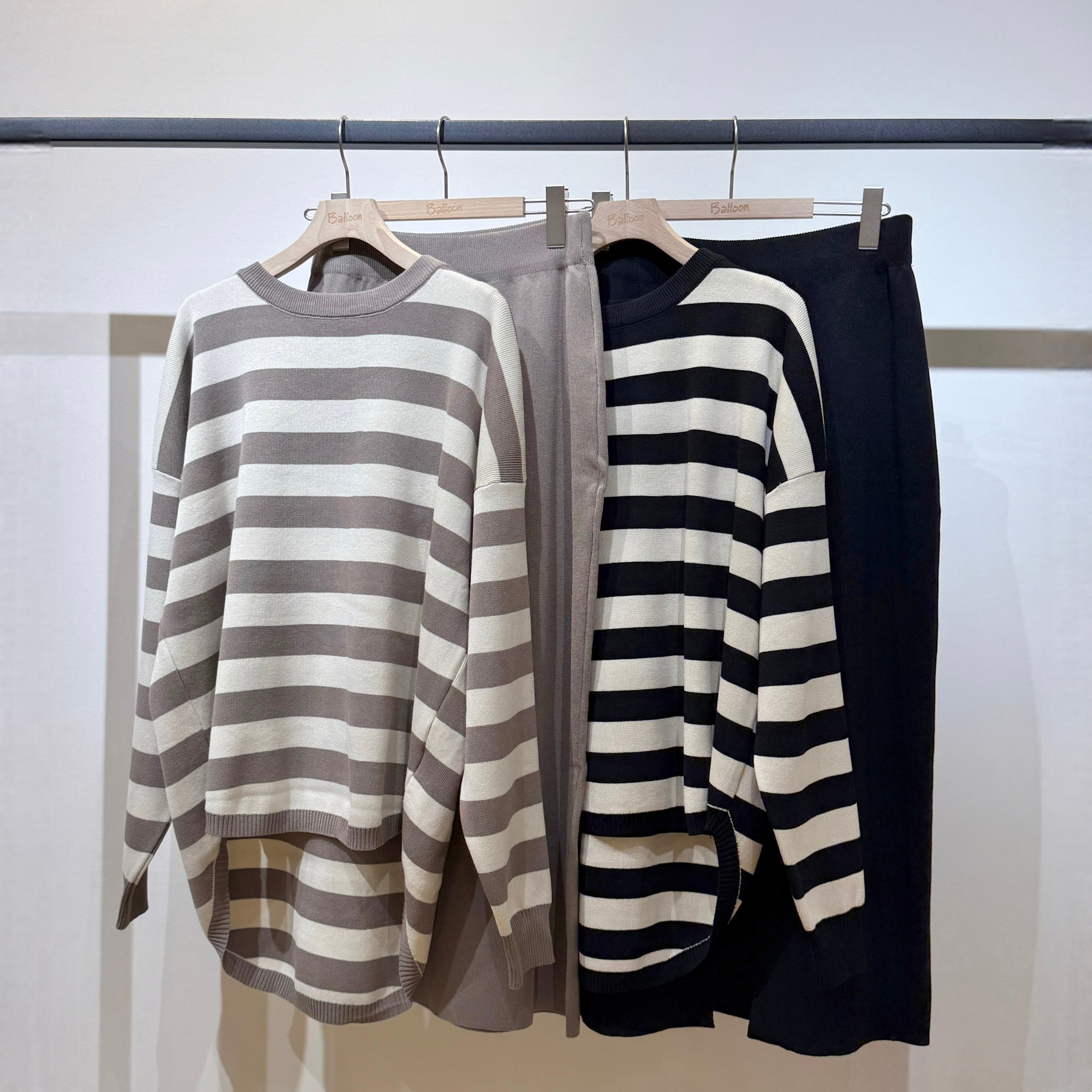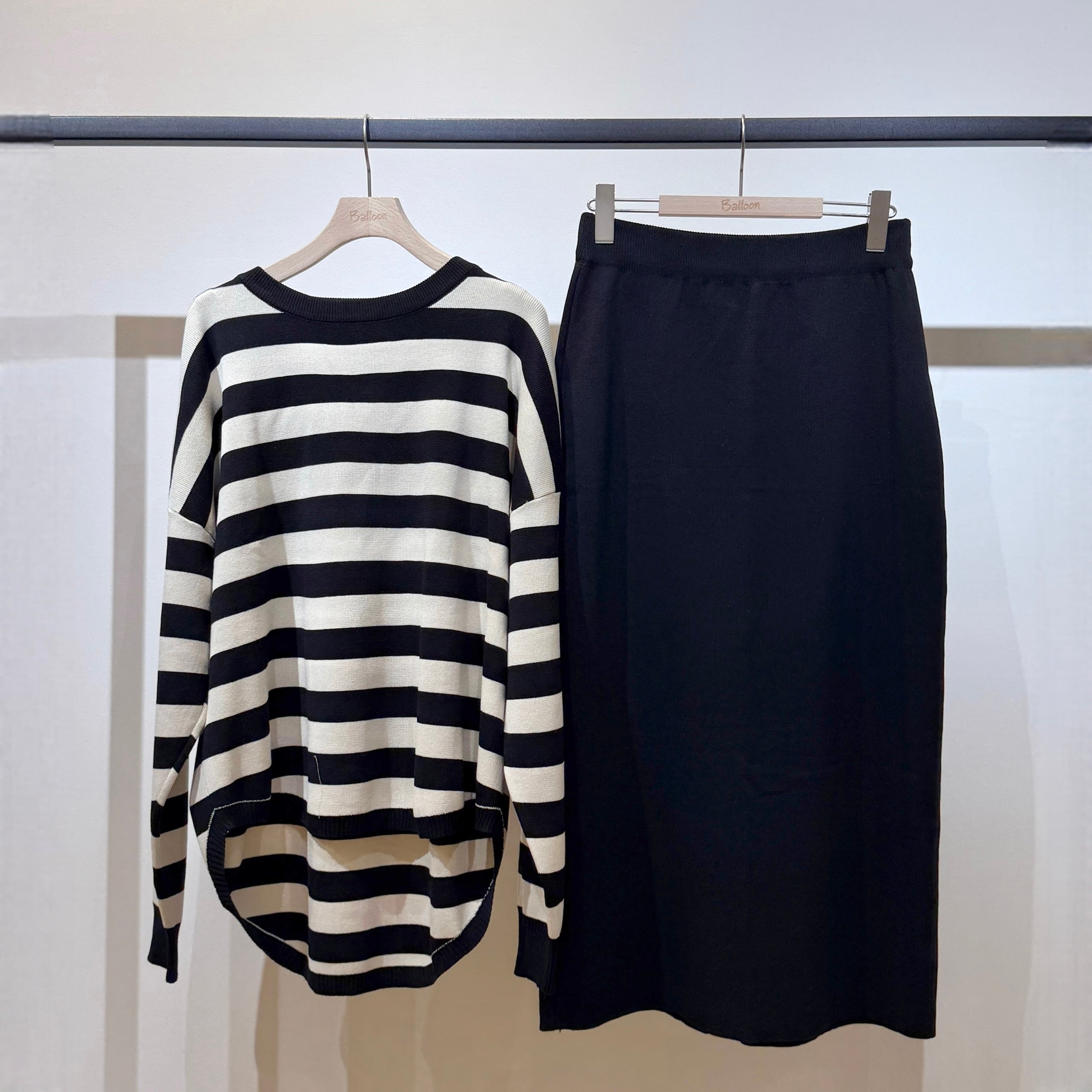 ゆったりとしたボーダーニットに、すっきりIラインのスカートを合わせたバランスの良いシルエット。単品使いもできるので、着回し力も抜群です。