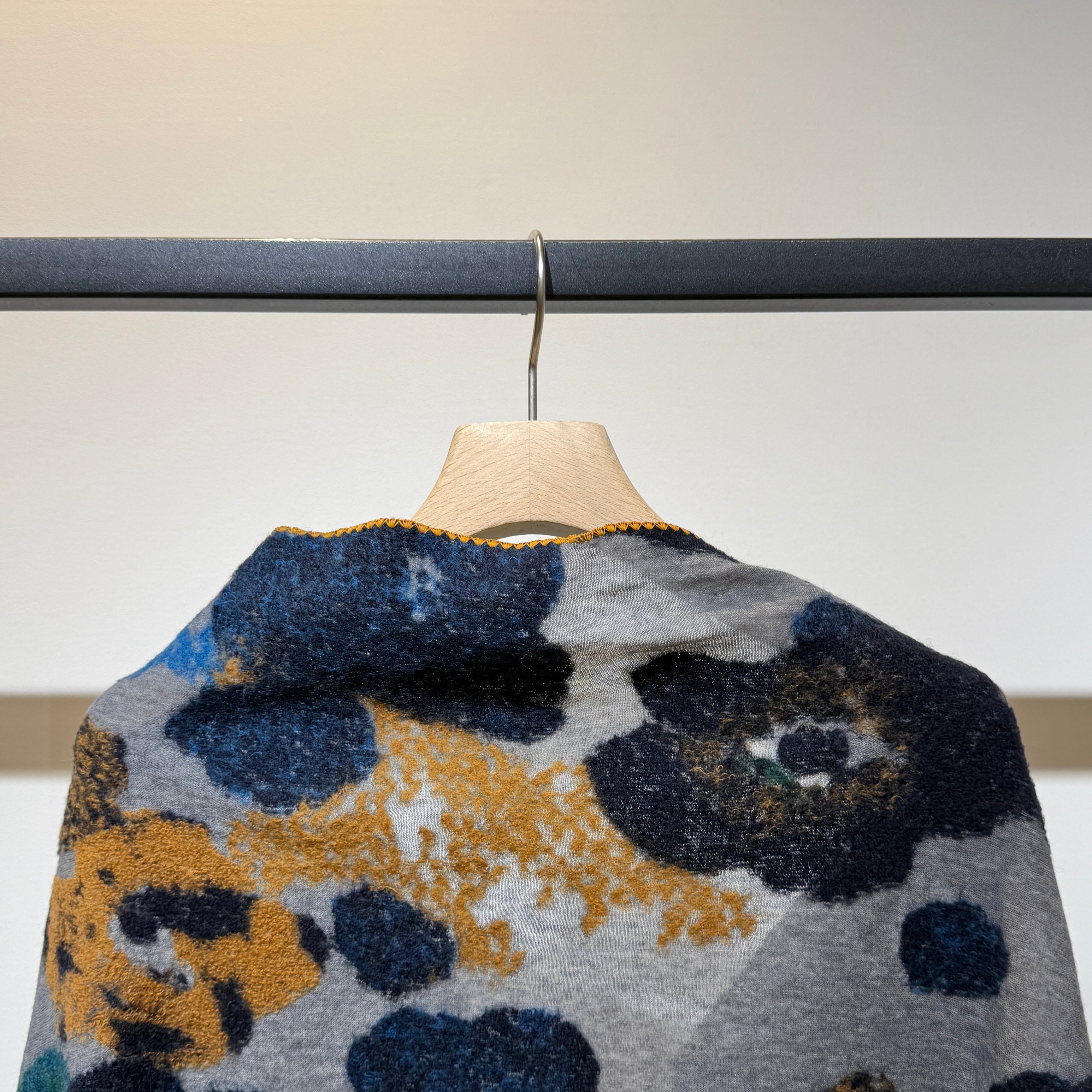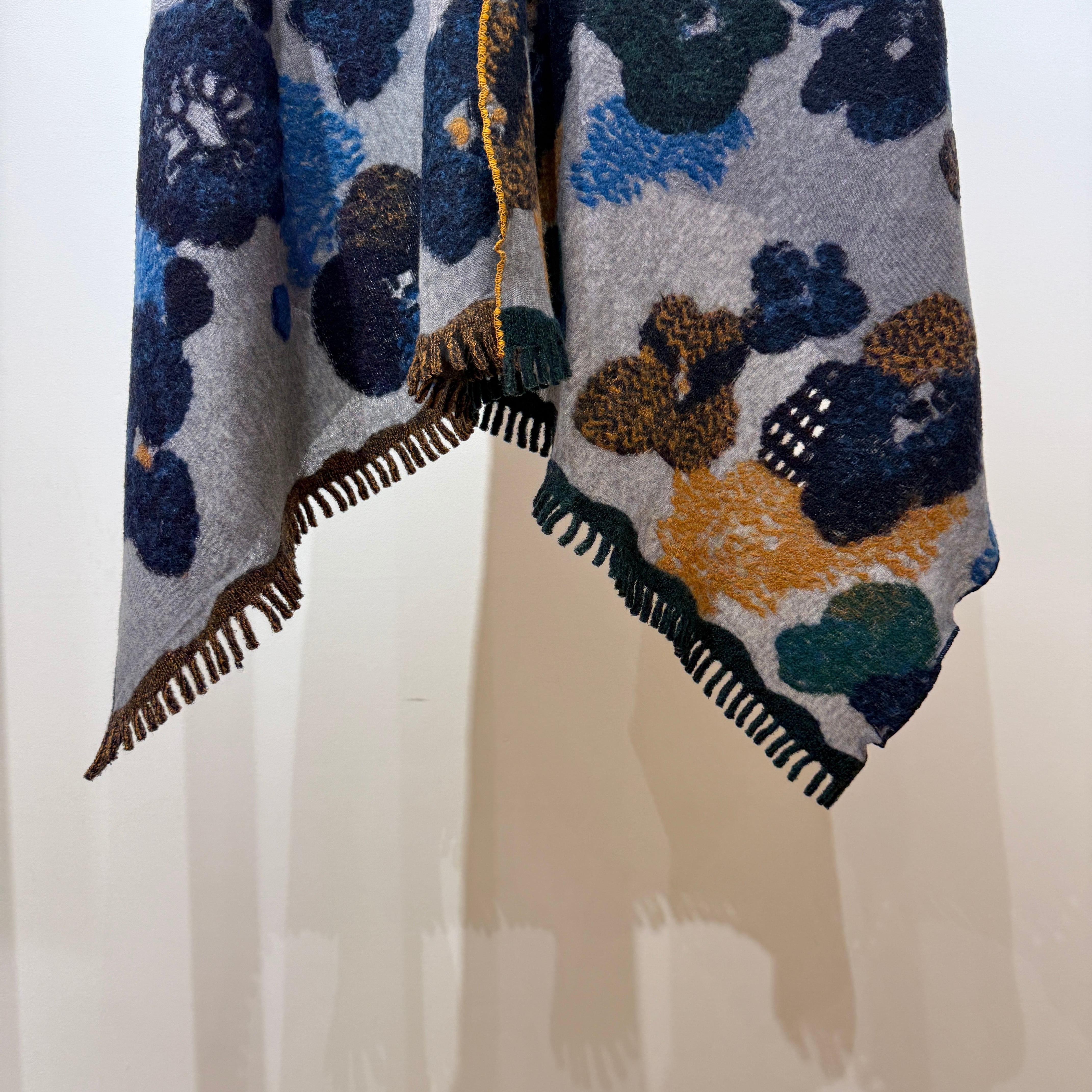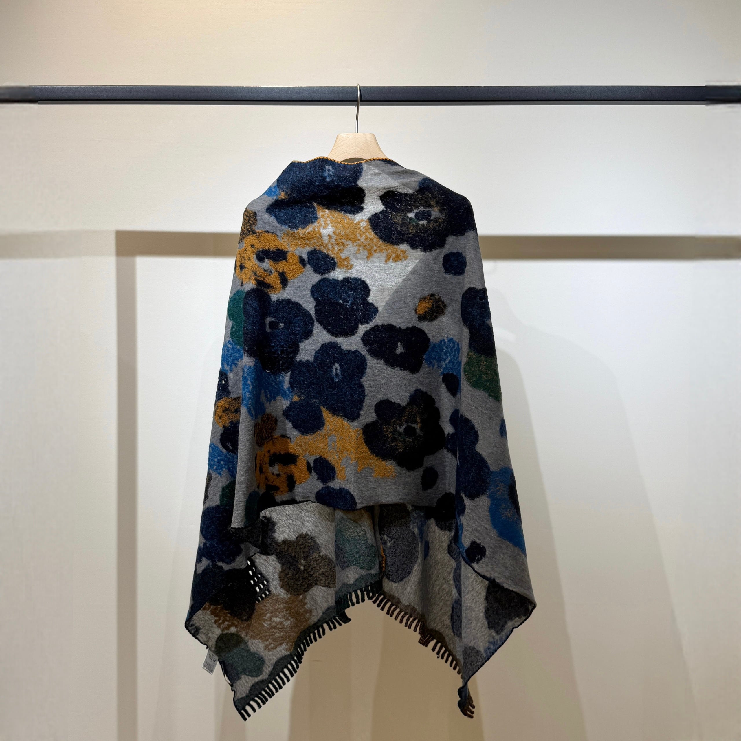 両サイドで違う色の変形千鳥ミシンや、両裾はフリンジ仕様とこだわりが詰まったアイテムです。