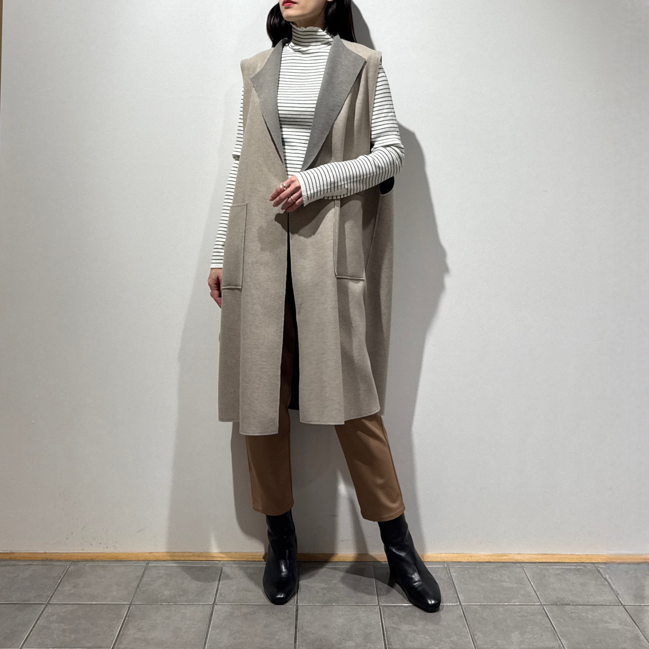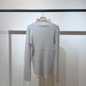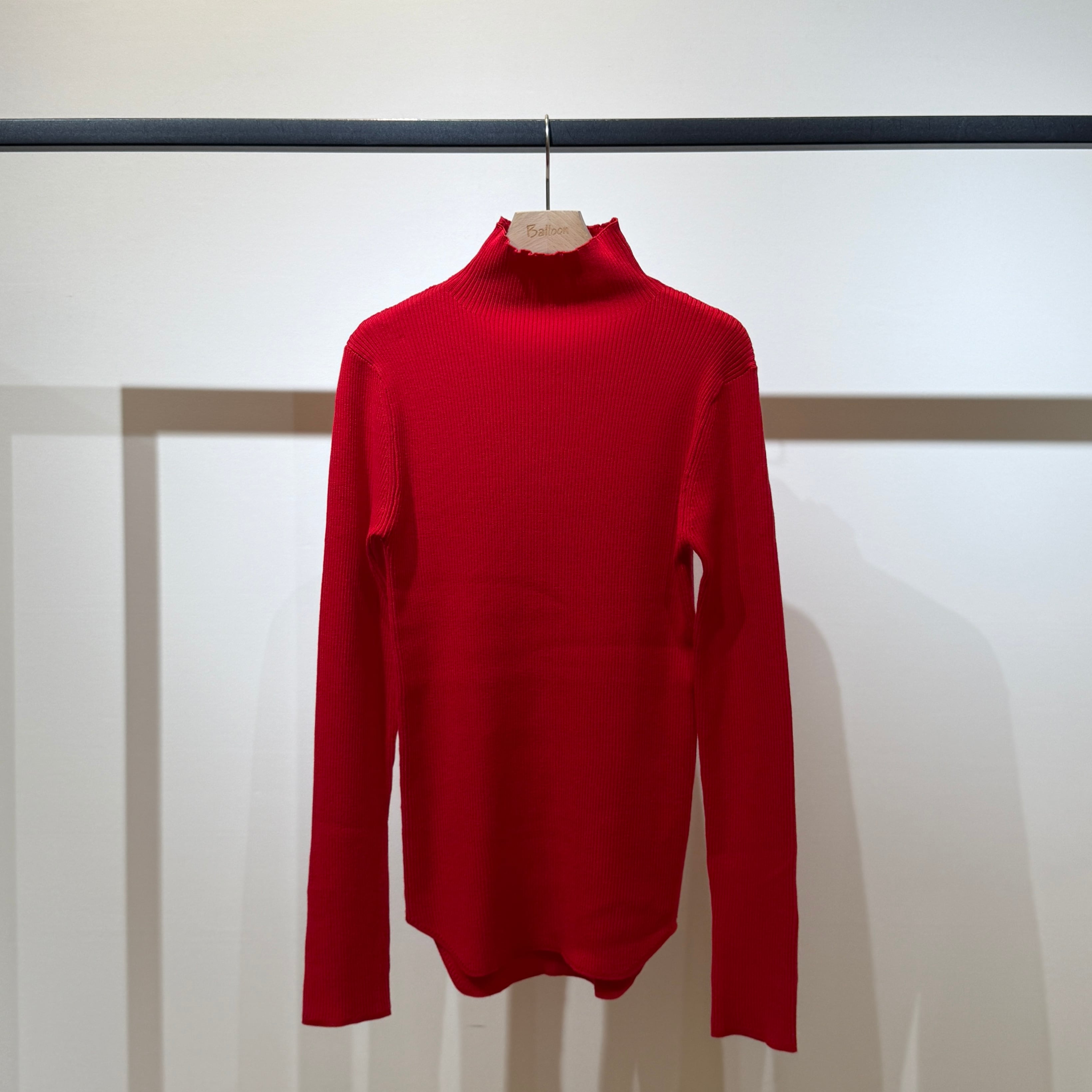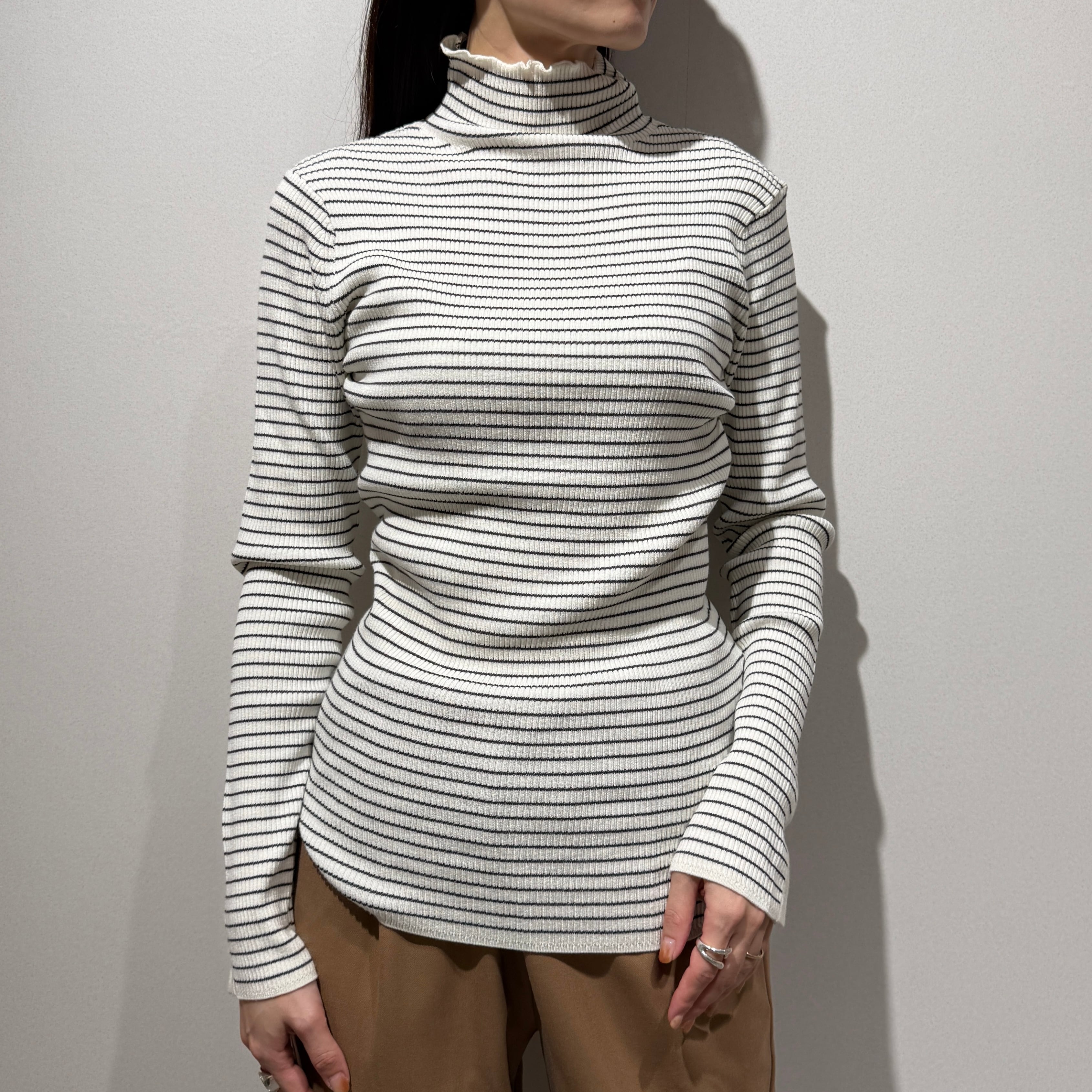 編み続きのハイネックが首元を美しく見せ、すっきりとしたリブシルエットが上品な印象に。