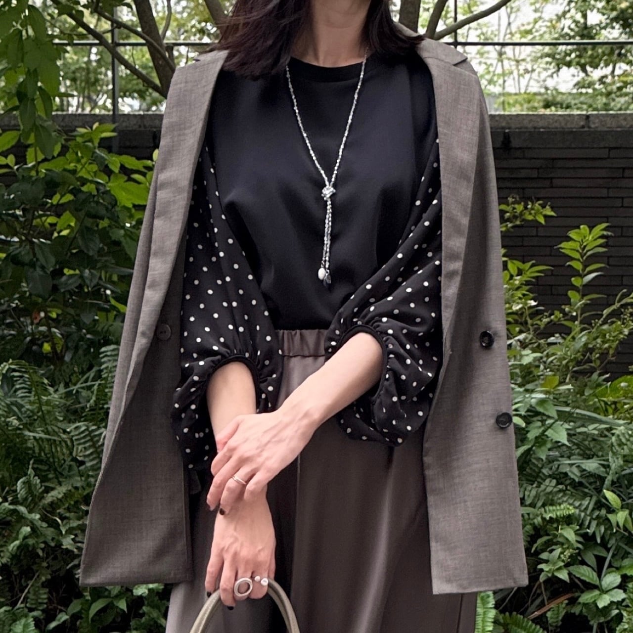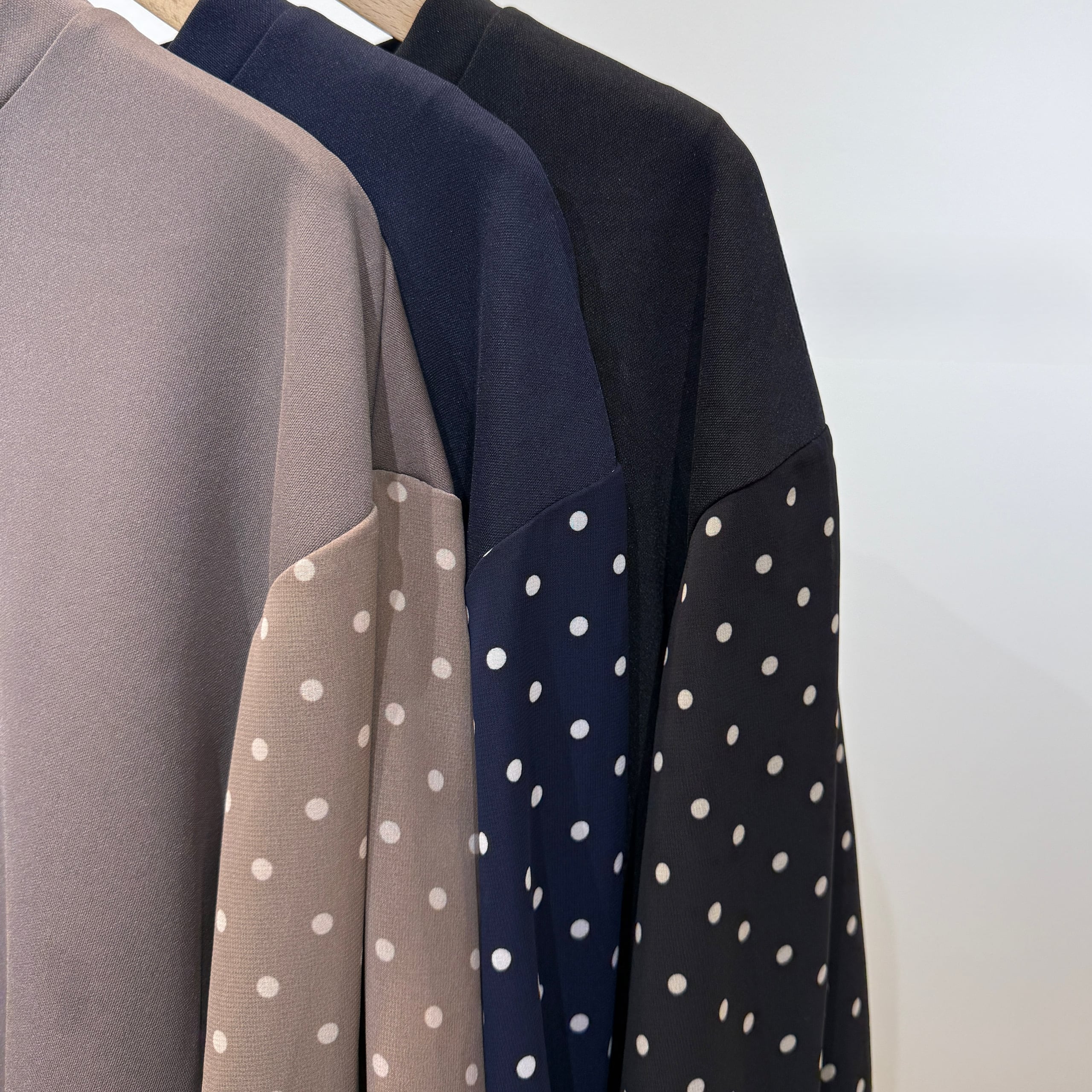 たっぷりとしたお袖が可愛いデザインで、ドット柄の異素材をあしらった新鮮なバランスが魅力。