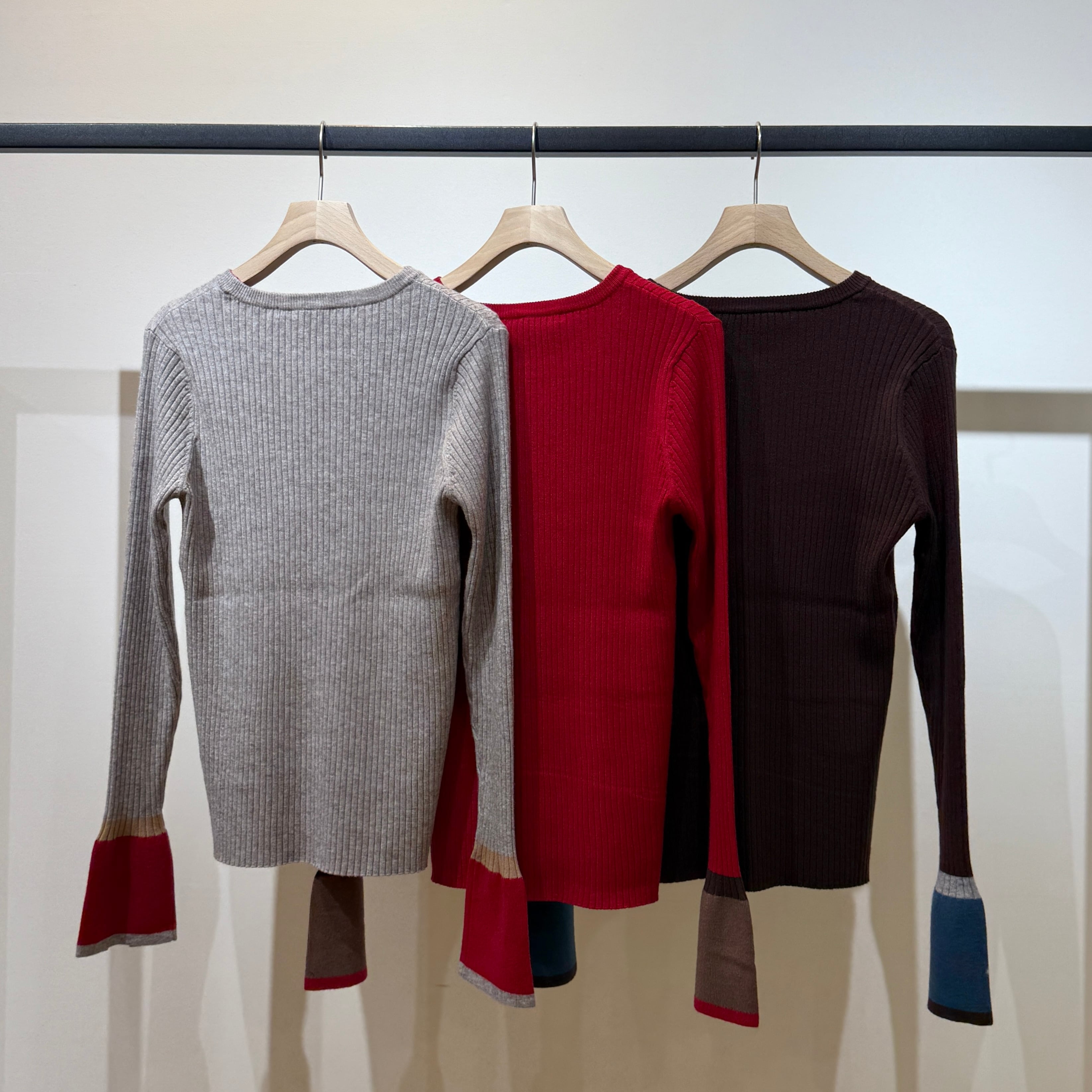 袖口の配色リブがさりげないアクセントに。緩やかにフレアになった袖口と小さなスリットが軽やかさをプラスし、華やかさも感じる一枚です。