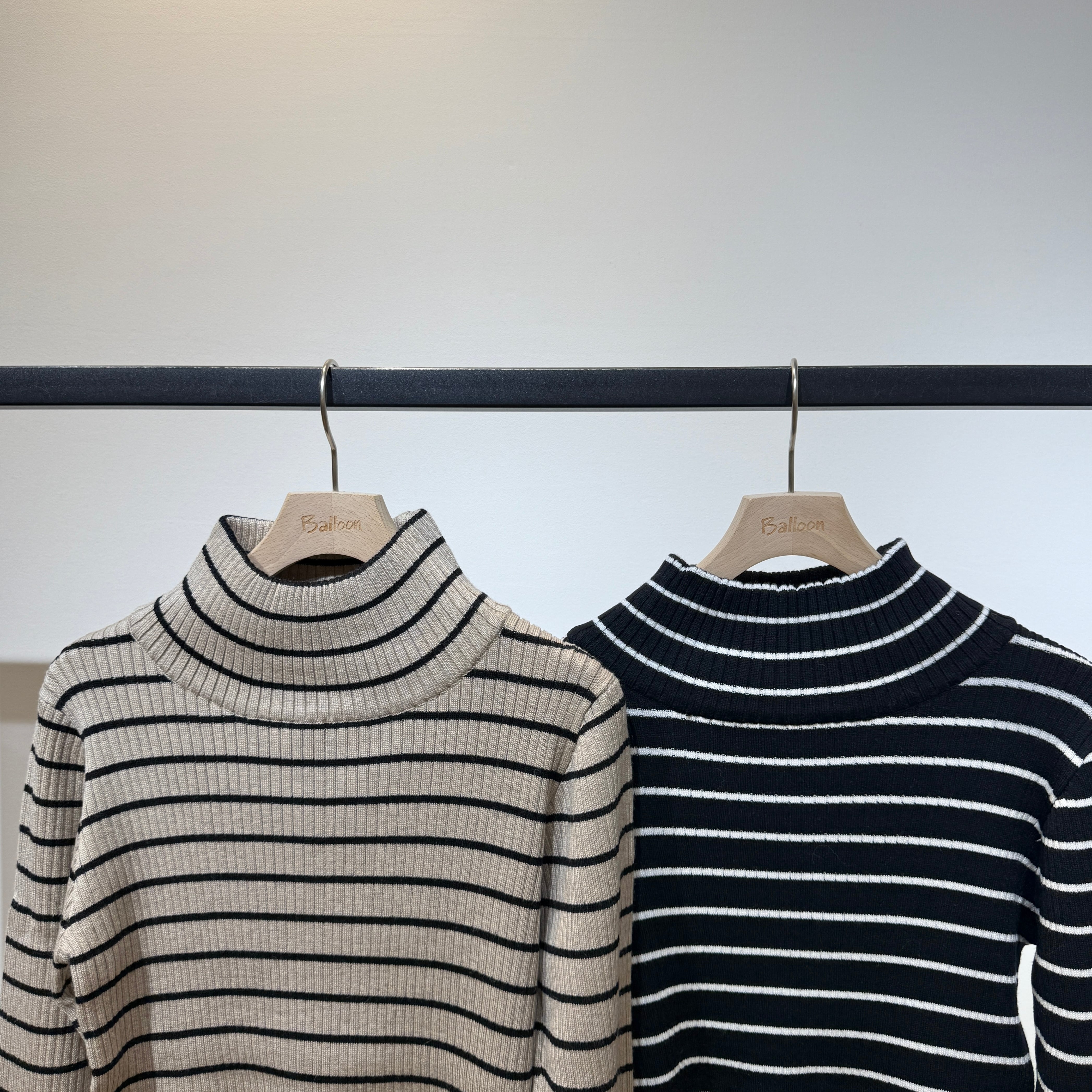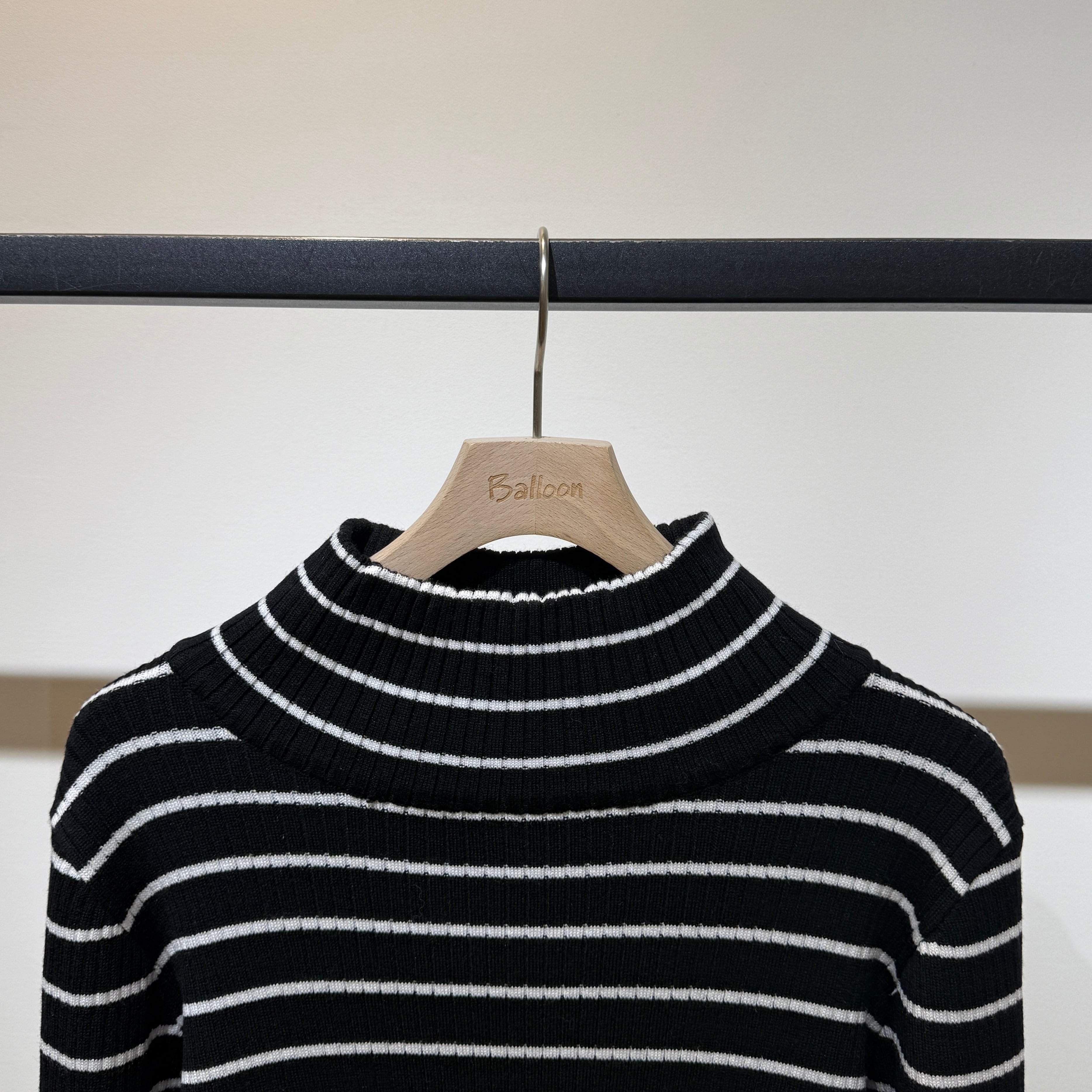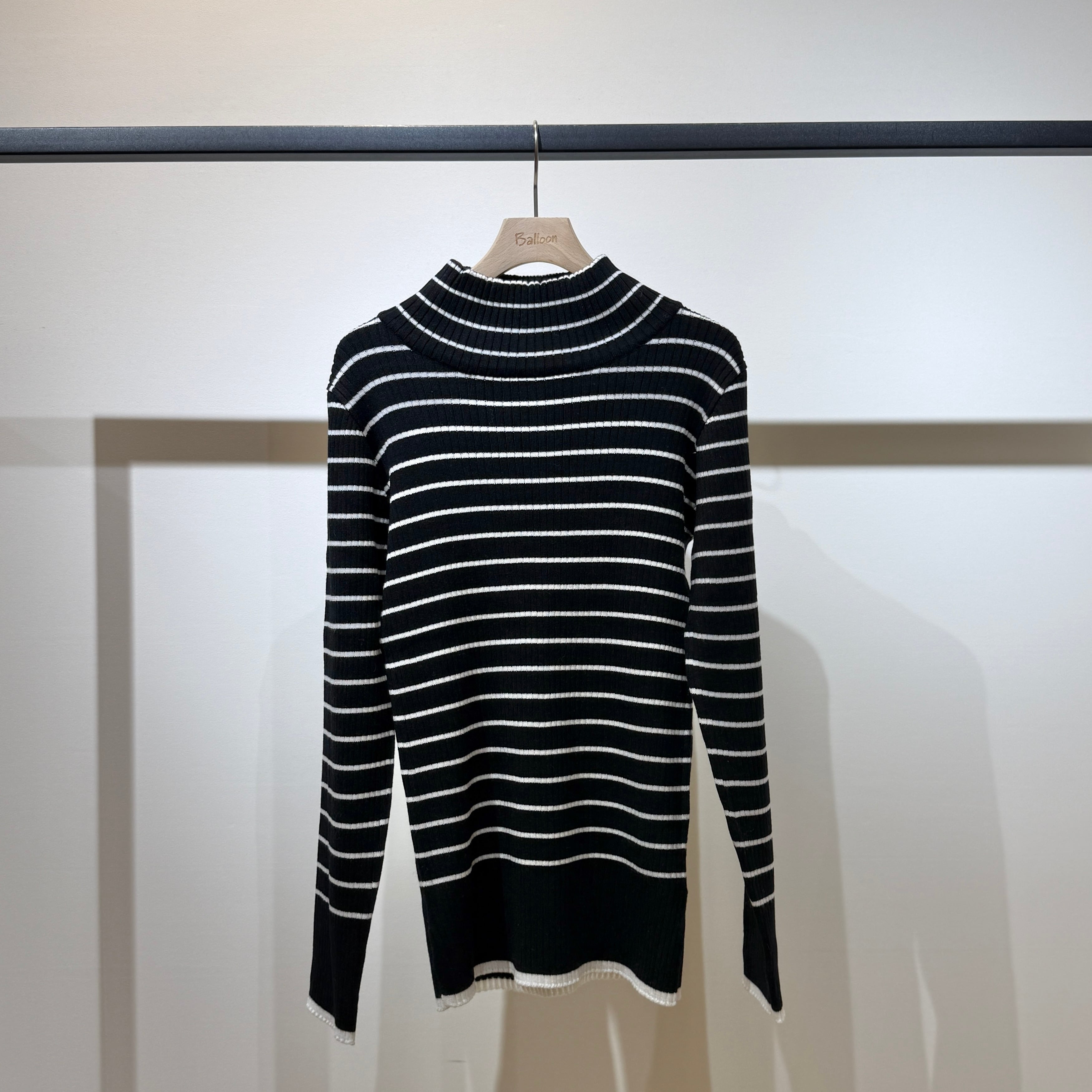 首元までやさしく包み込む、クラシカルな印象のボーダー柄タートルニット。