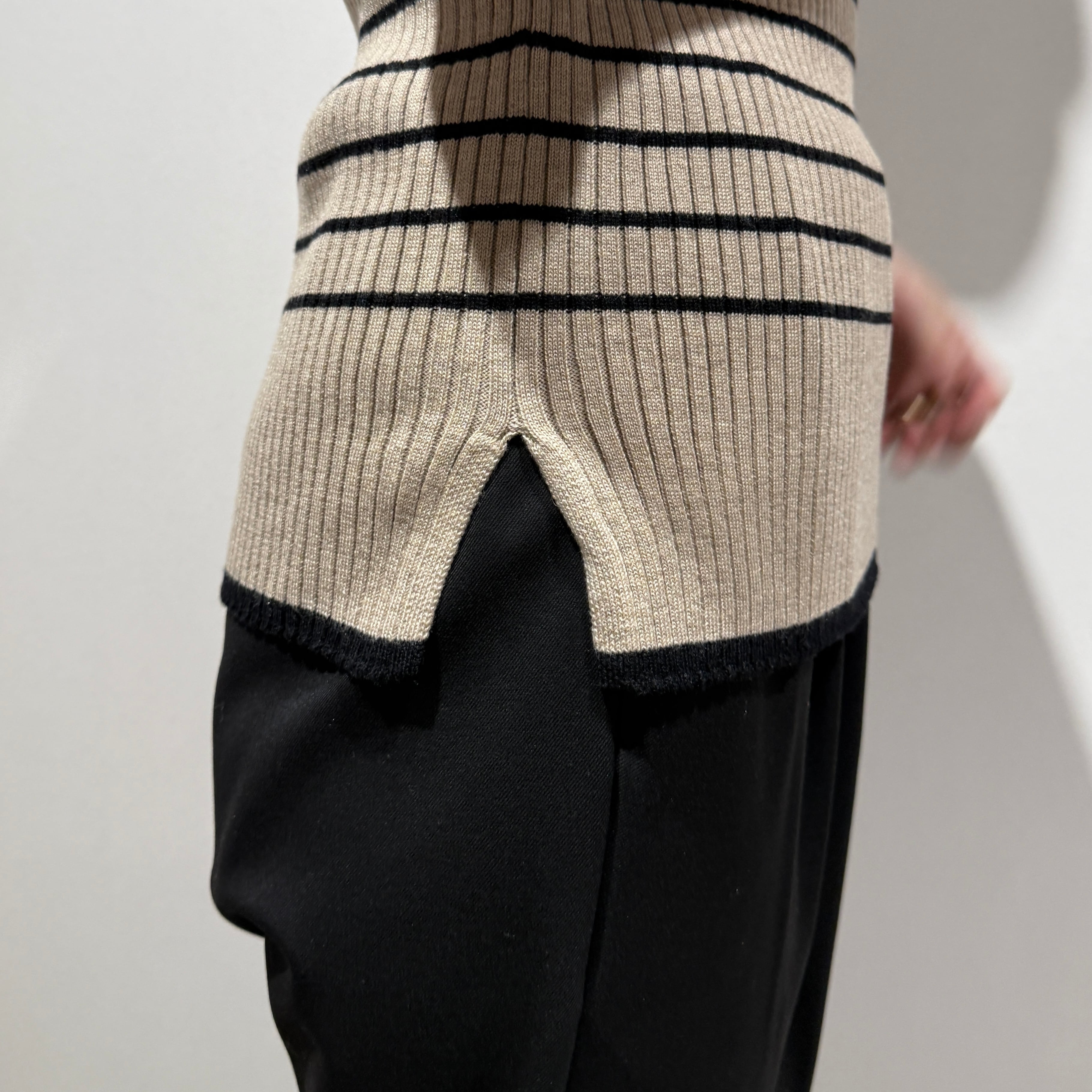 ふっくらと柔らかく伸びのあるリブ素材で、心地よくフィットしながらも身体のラインを拾いにくいのが魅力です。