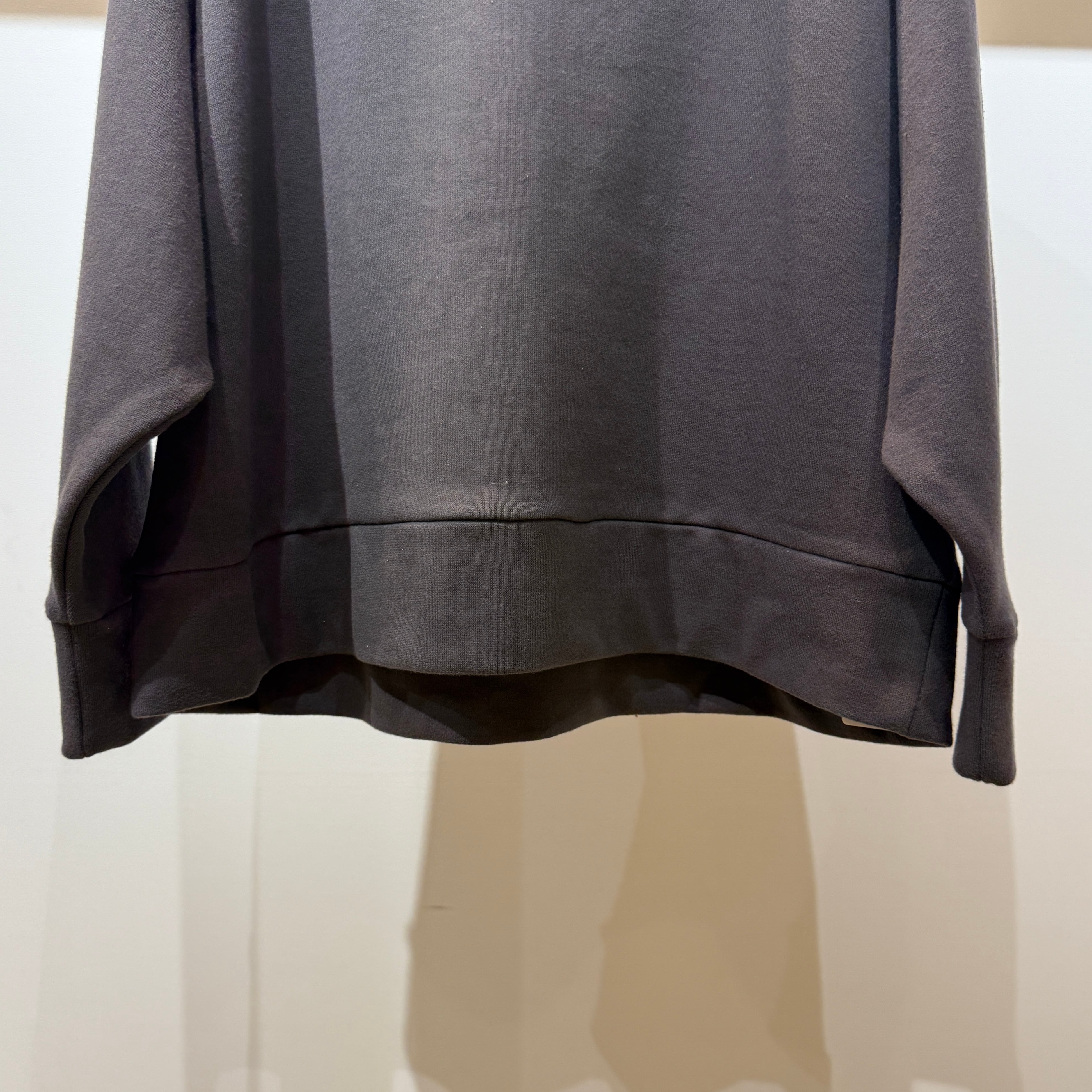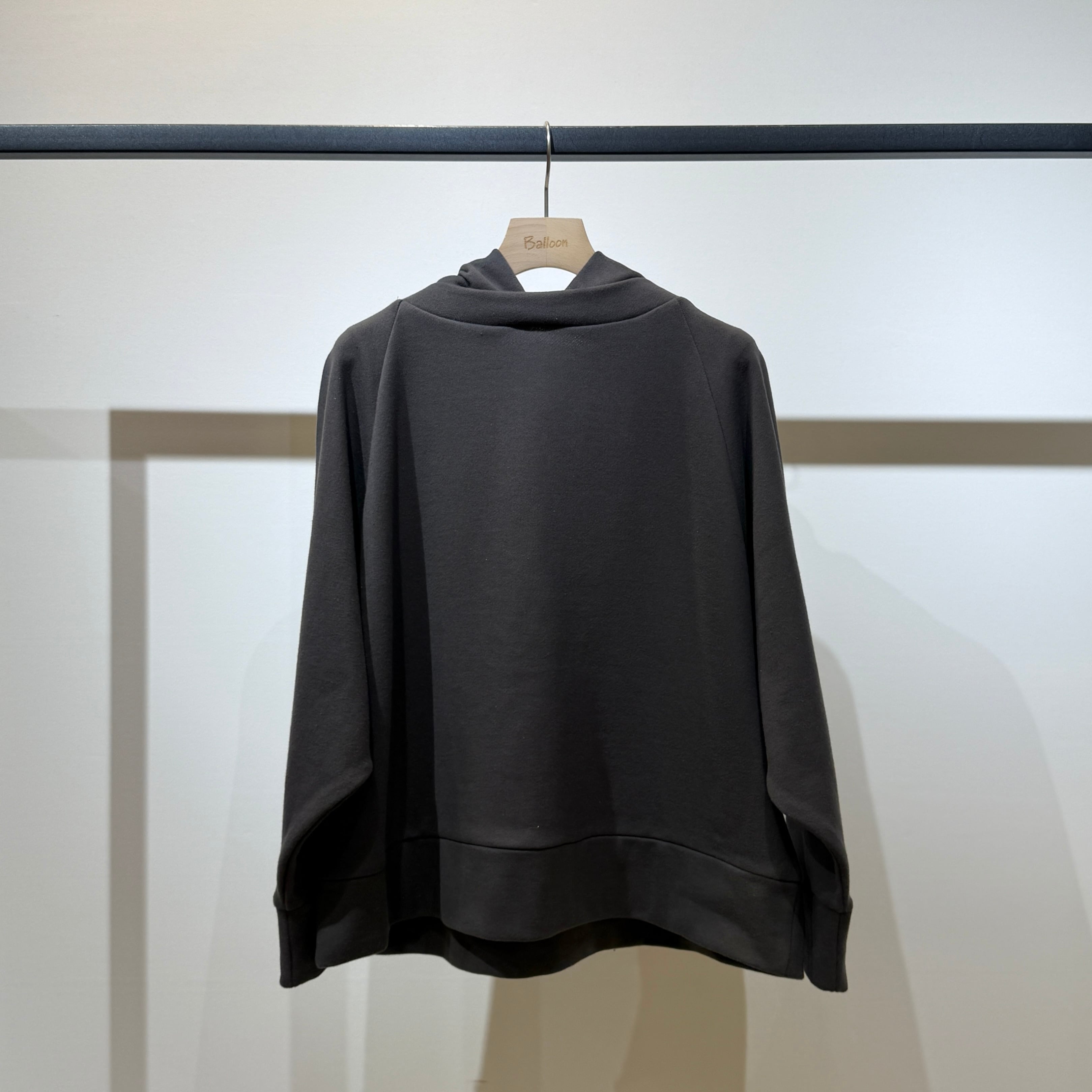 ボックスシルエットとゆったりしたラグランスリーブが体のラインを拾わず、リラックス感のある印象に。