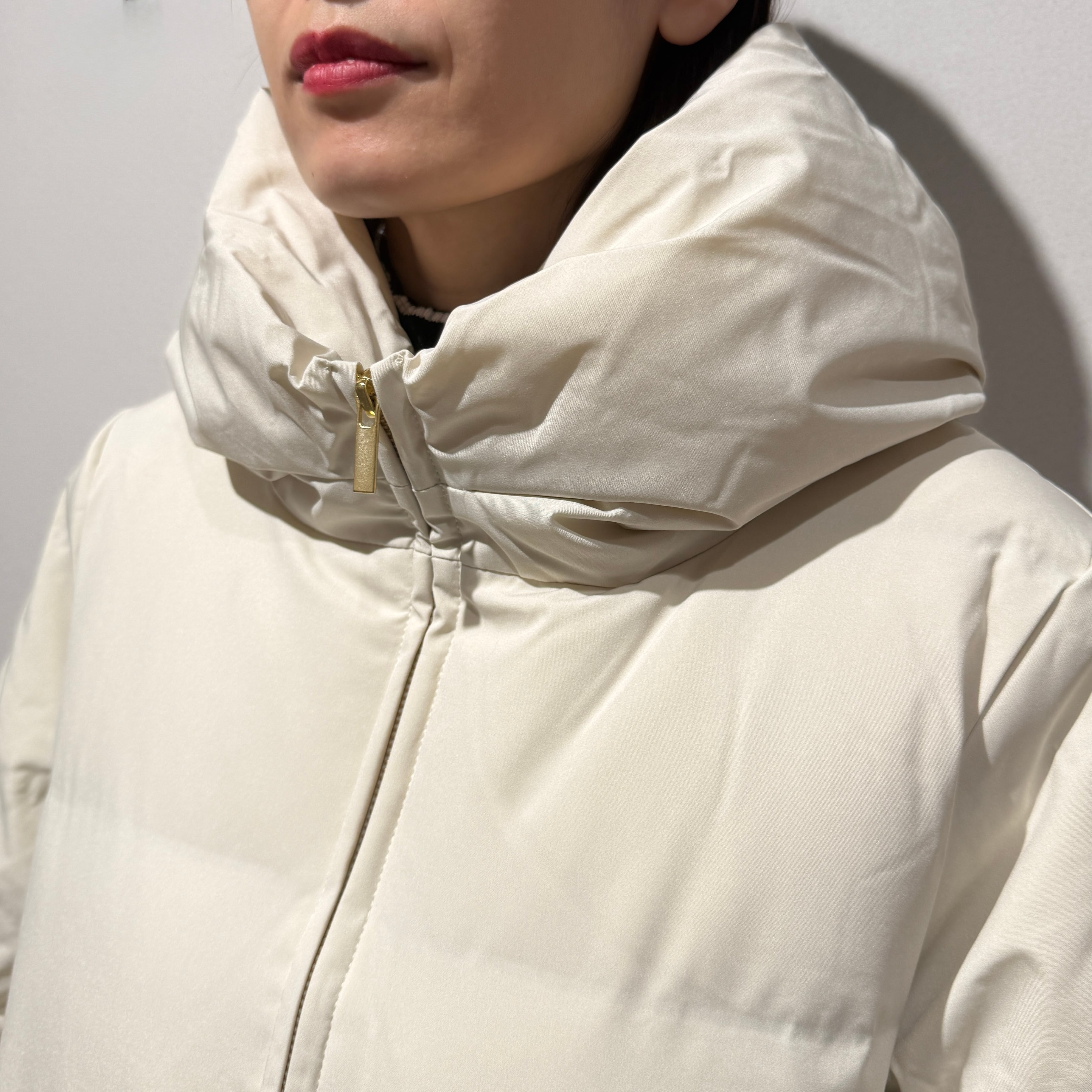 ふっくらとしたショールカラーが特徴の、冬の主役級ショートダウン。