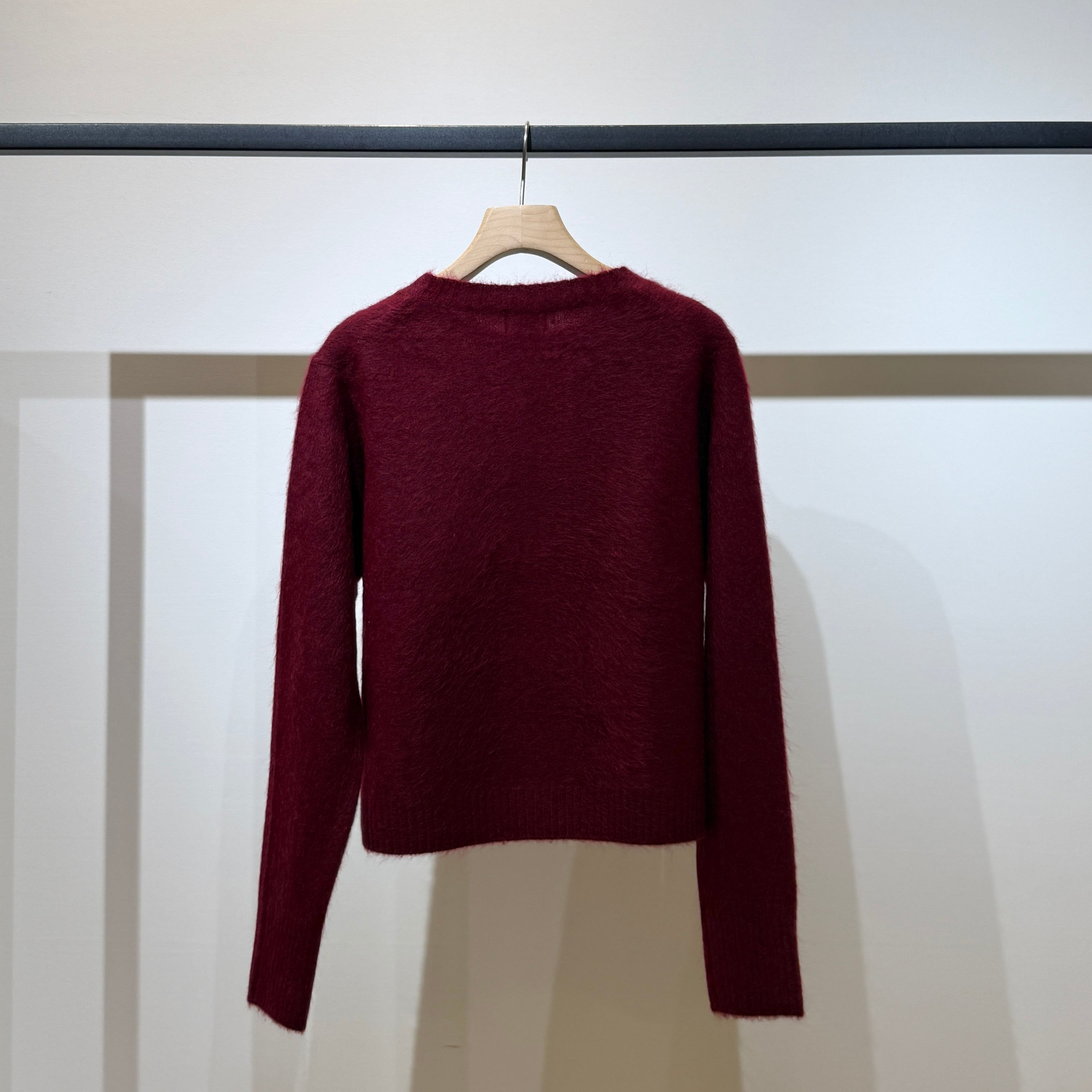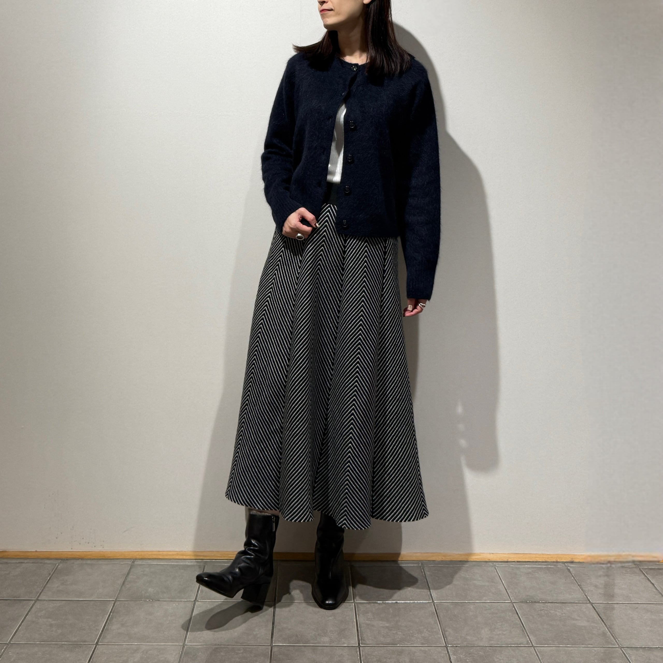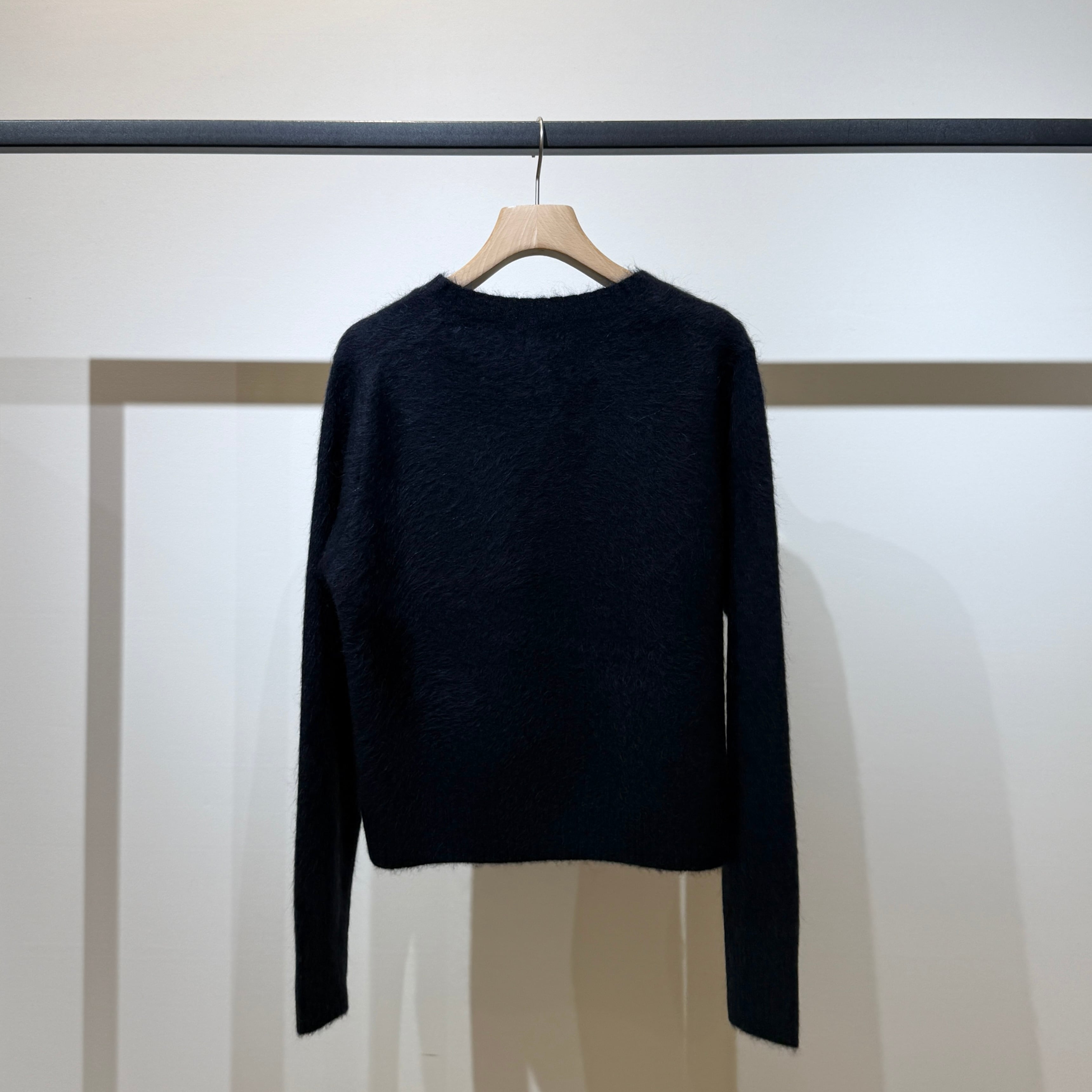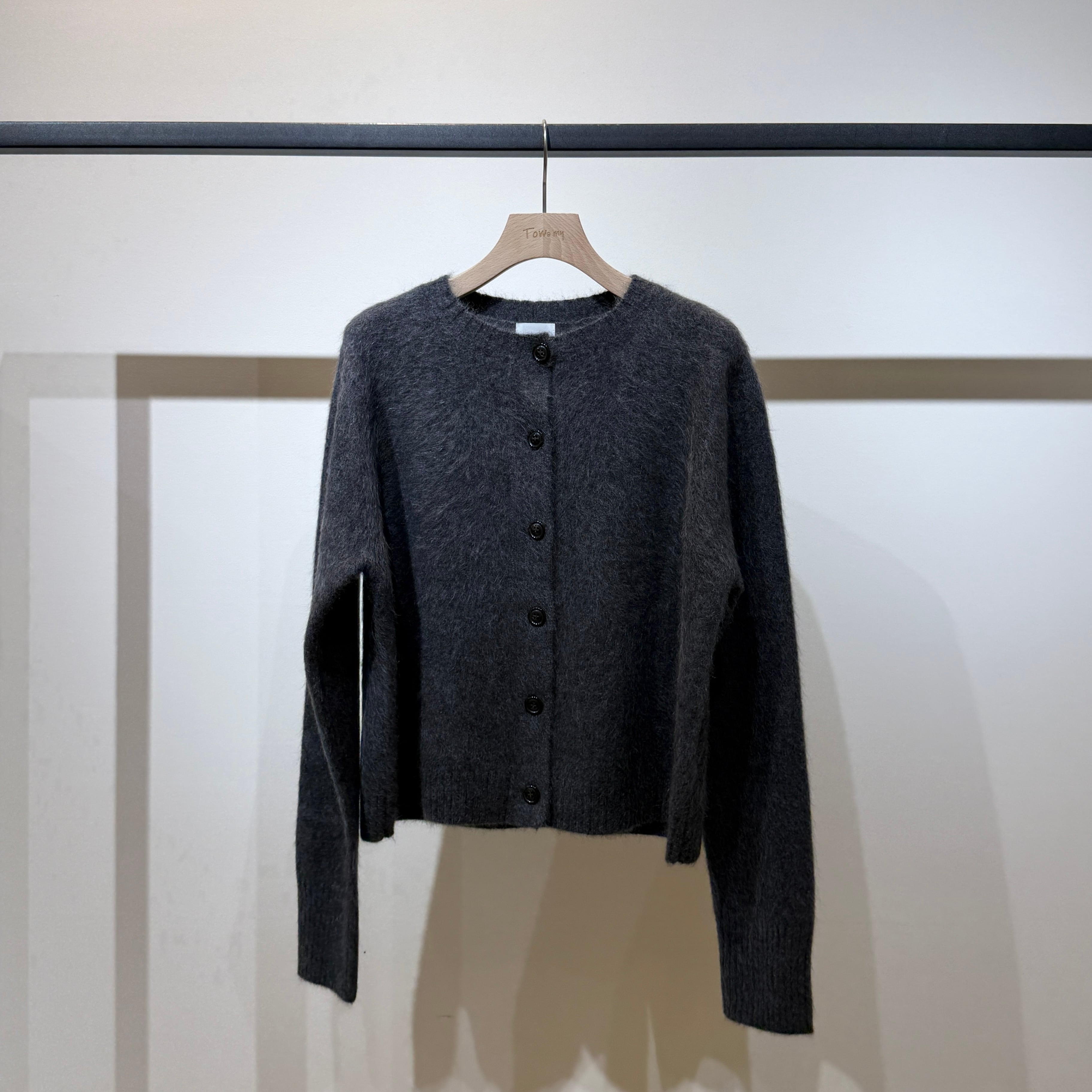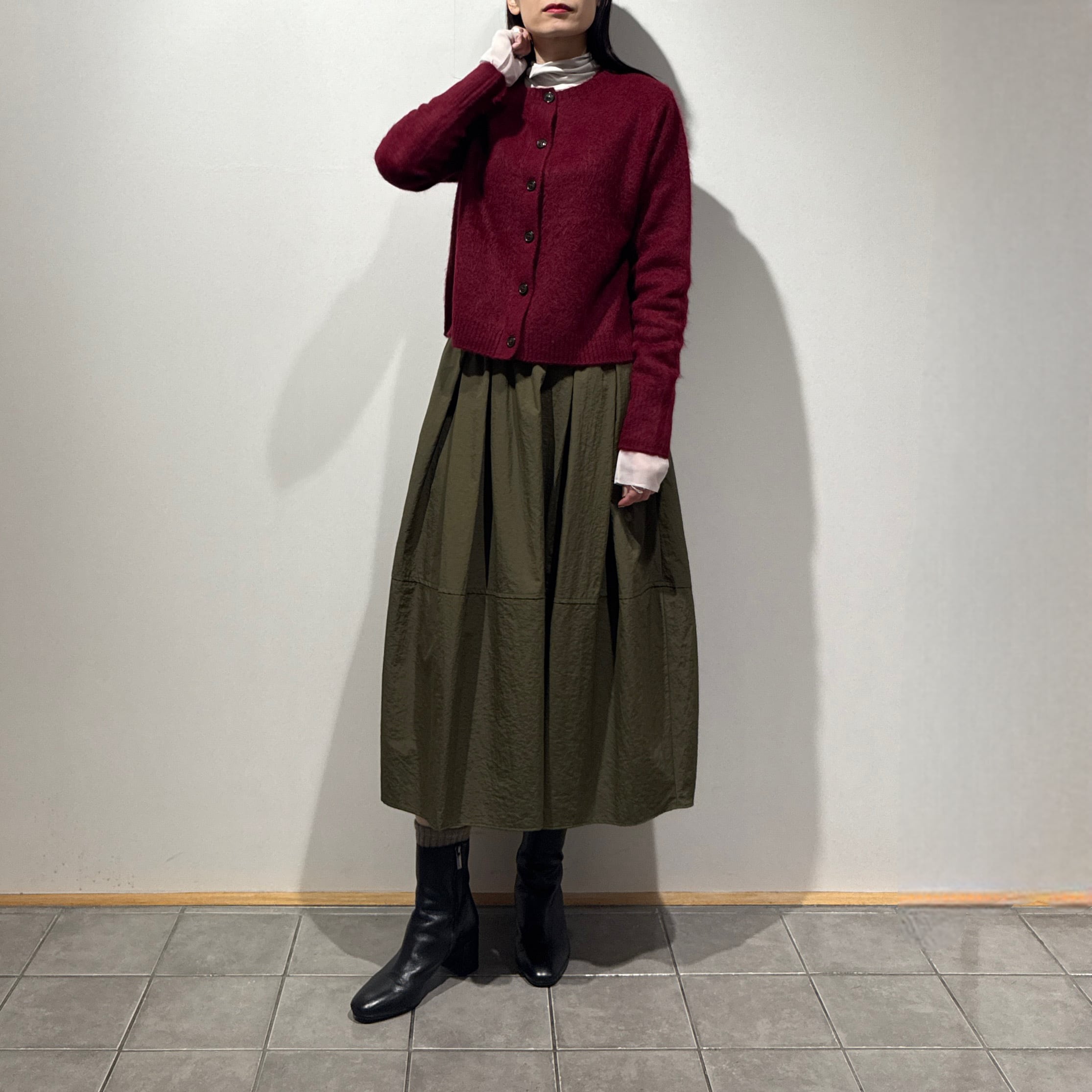 シンプルなクルーネックと程よい短めの着丈で、ボタンを留めても開けてもサマになるバランス。肩周りはすっきりしつつも、優しいボリュームの袖が女性らしいシルエットを演出します。