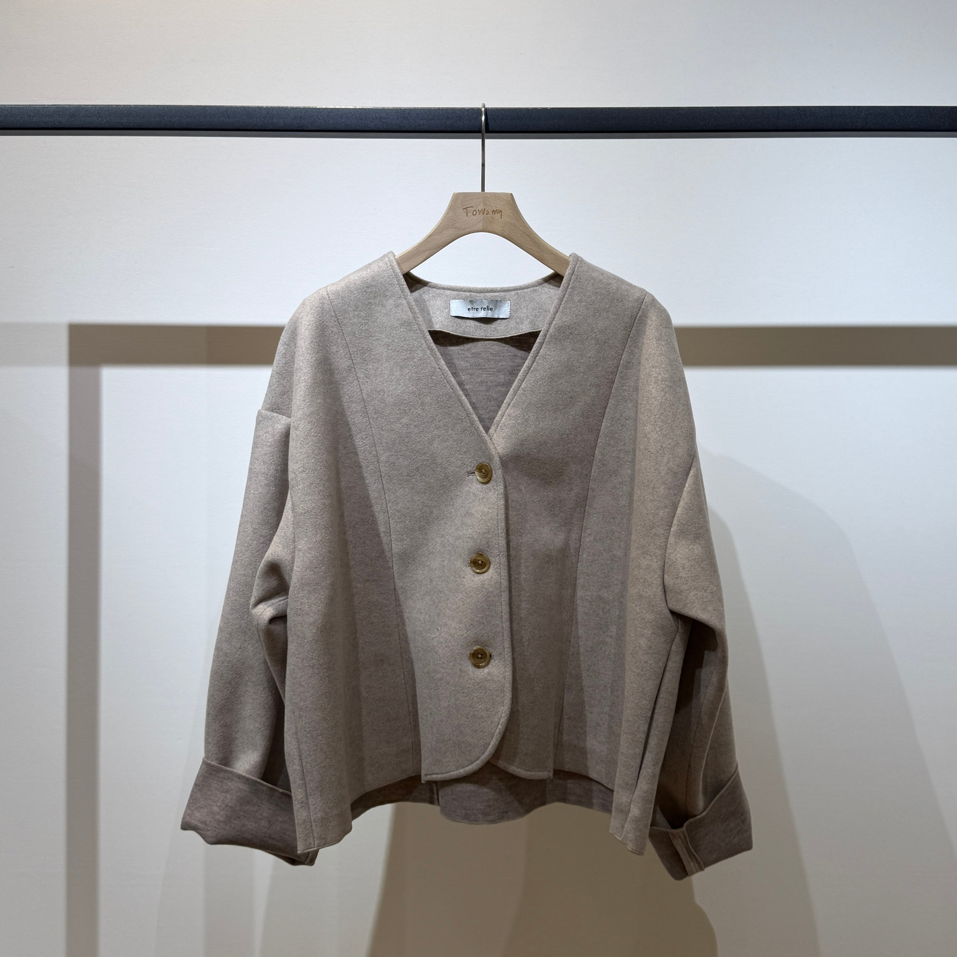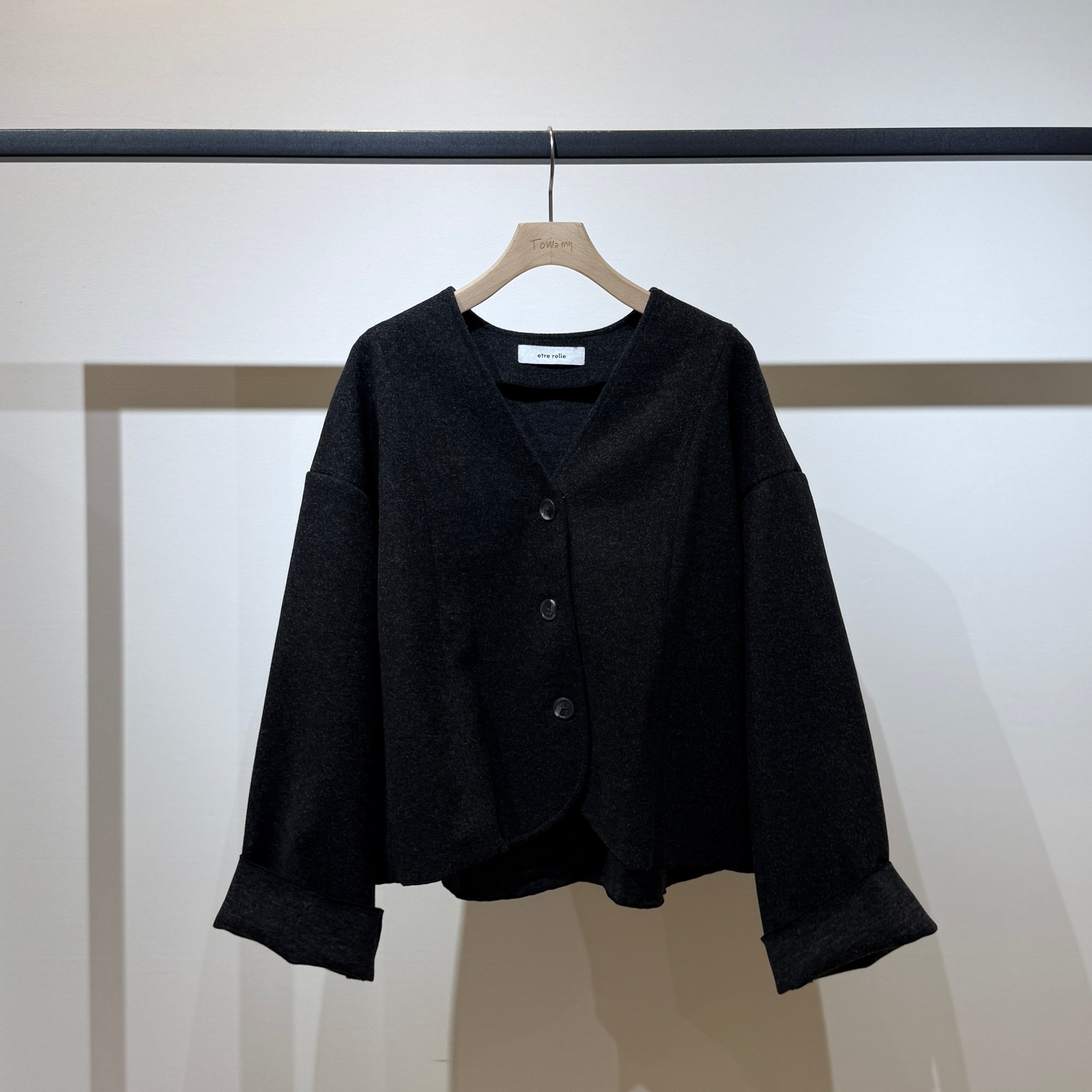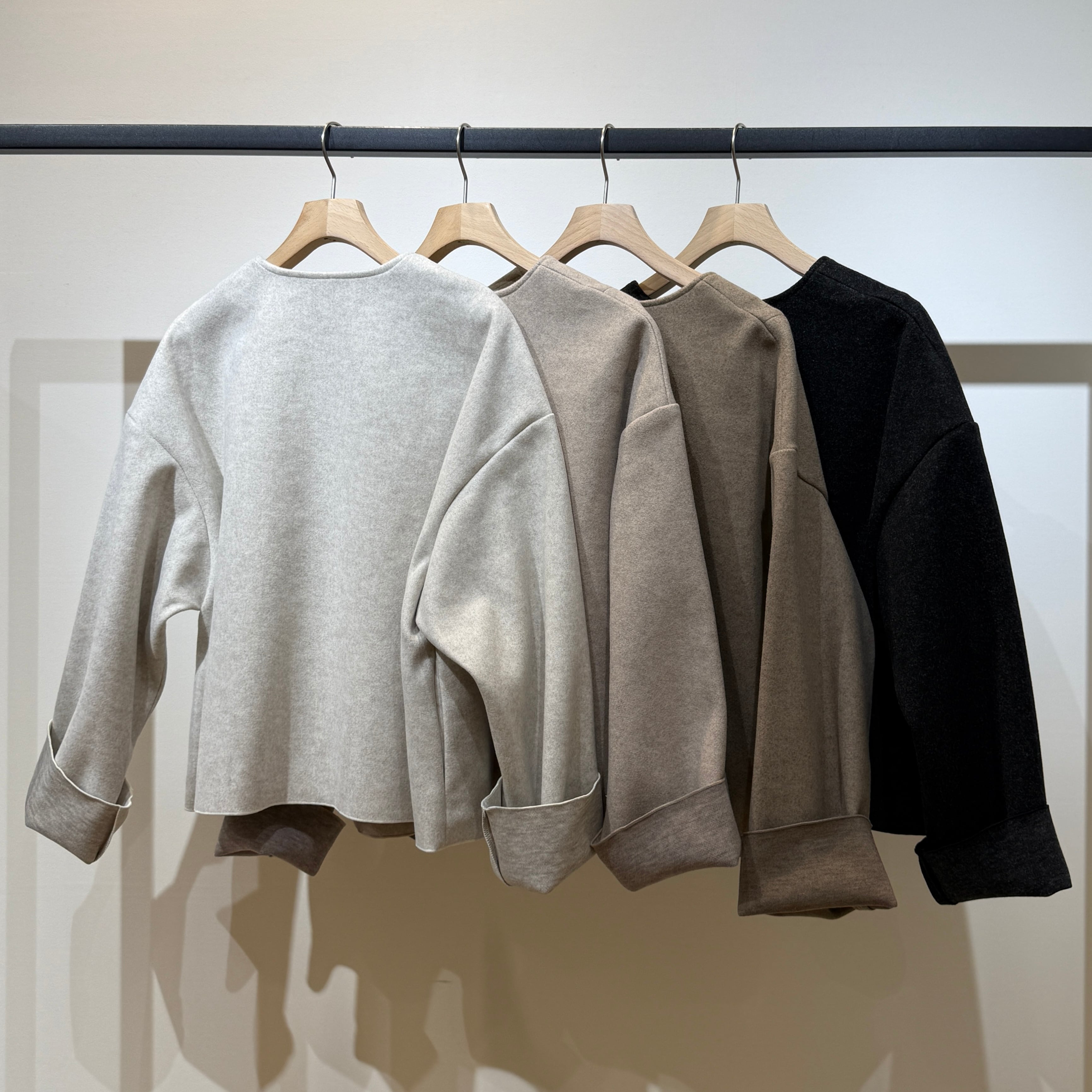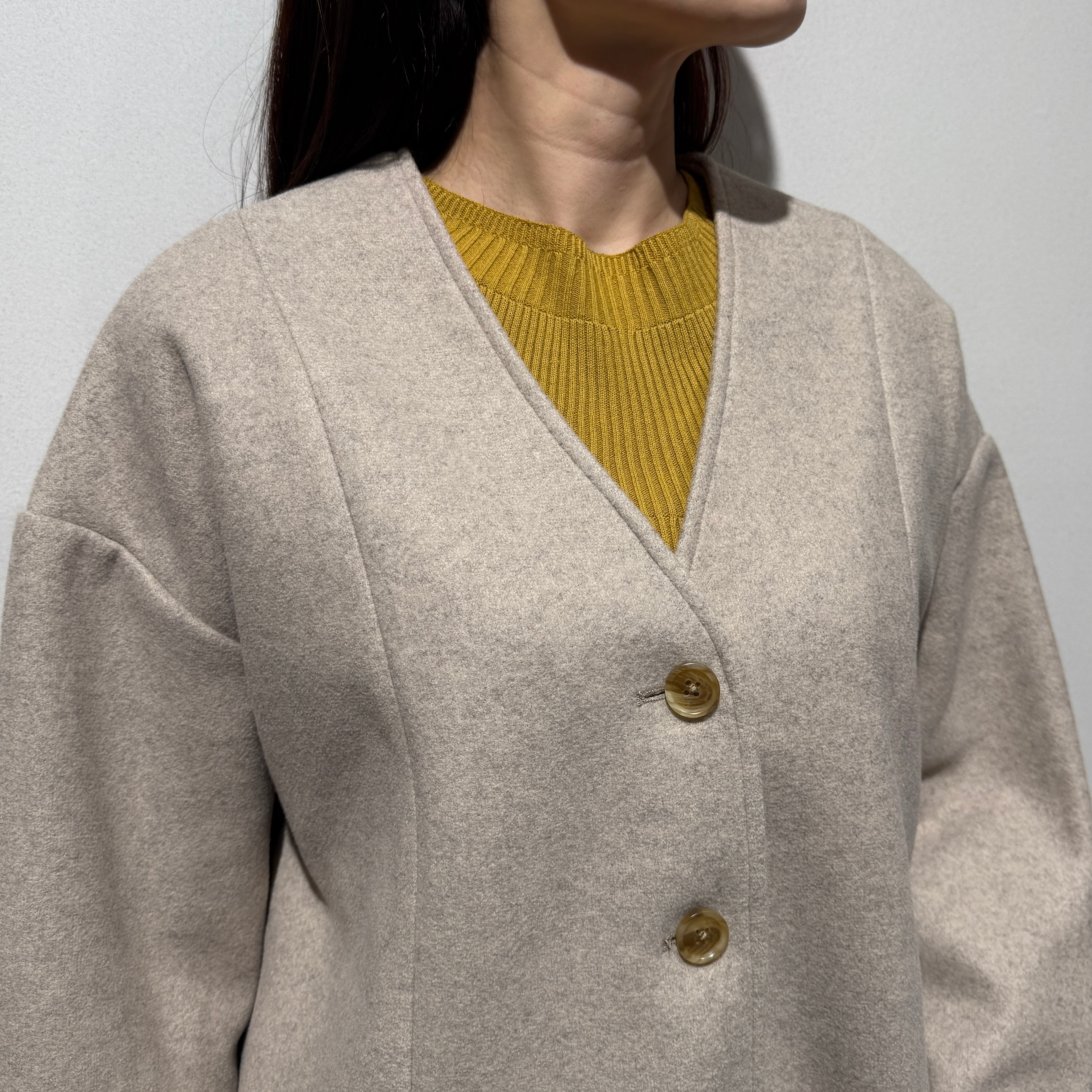 ノーカラーですっきりとした衿元と大き目の身幅でインナーに着こめるサイズ感が魅力です。
