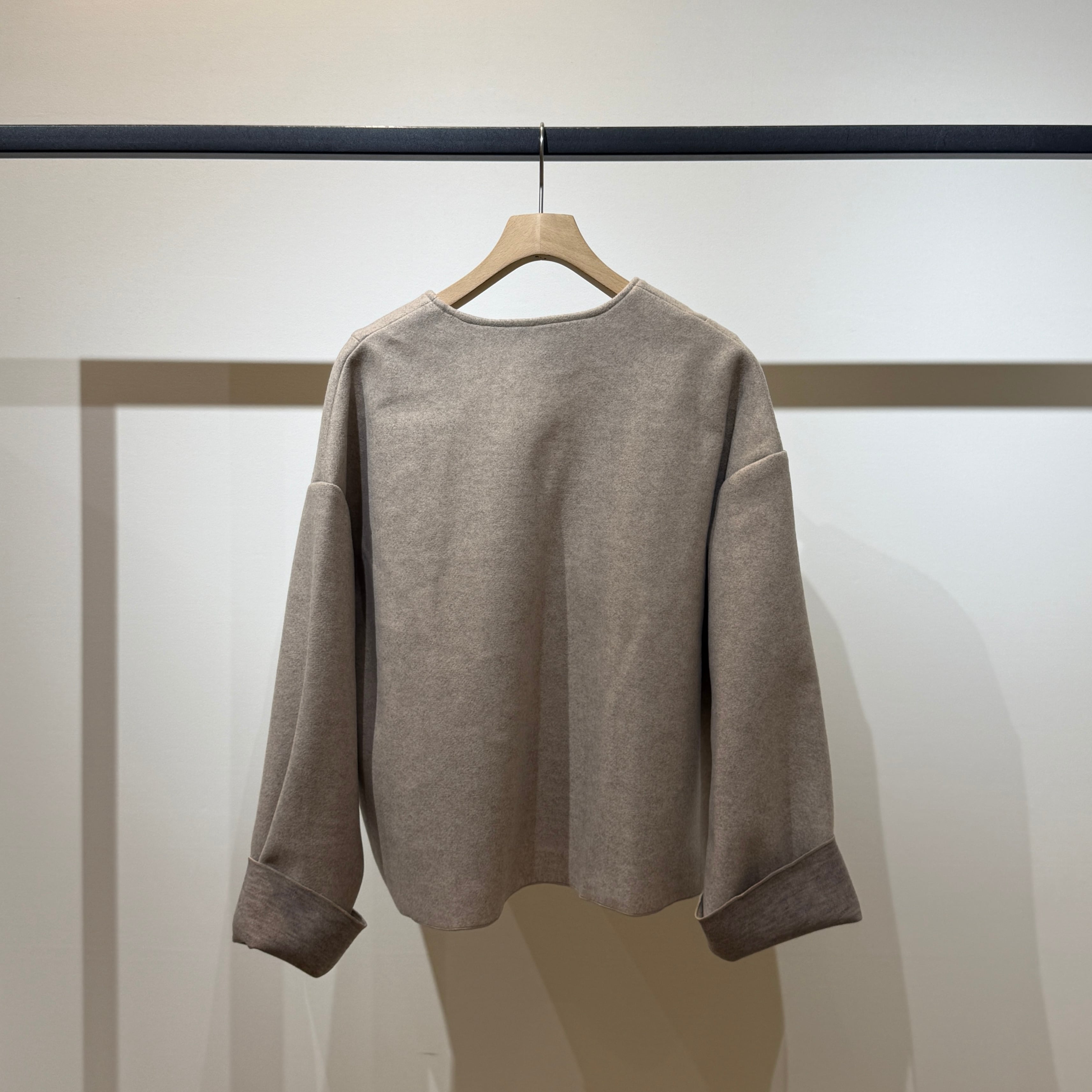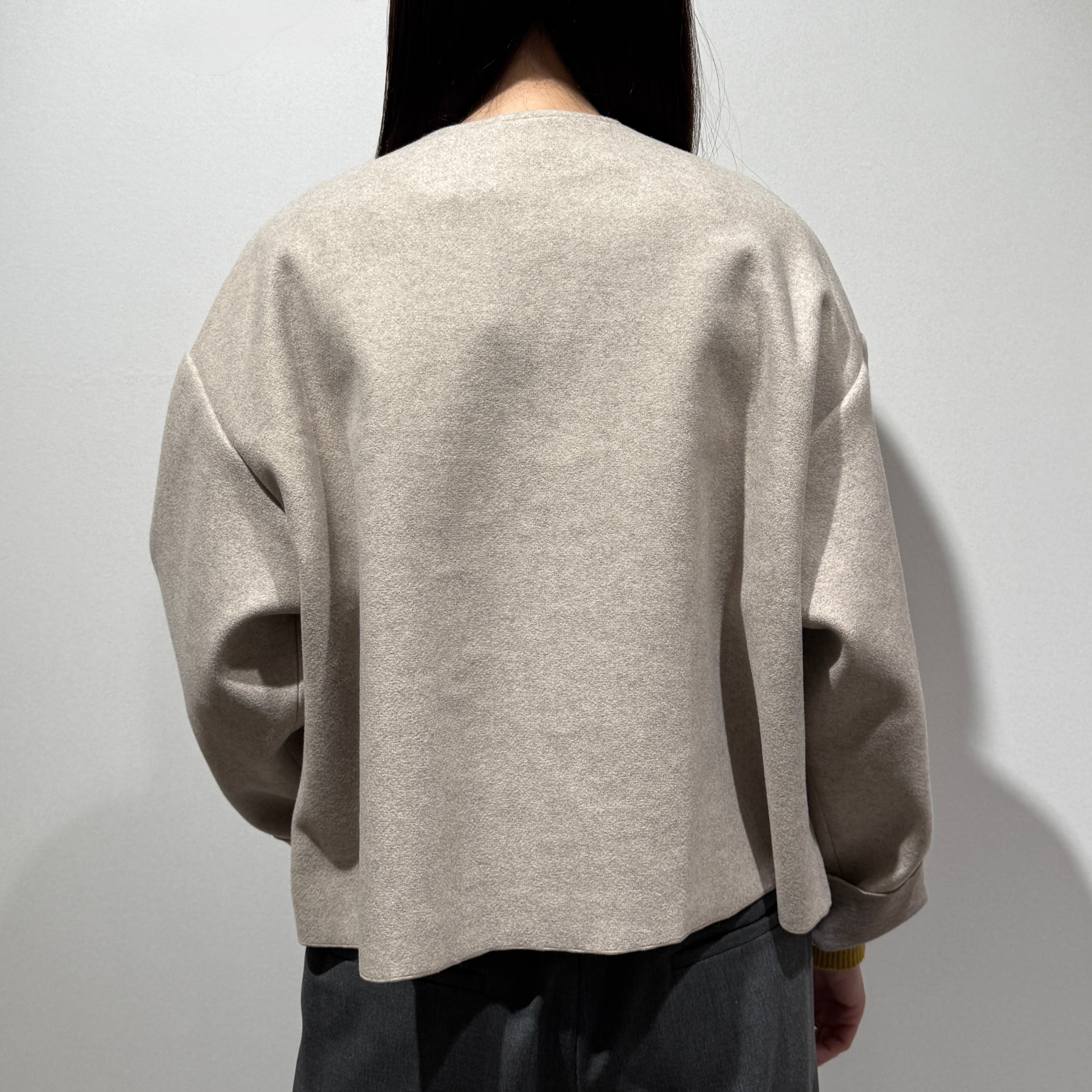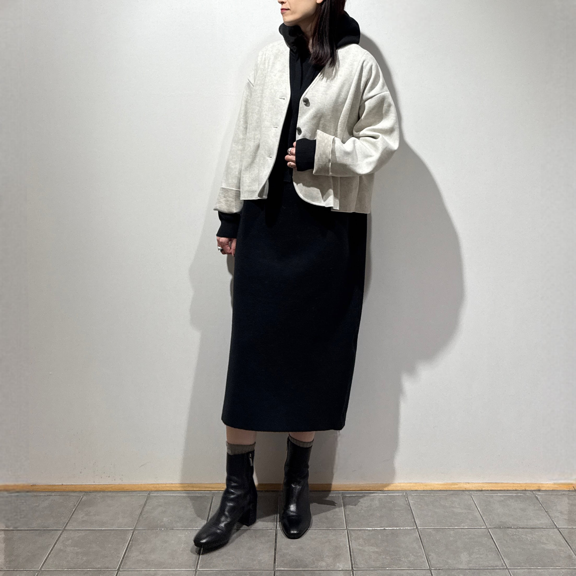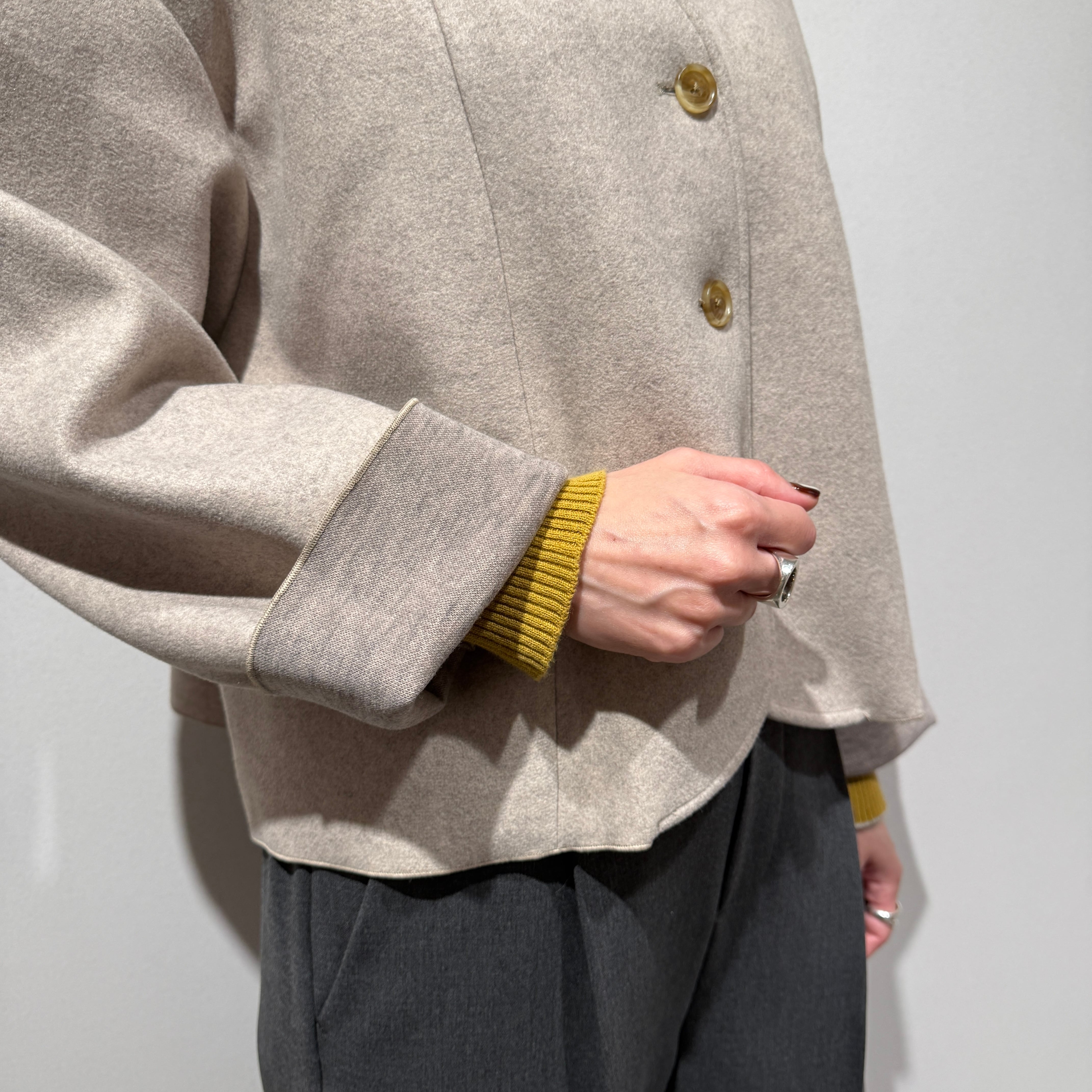 ノーカラーですっきりとした衿元と大き目の身幅でインナーに着こめるサイズ感が魅力です。