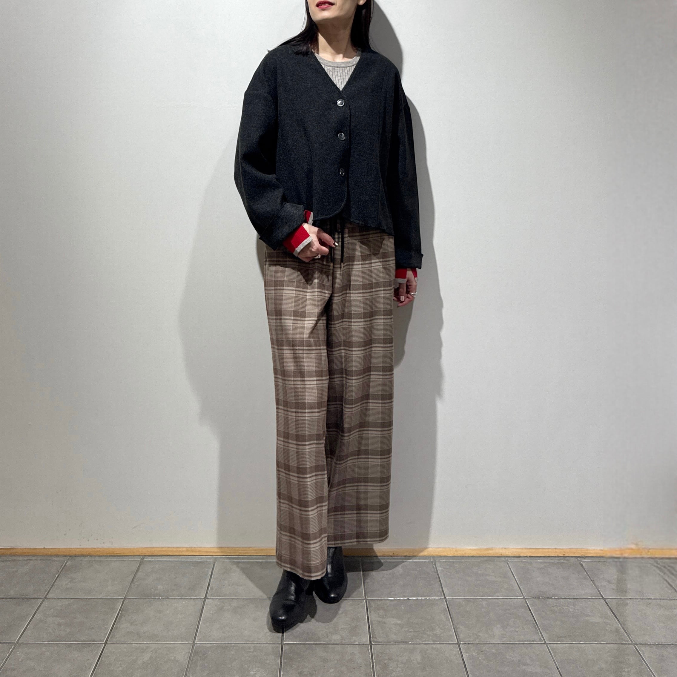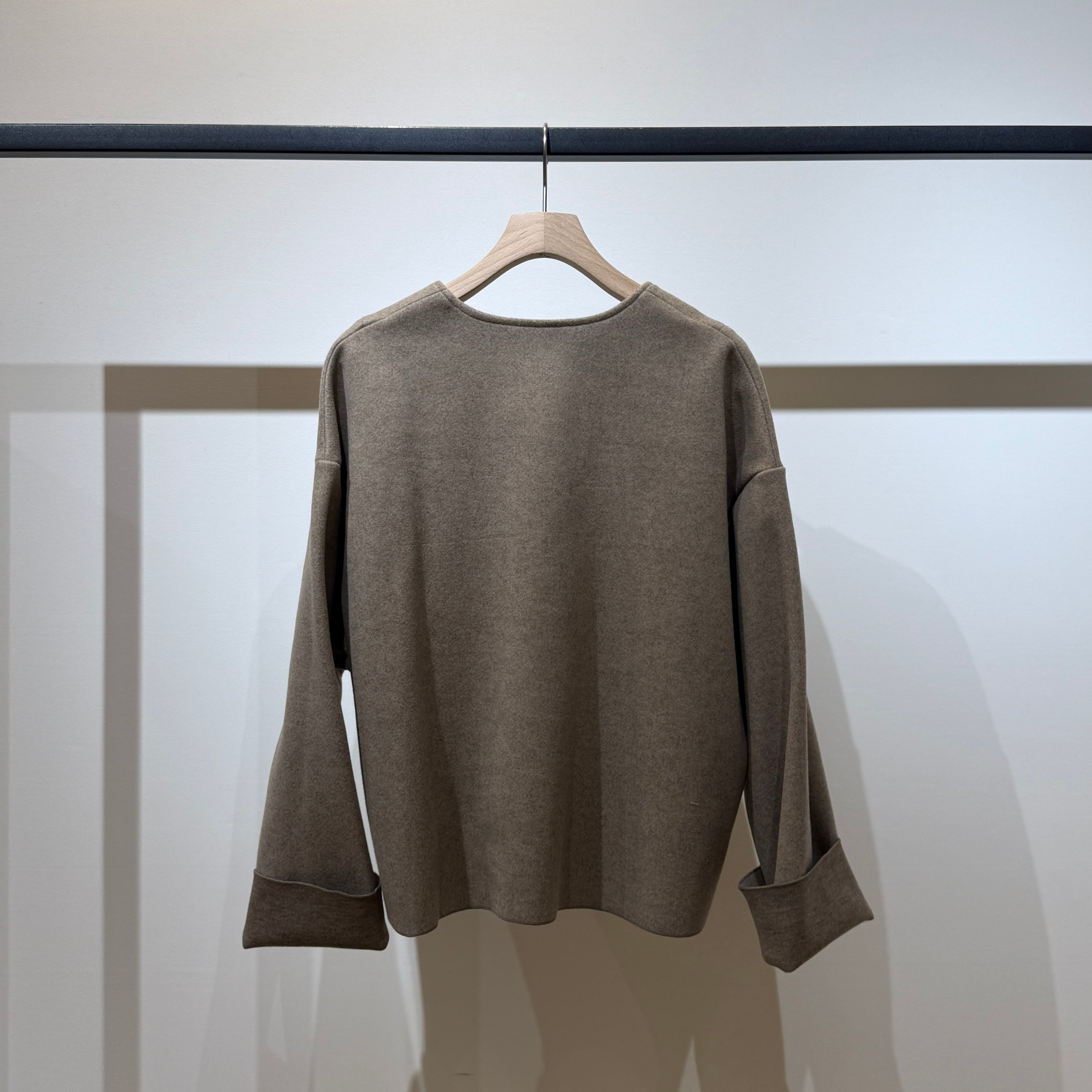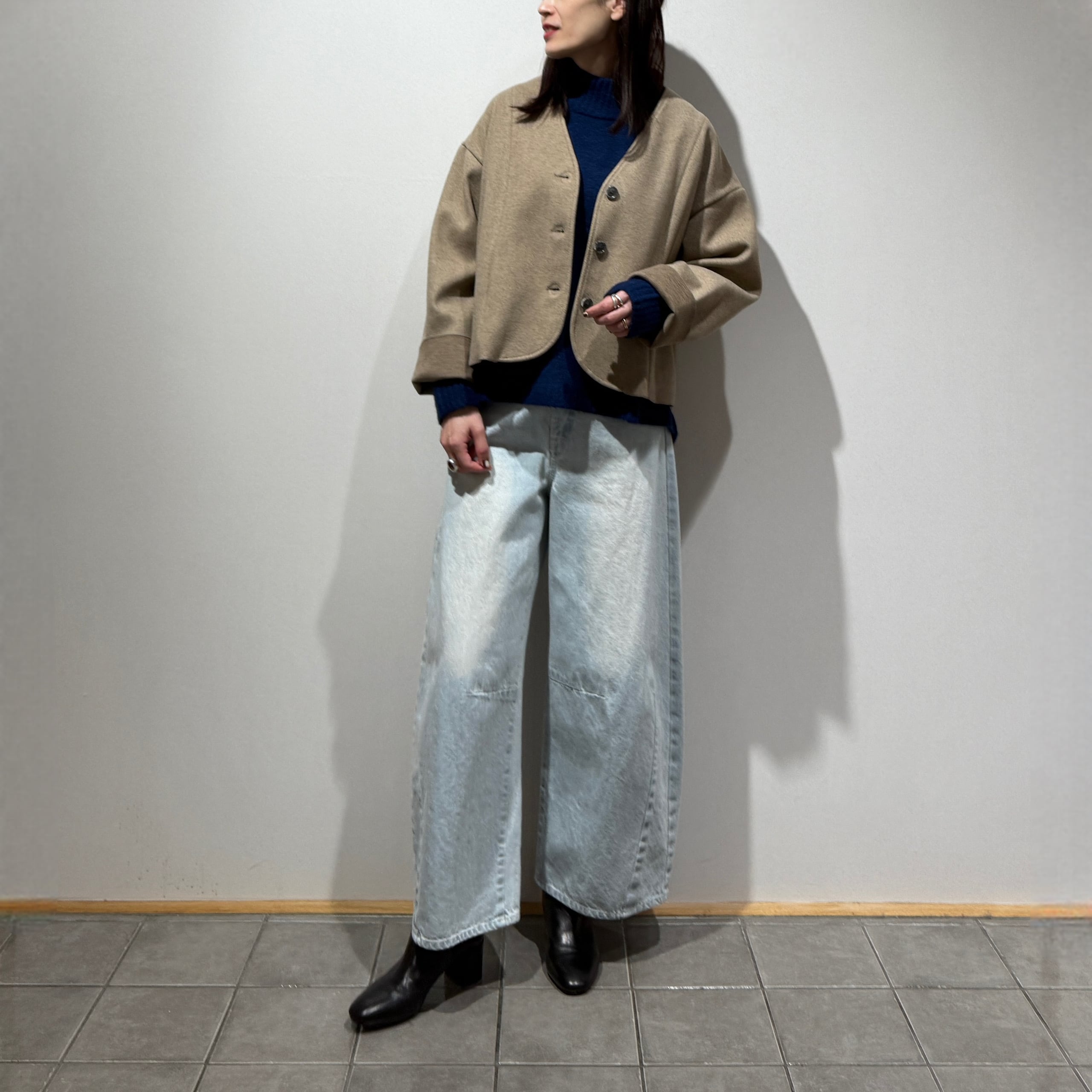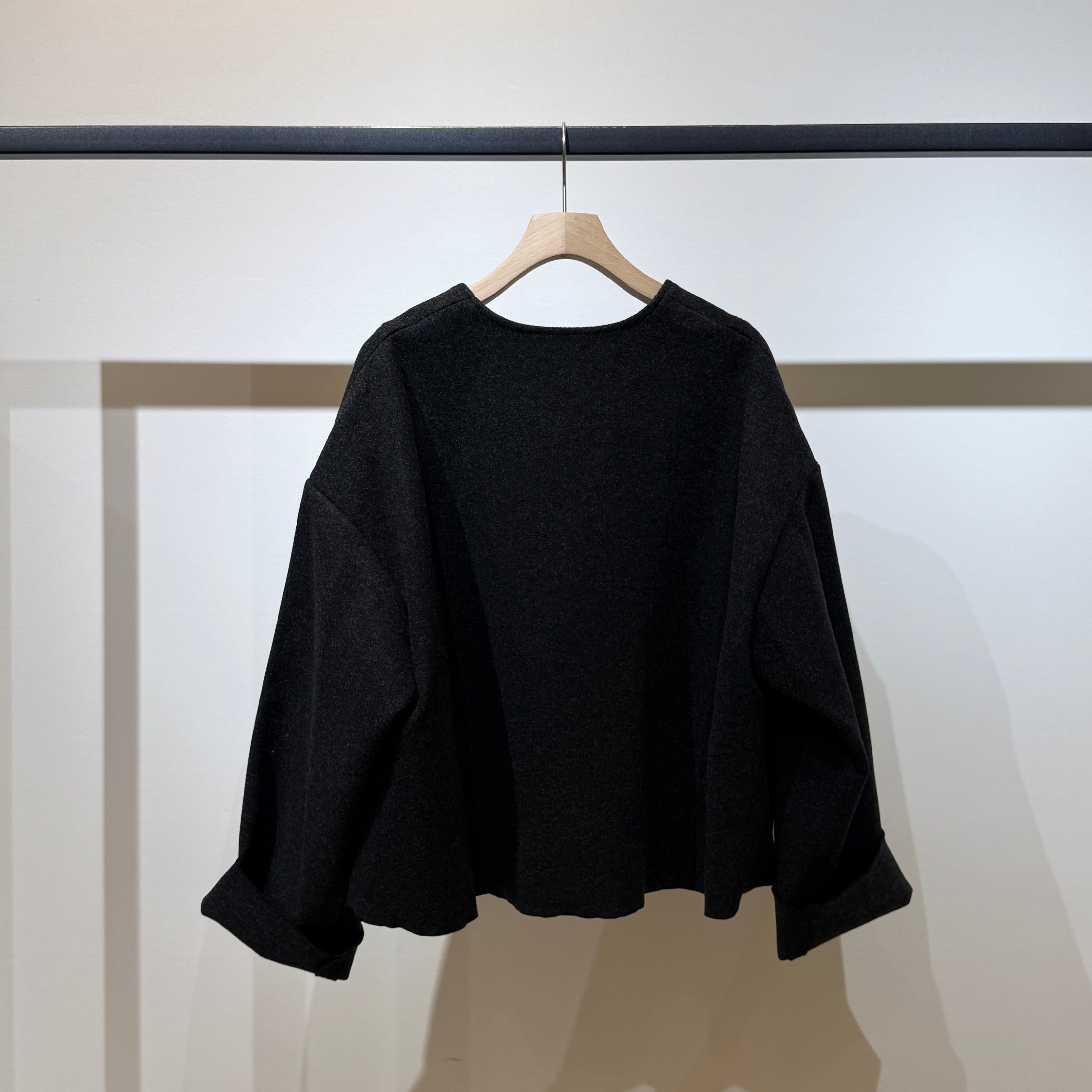 ノーカラーですっきりとした衿元と大き目の身幅でインナーに着こめるサイズ感が魅力です。