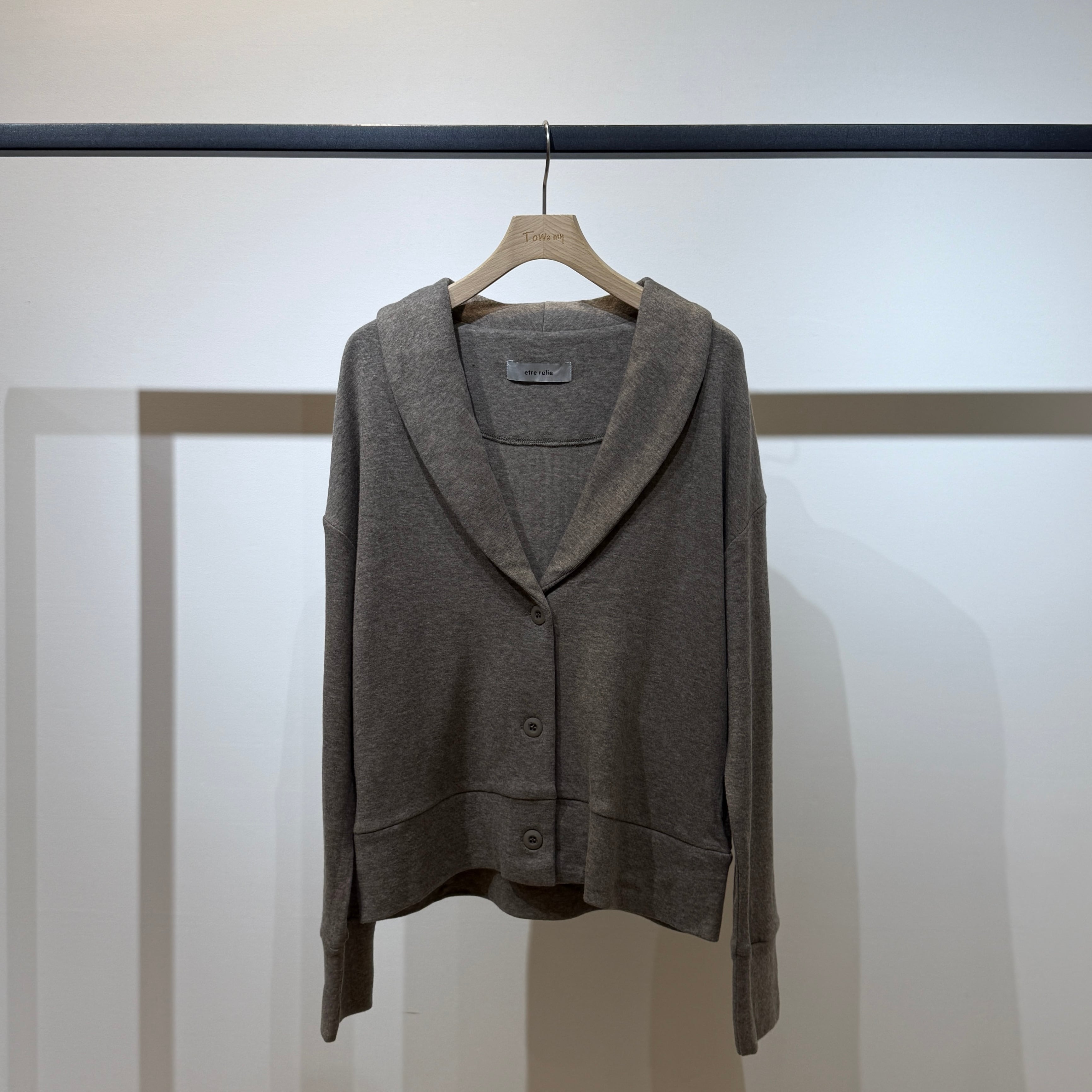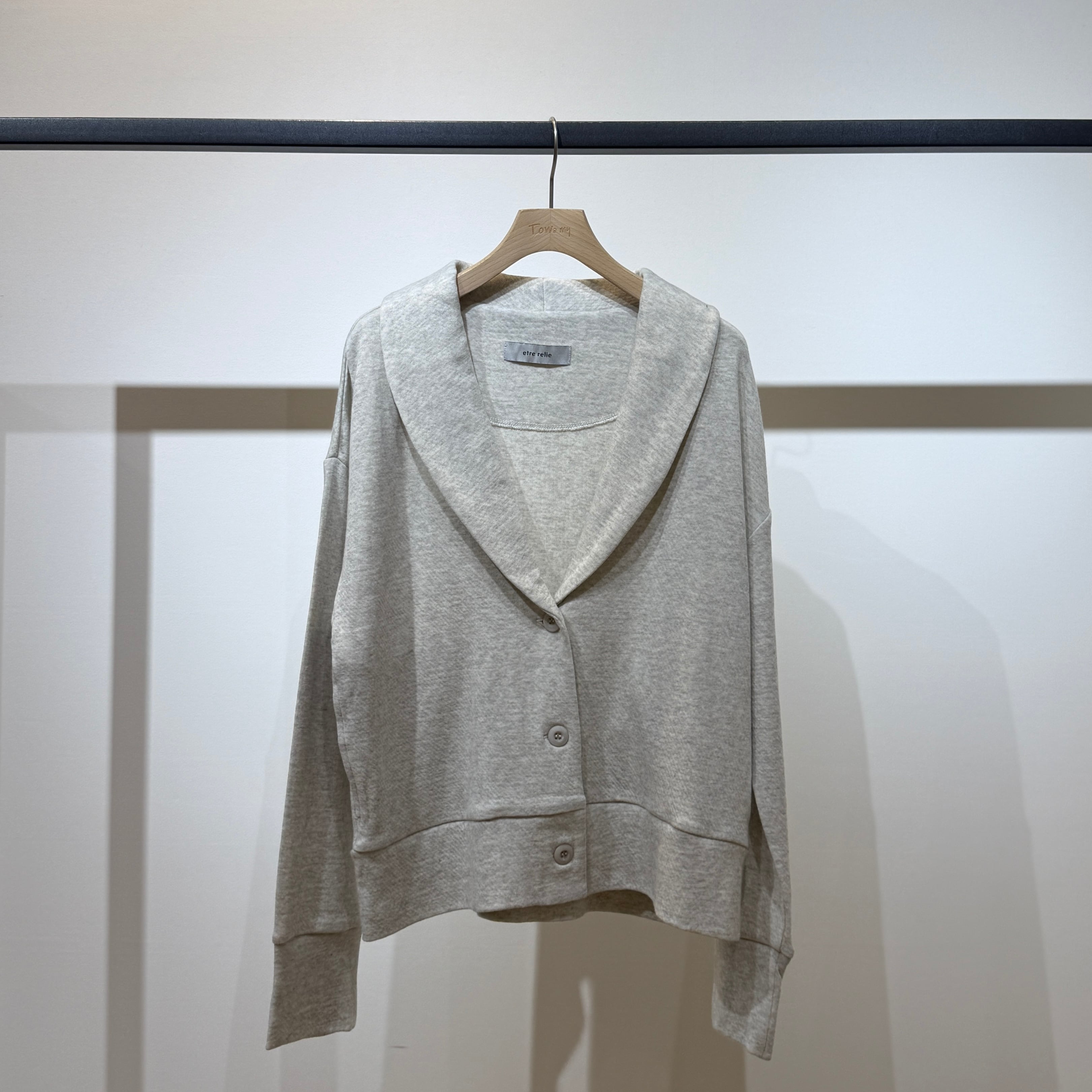ショール衿の柔らかいラインが女性らしい印象をつくり、ボトムを選ばない絶妙な丈感でバランスよく着られる一枚。