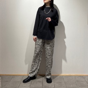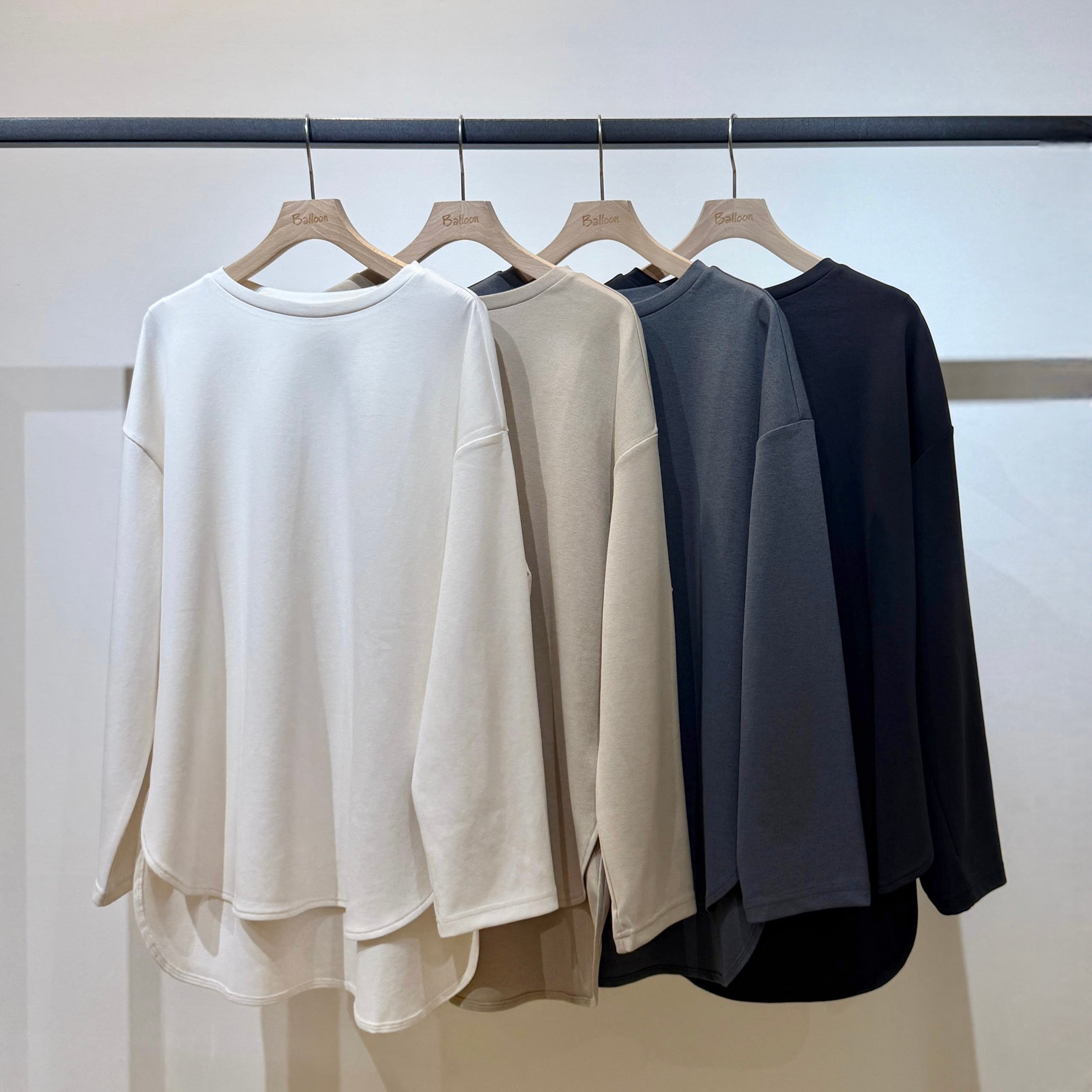 透けにくく体のラインを拾いにくいリラクシーなシルエットで、サイドのラウンドカットが抜け感を演出。