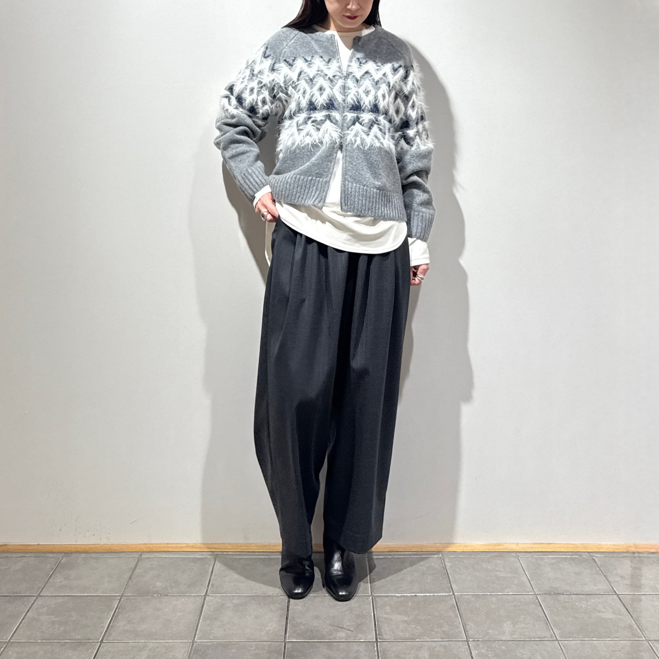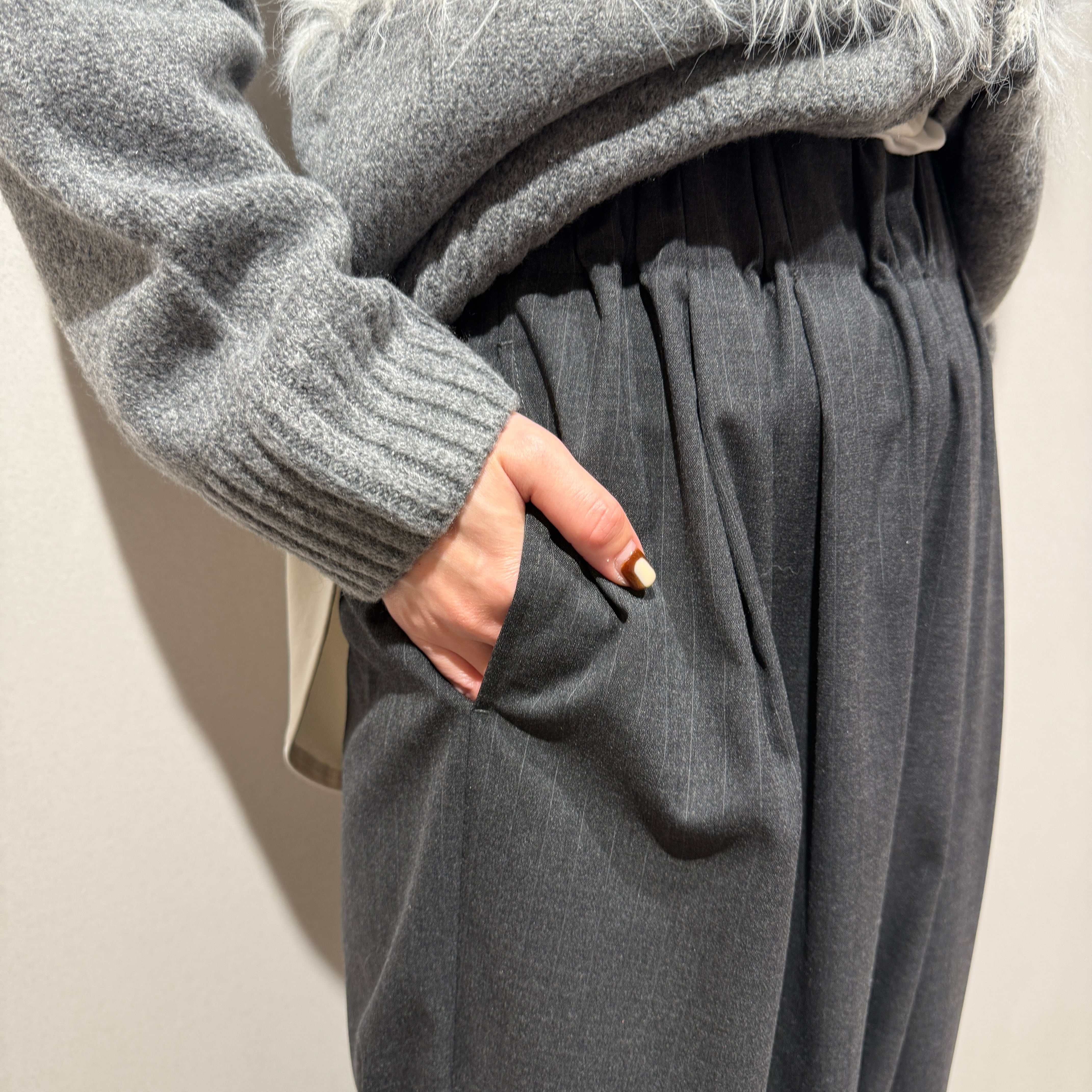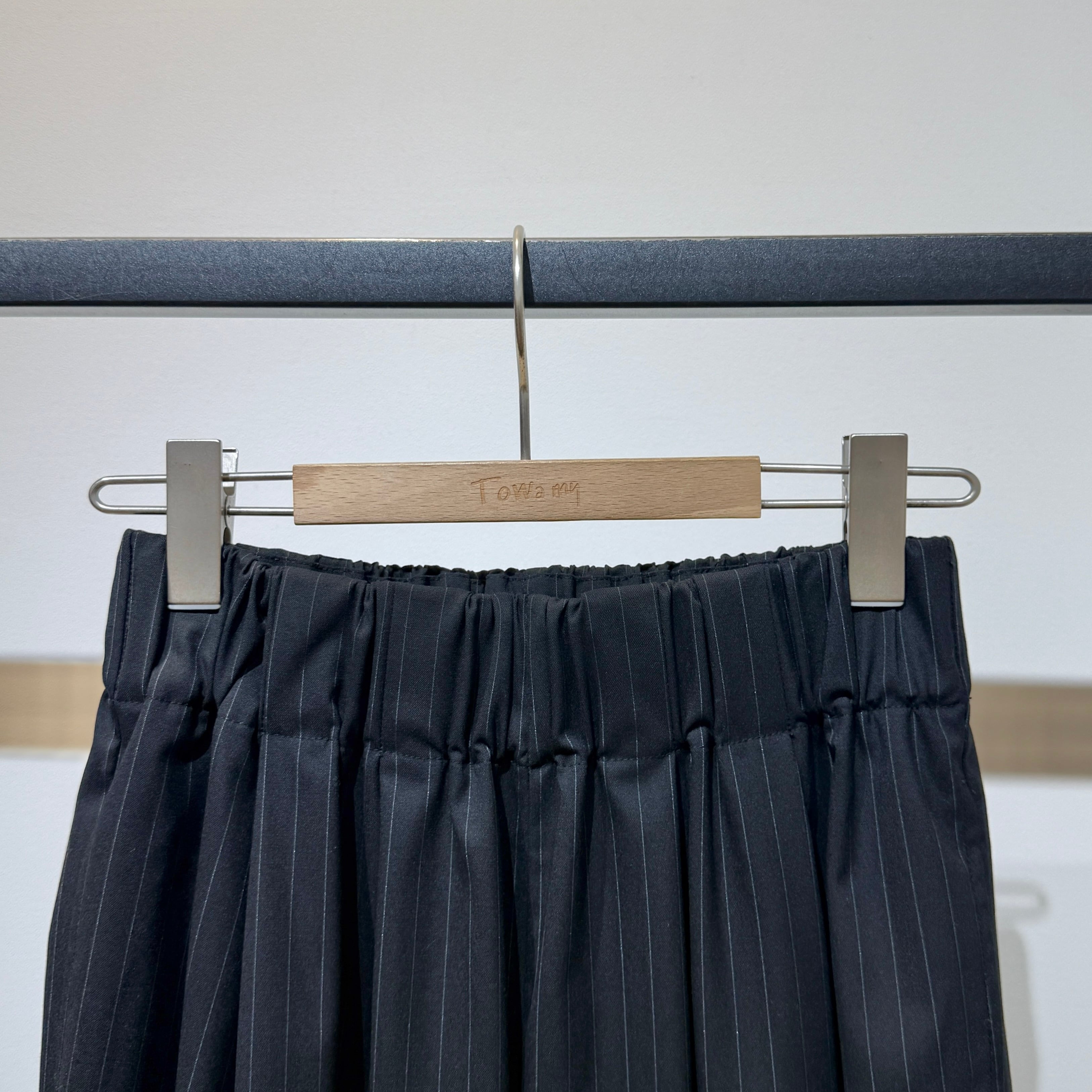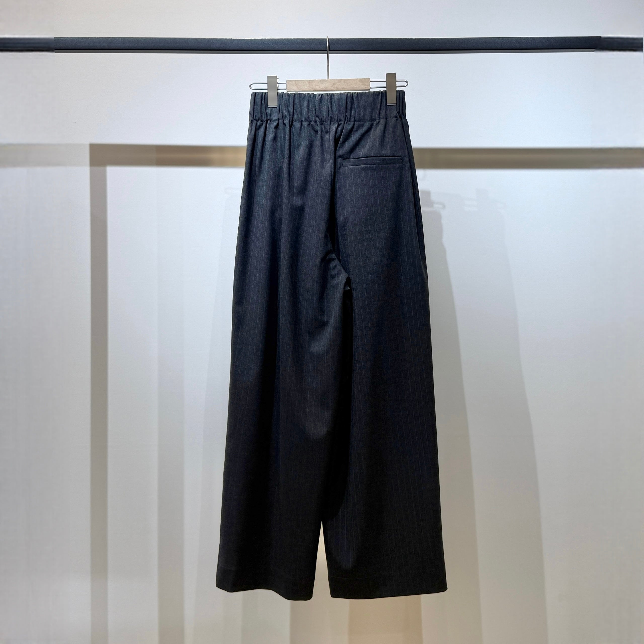 太幅ゴムのウエストとタック・ギャザー使いにより、ヒップや腰まわりを拾いにくい分量感のあるワイドシルエット。