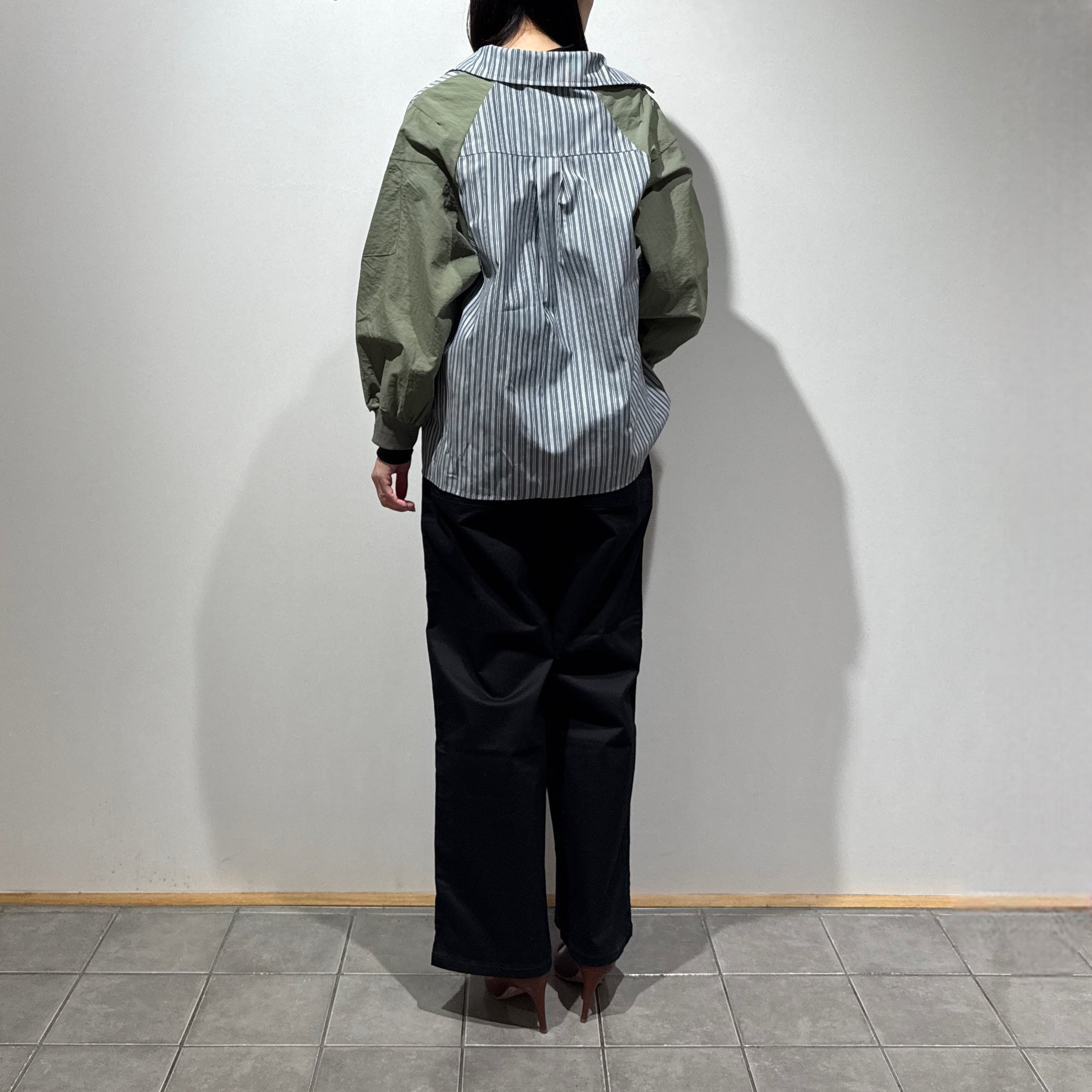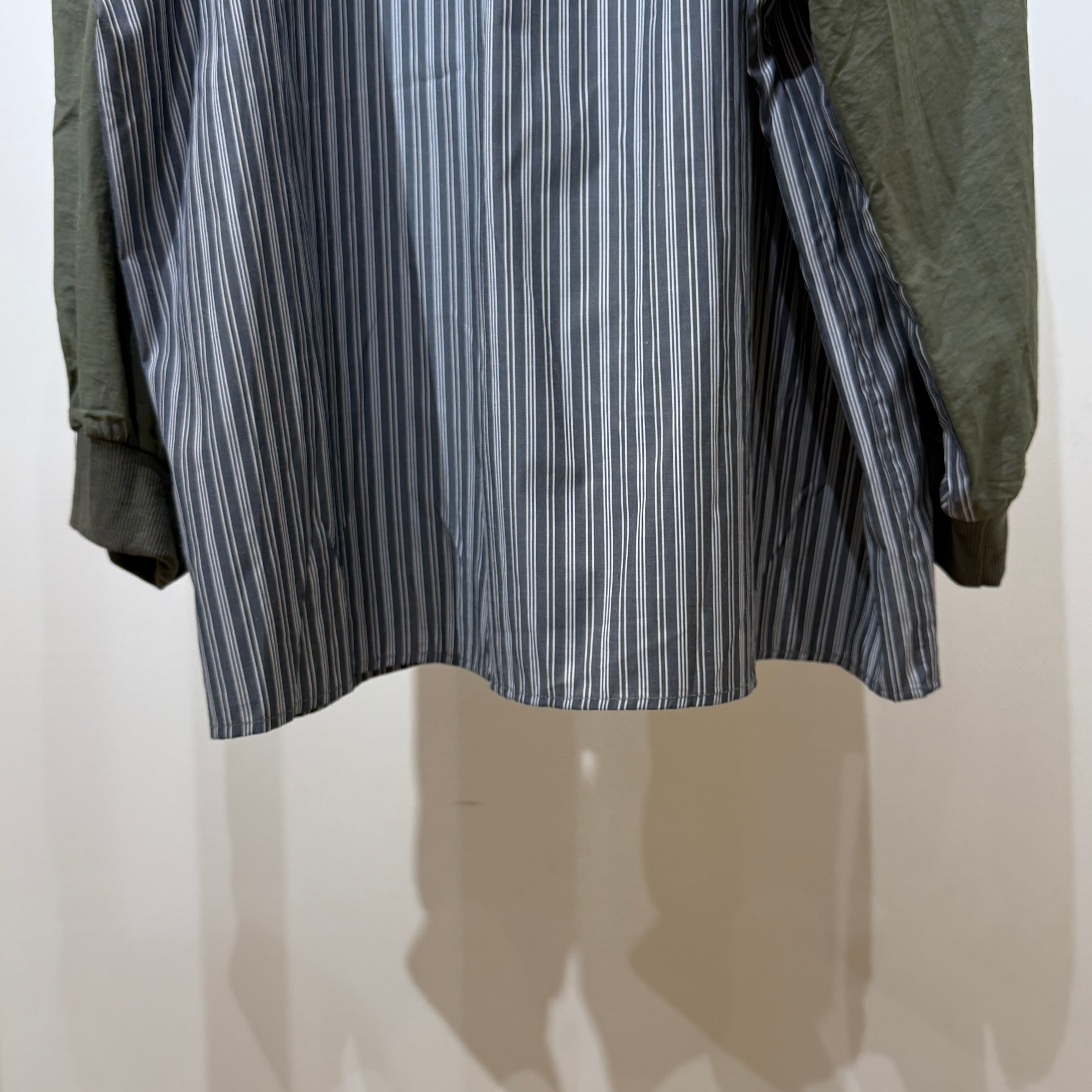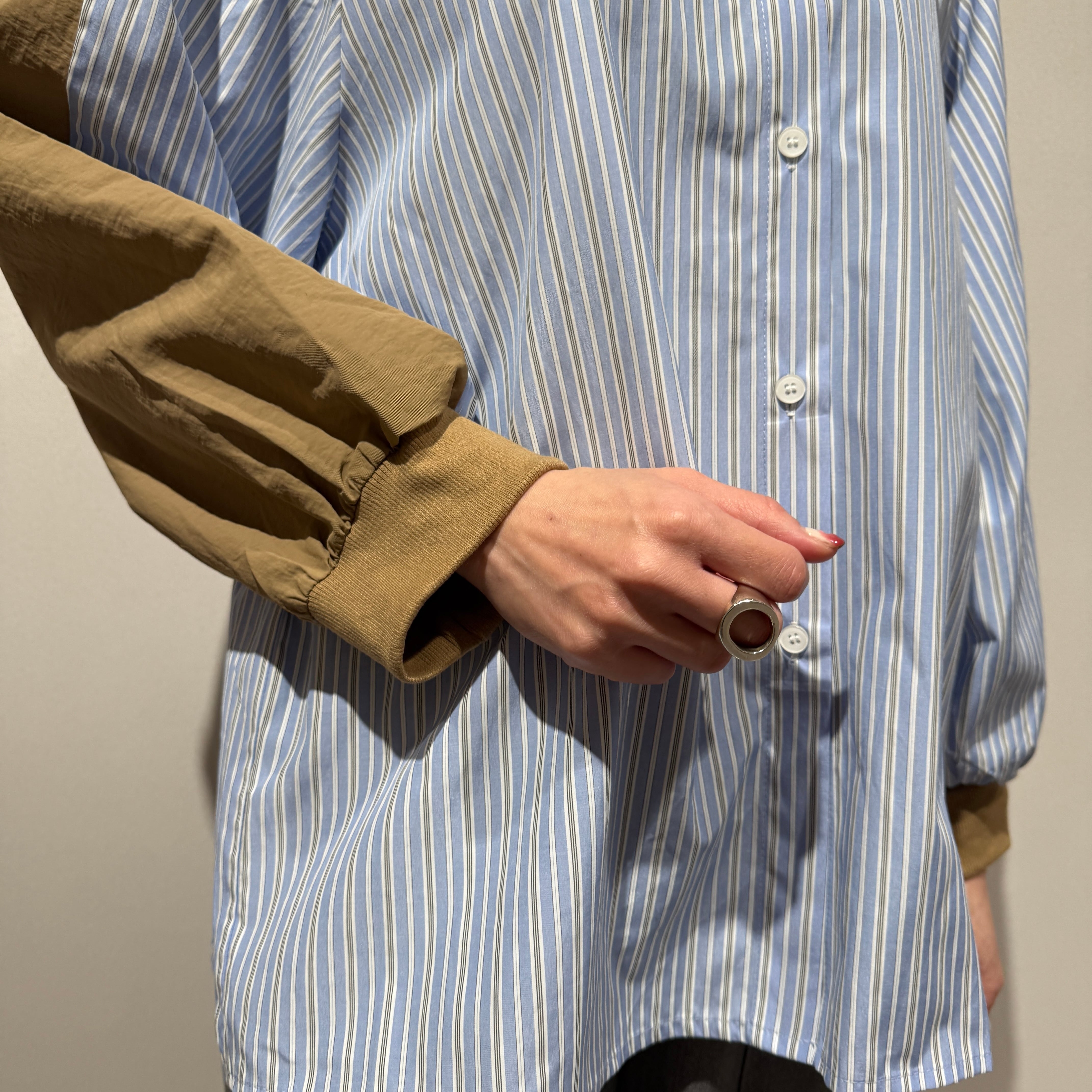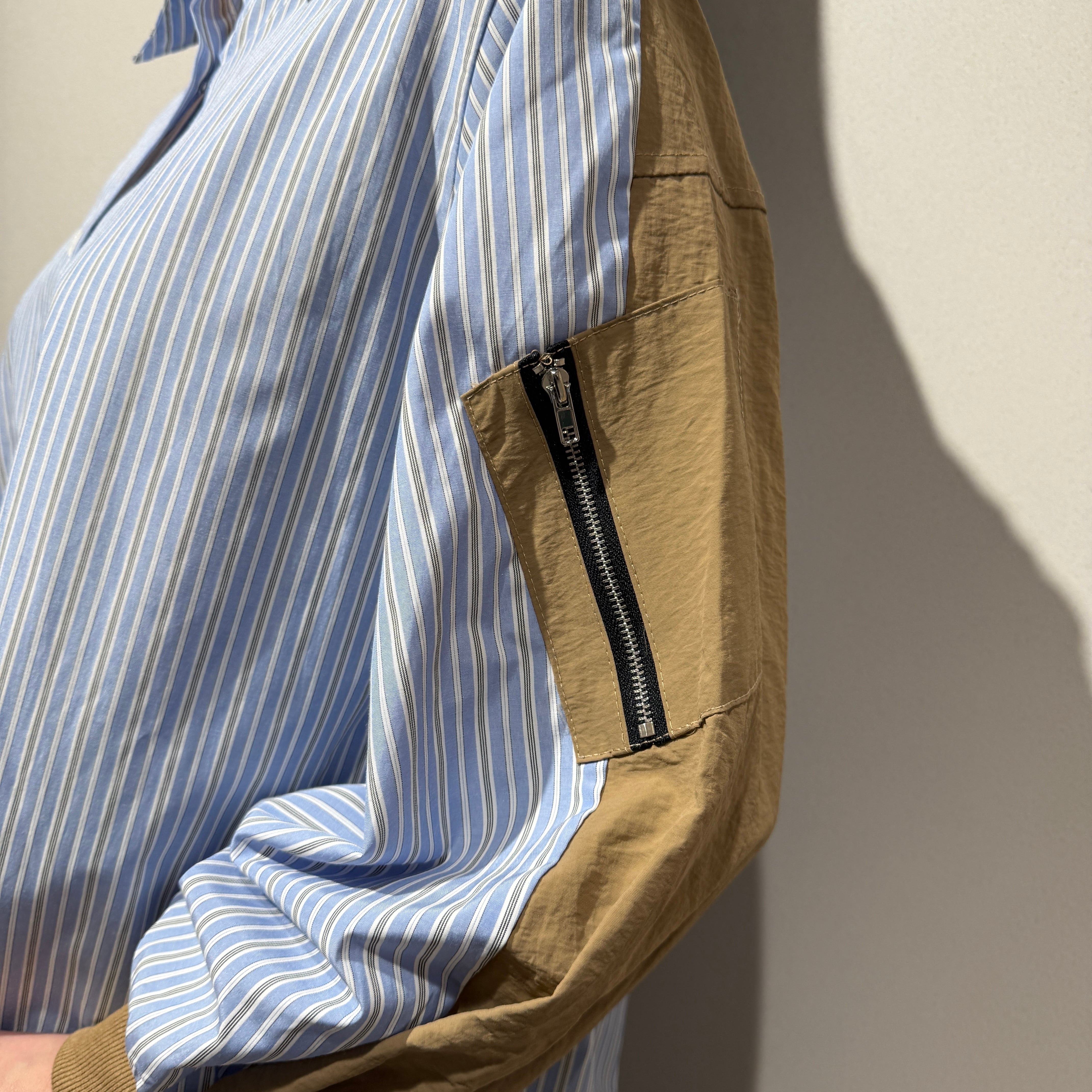 身頃はさらっとした肌触りのストライプ布帛素材、袖部分には程よくハリのある異素材を使用しています。