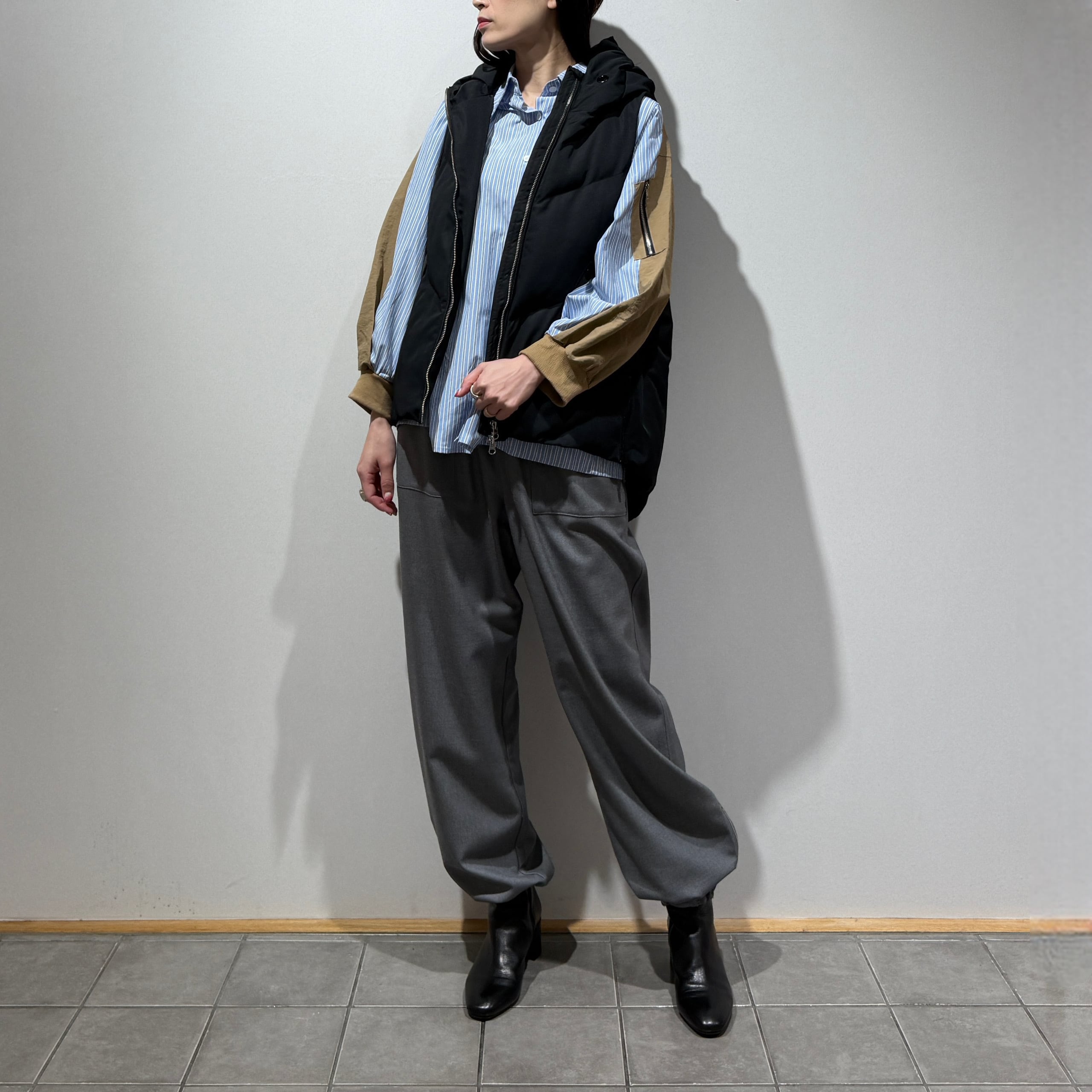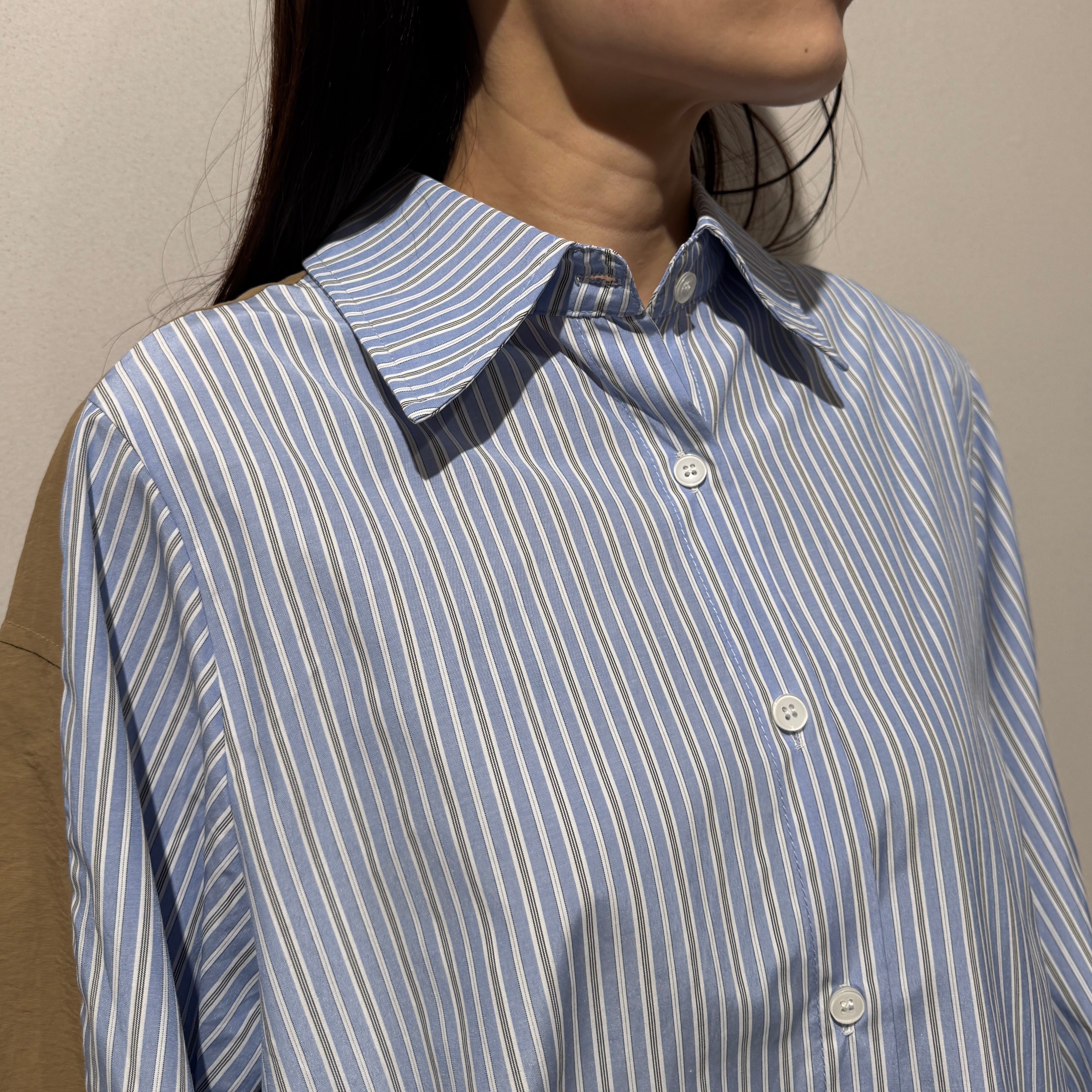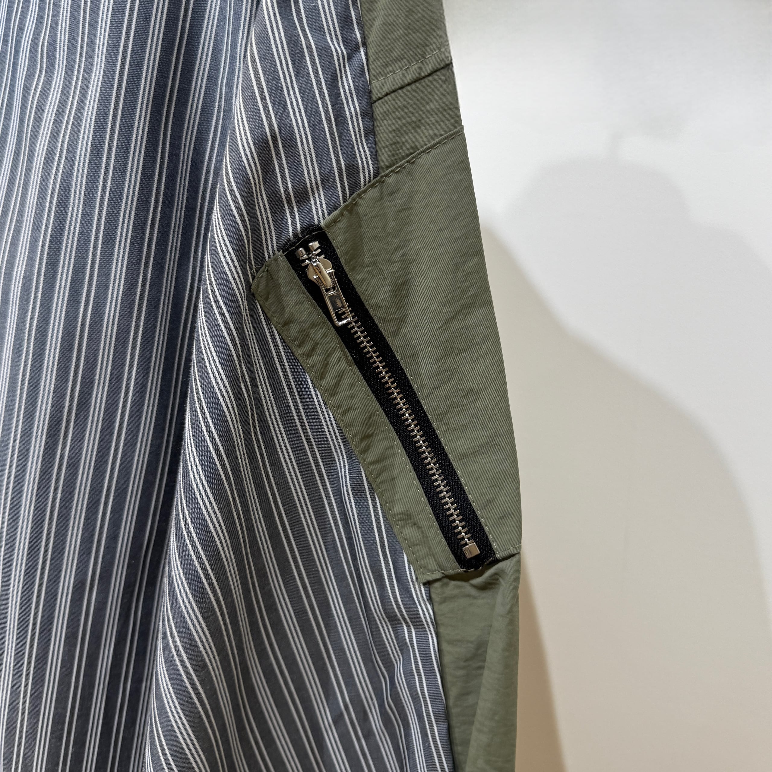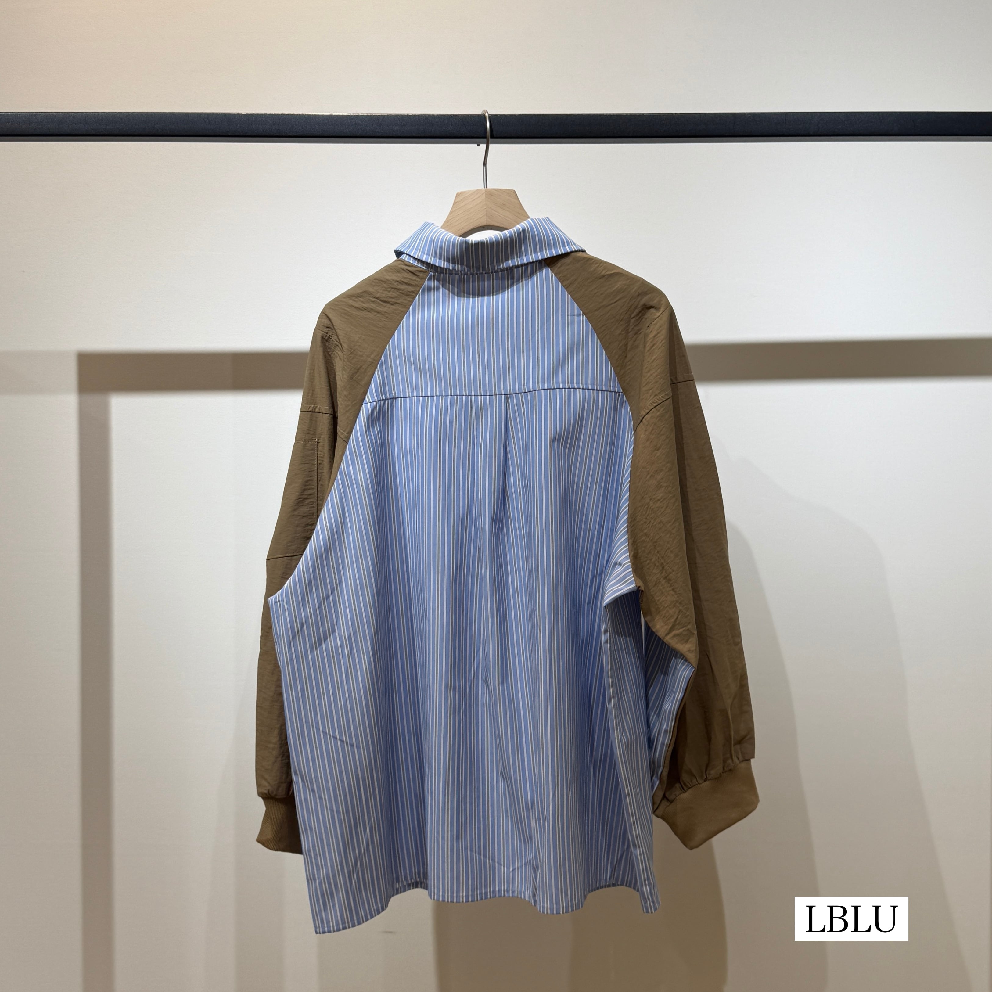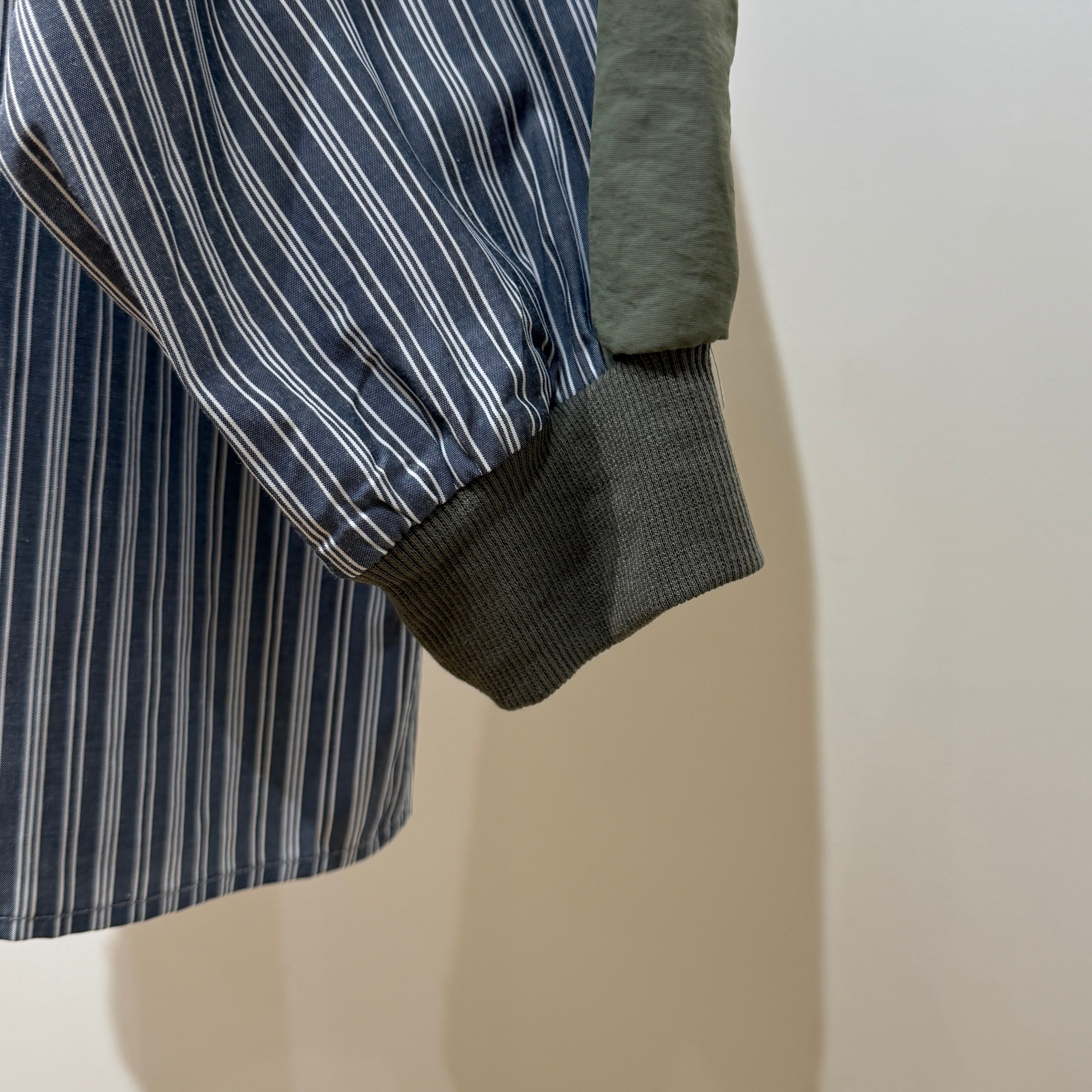 身頃はさらっとした肌触りのストライプ布帛素材、袖部分には程よくハリのある異素材を使用しています。