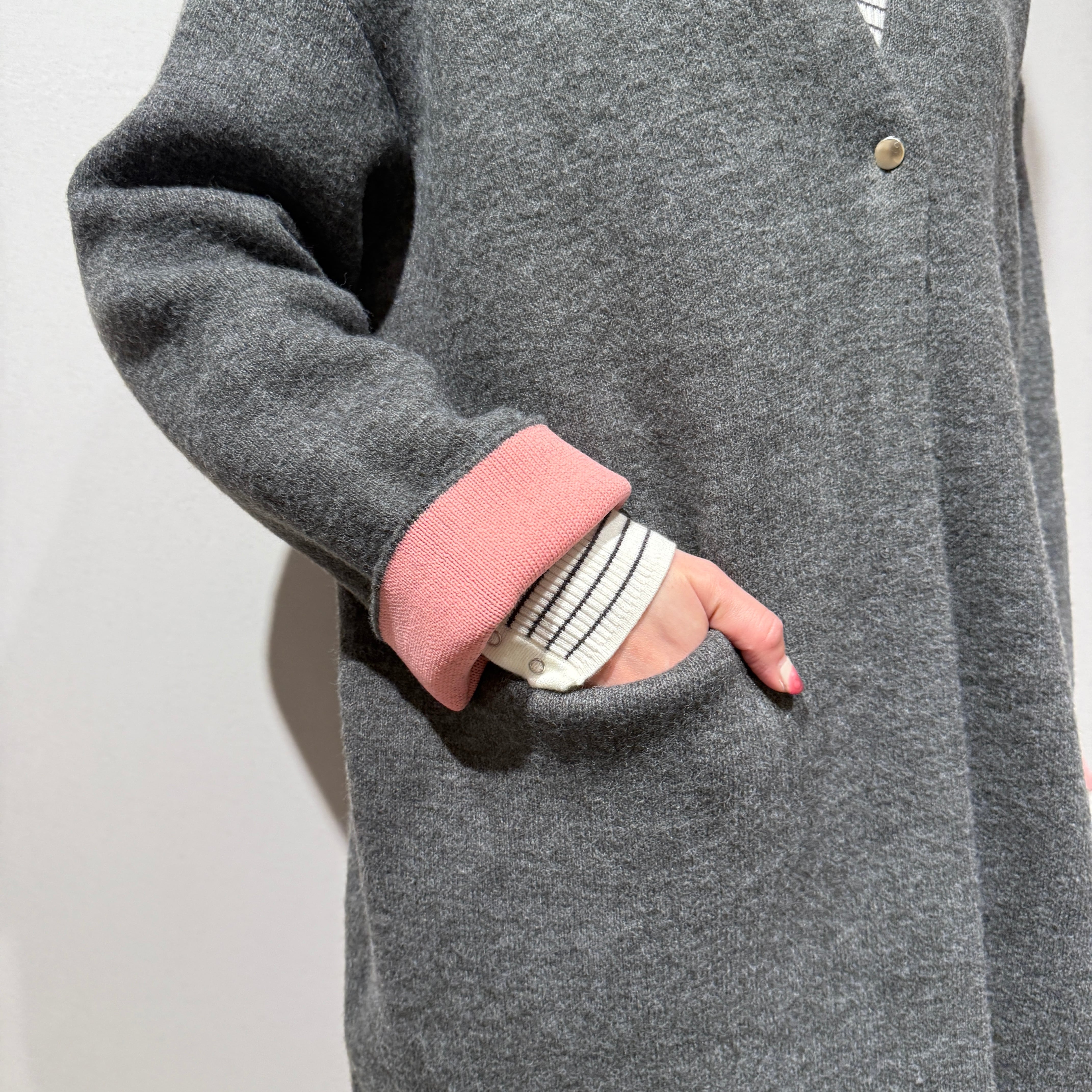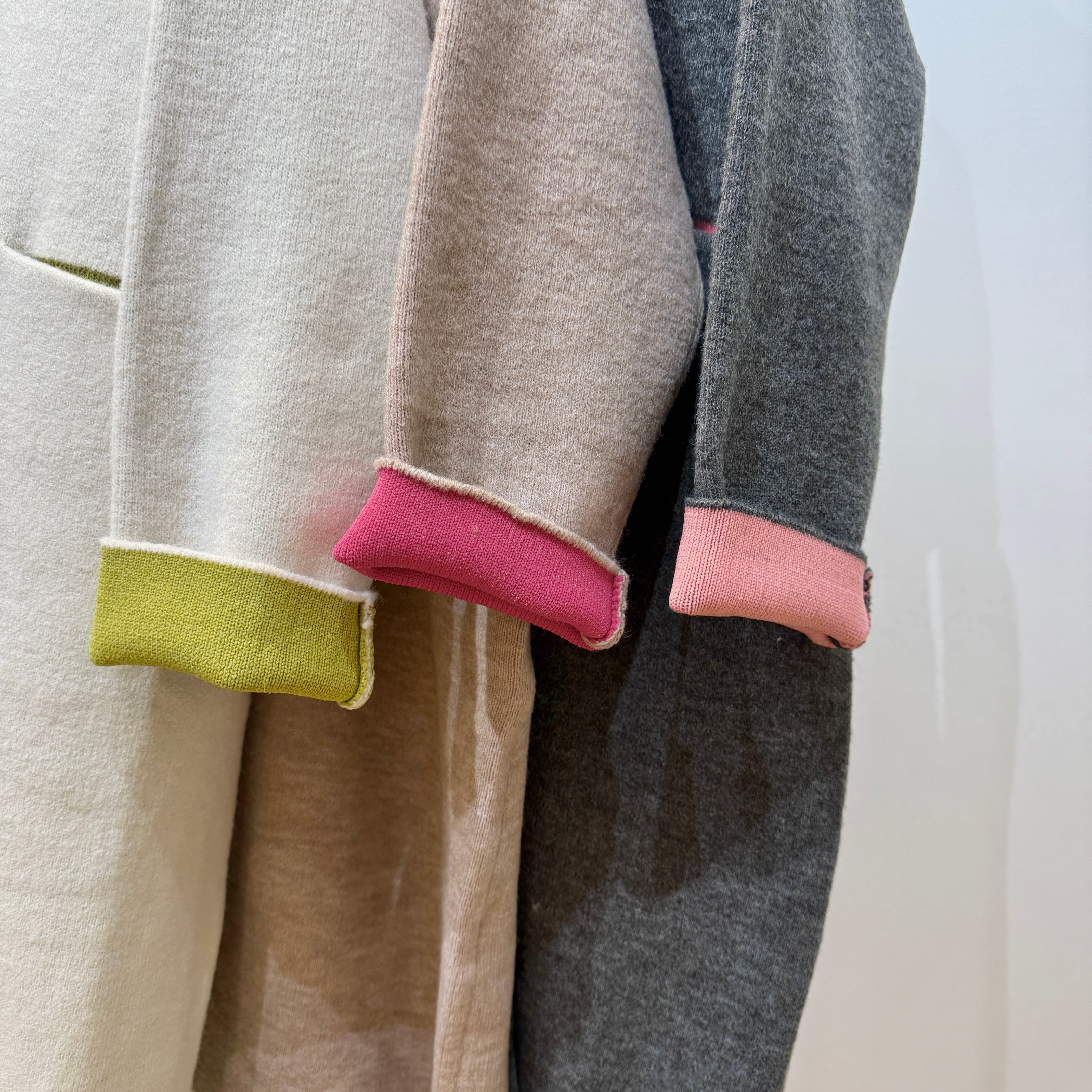 前ボタンは一つの仕様で着流し風に着用でき、袖を折ると配色が覗くデザイン。