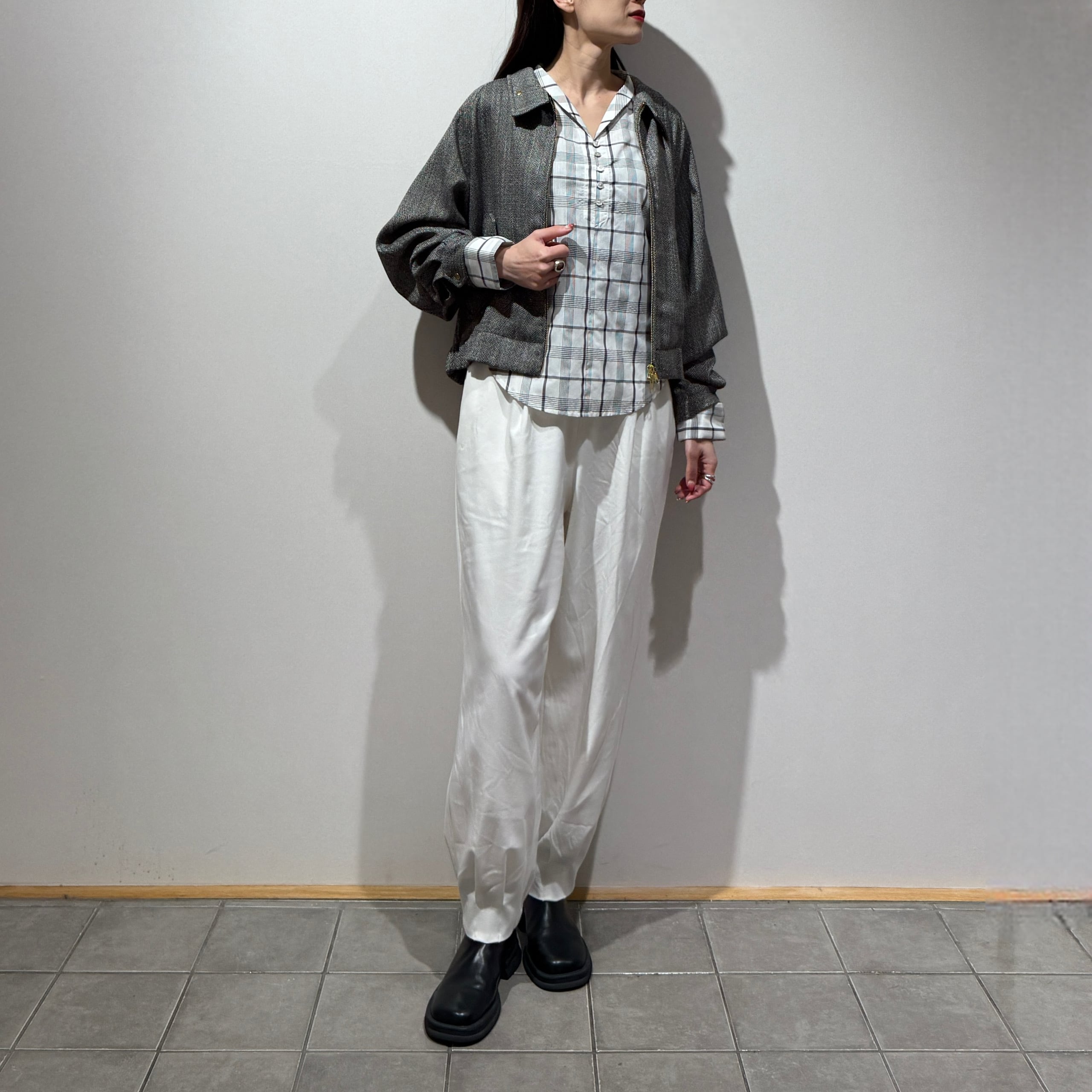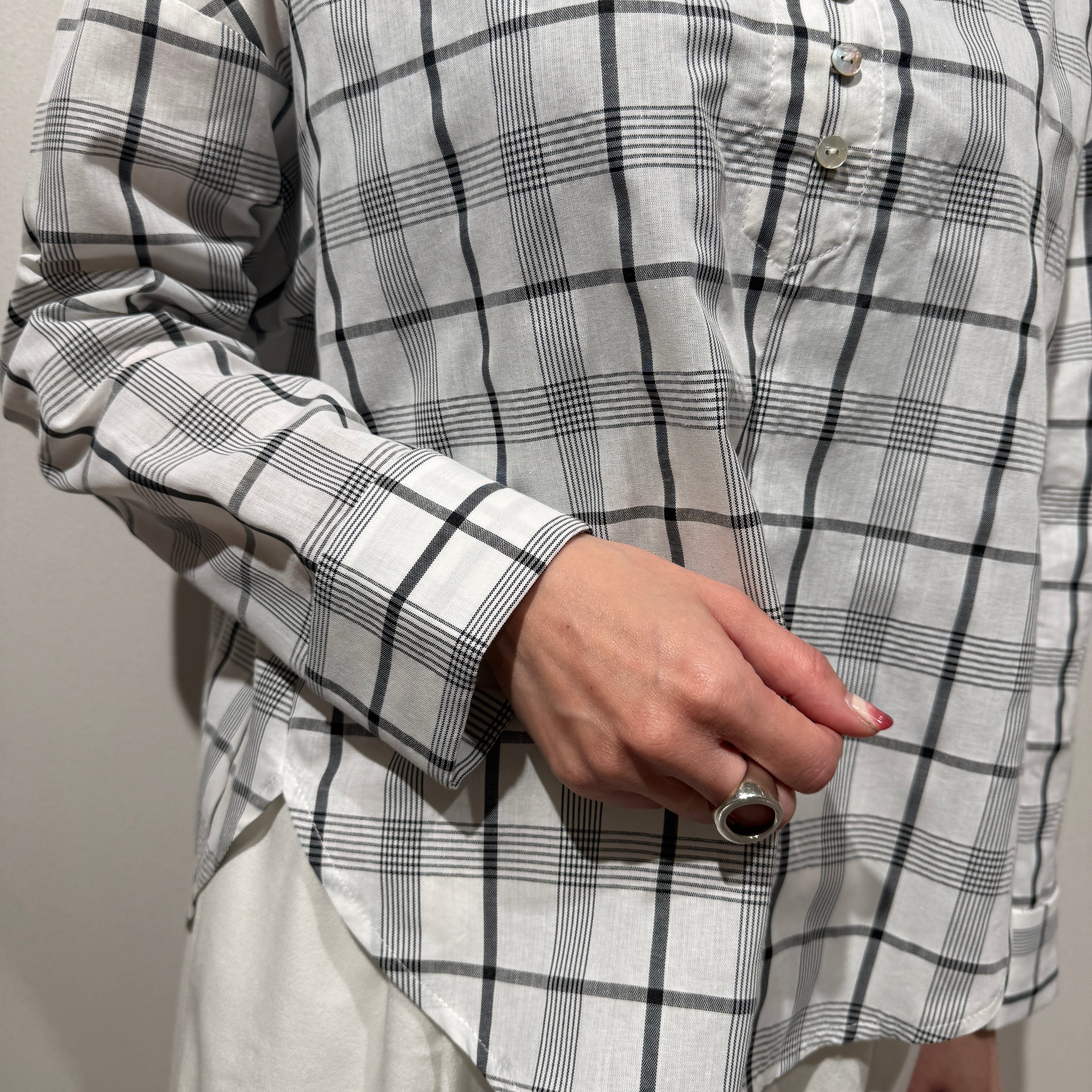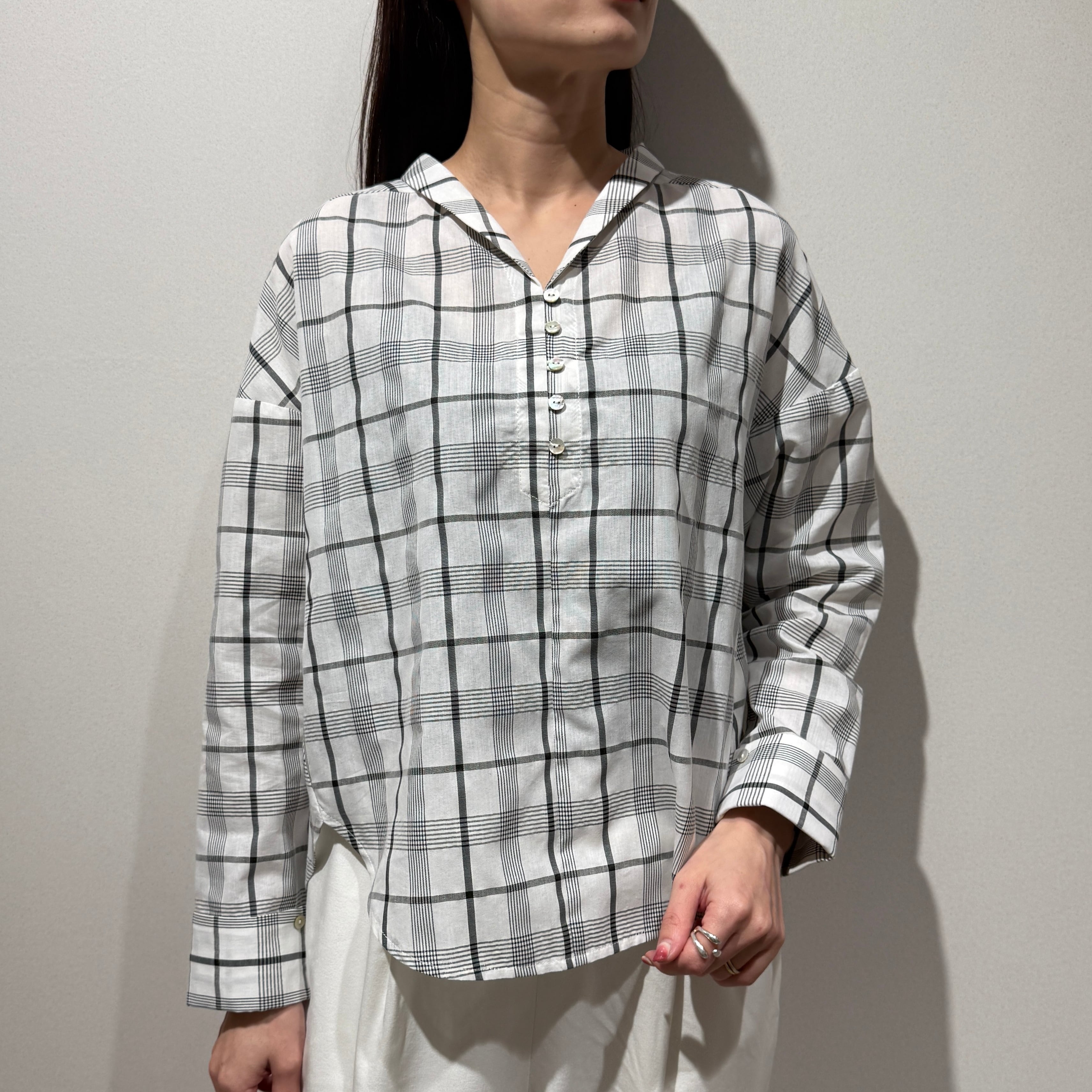 軽やかなチェック柄で、大人の抜け感を演出するボイルチェックちび衿ブラウス。