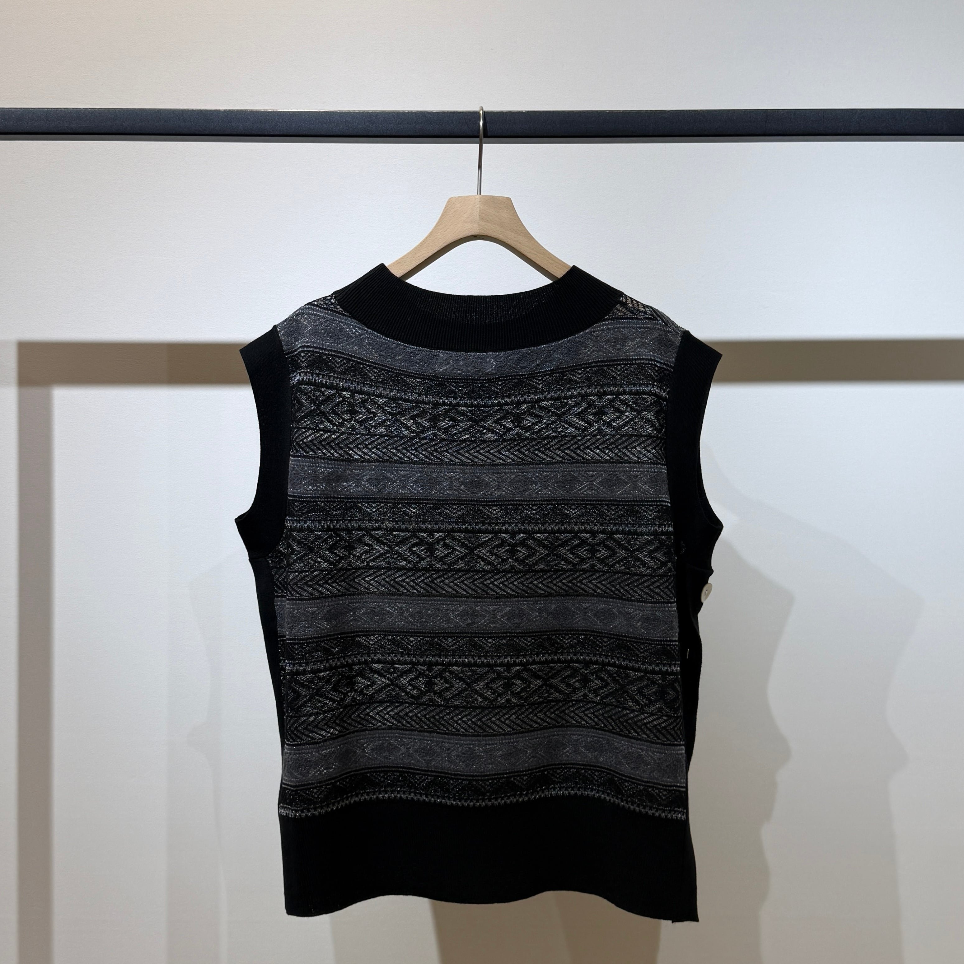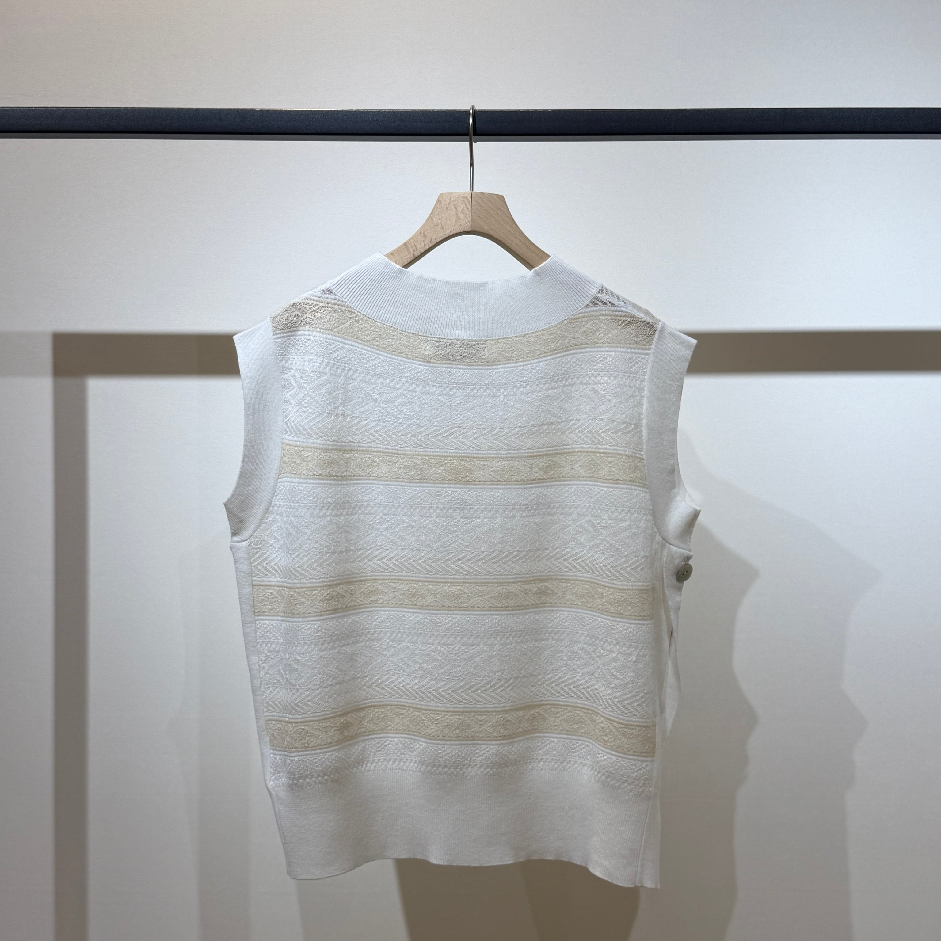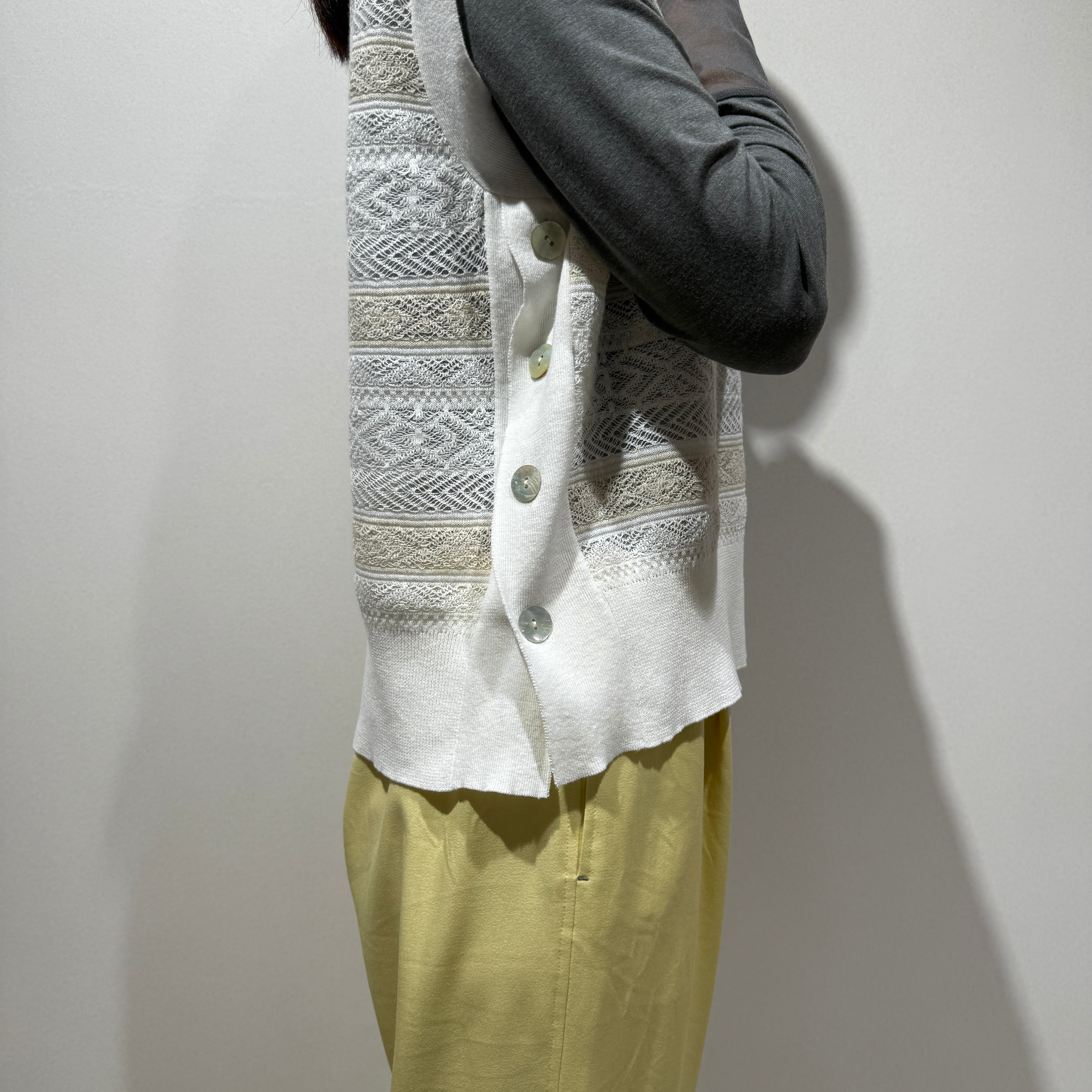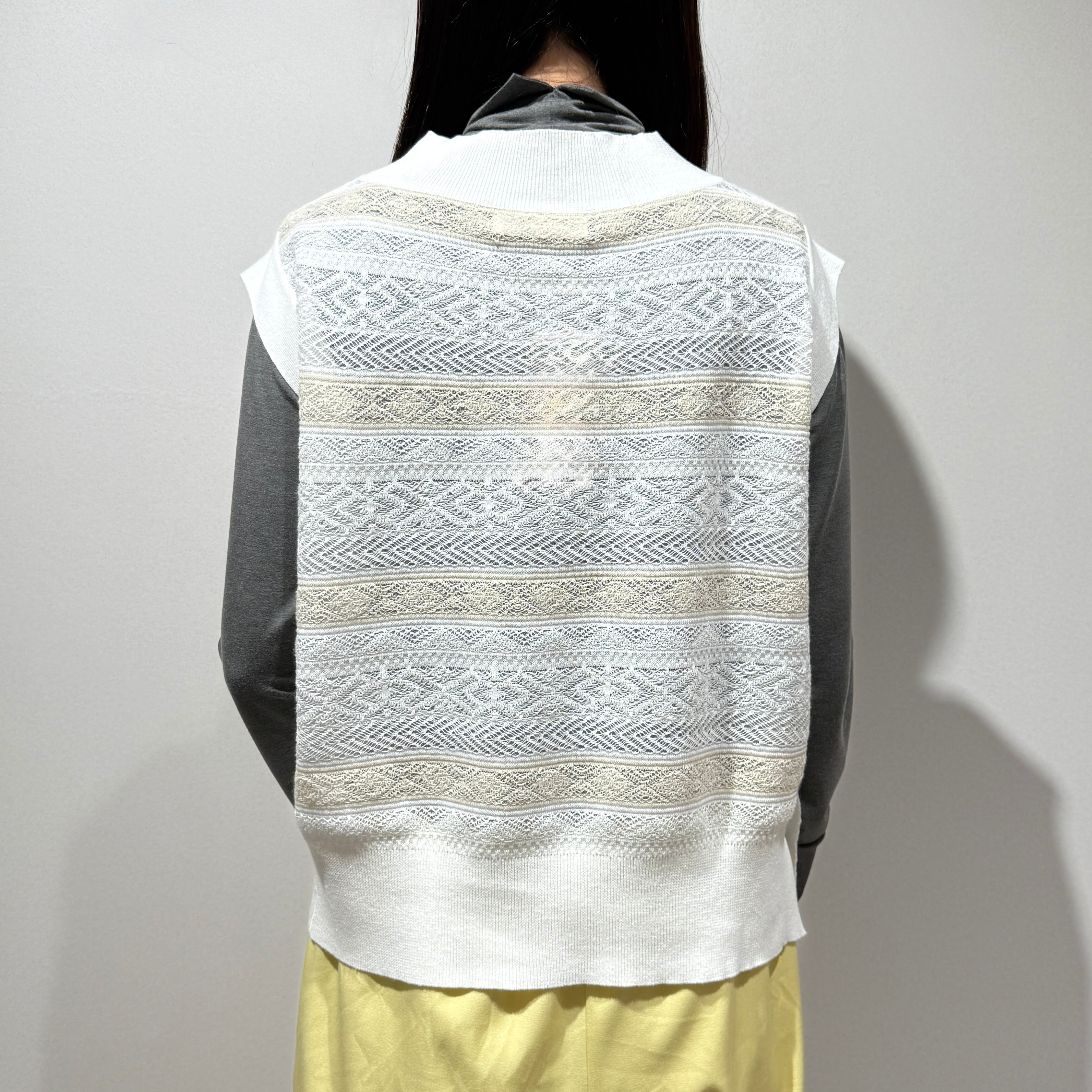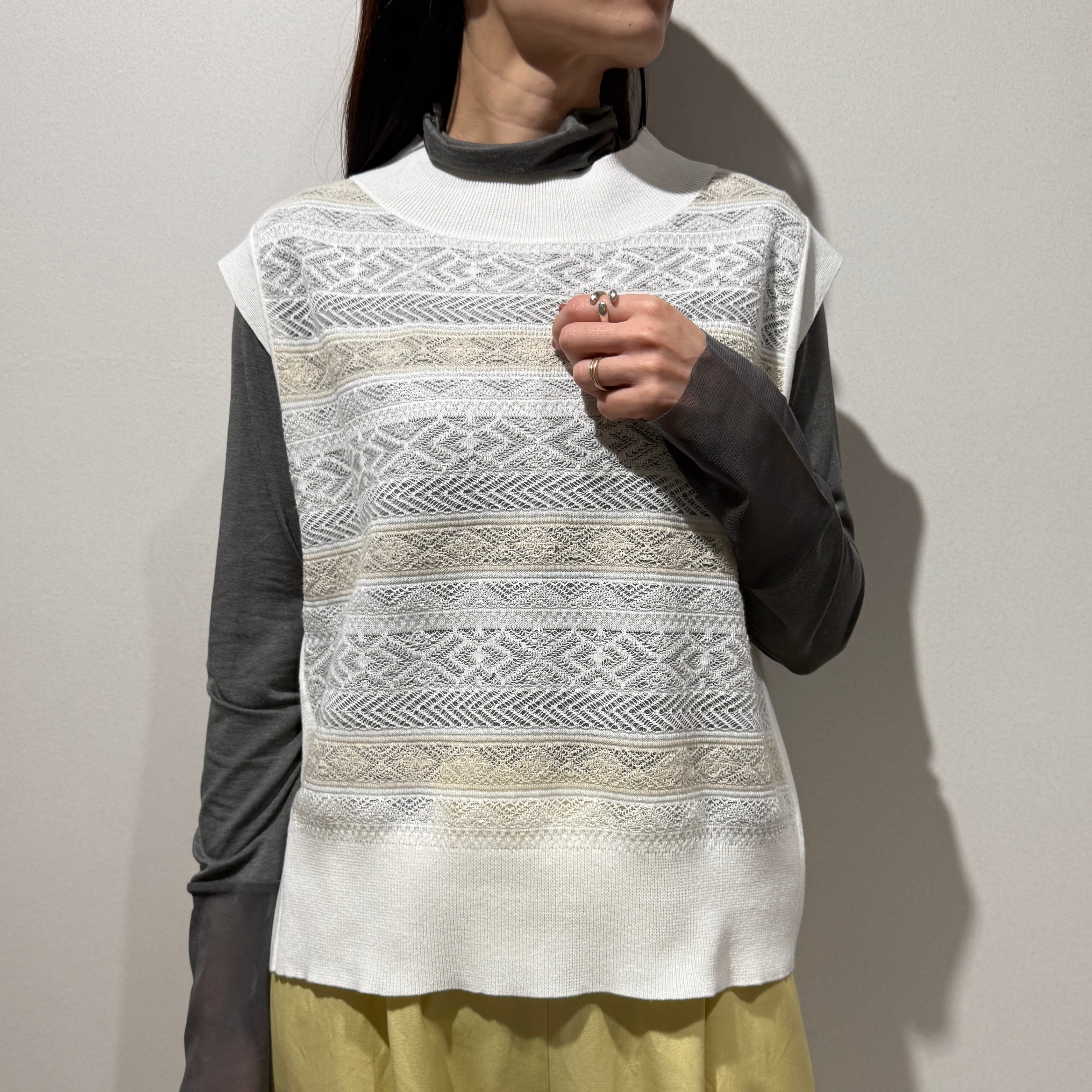 シーズンをまたいで着用できる、軽やかな表情のシースルージャガードニットベスト。