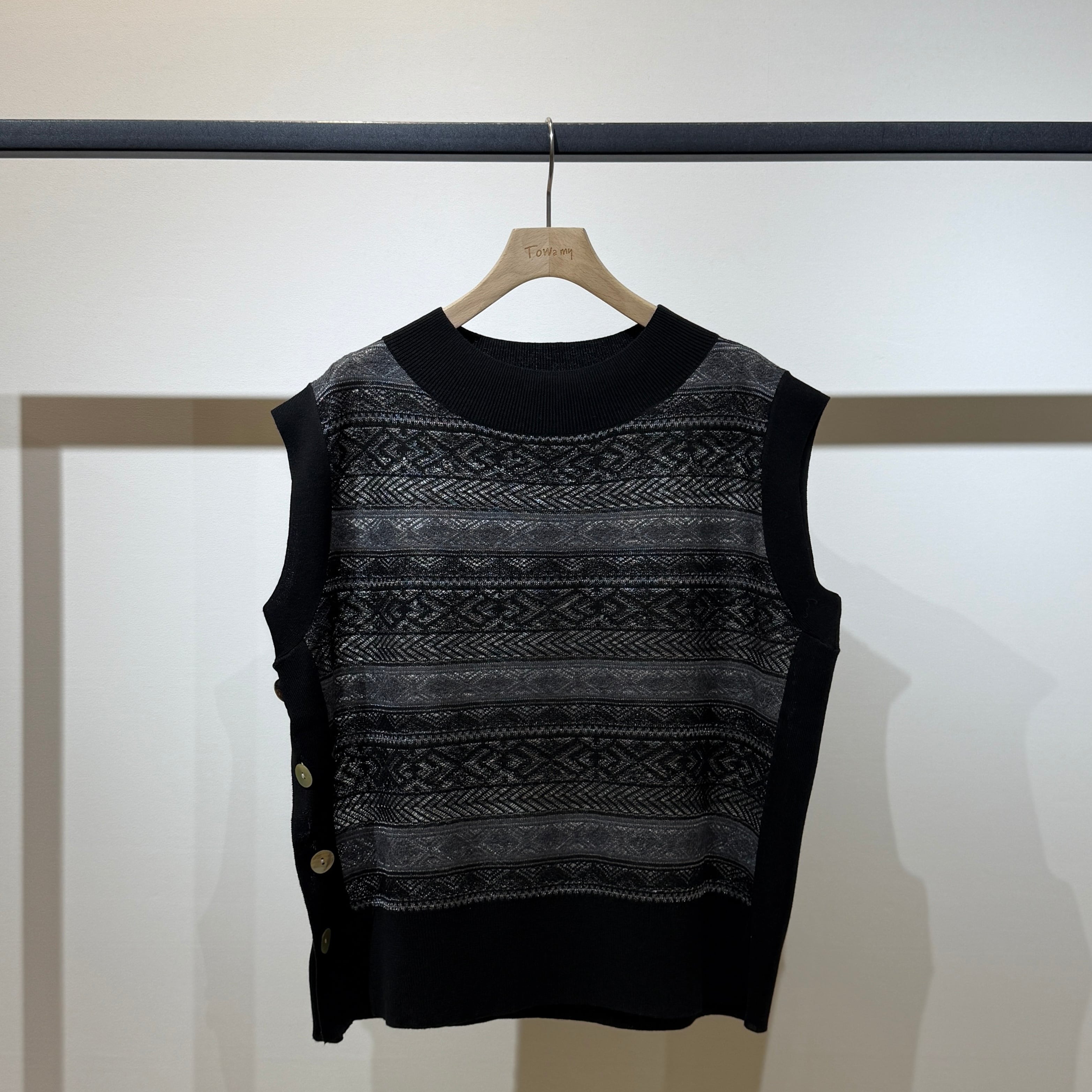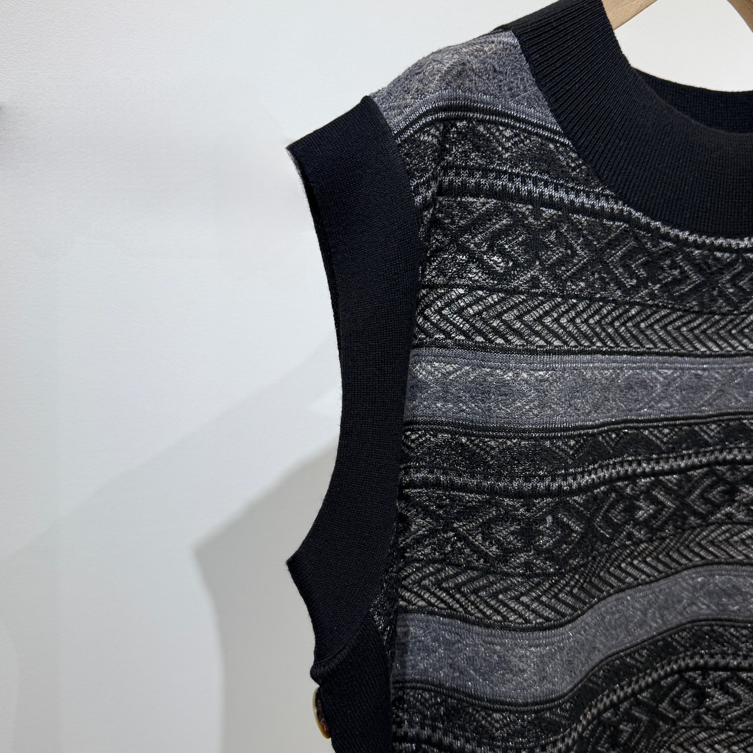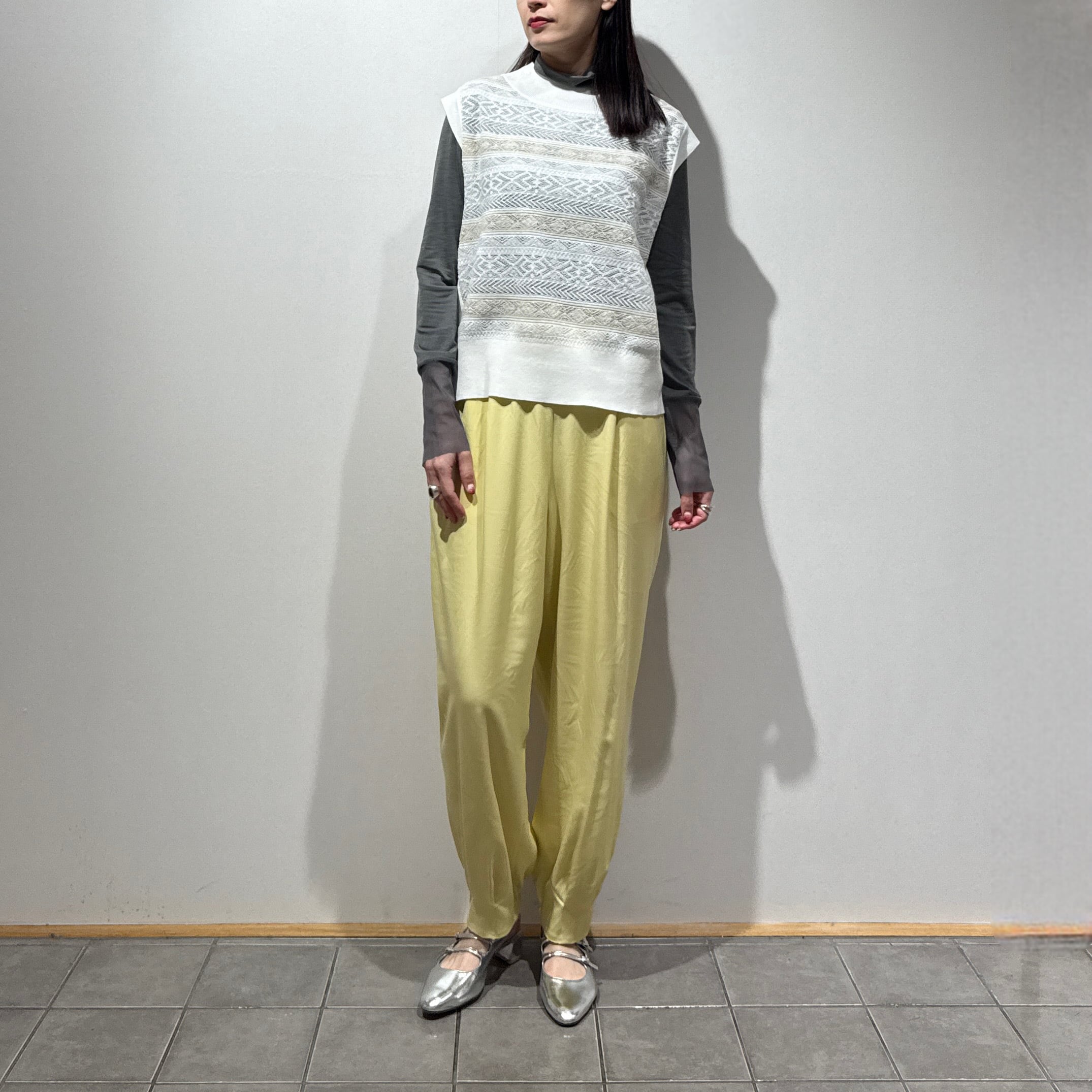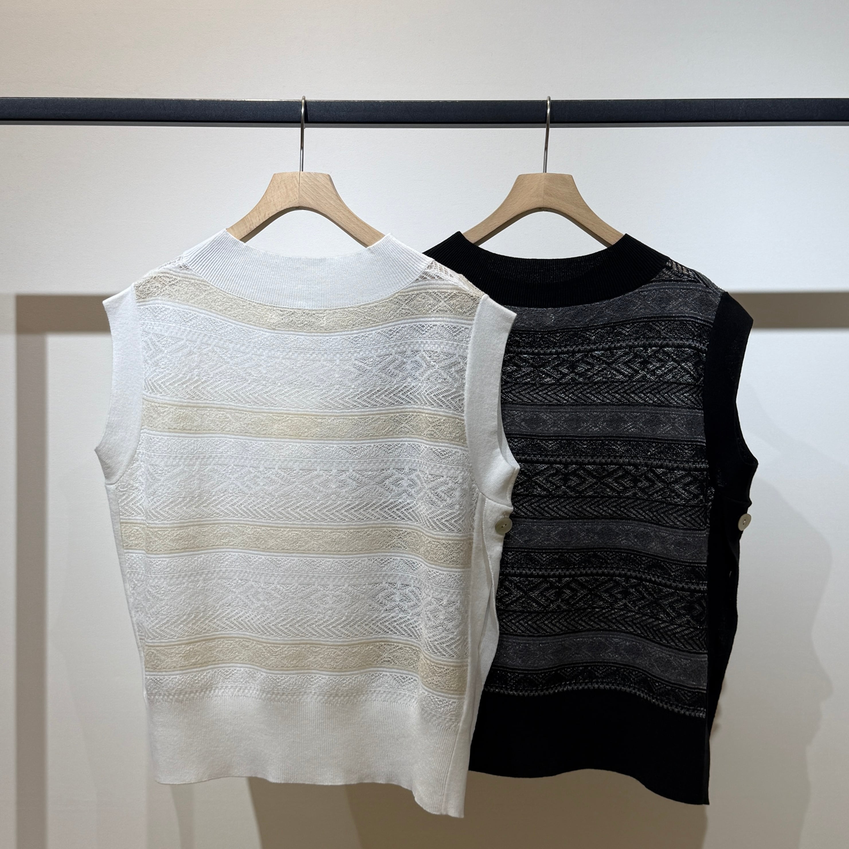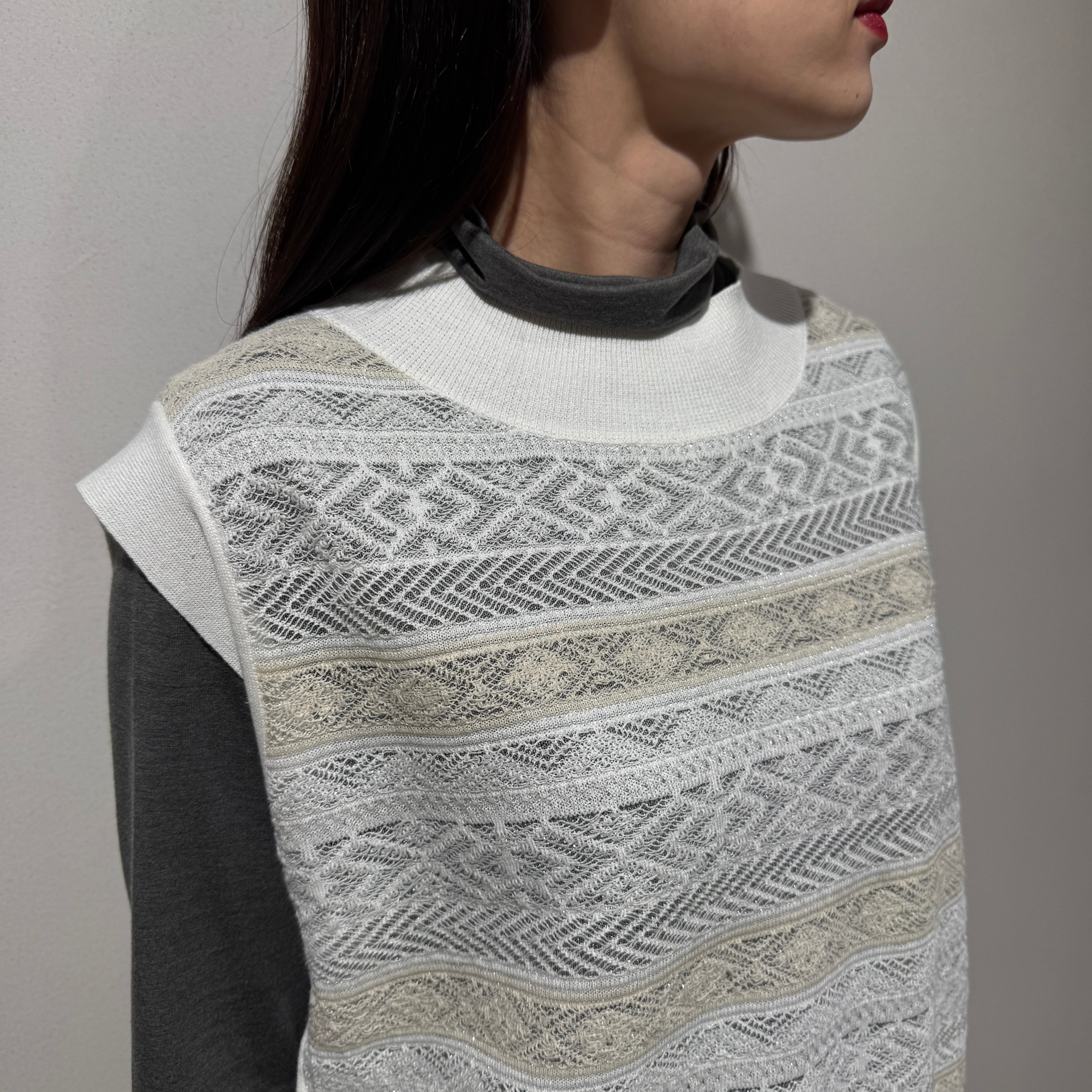 シーズンをまたいで着用できる、軽やかな表情のシースルージャガードニットベスト。