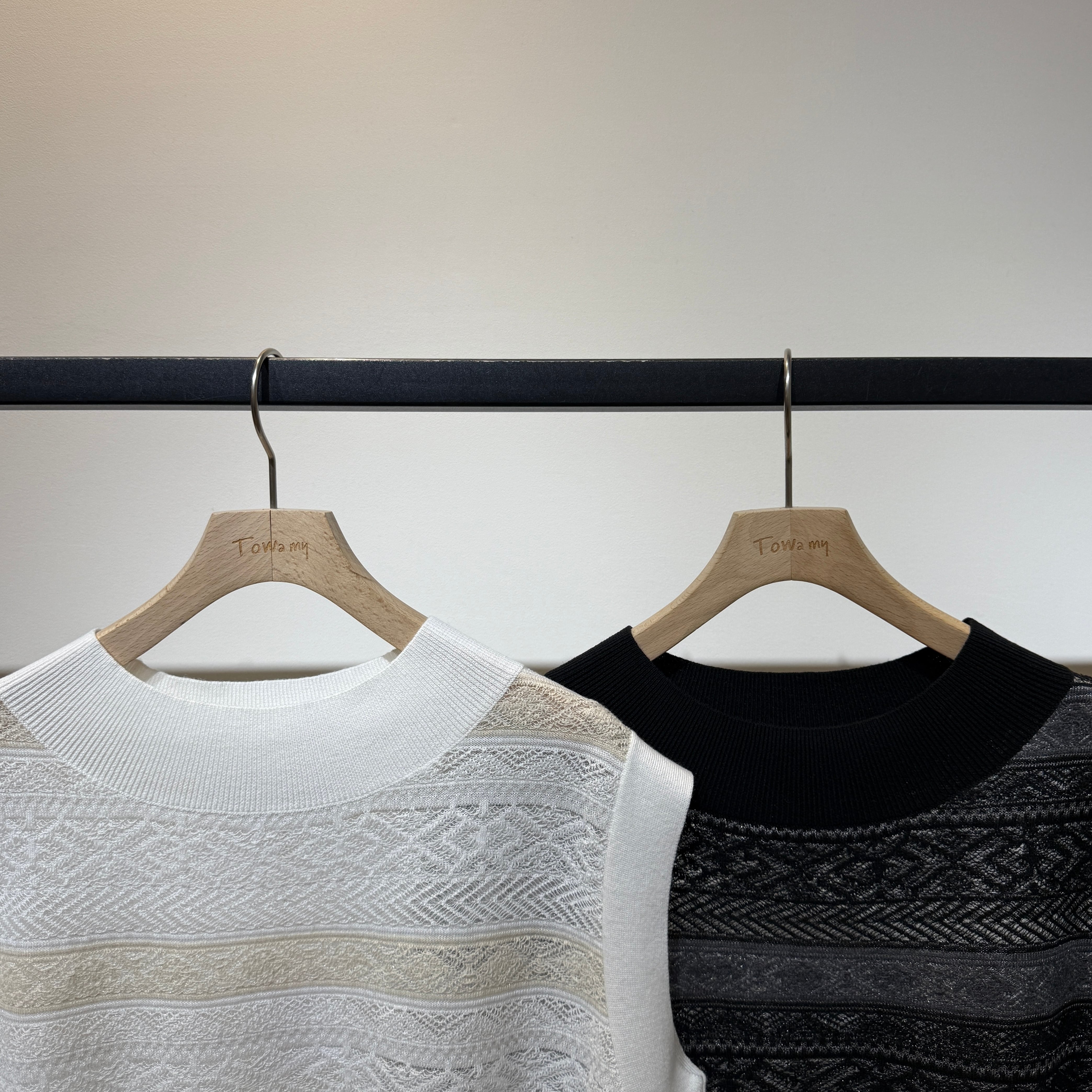 透け感を出すために透明糸をベースに、柄部分は涼しげでクールな糸を使用した編地です。