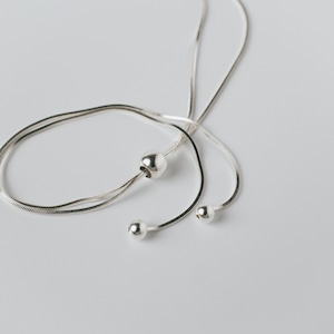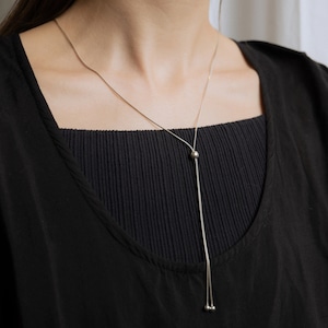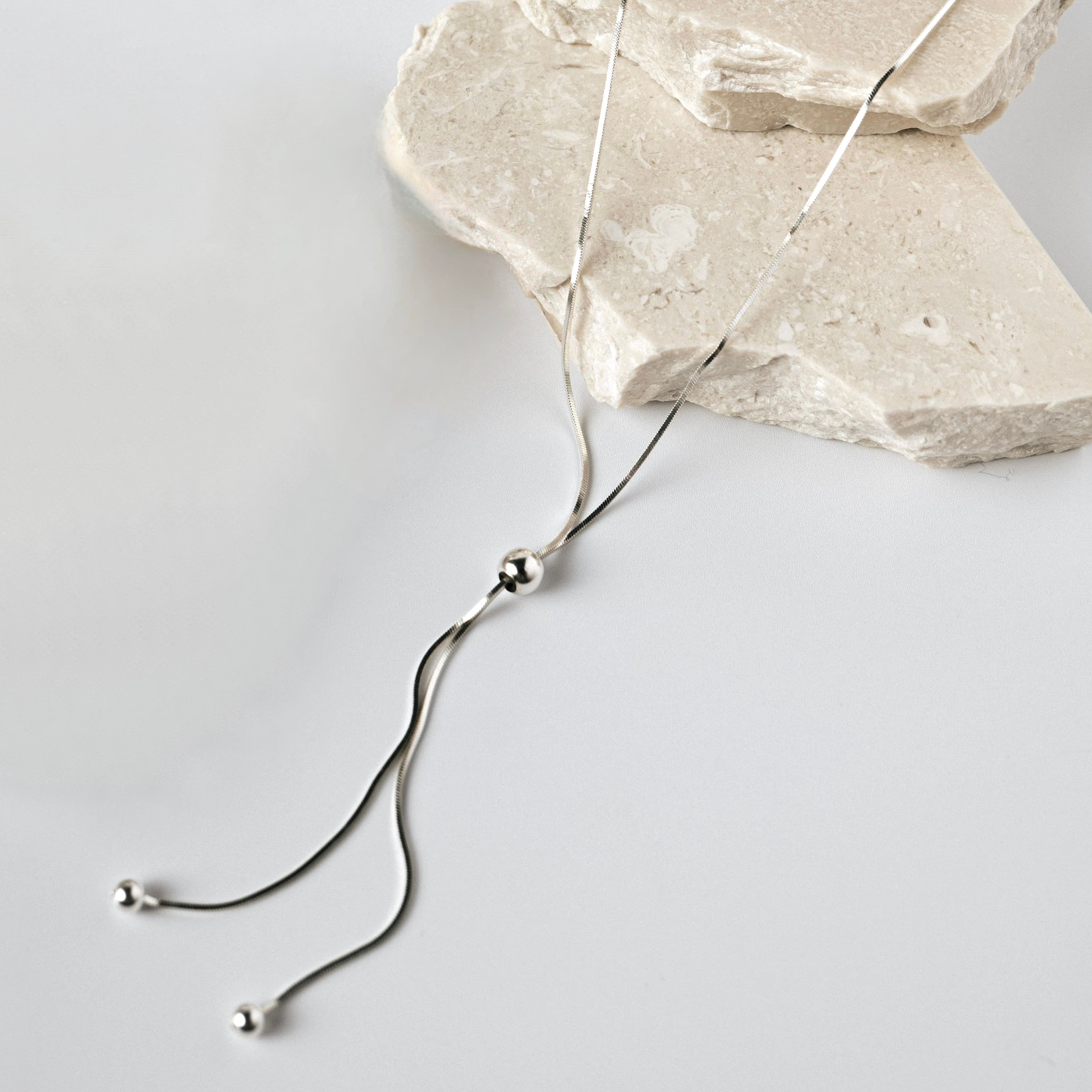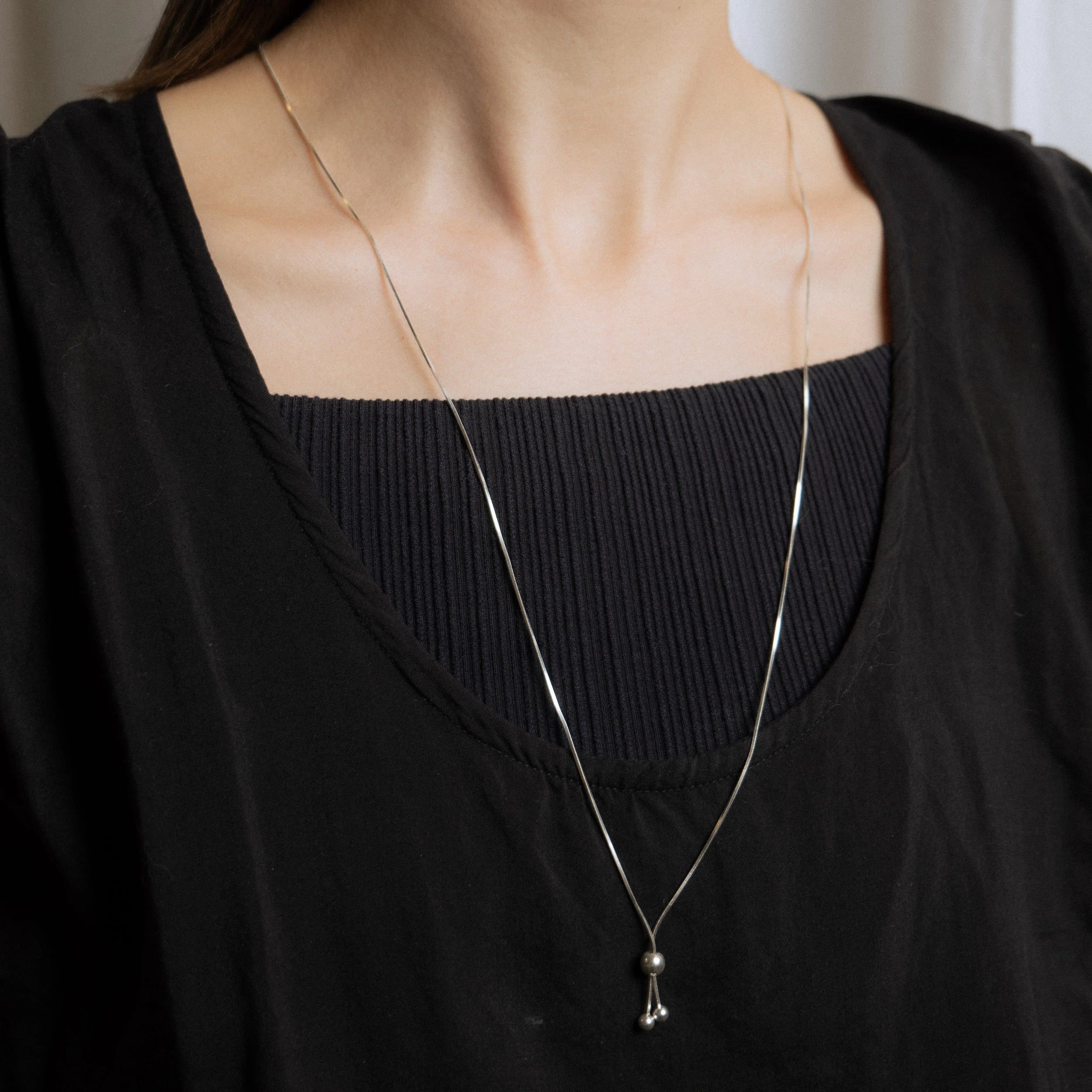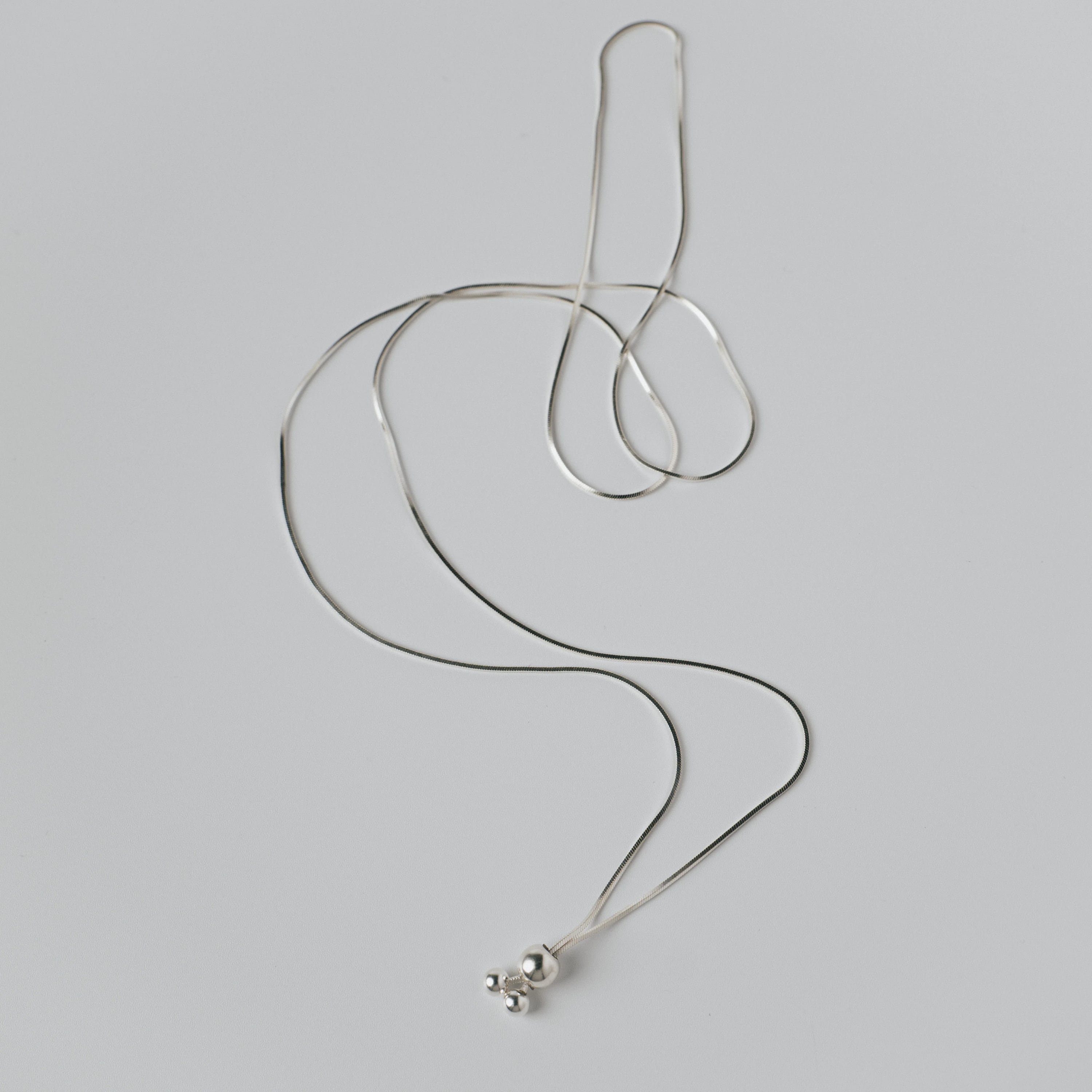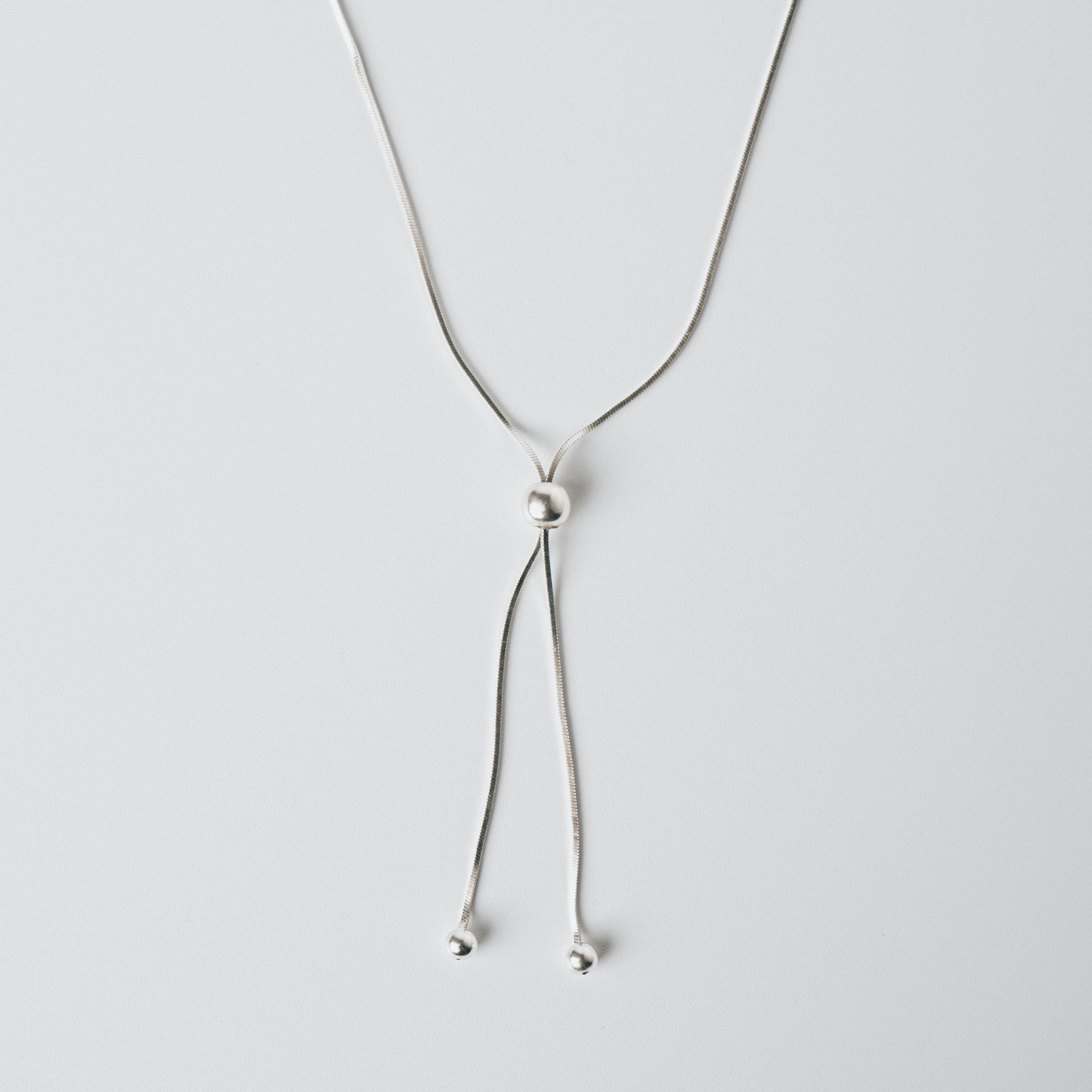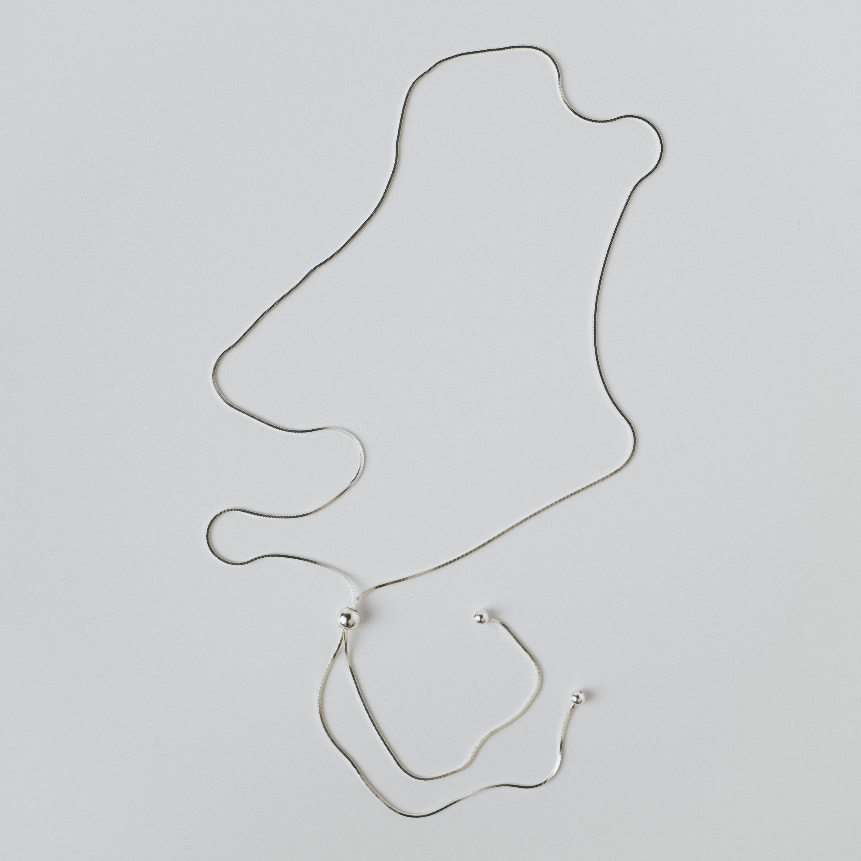 スネイクチェーンにスライド機能を搭載した、機能性と美しさを兼ね備えたロングネックレス。