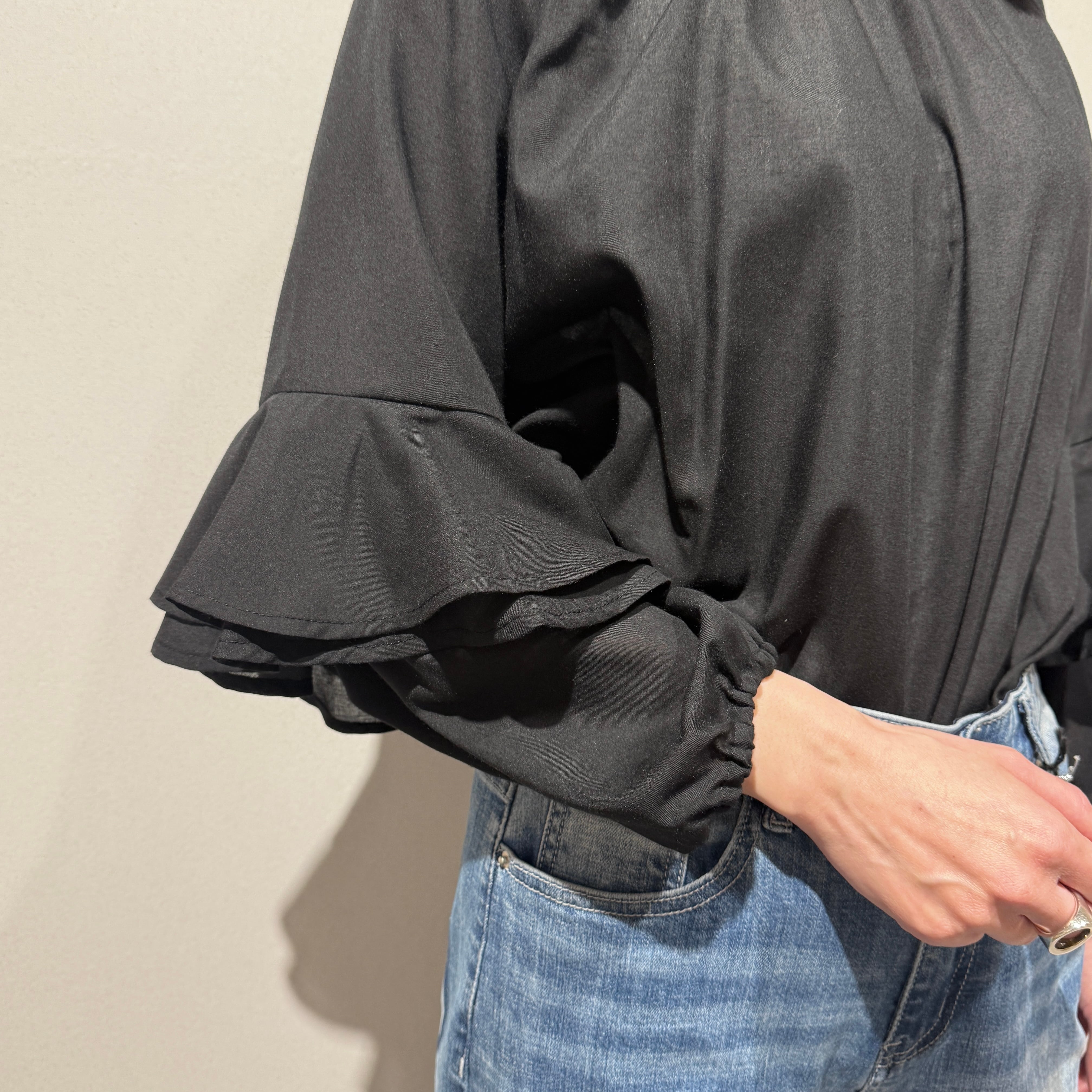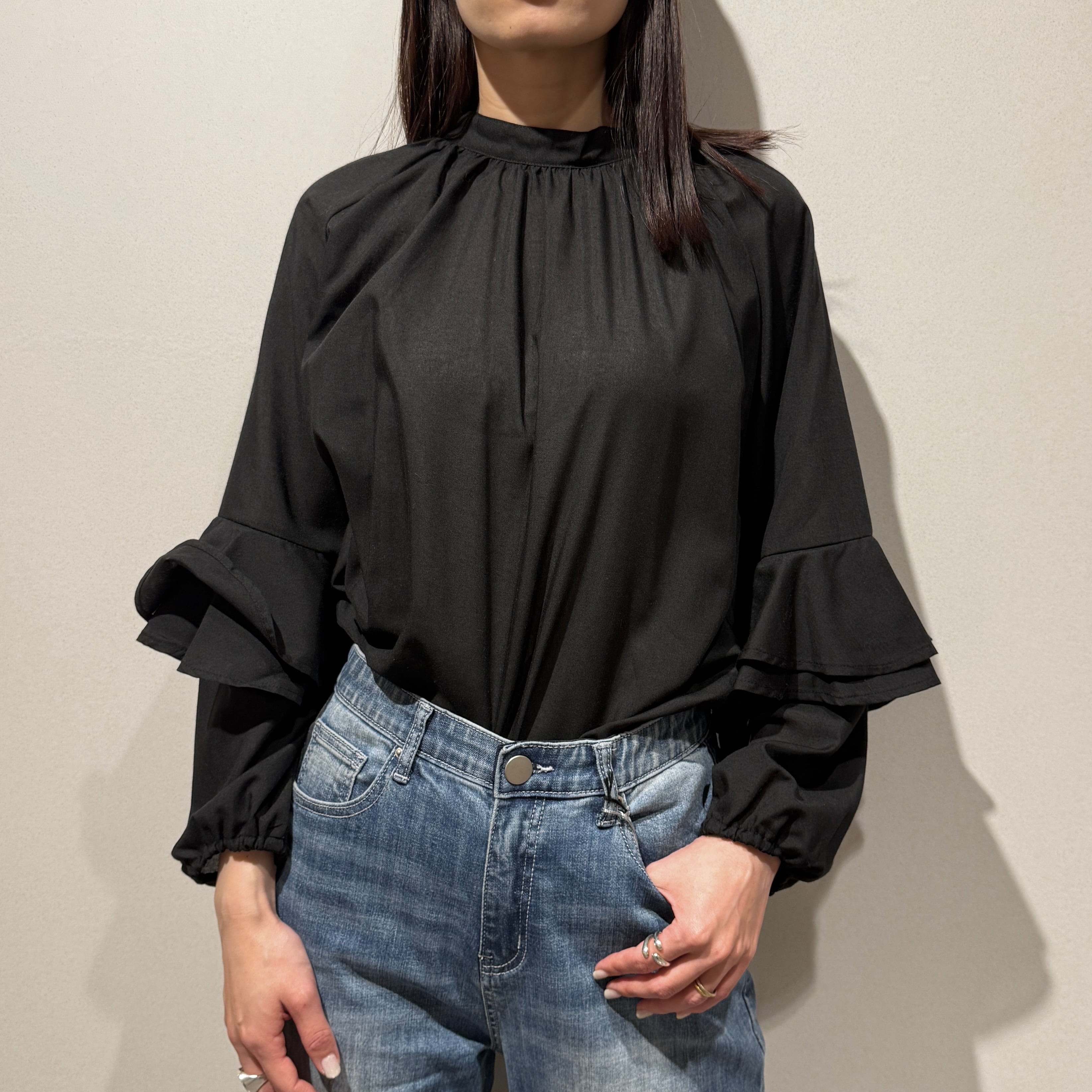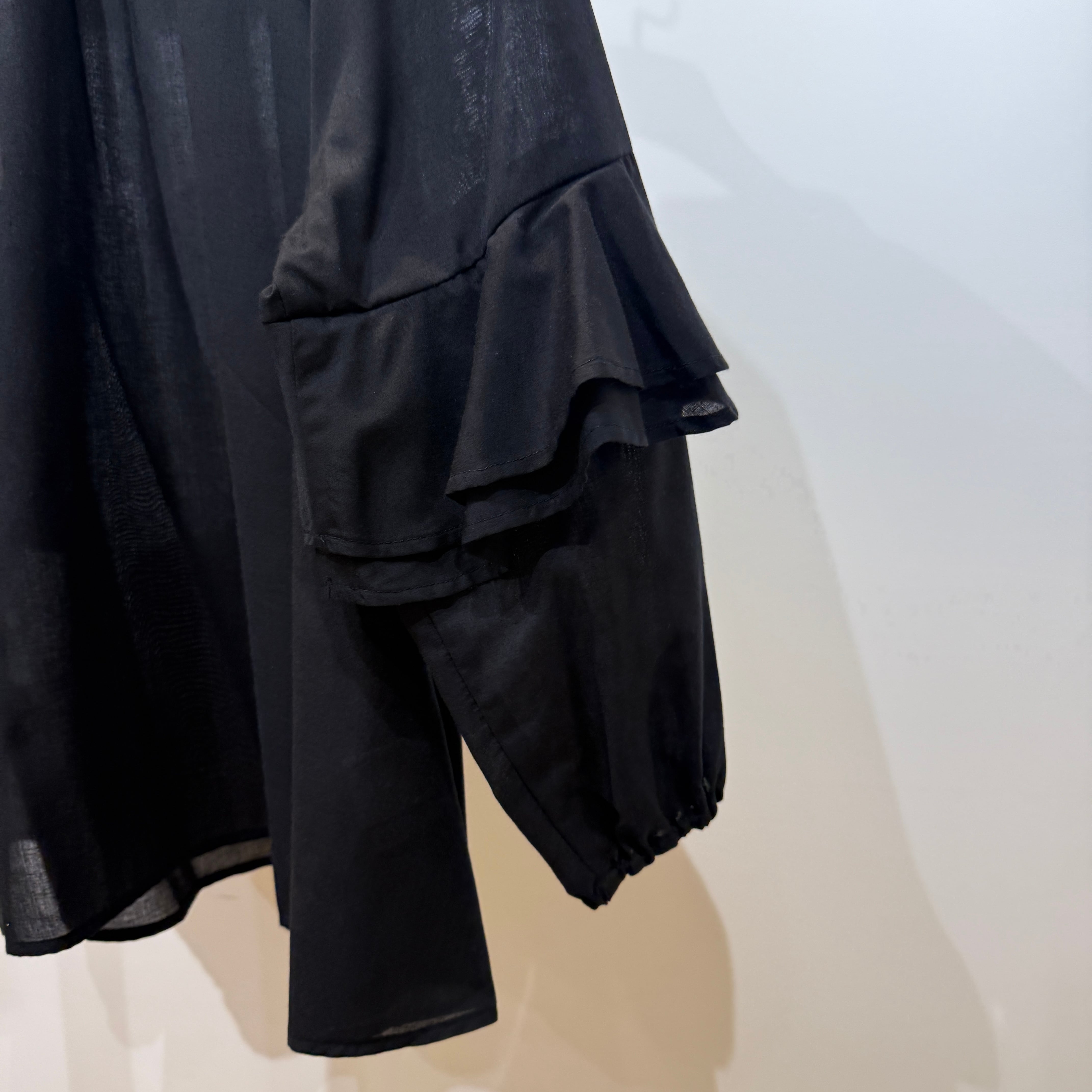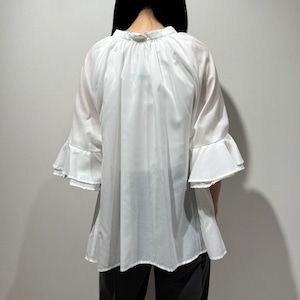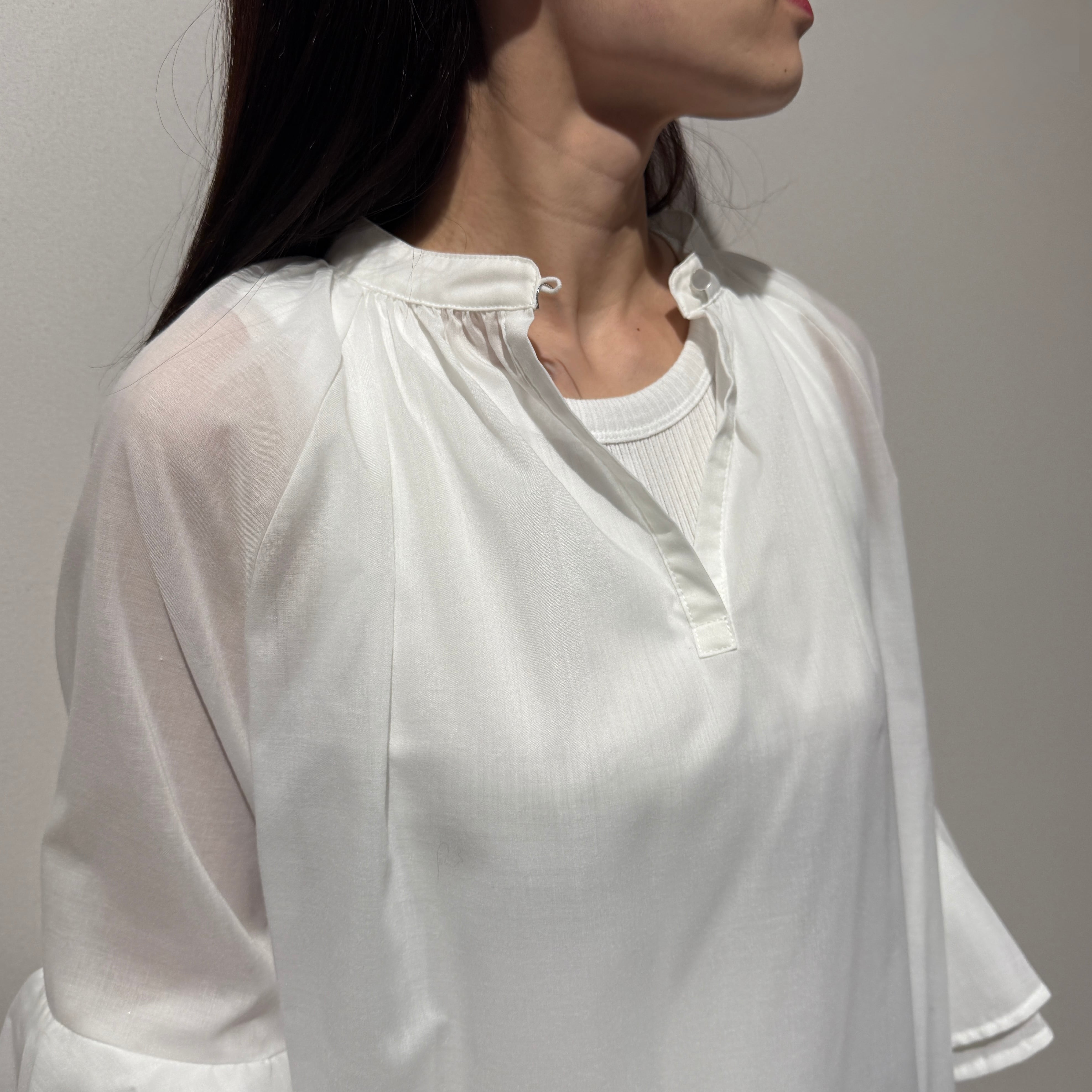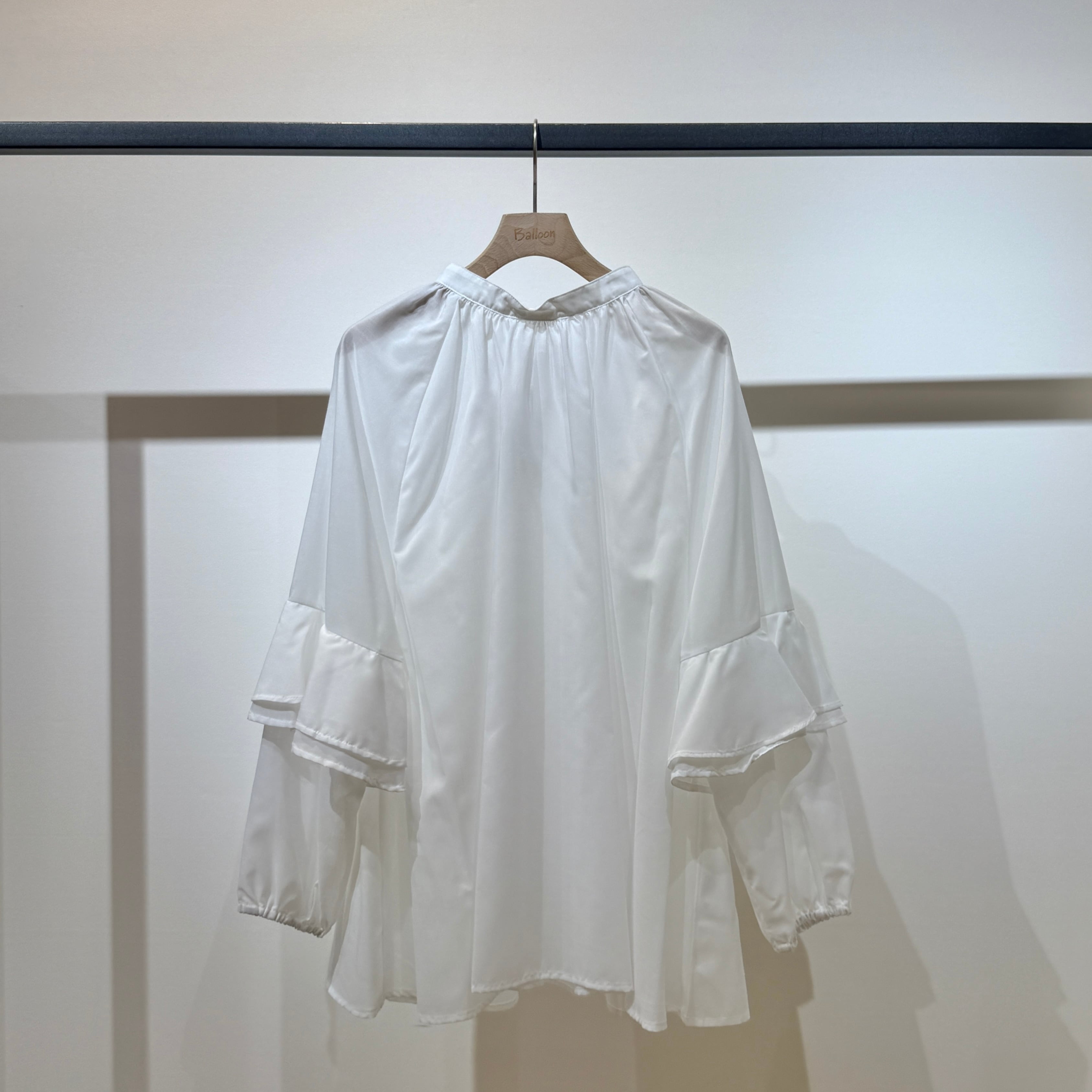 花びらのようなペタルスリーブが動くたびに揺れて、シンプルながら存在感のあるシルエットに。