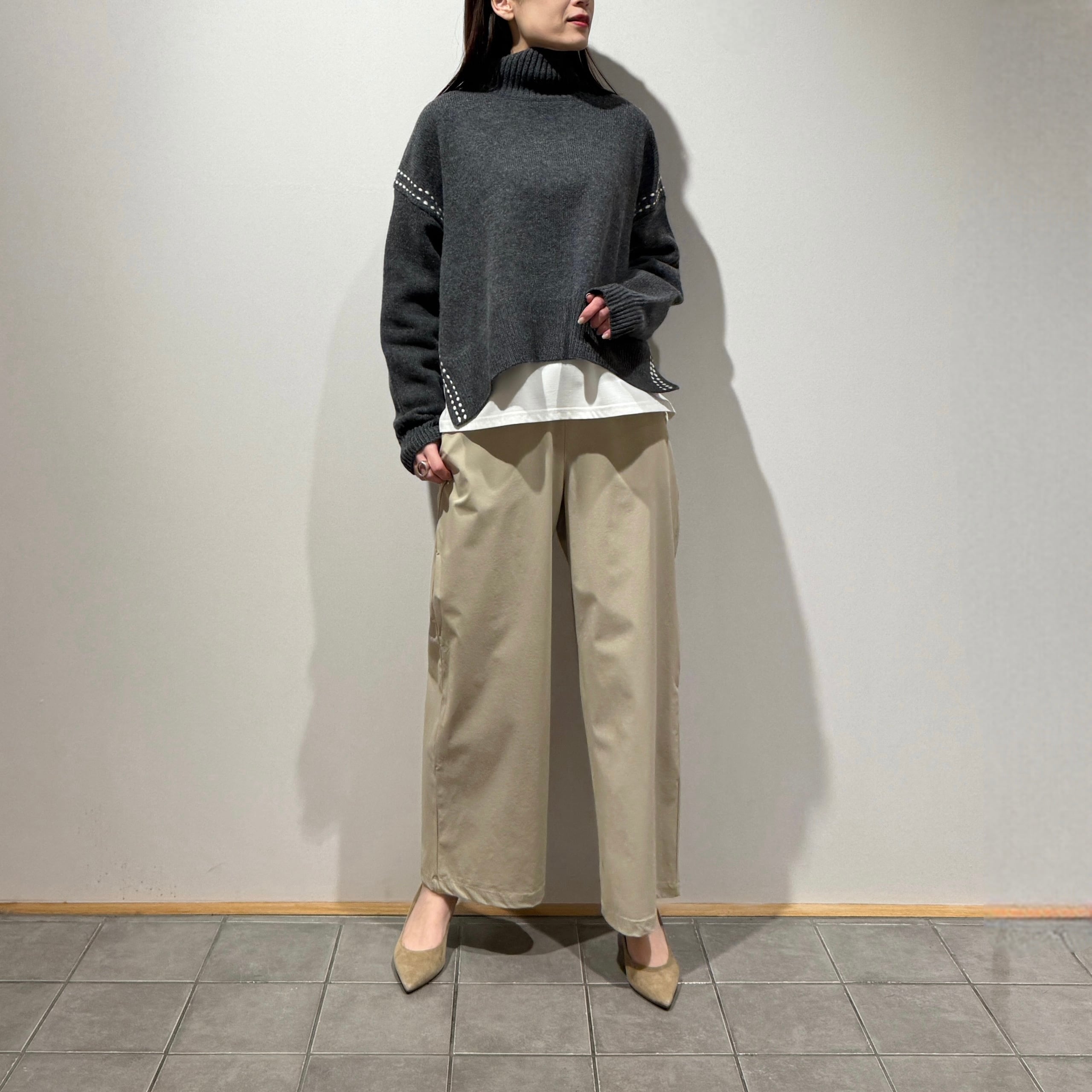 コンパクトなトップスを合わせることで、ワイドシルエットが引き立ちスタイルアップ効果も◎