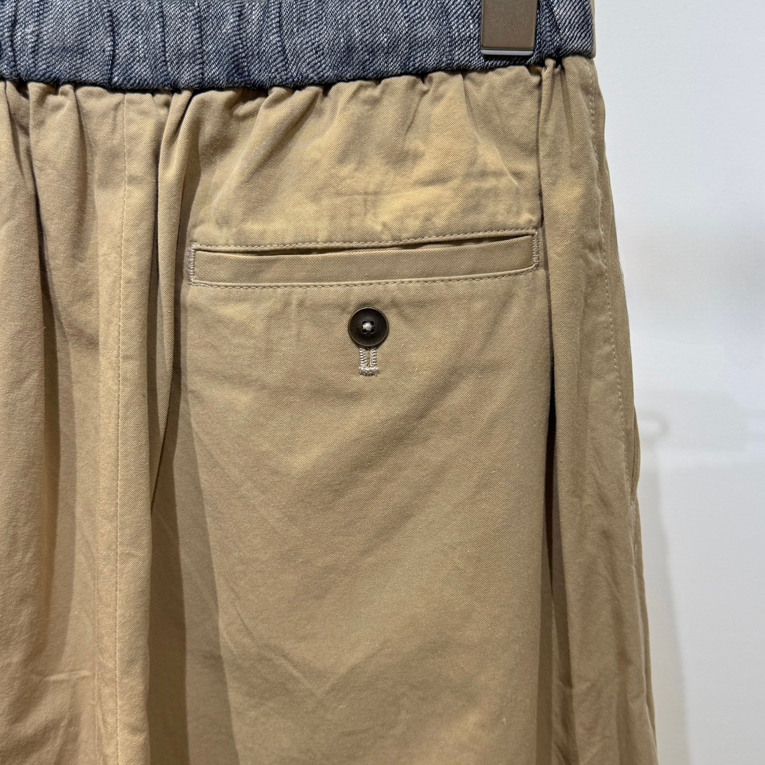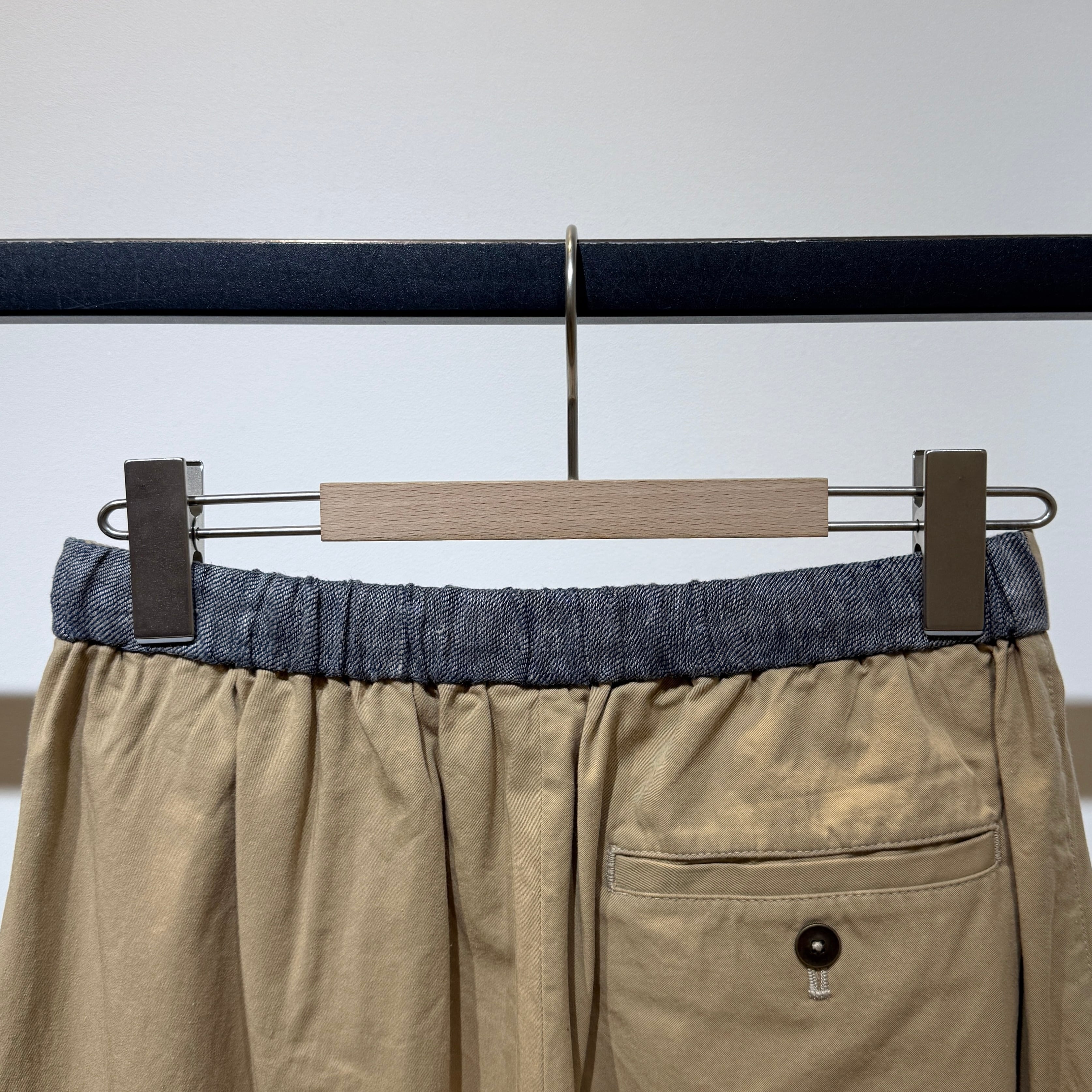 総ゴム仕様のウエストにバックルでサイズ調整ができ、後ろベルトの配色がさりげないアクセントに。
