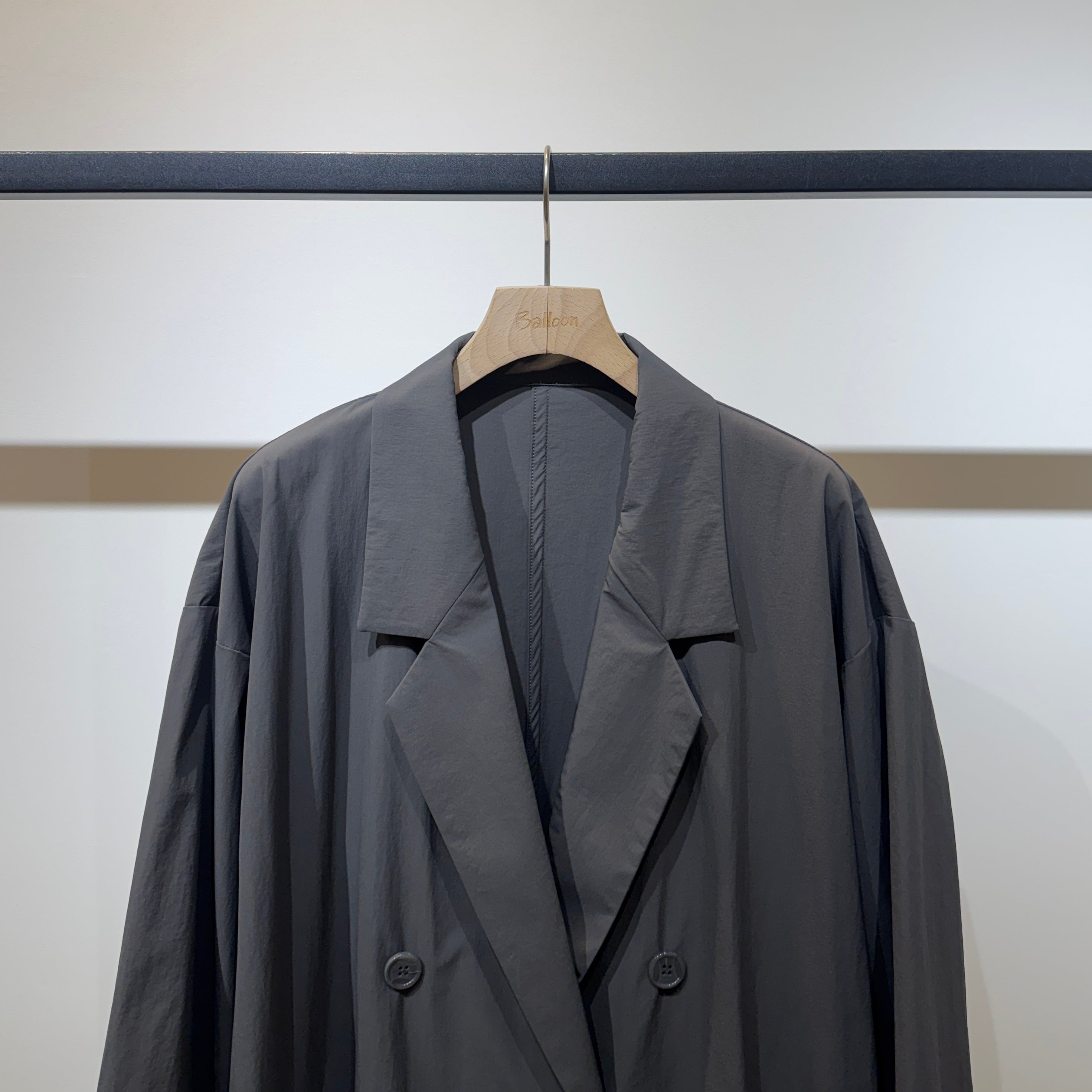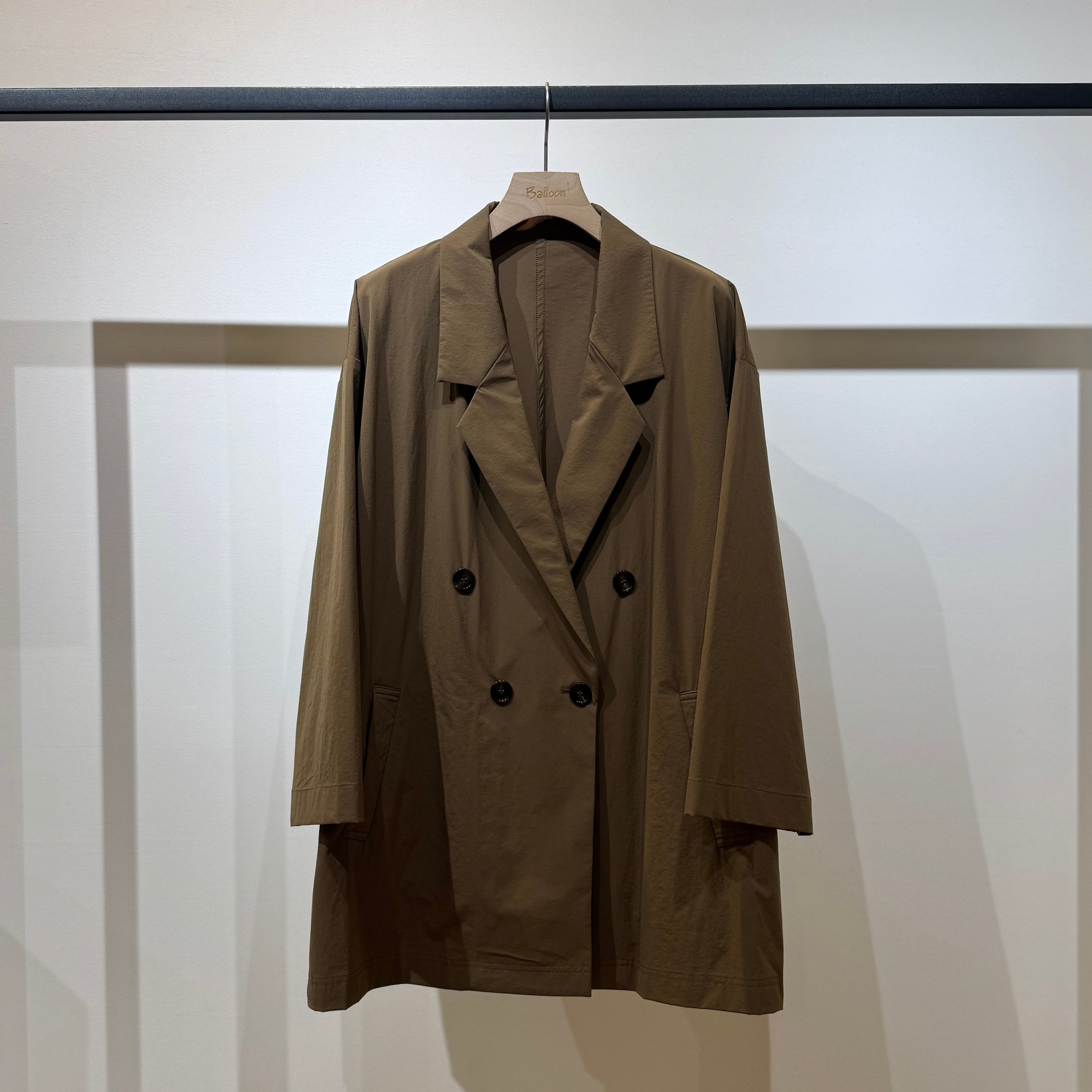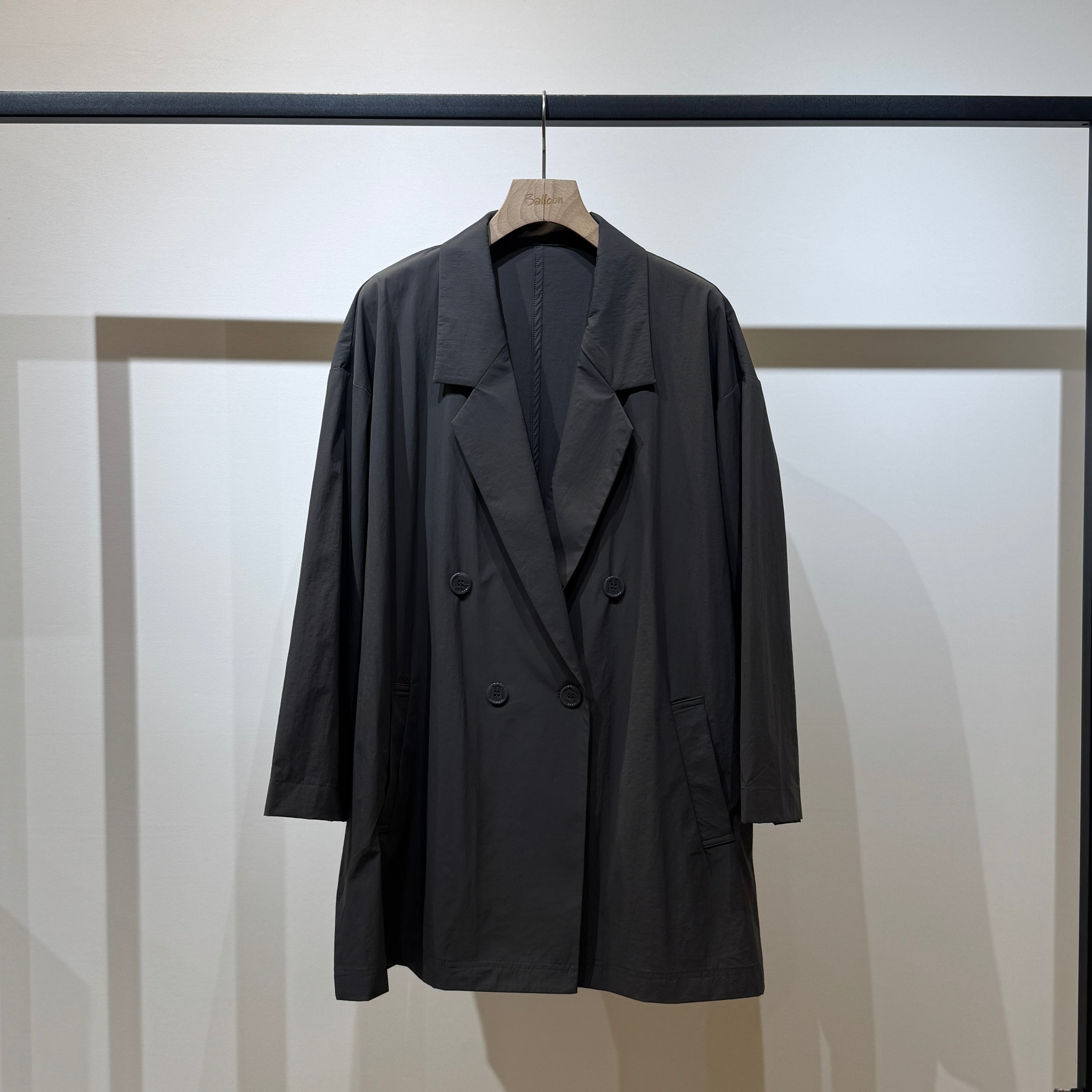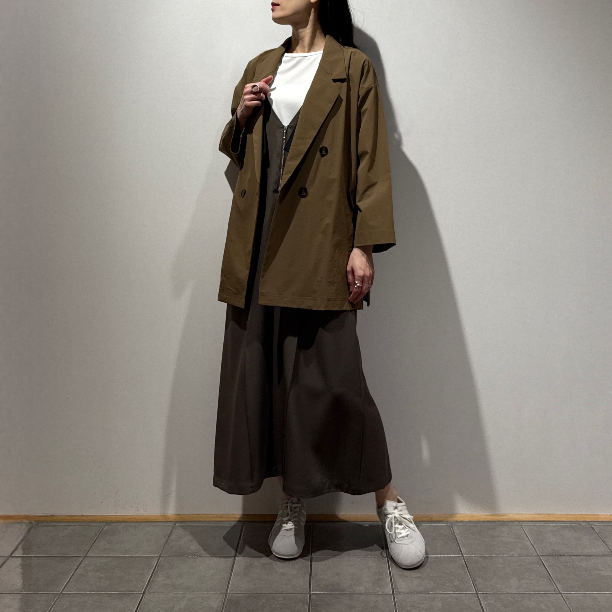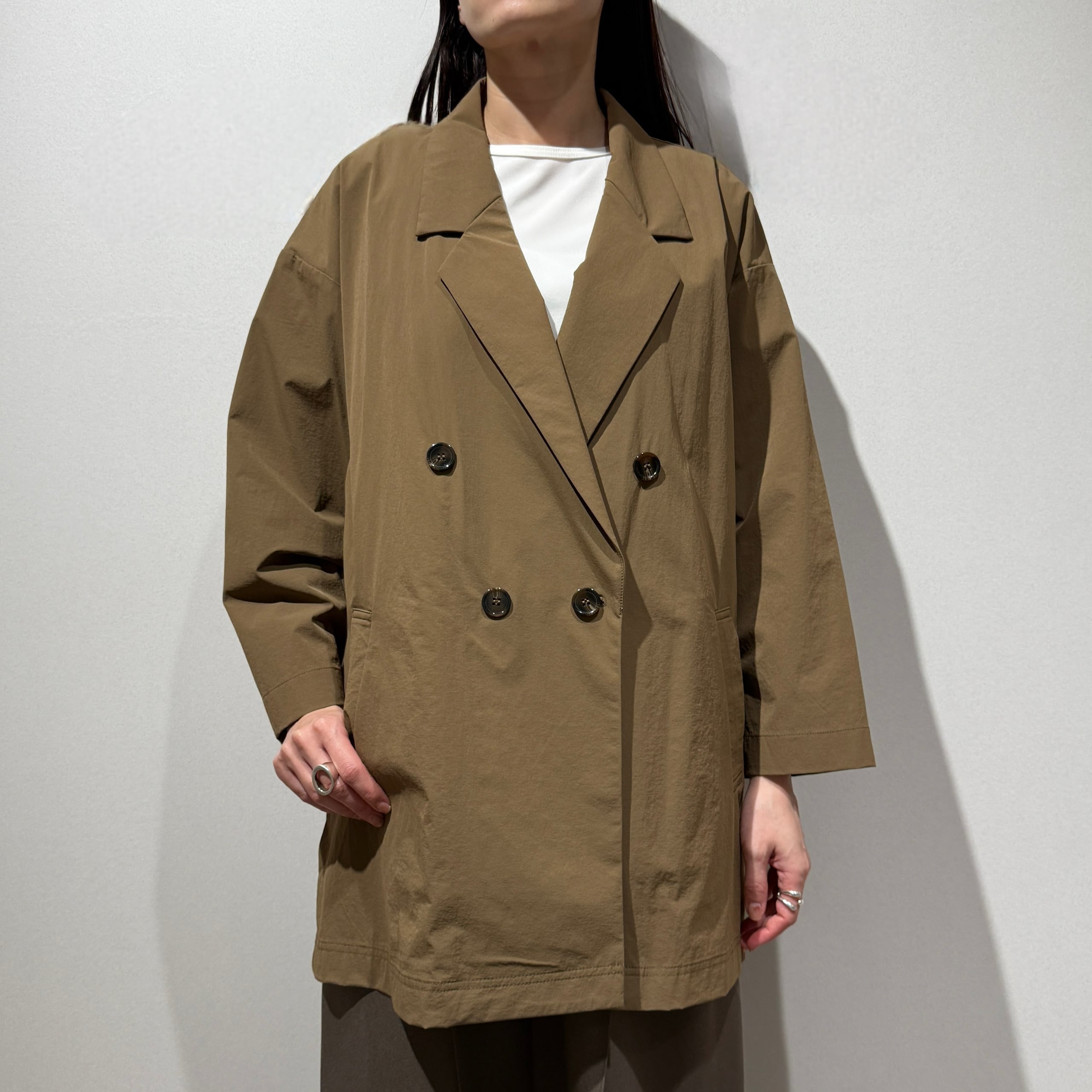 ダブルブレストのワイドシルエットでヒップが隠れる丈感、やや短めの袖と深めのサイドスリットが好バランスで、幅広いスタイリングに合わせやすい一枚です。