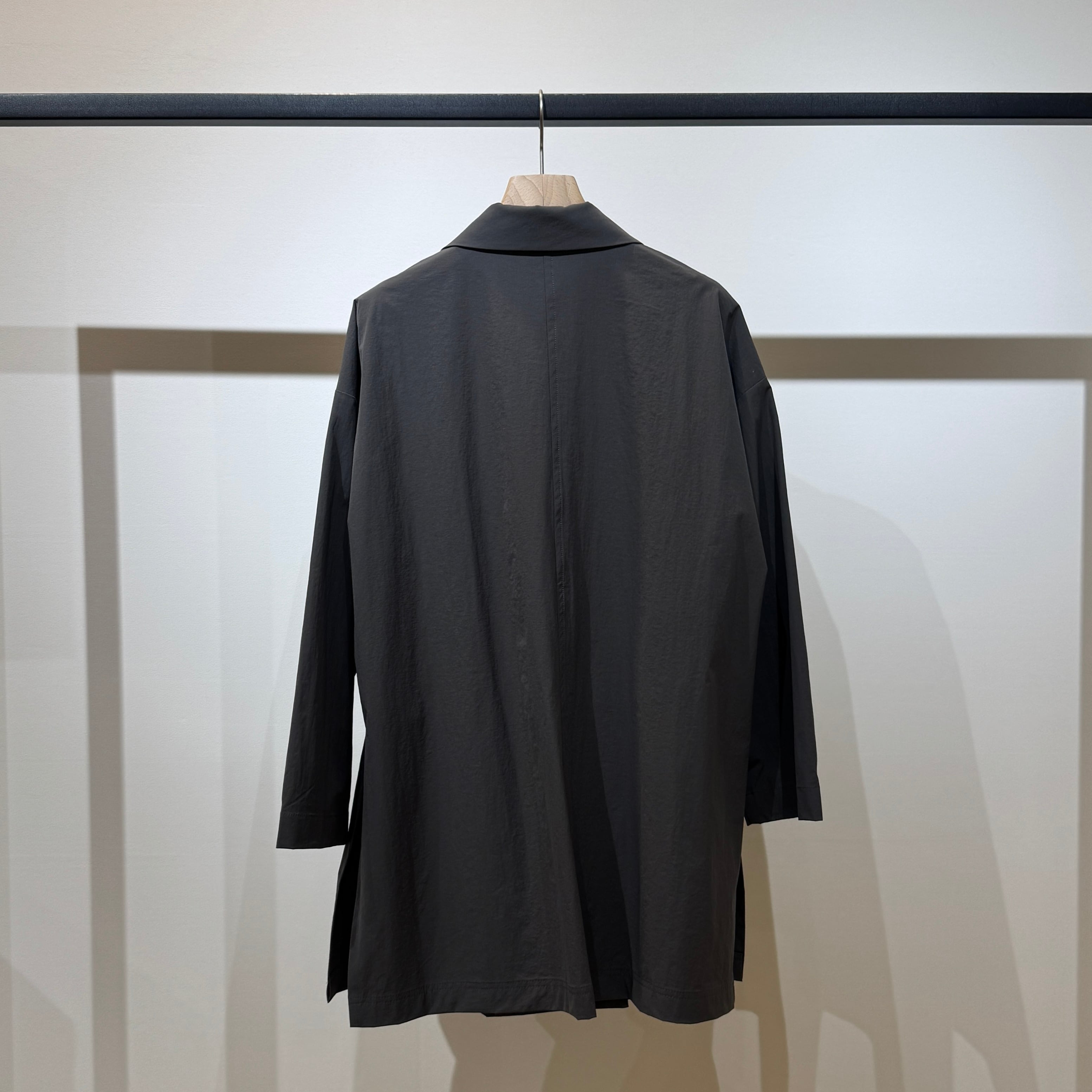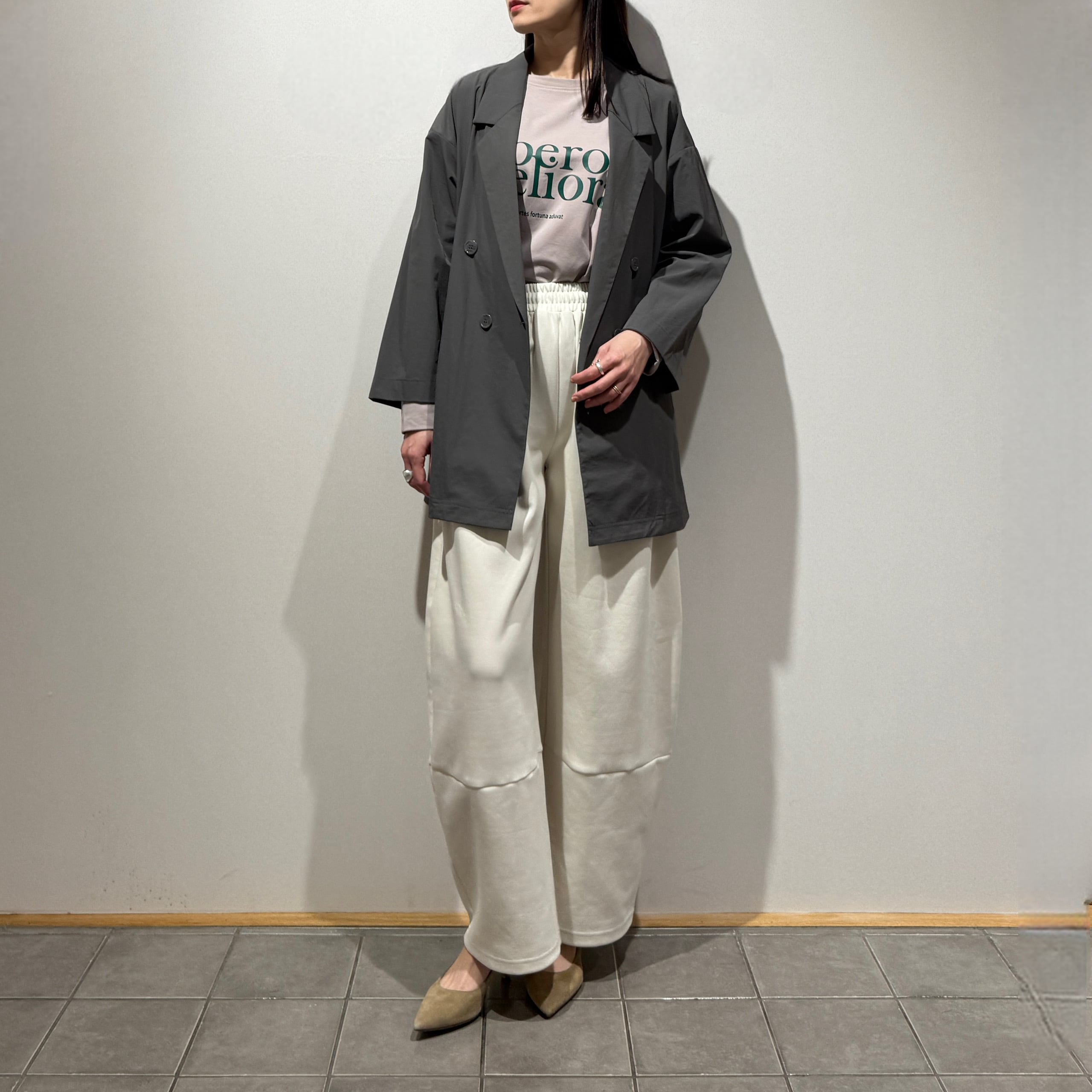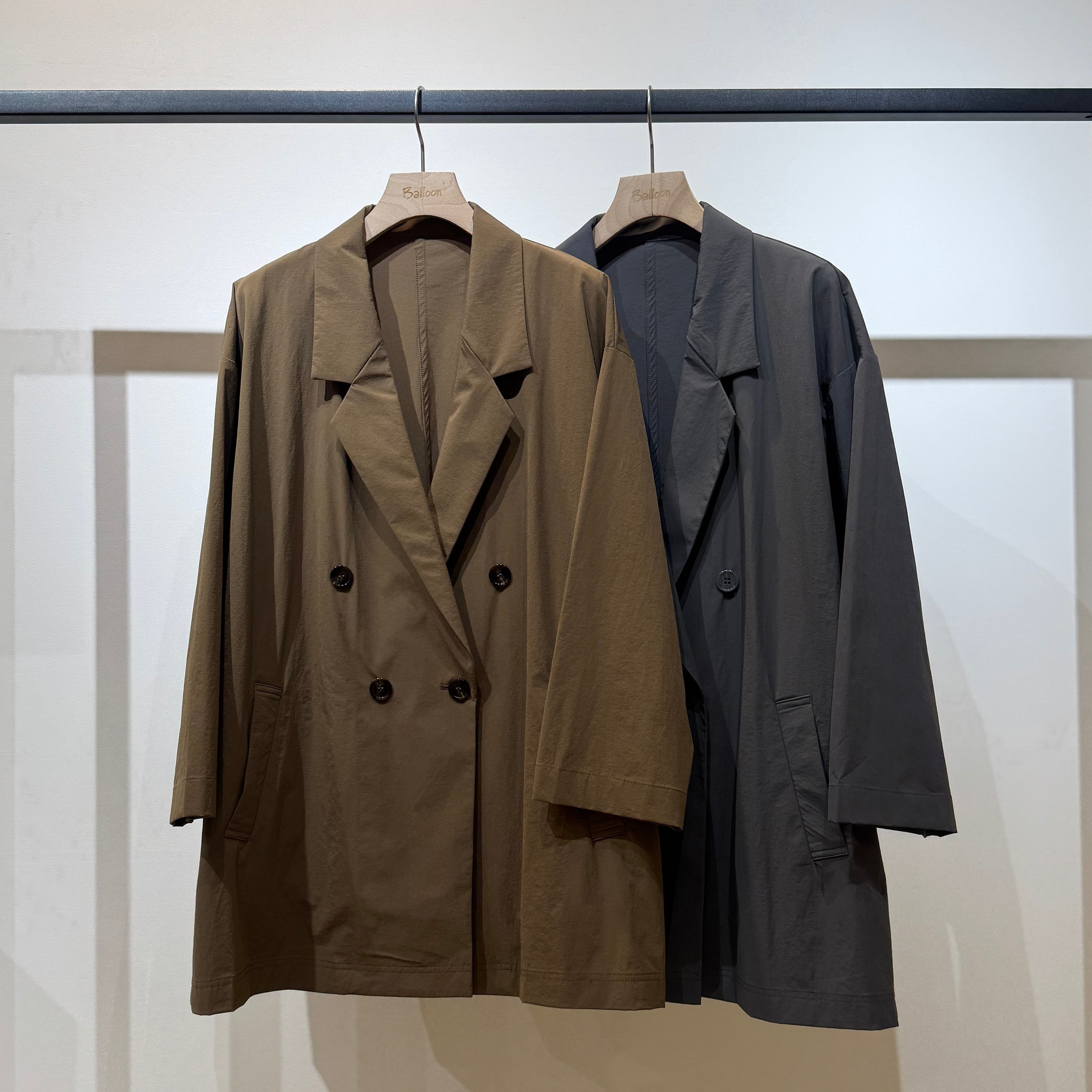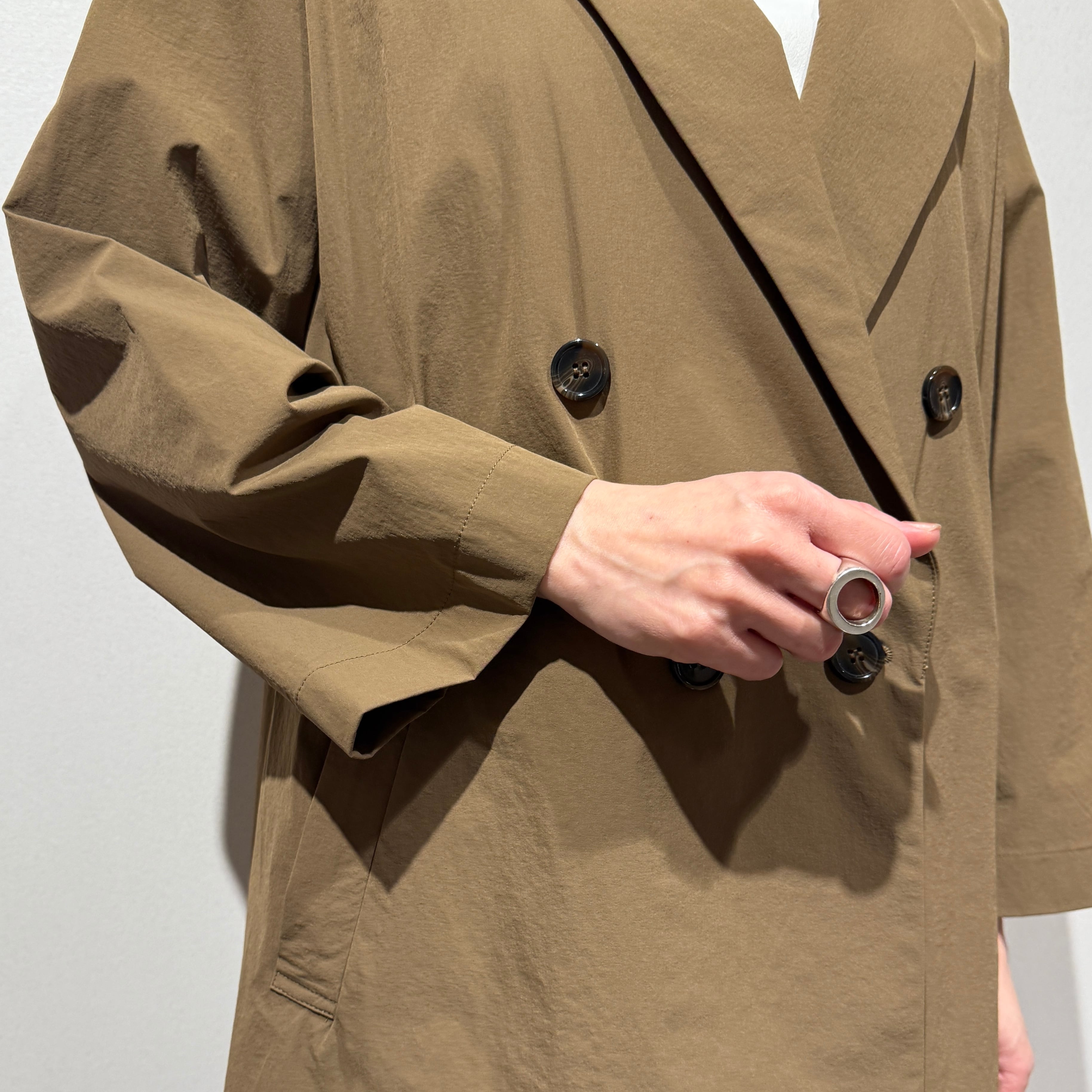 ダブルブレストのワイドシルエットでヒップが隠れる丈感、やや短めの袖と深めのサイドスリットが好バランスで、幅広いスタイリングに合わせやすい一枚です。