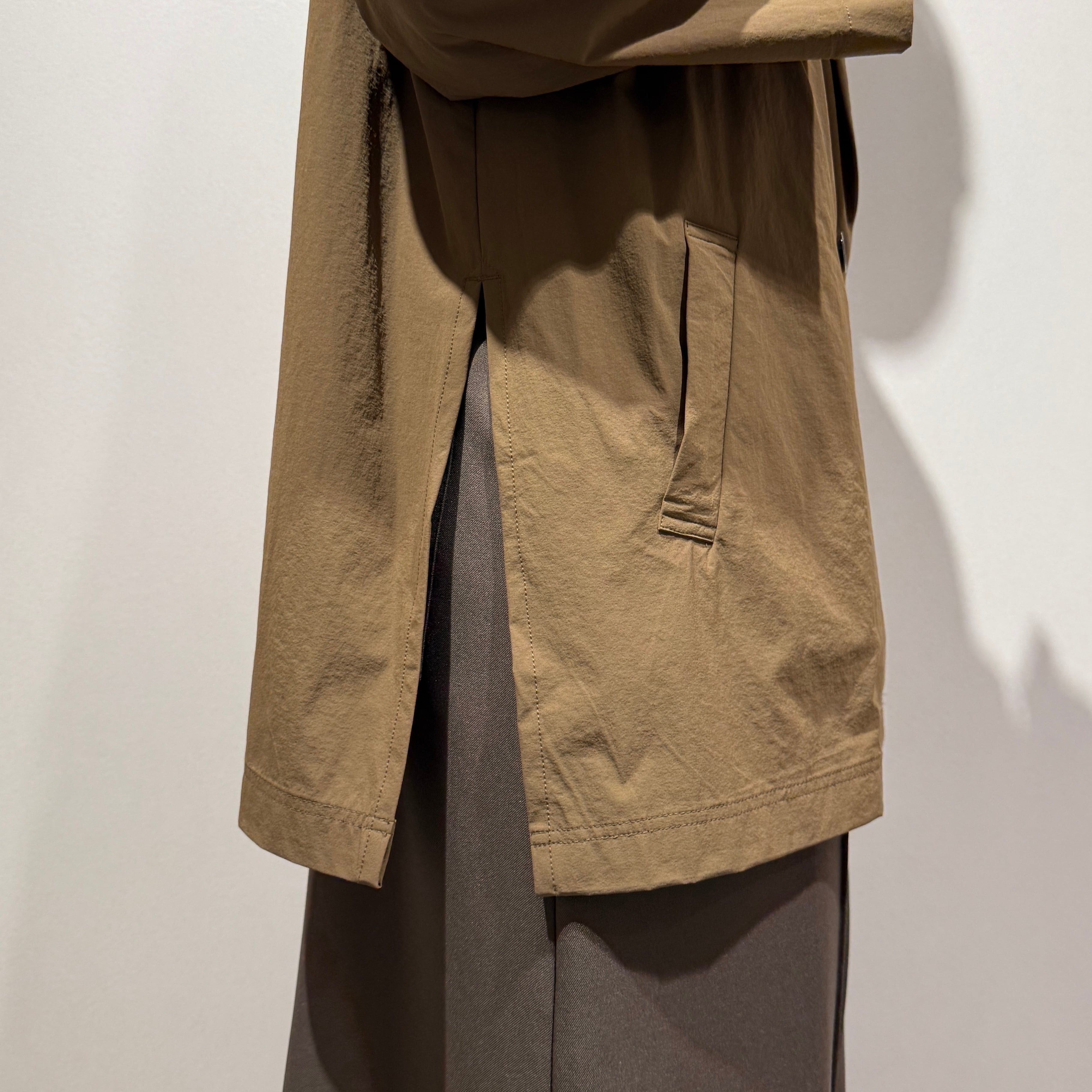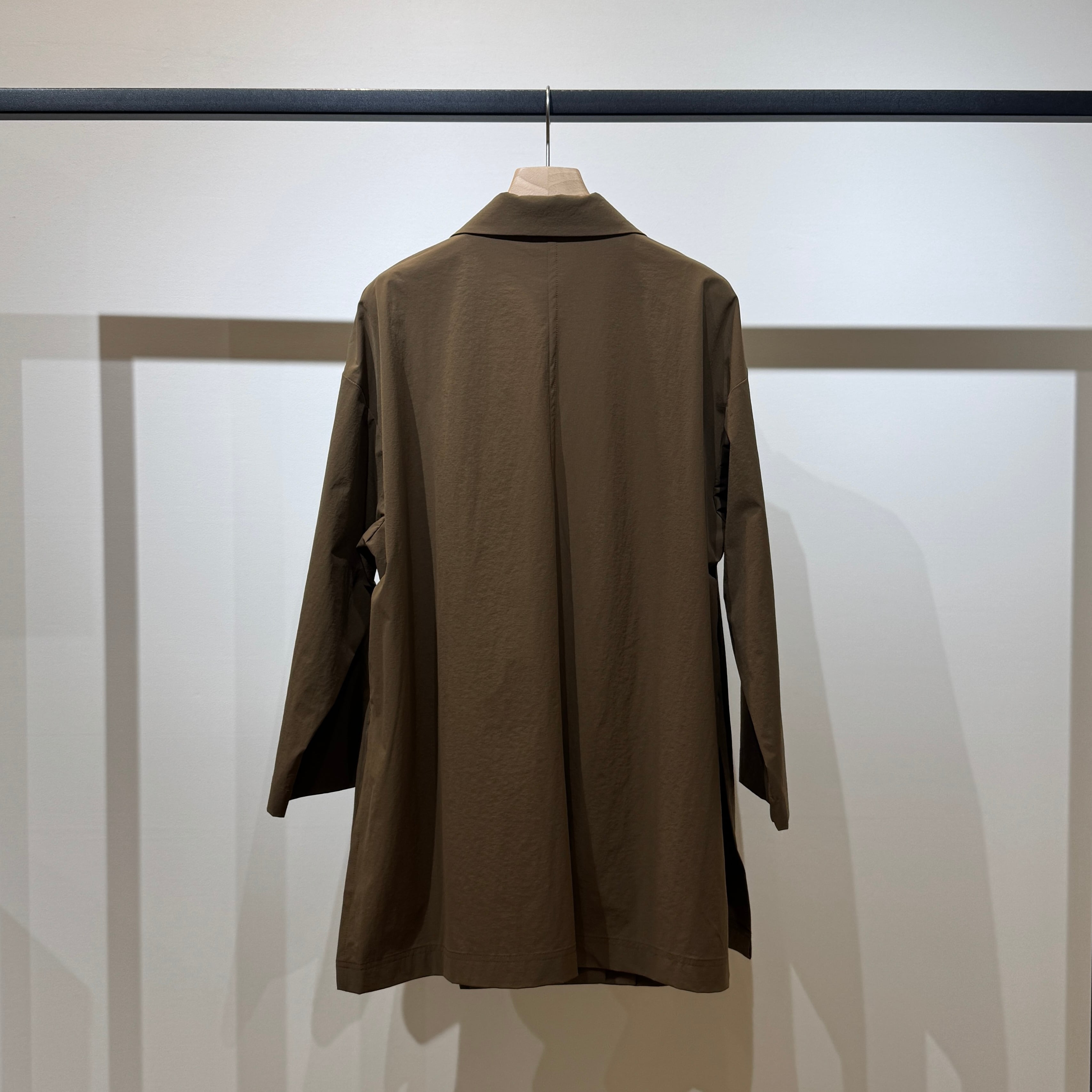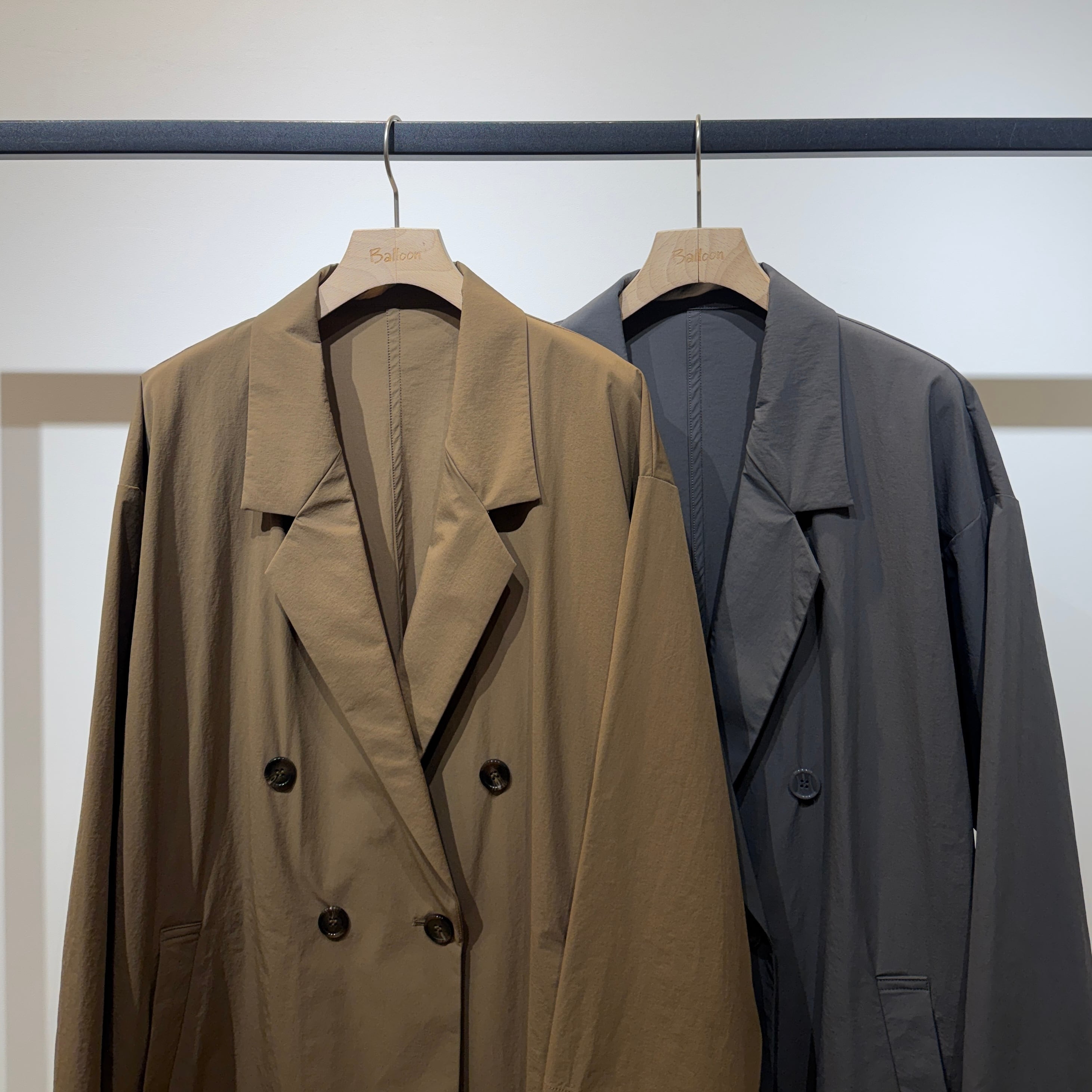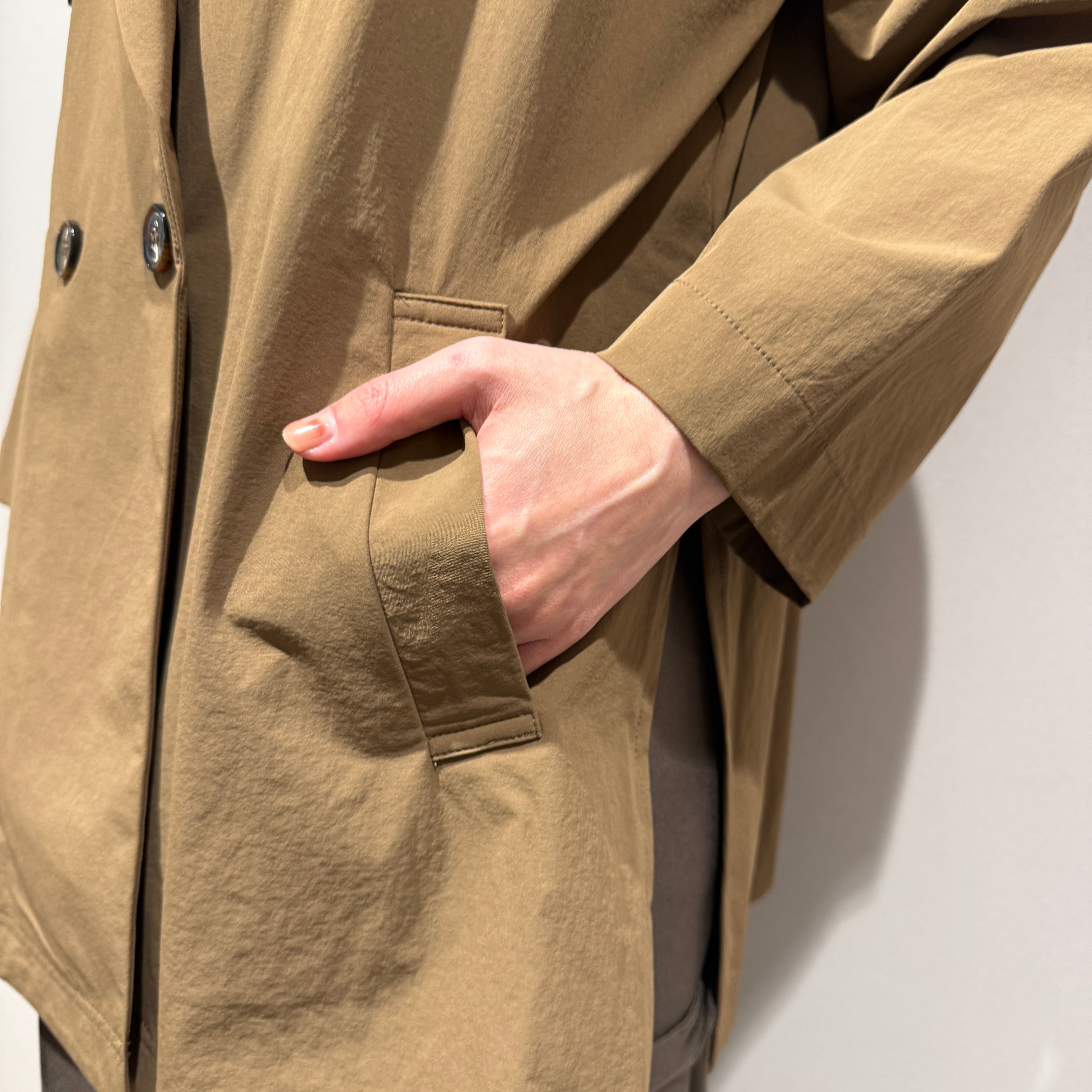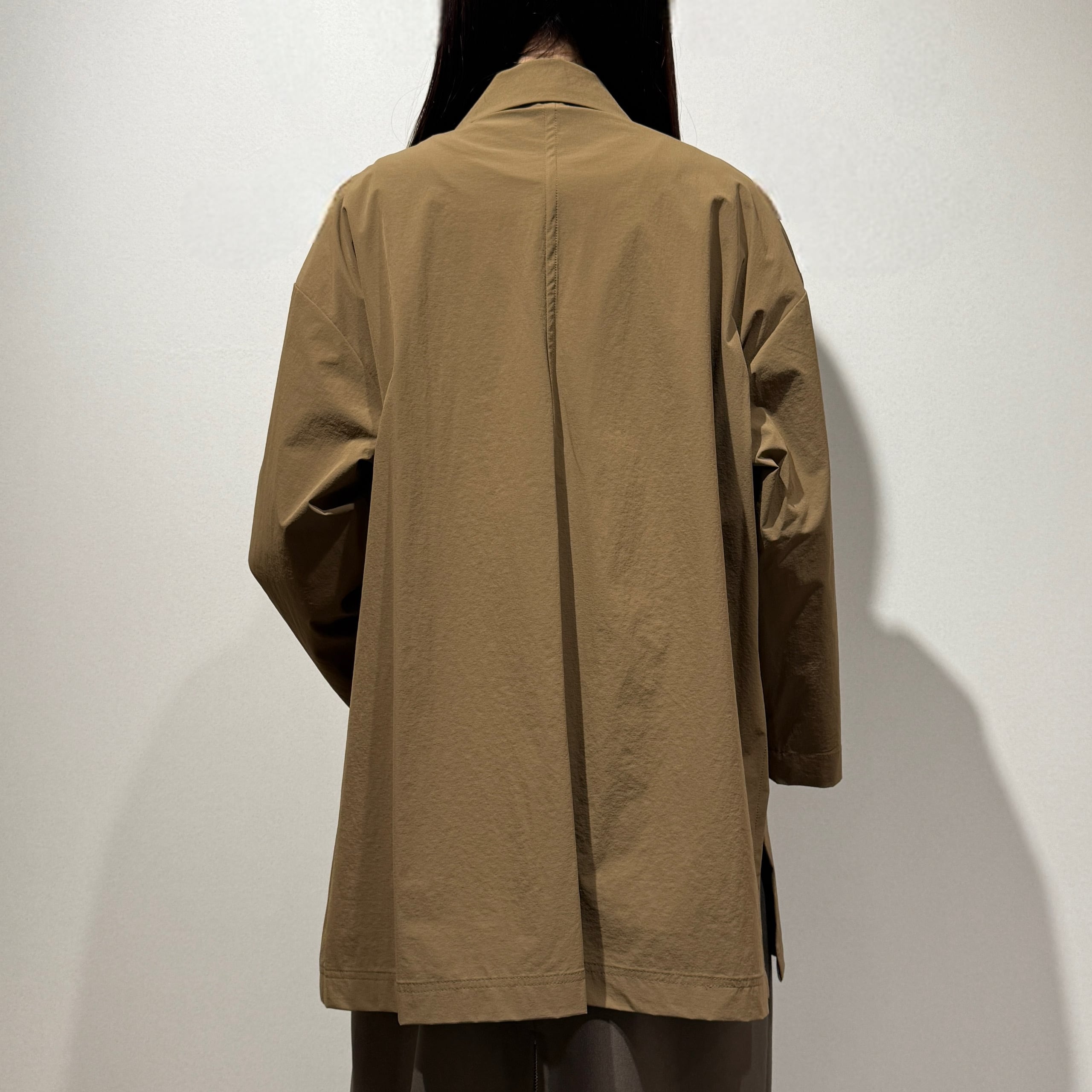 ダブルブレストのワイドシルエットでヒップが隠れる丈感、やや短めの袖と深めのサイドスリットが好バランスで、幅広いスタイリングに合わせやすい一枚です。