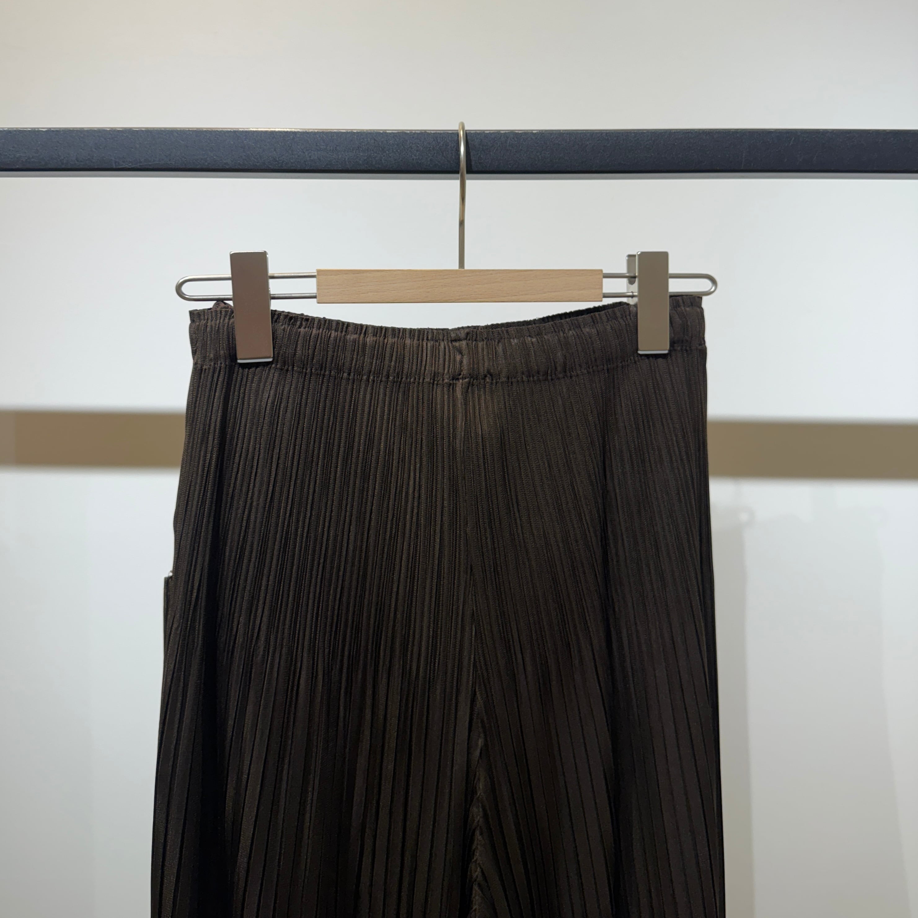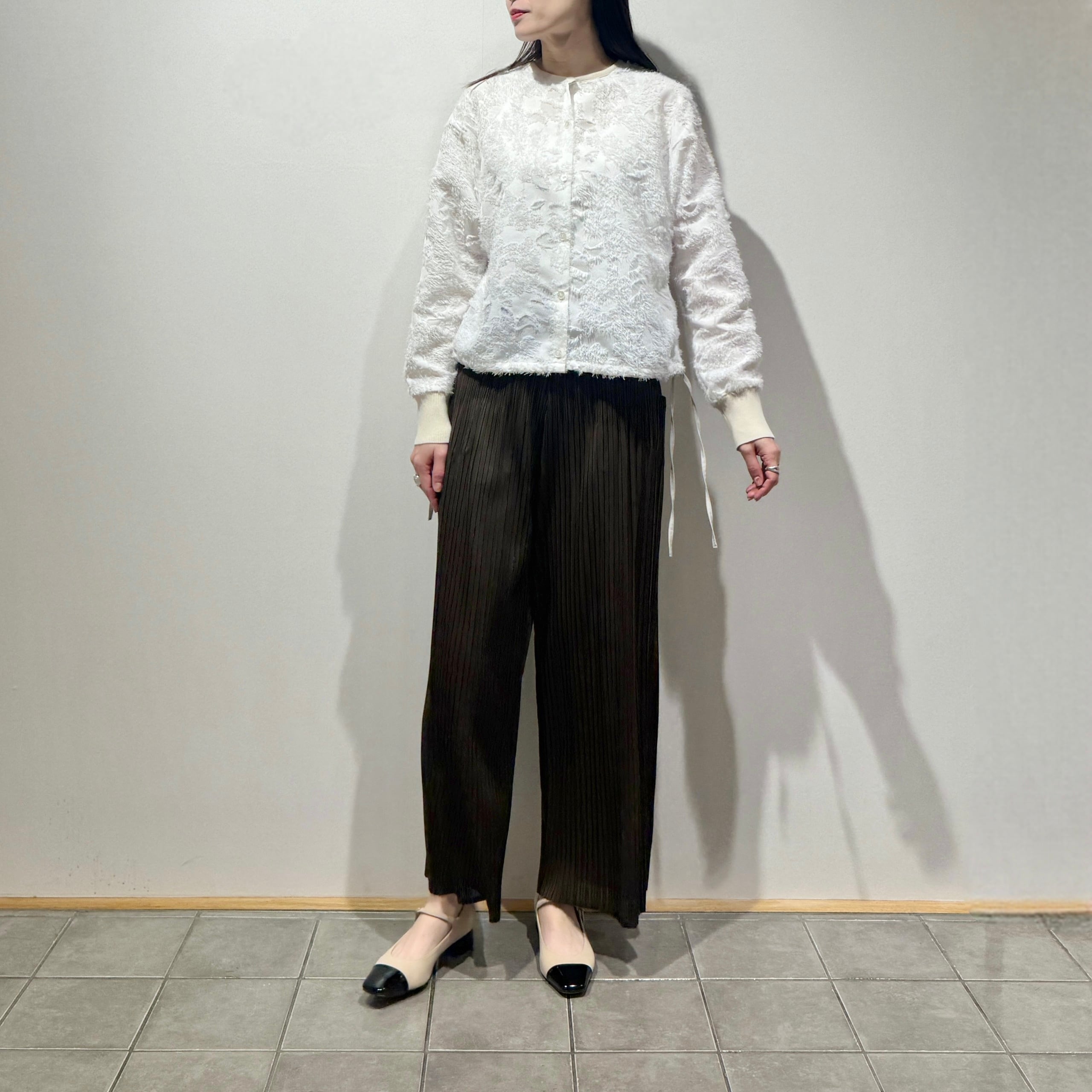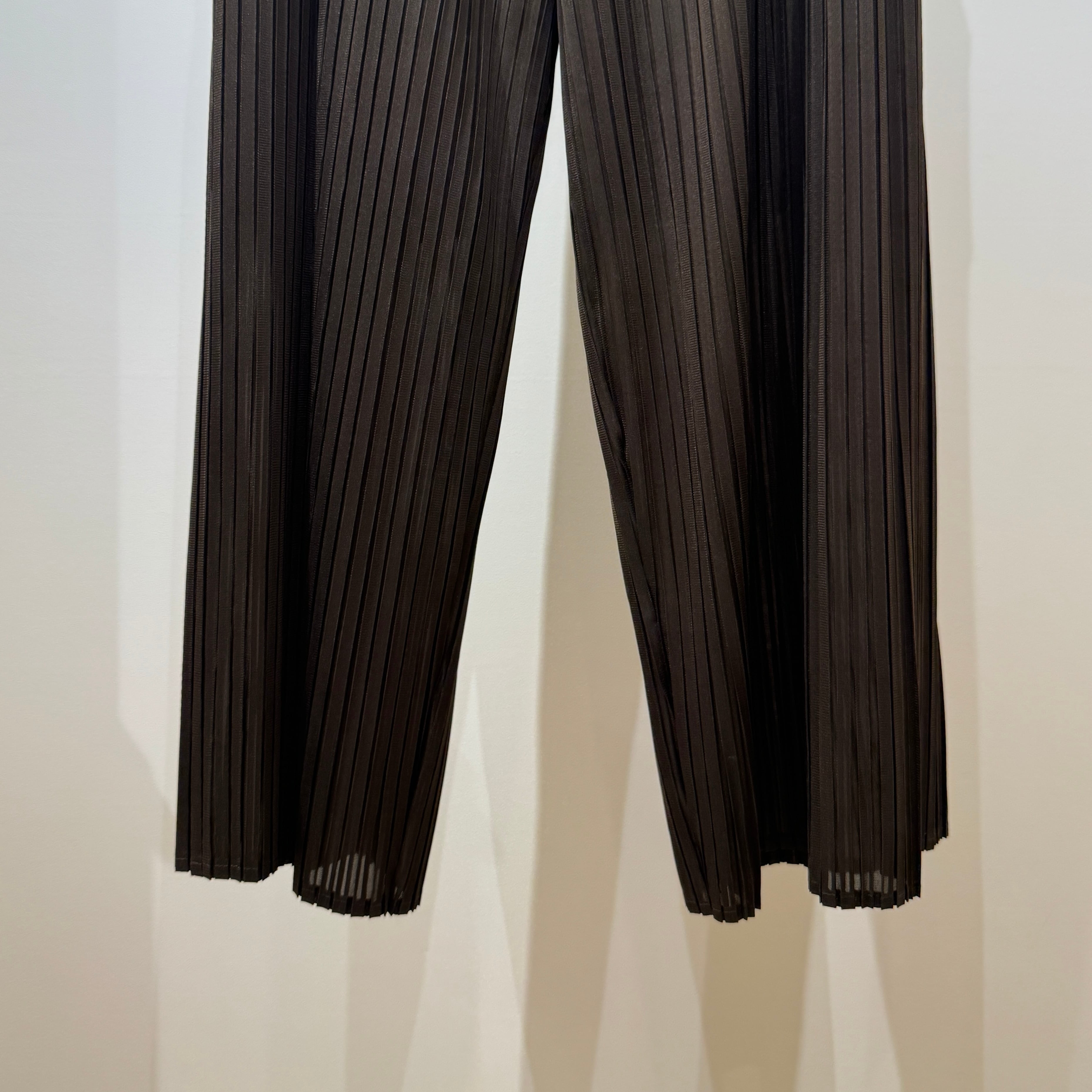 細いプリーツのストレッチが効いたワイドパンツ。