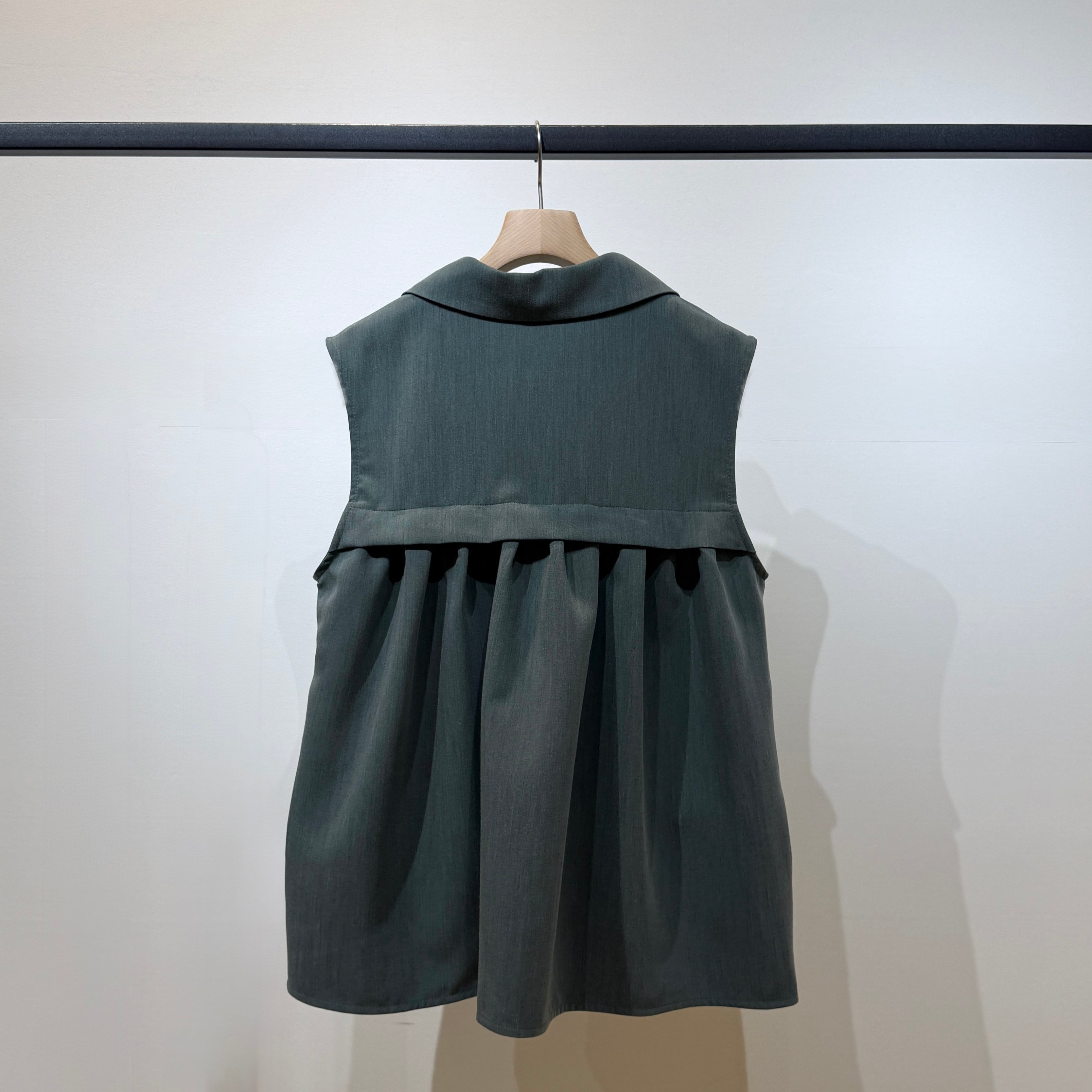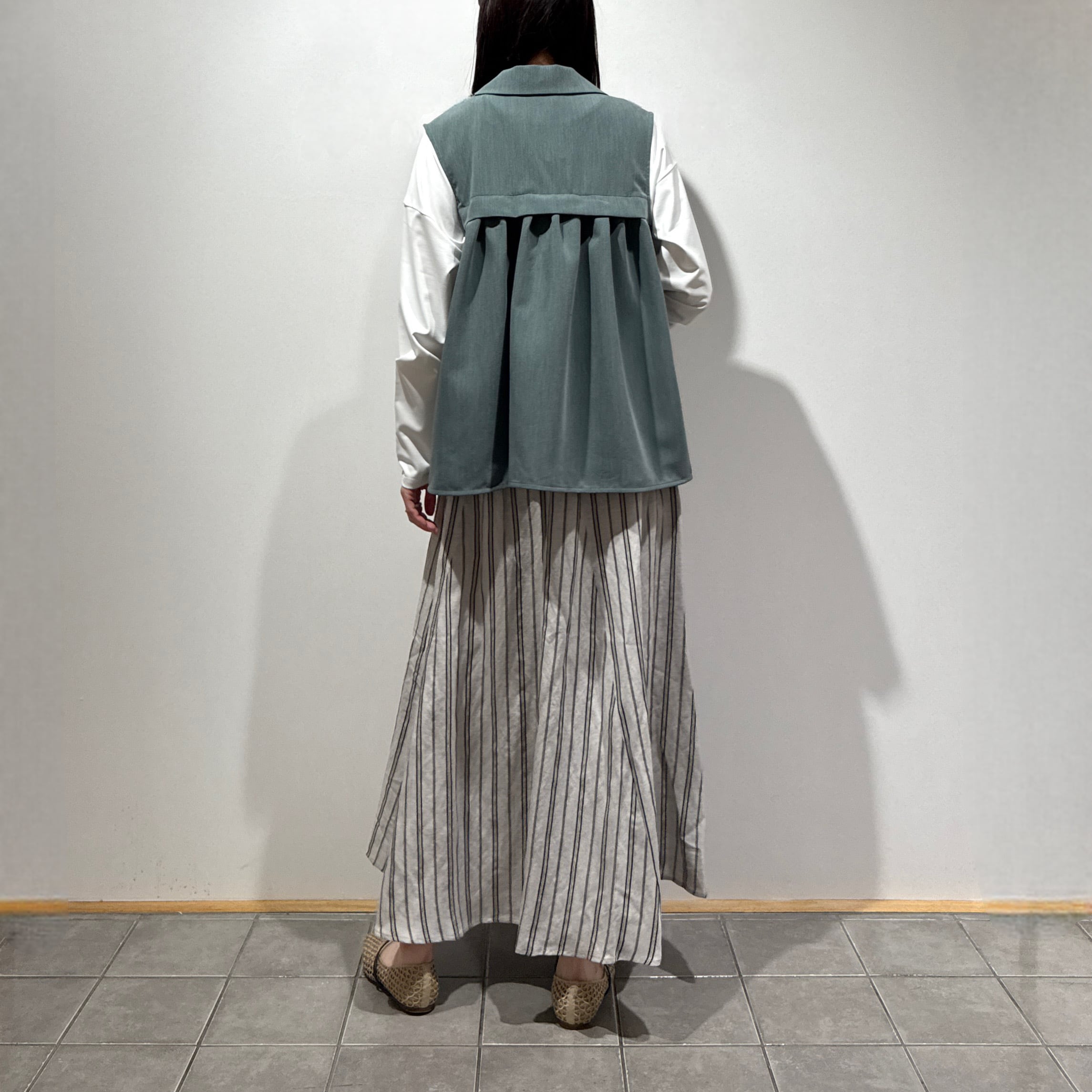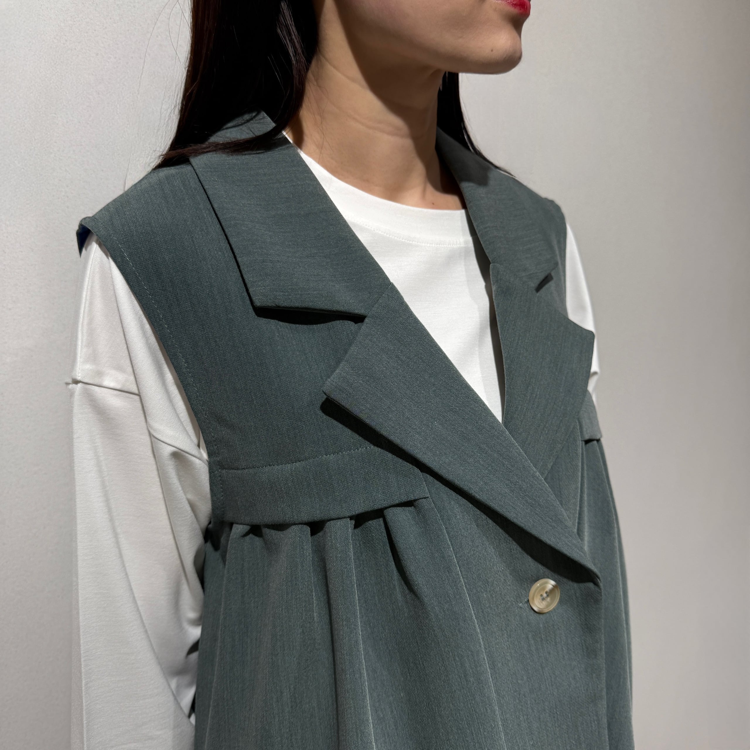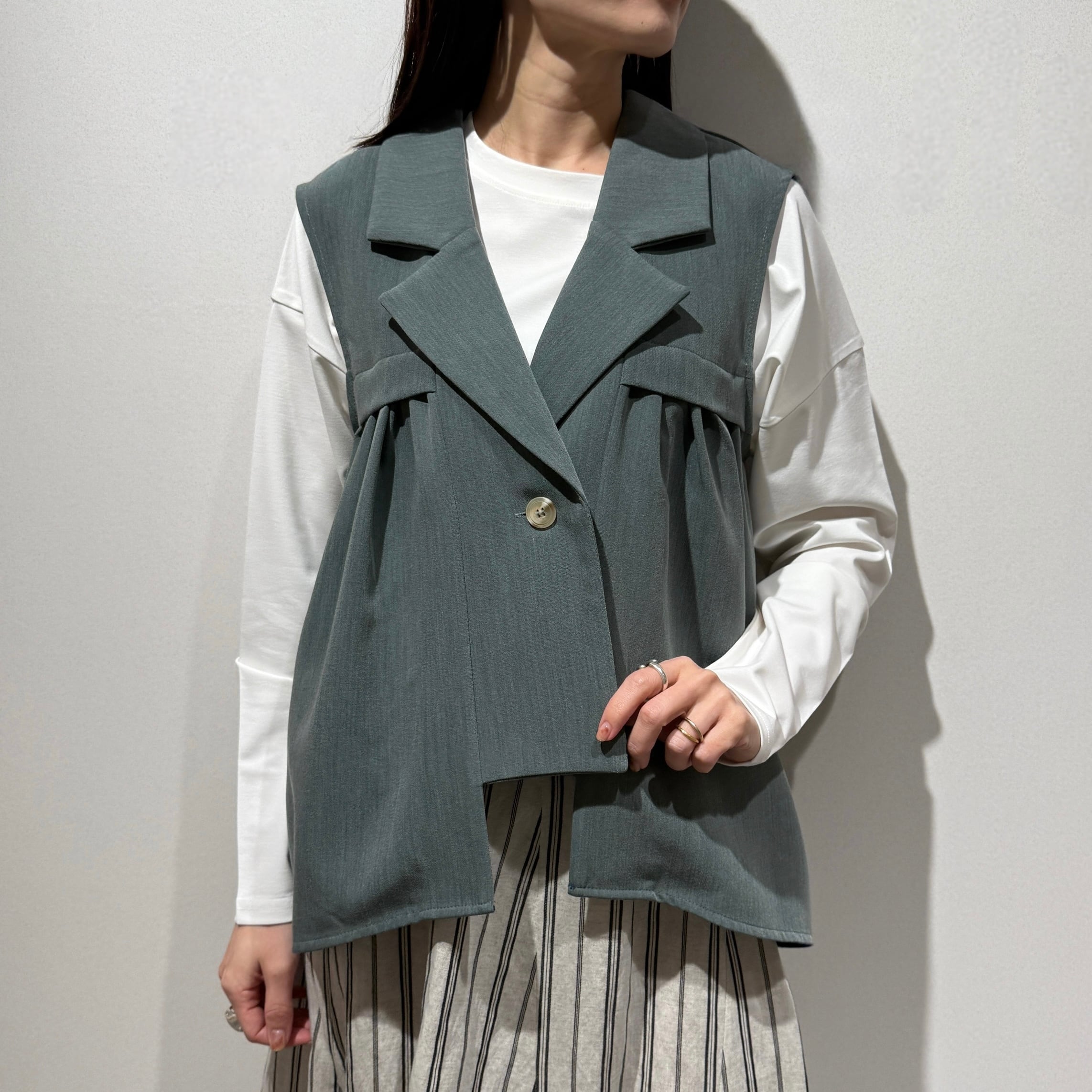 羽織るだけでスタイリングが決まる、軽やかで上品な印象のタックフレアジレ。