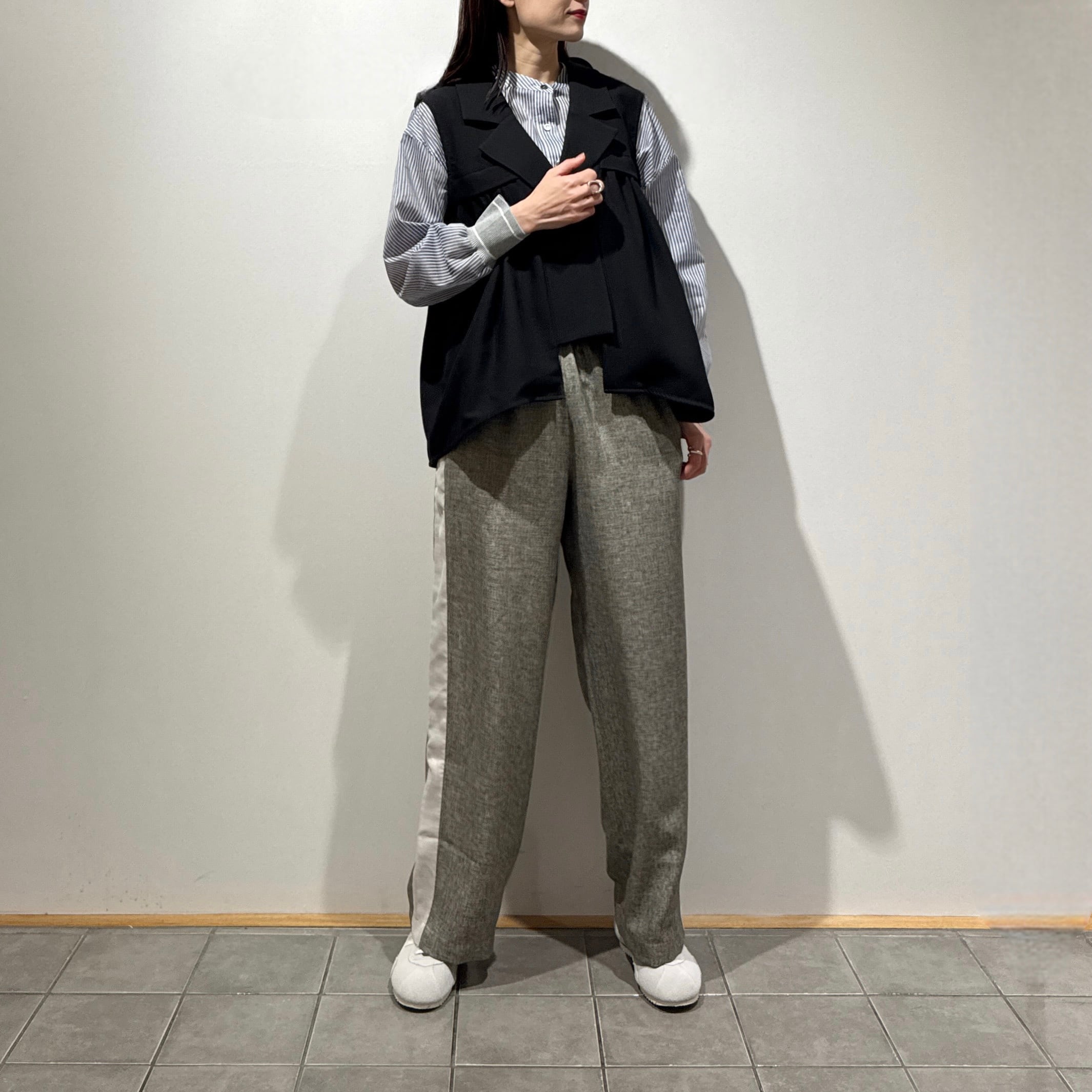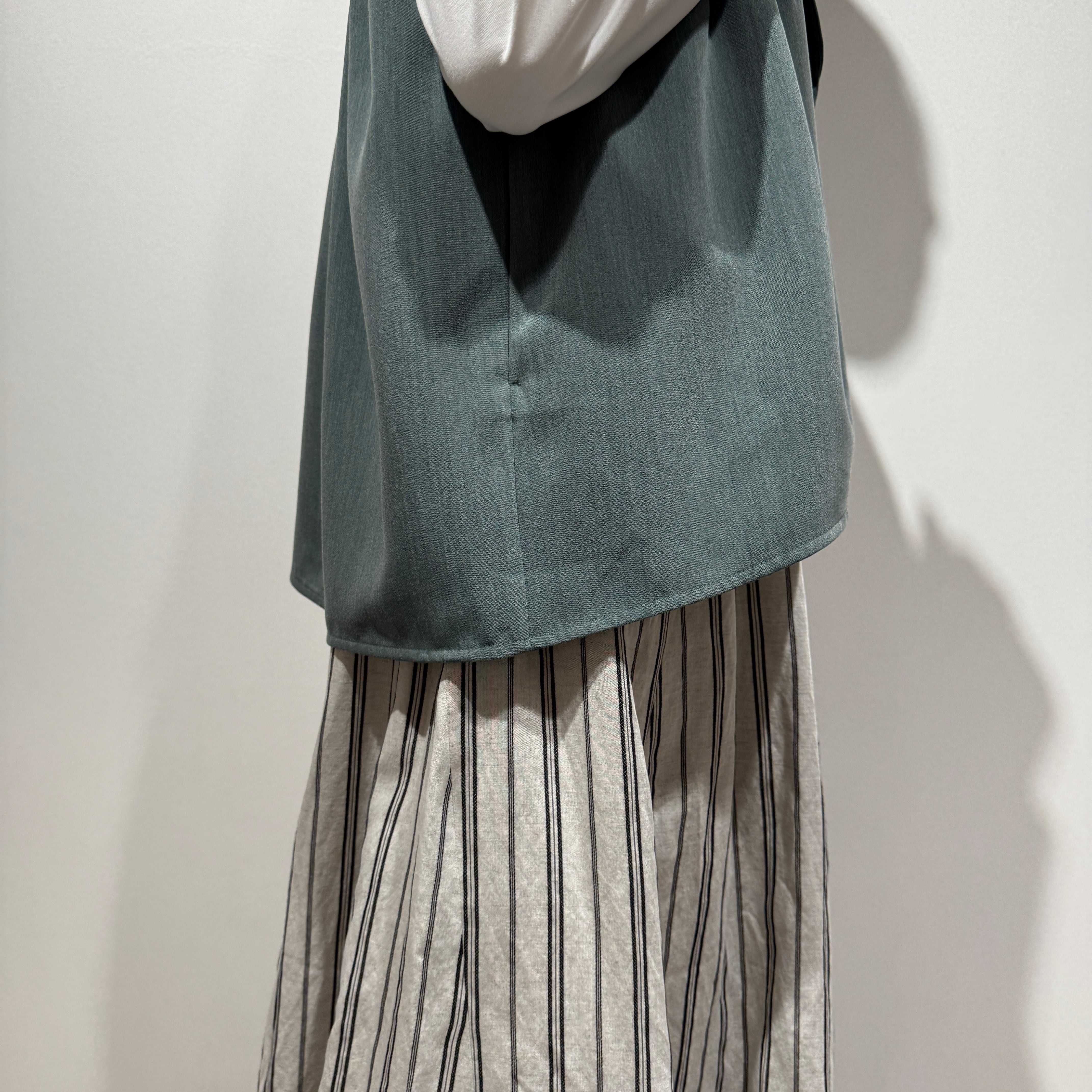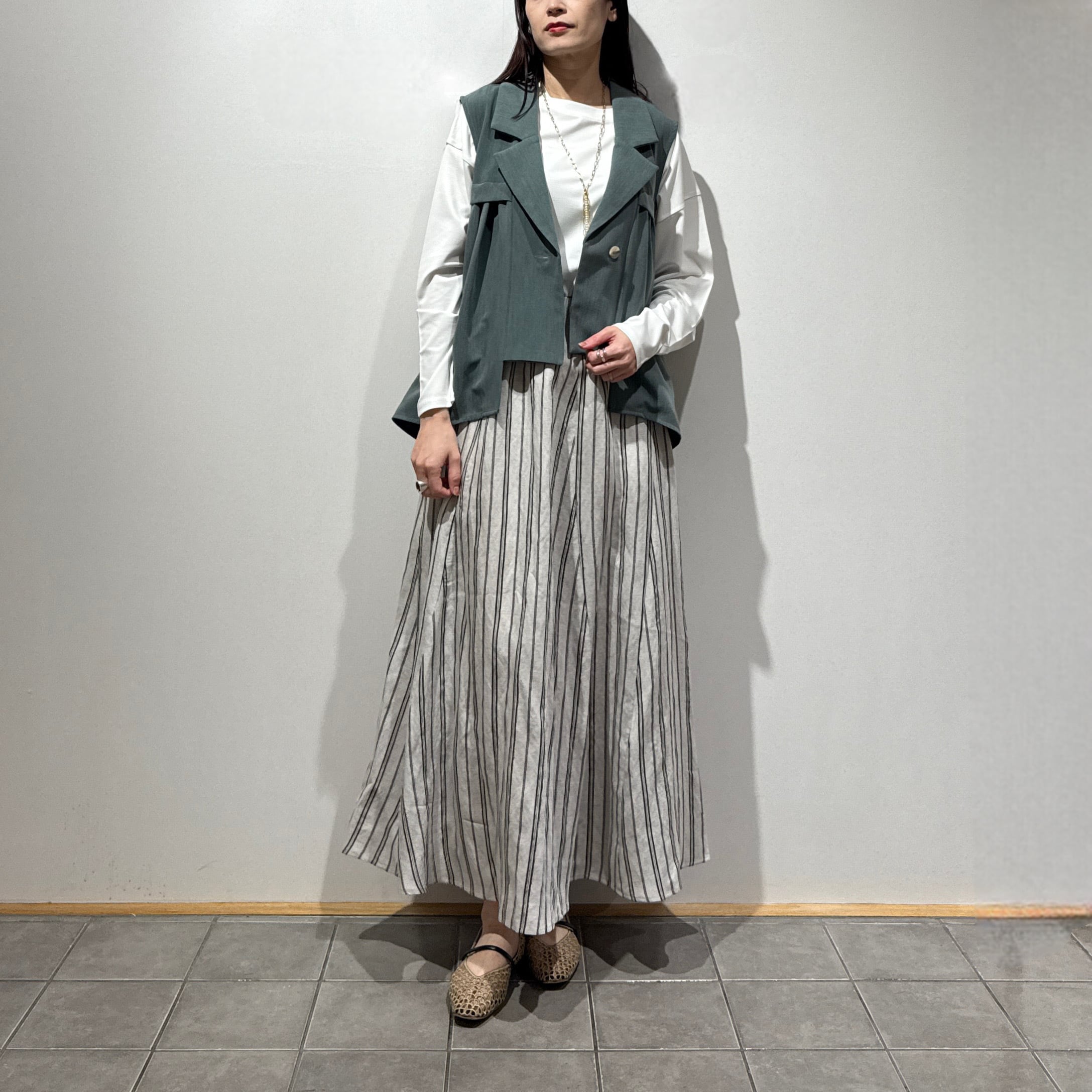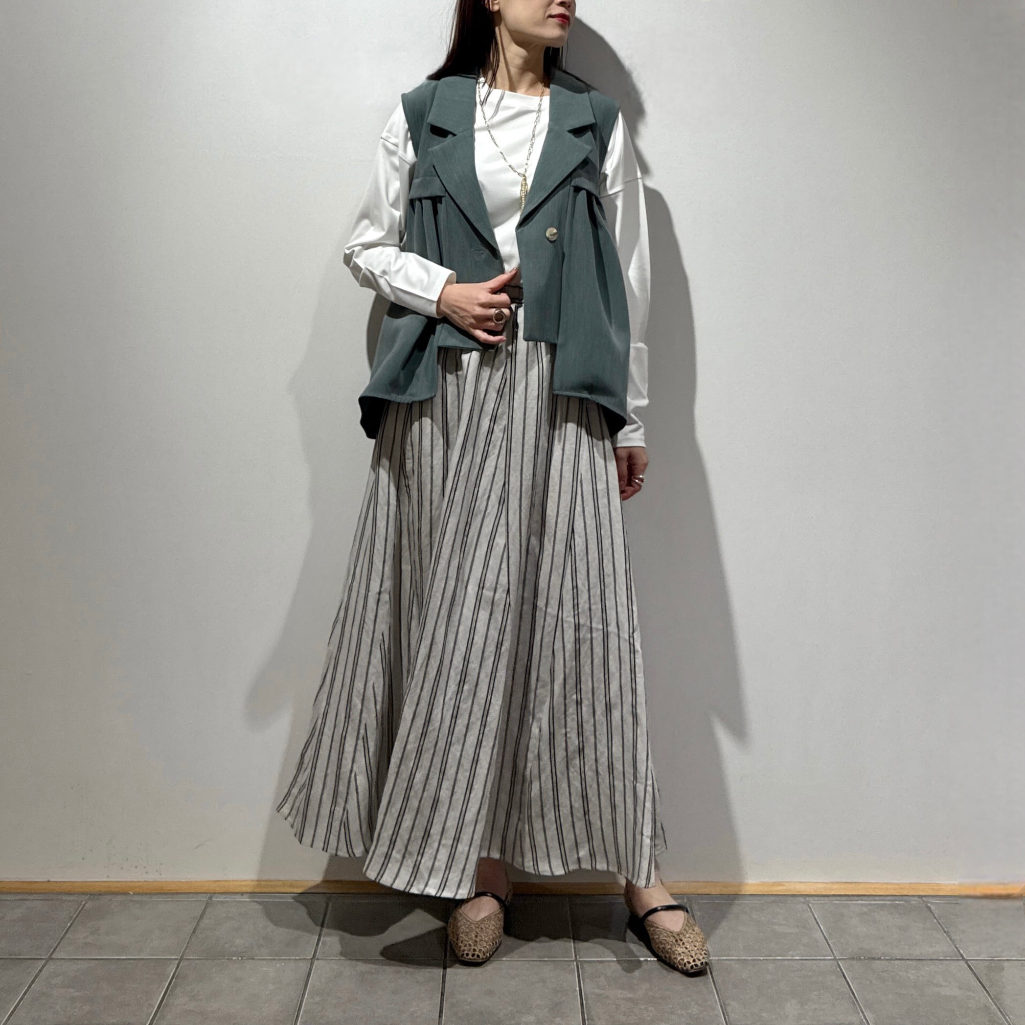 羽織るだけでスタイリングが決まる、軽やかで上品な印象のタックフレアジレ。