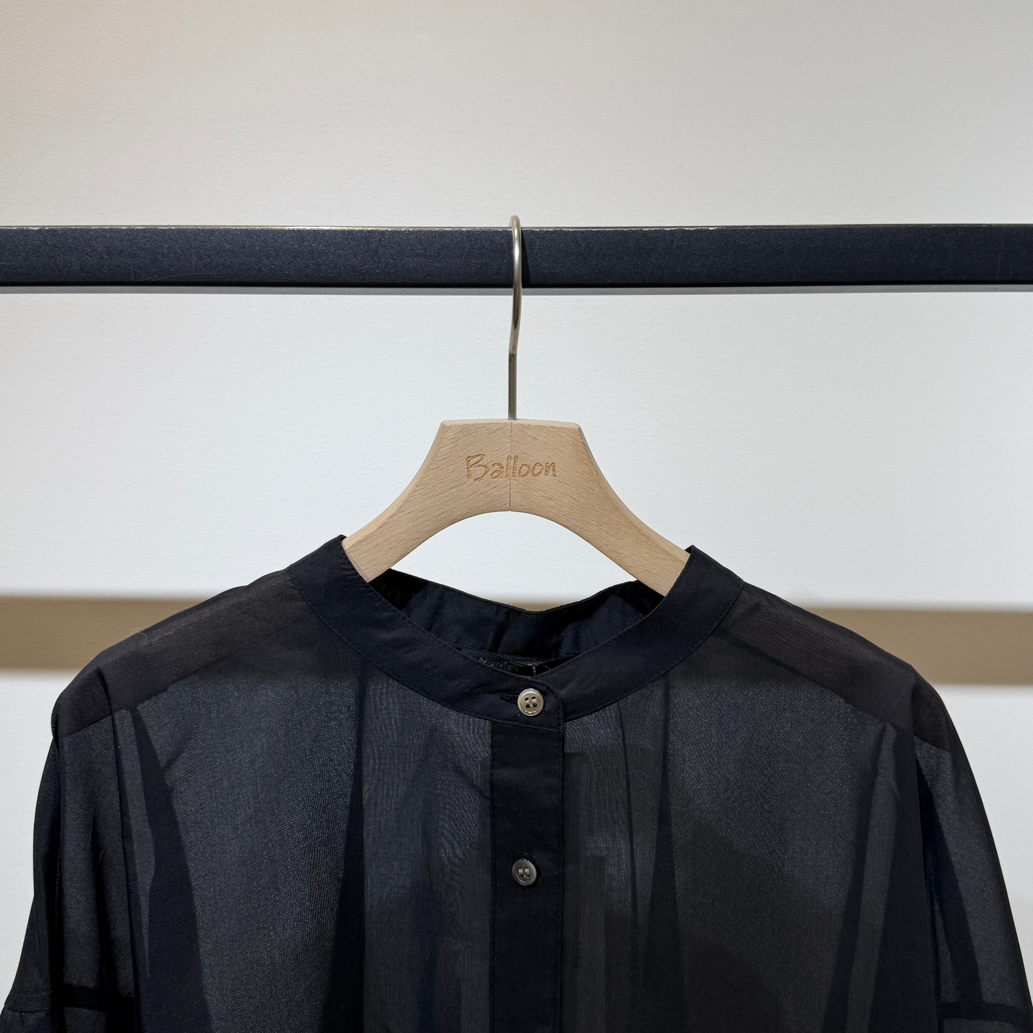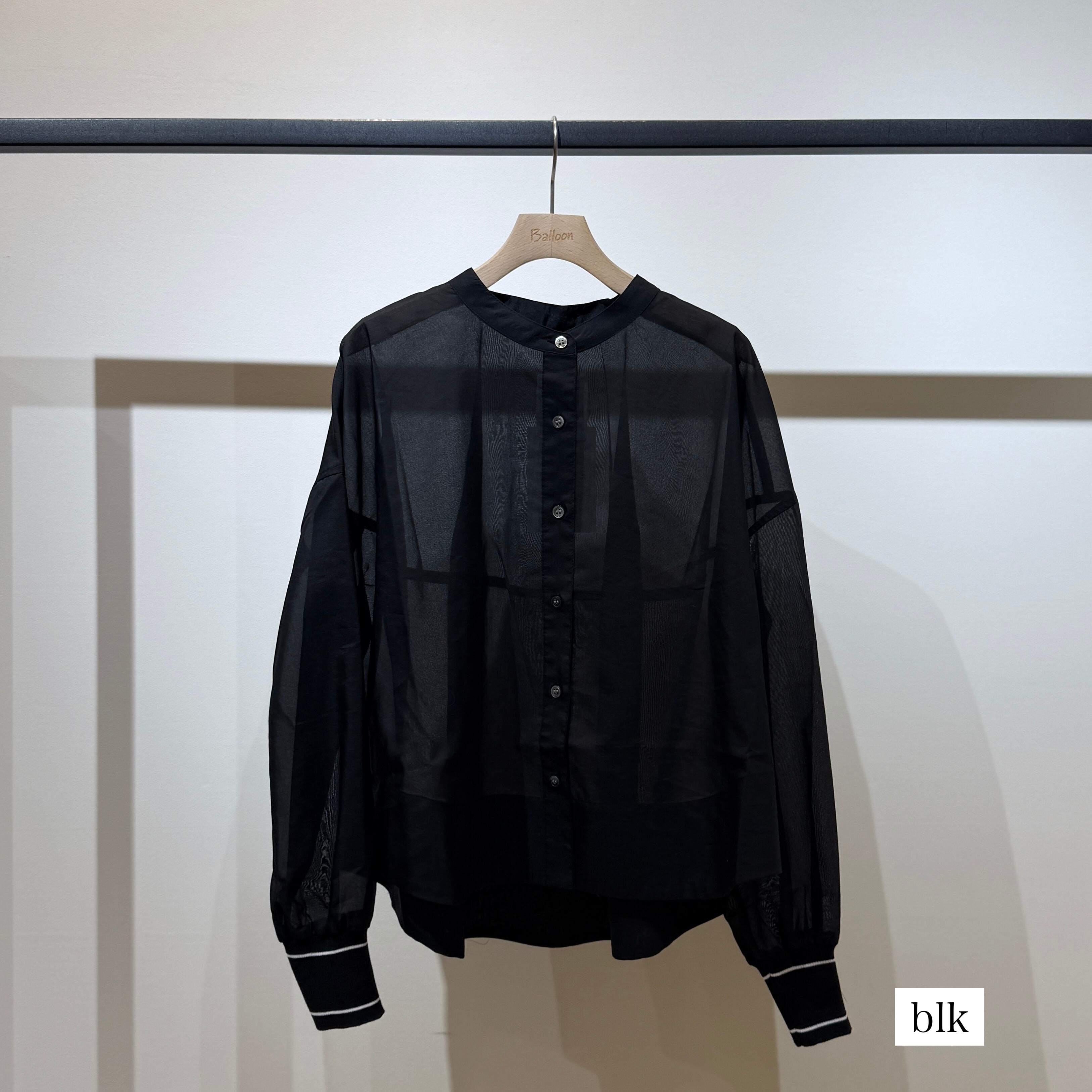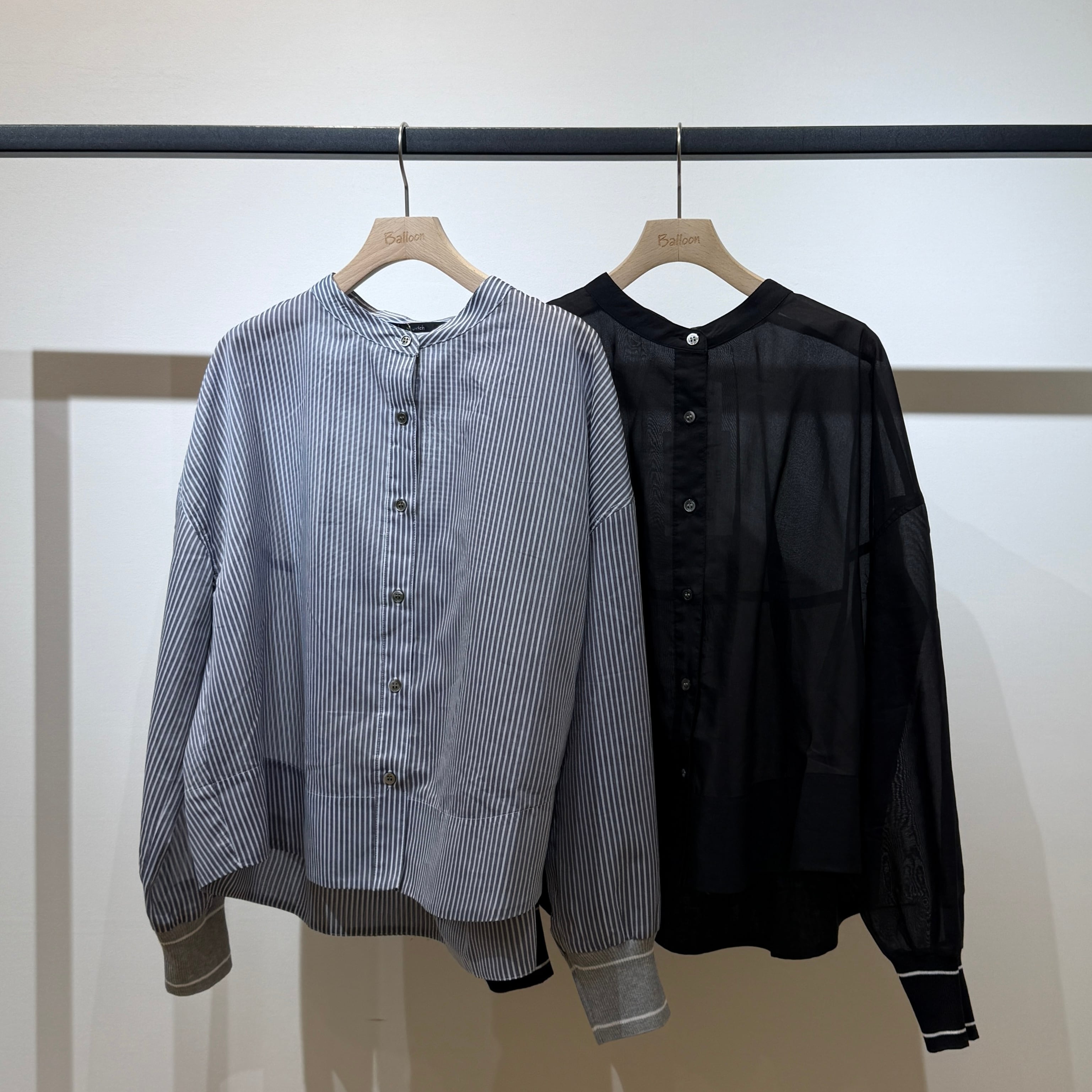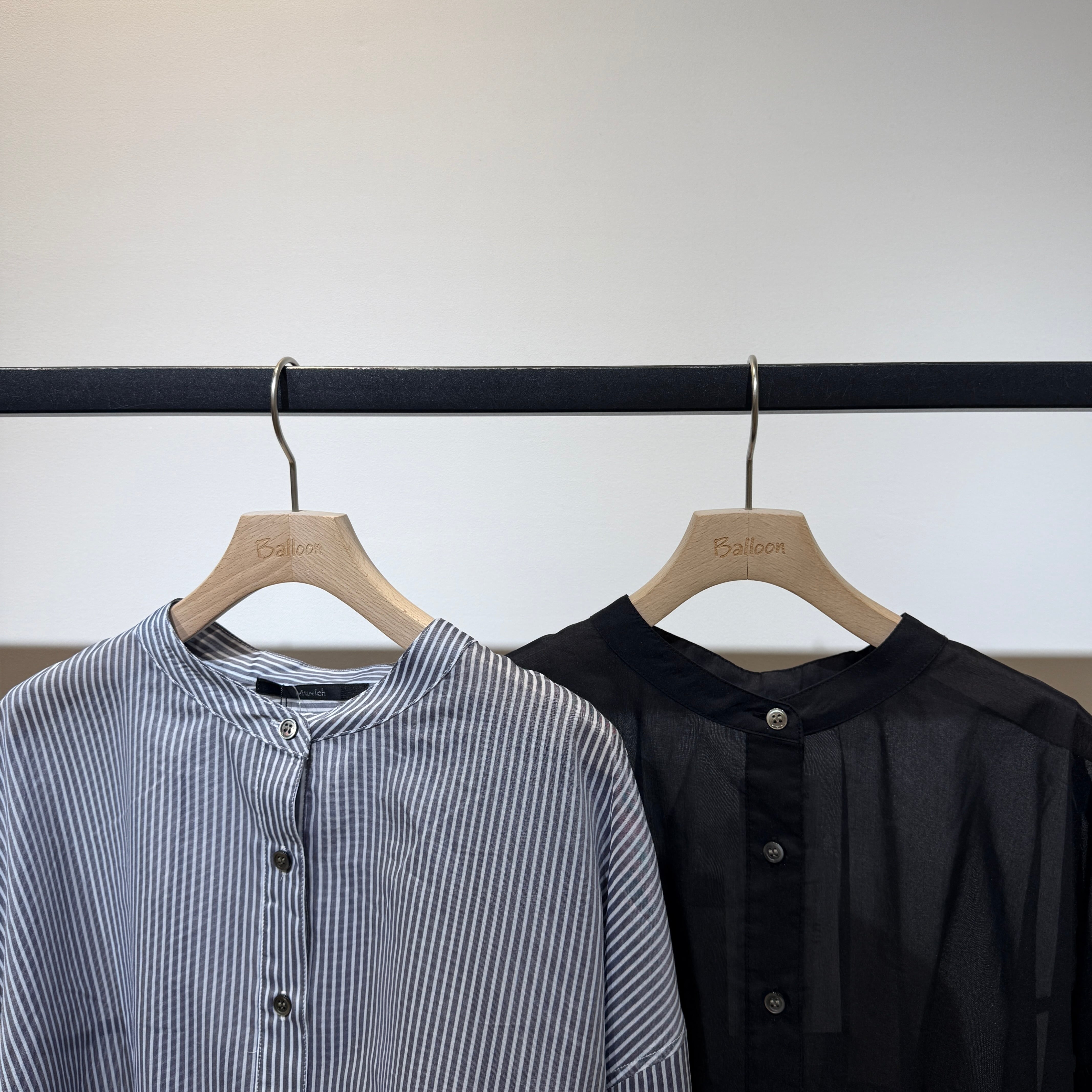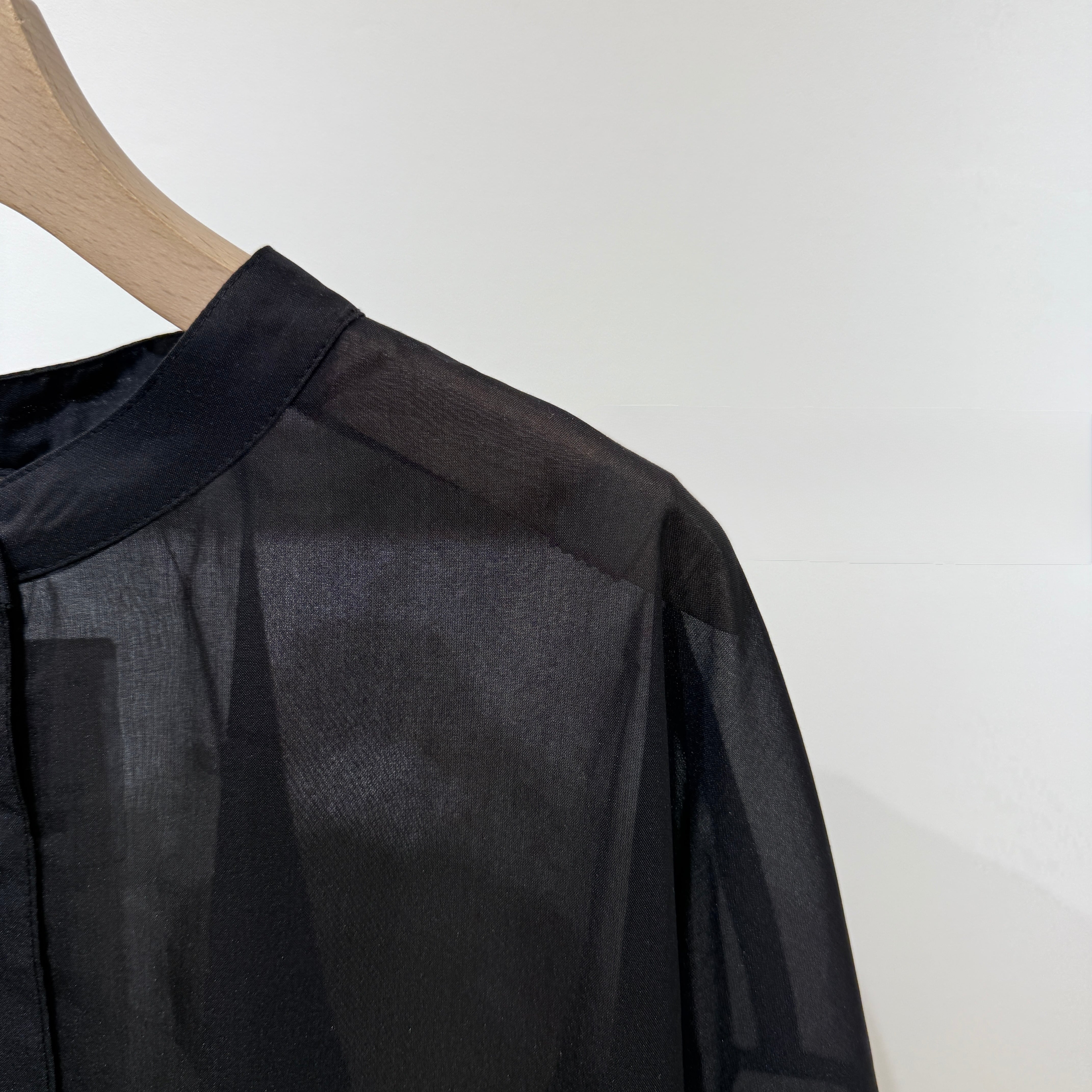 シアー感と立体的なシルエットが魅力の、上品さとデザイン性を兼ね備えたバンドカラーシャツ。
