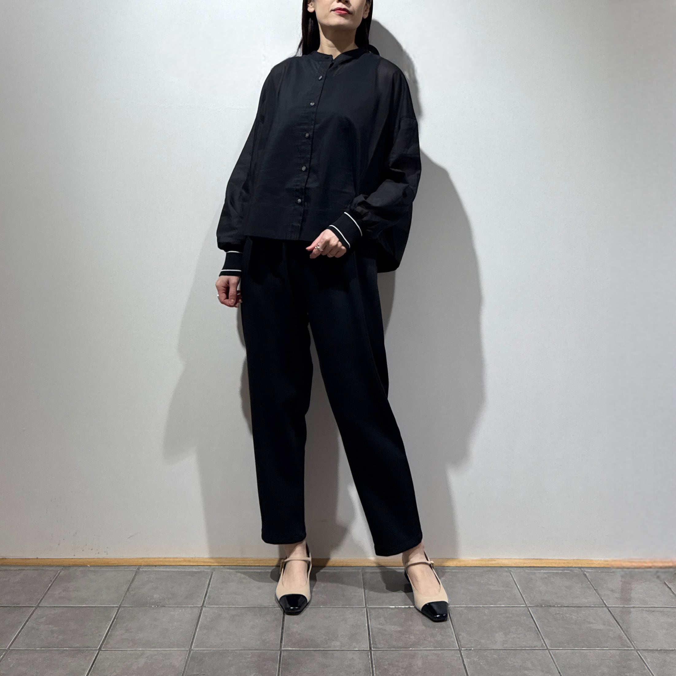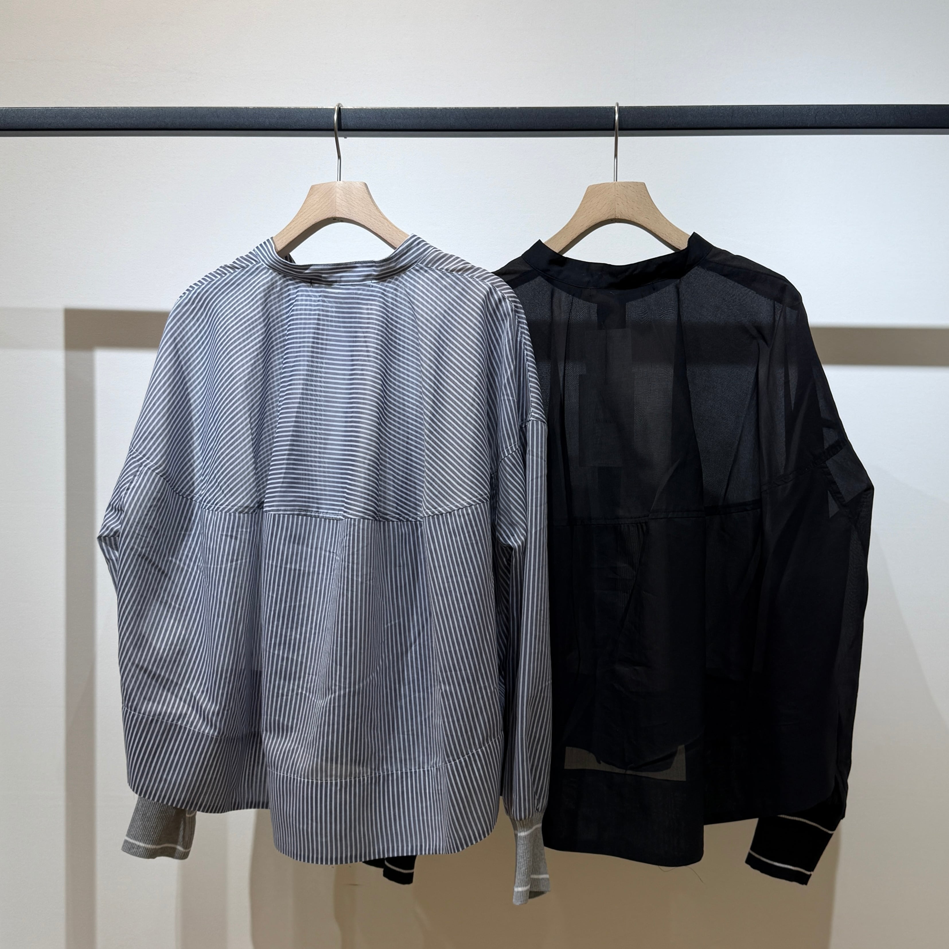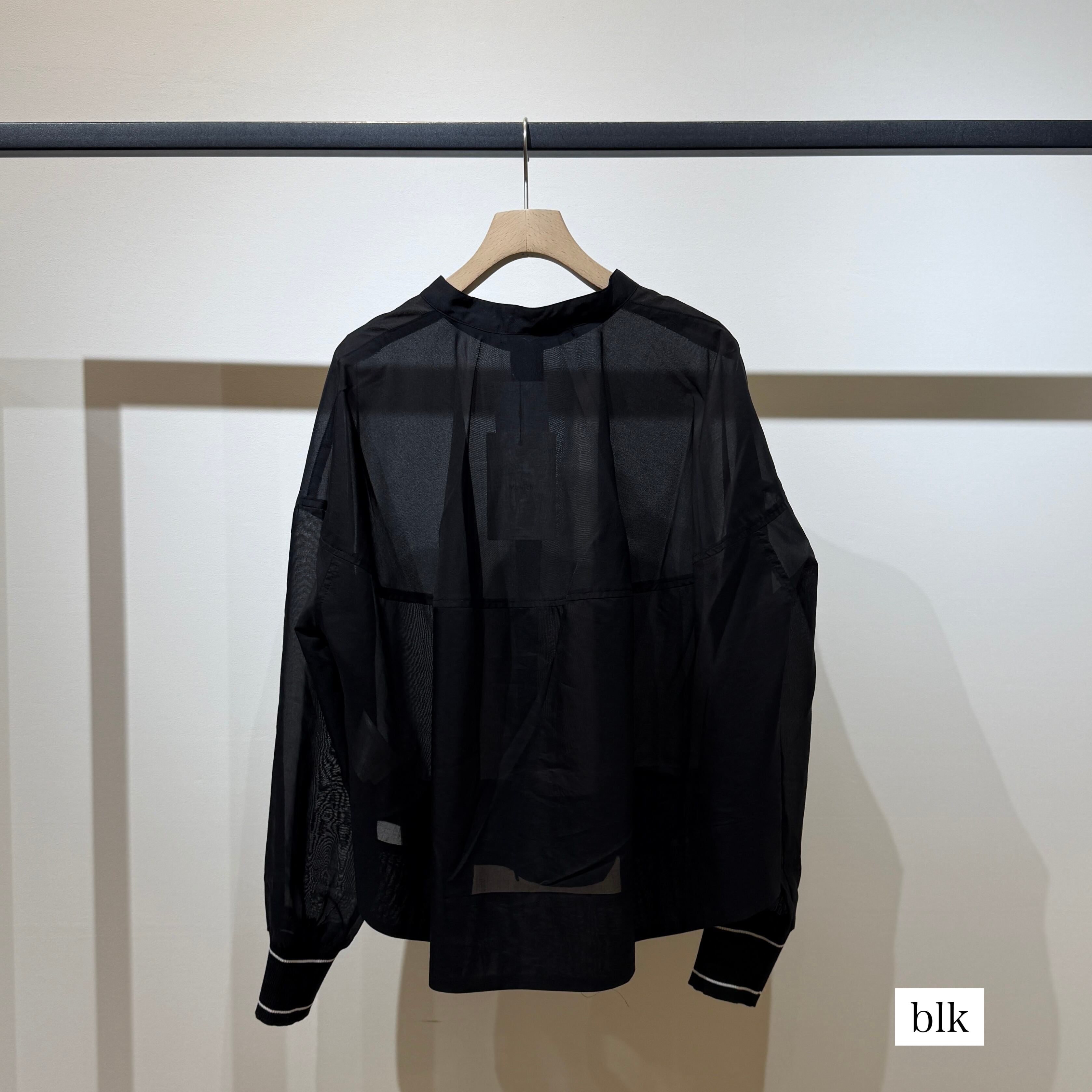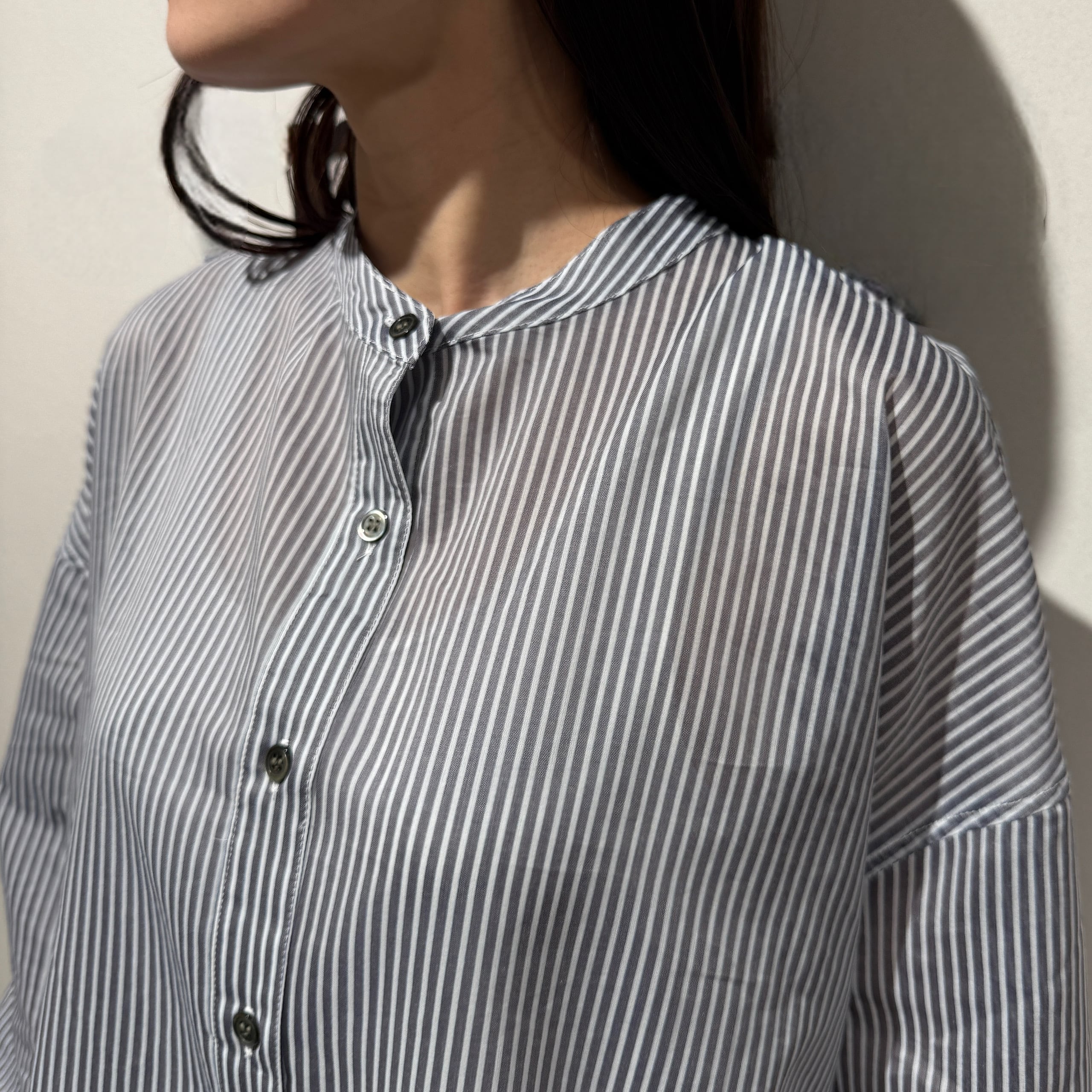 シアー感と立体的なシルエットが魅力の、上品さとデザイン性を兼ね備えたバンドカラーシャツ。