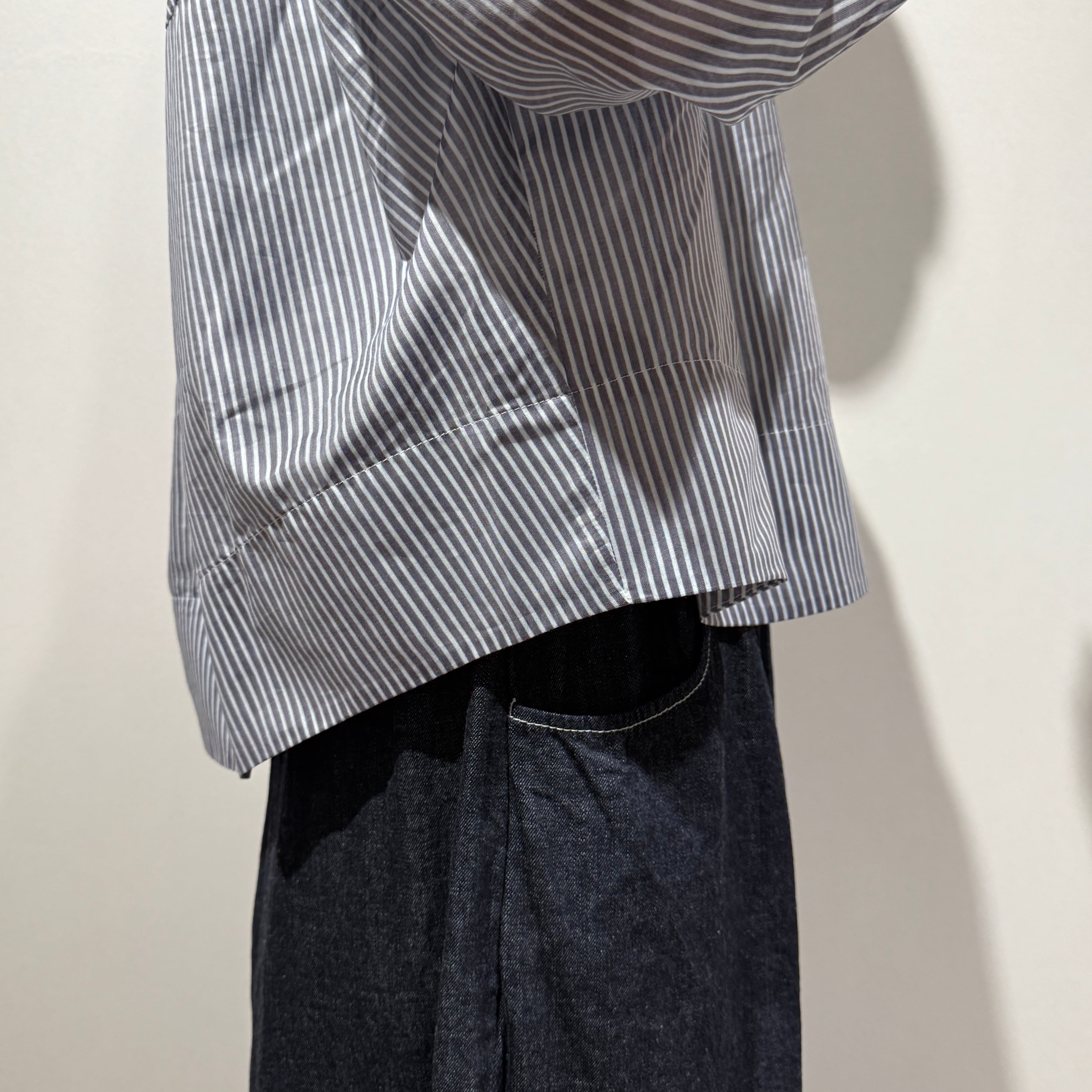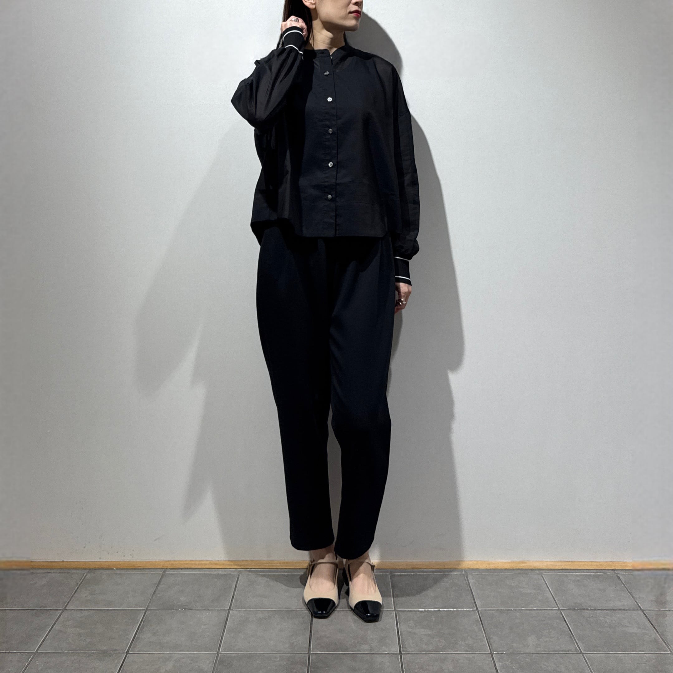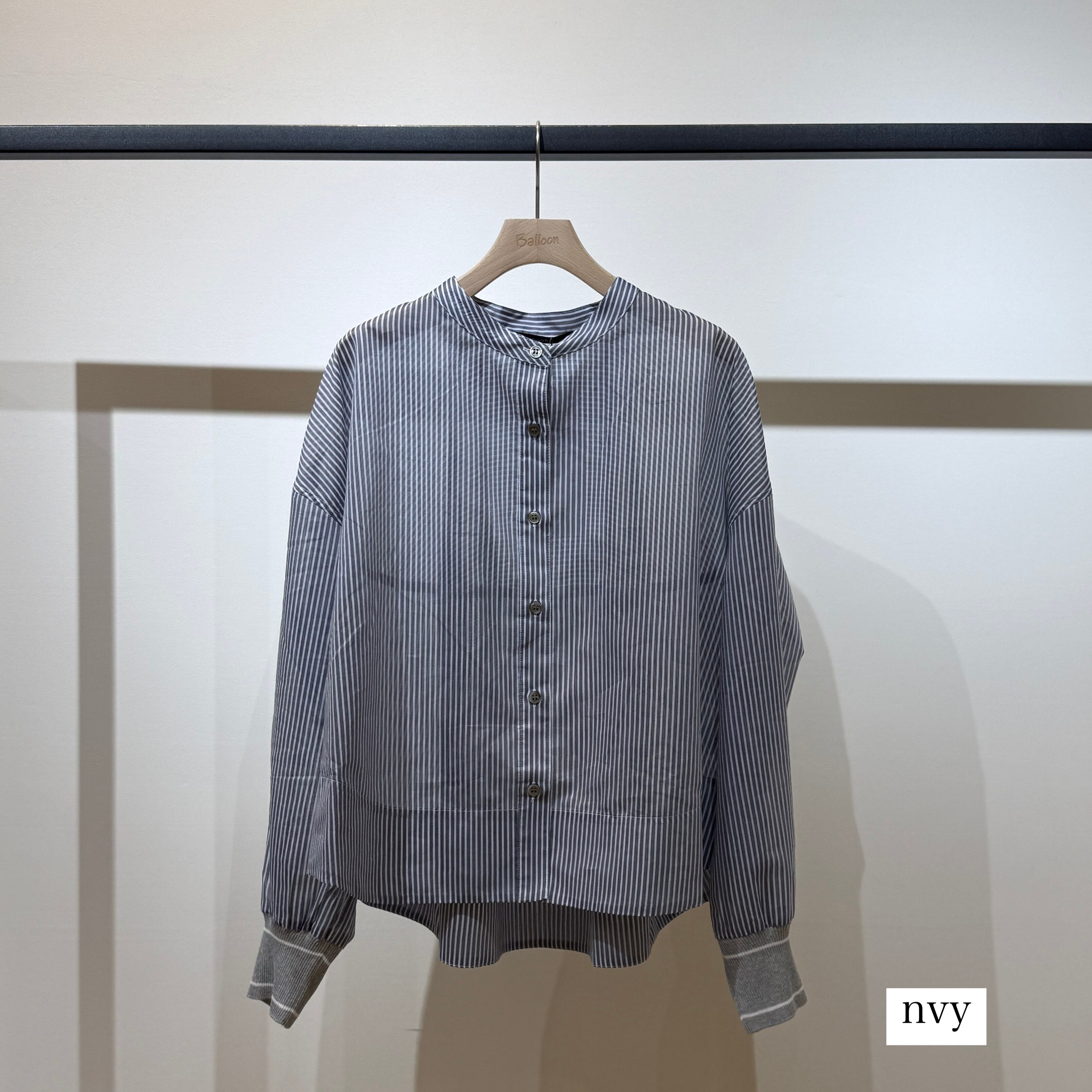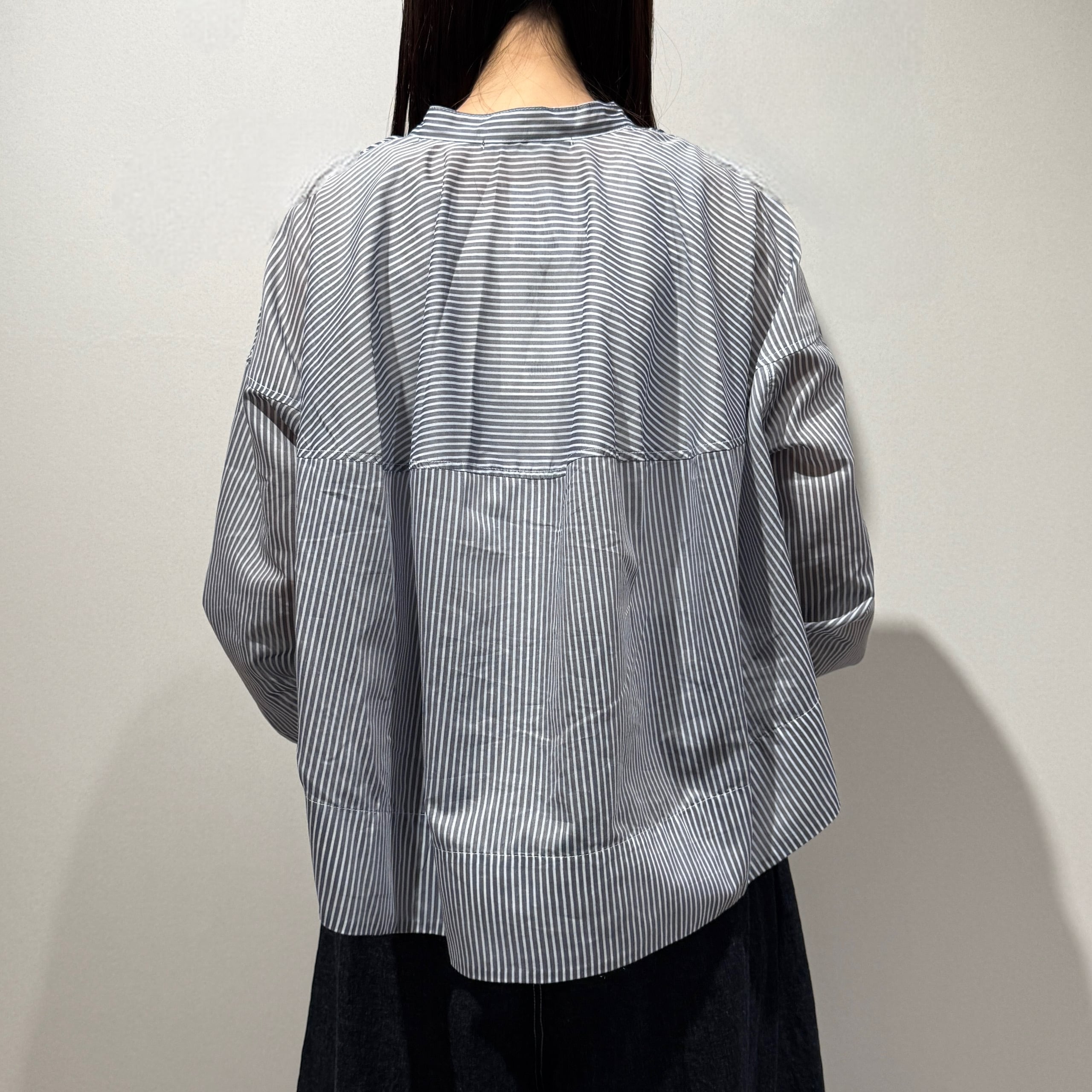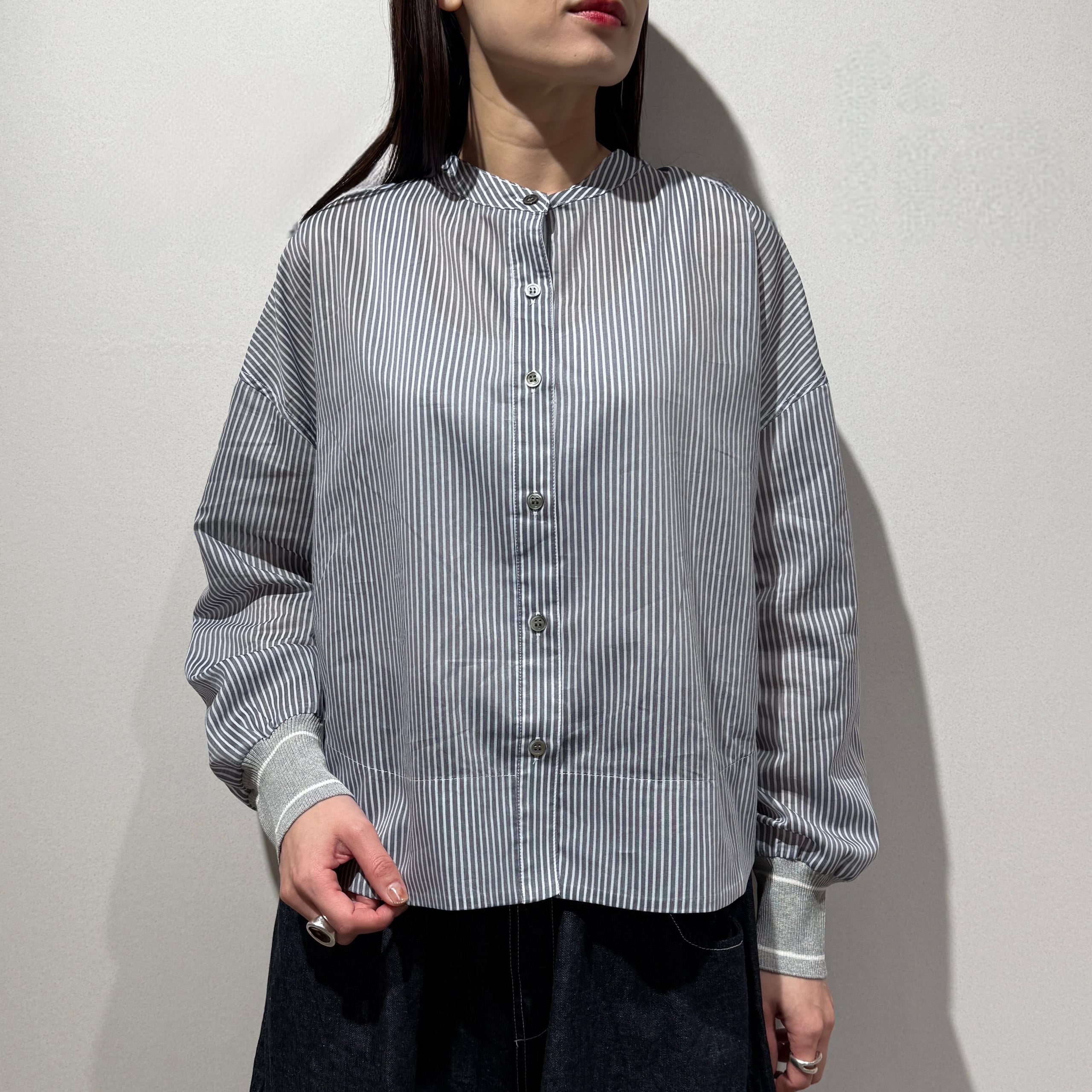 シアー感と立体的なシルエットが魅力の、上品さとデザイン性を兼ね備えたバンドカラーシャツ。