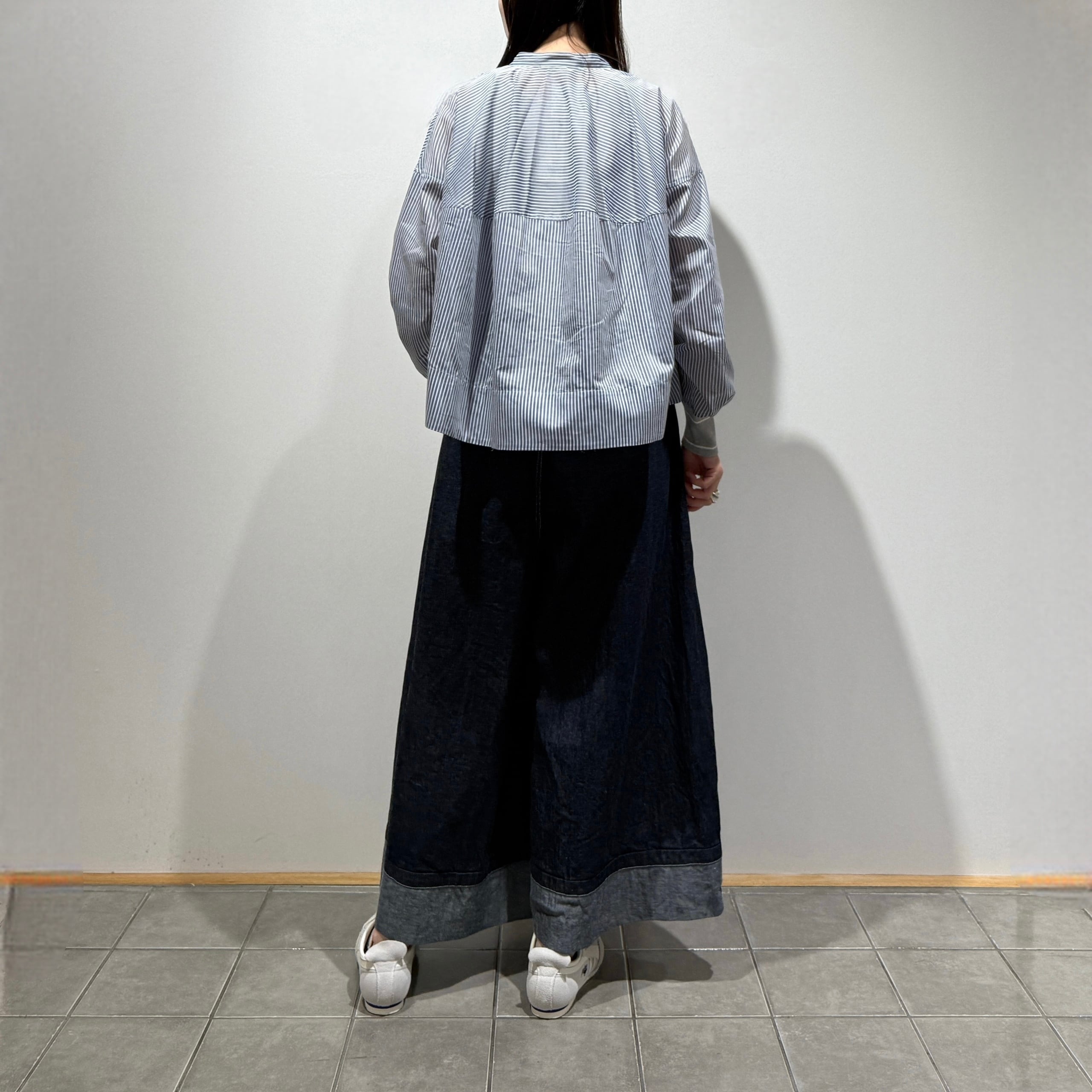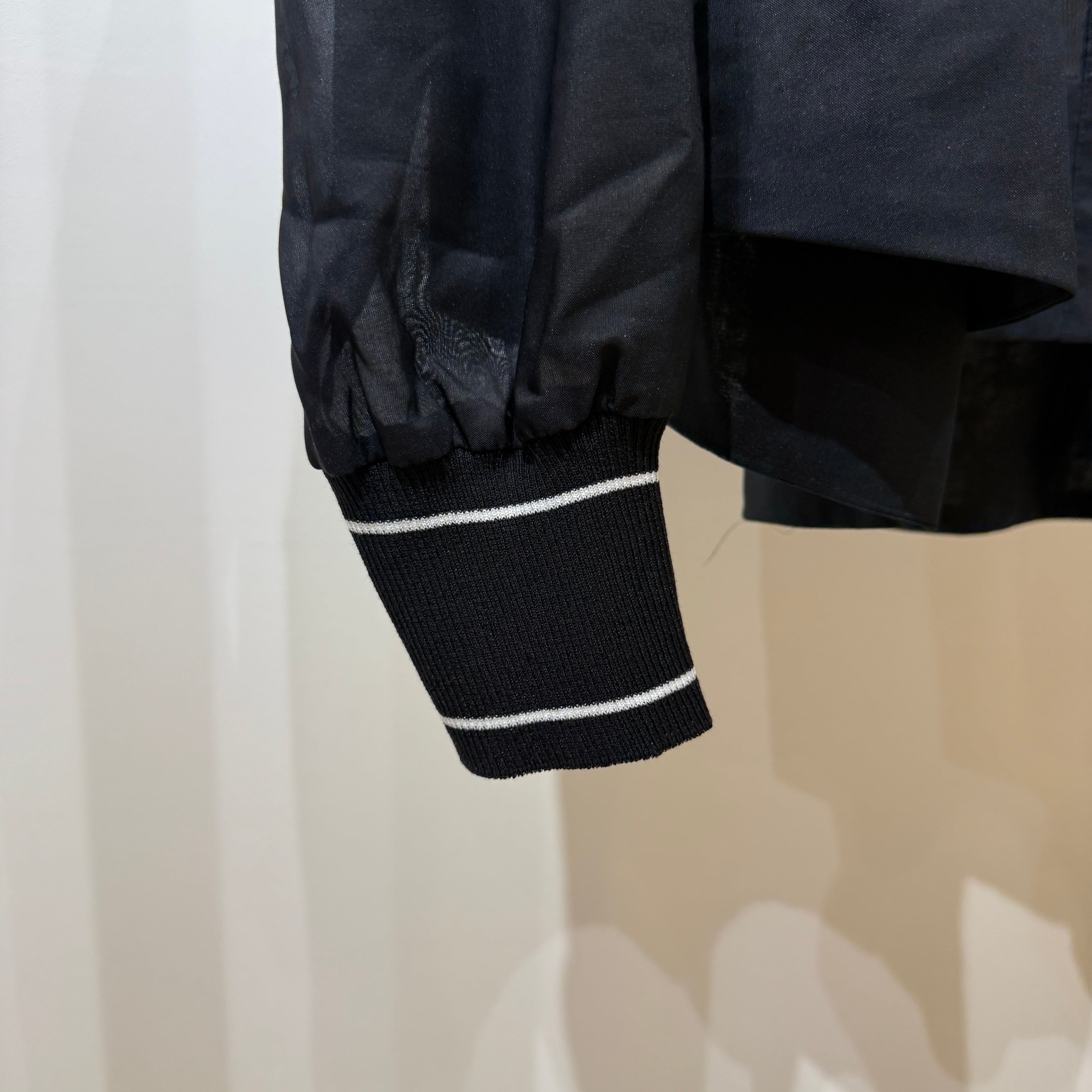 袖口リブと切り替えラインでふくらみのある立体シルエットを演出し、透け感のコントラストとストライプ柄が印象的な一枚。