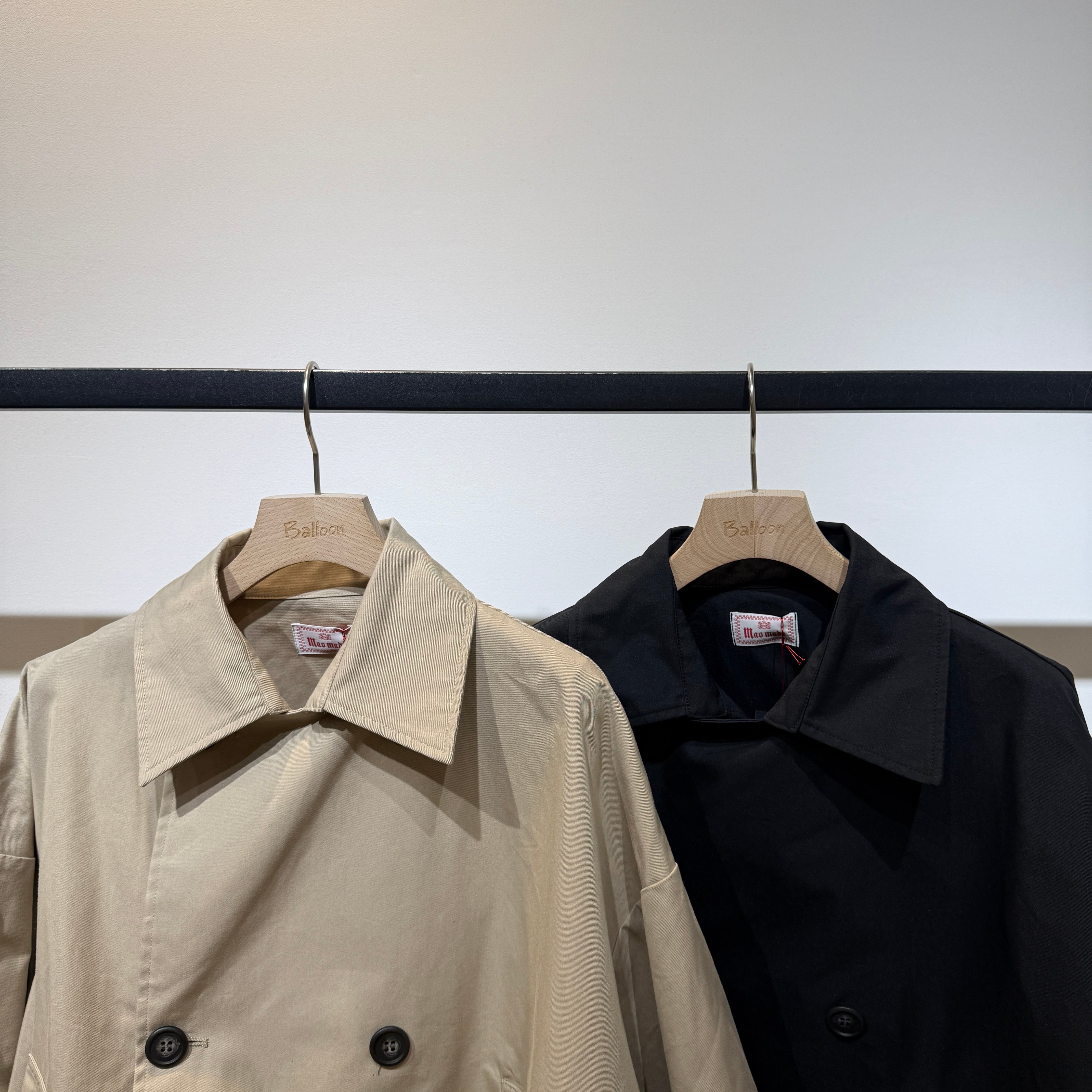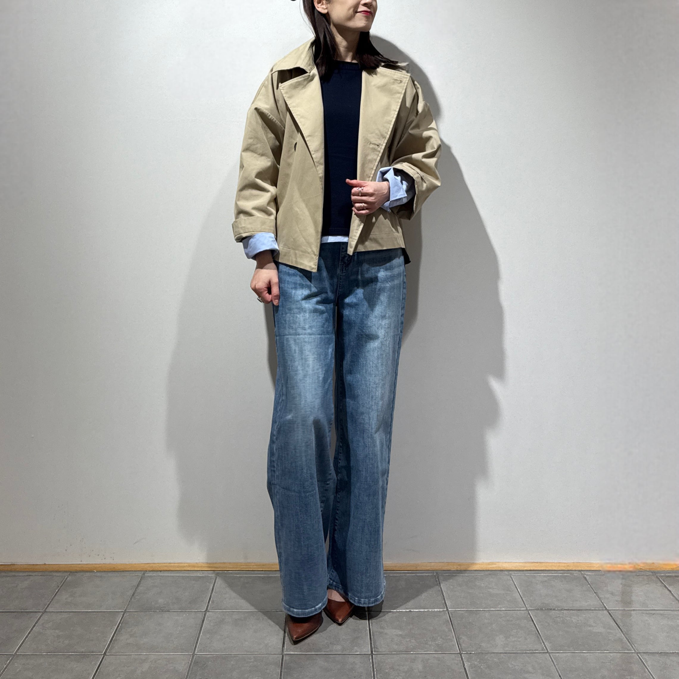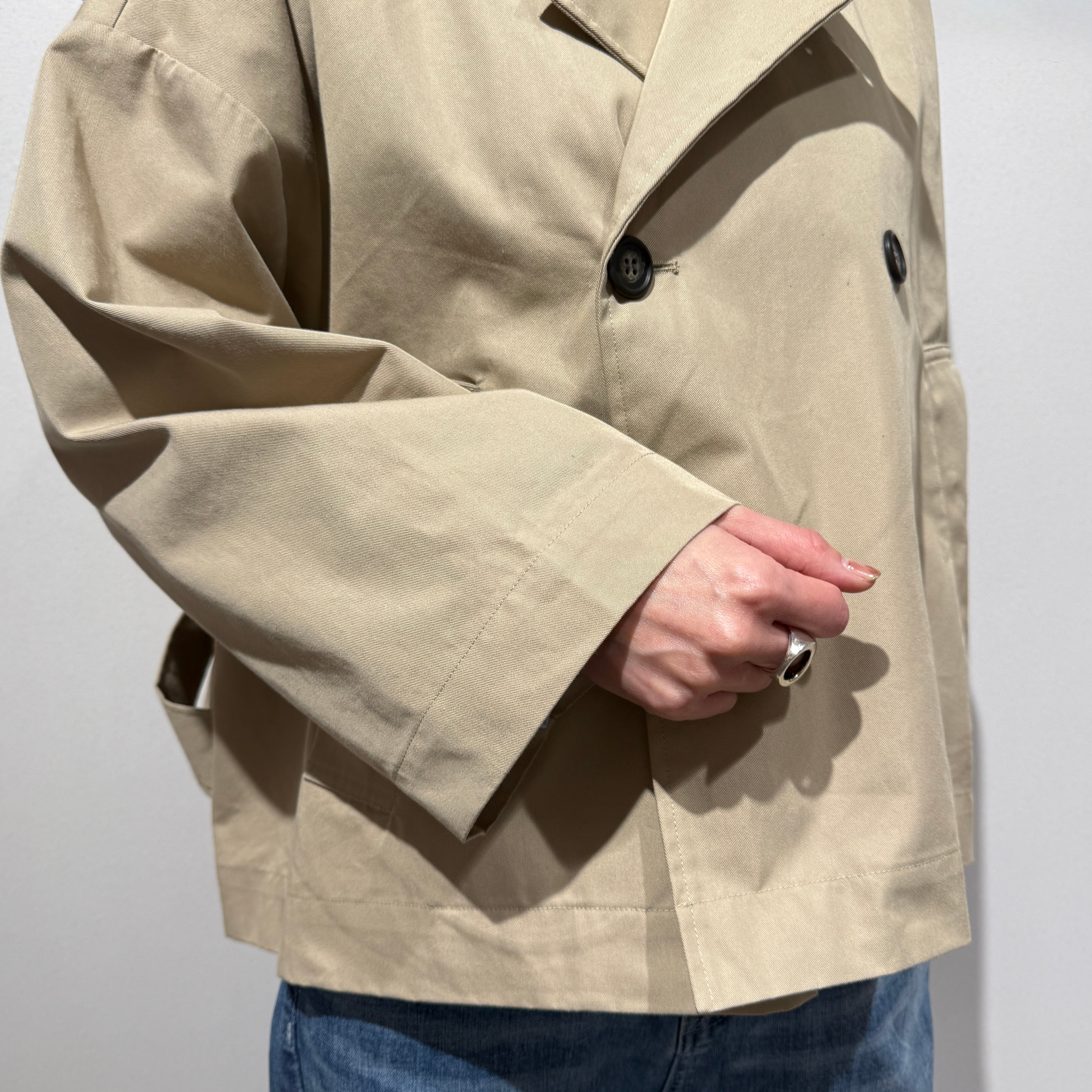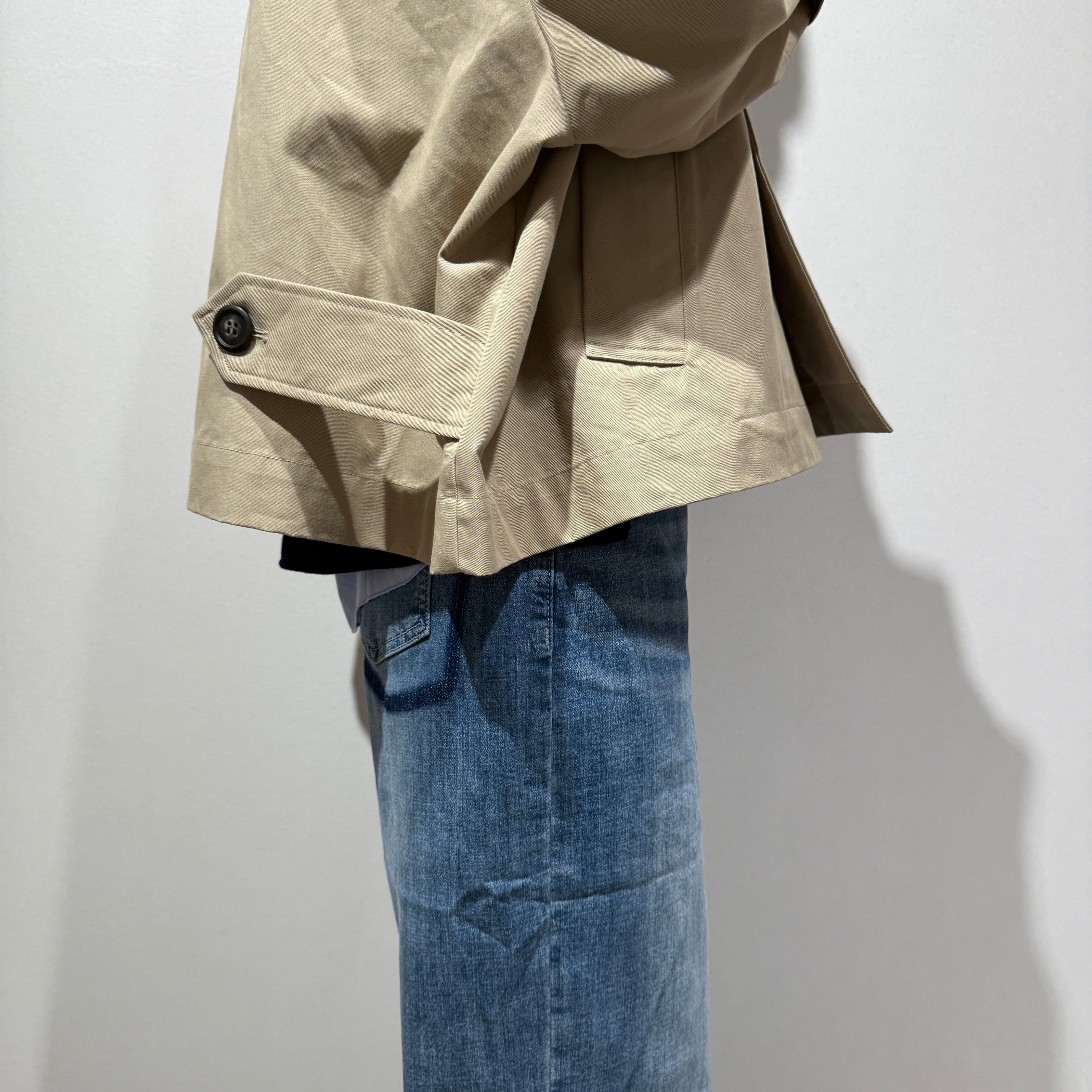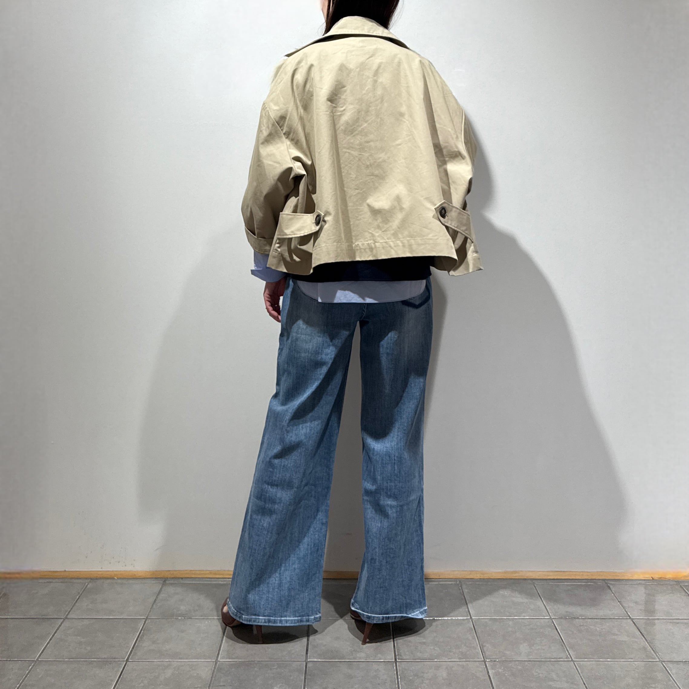 スタンダードなデザインだからこそ、ゆったりとしたワイドな身幅、大きめのボタン、軽やかな着丈で今っぽいシルエットにアップデート◎