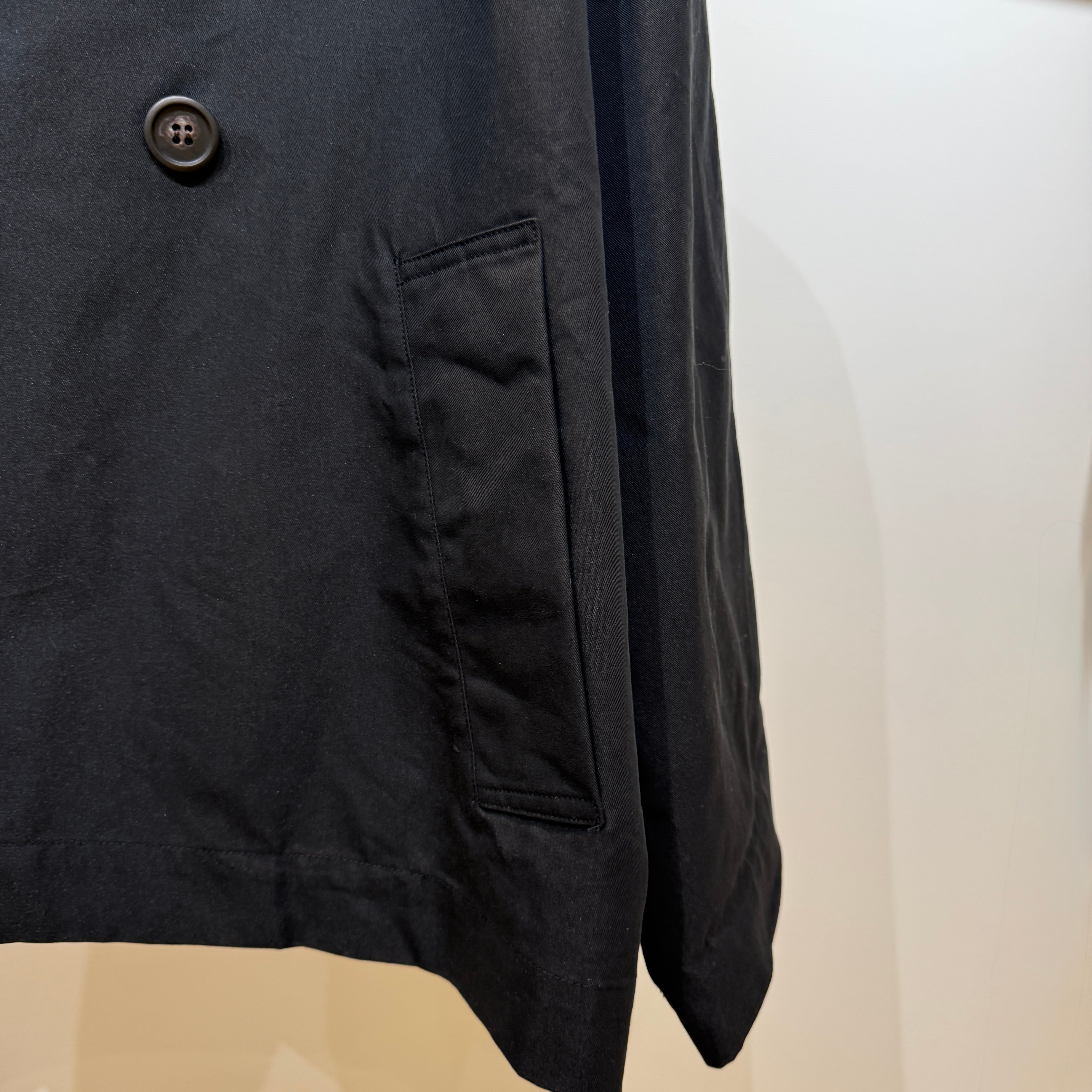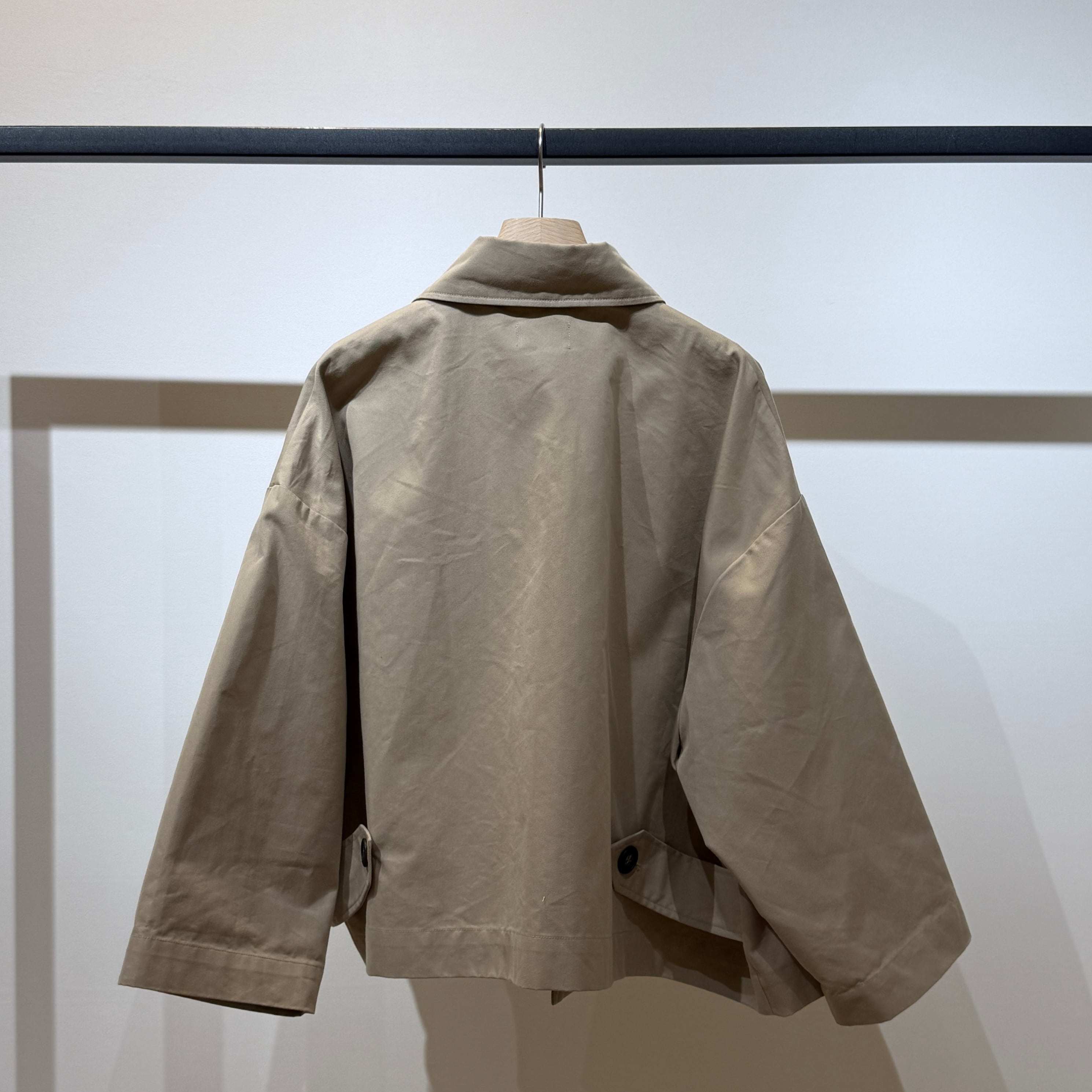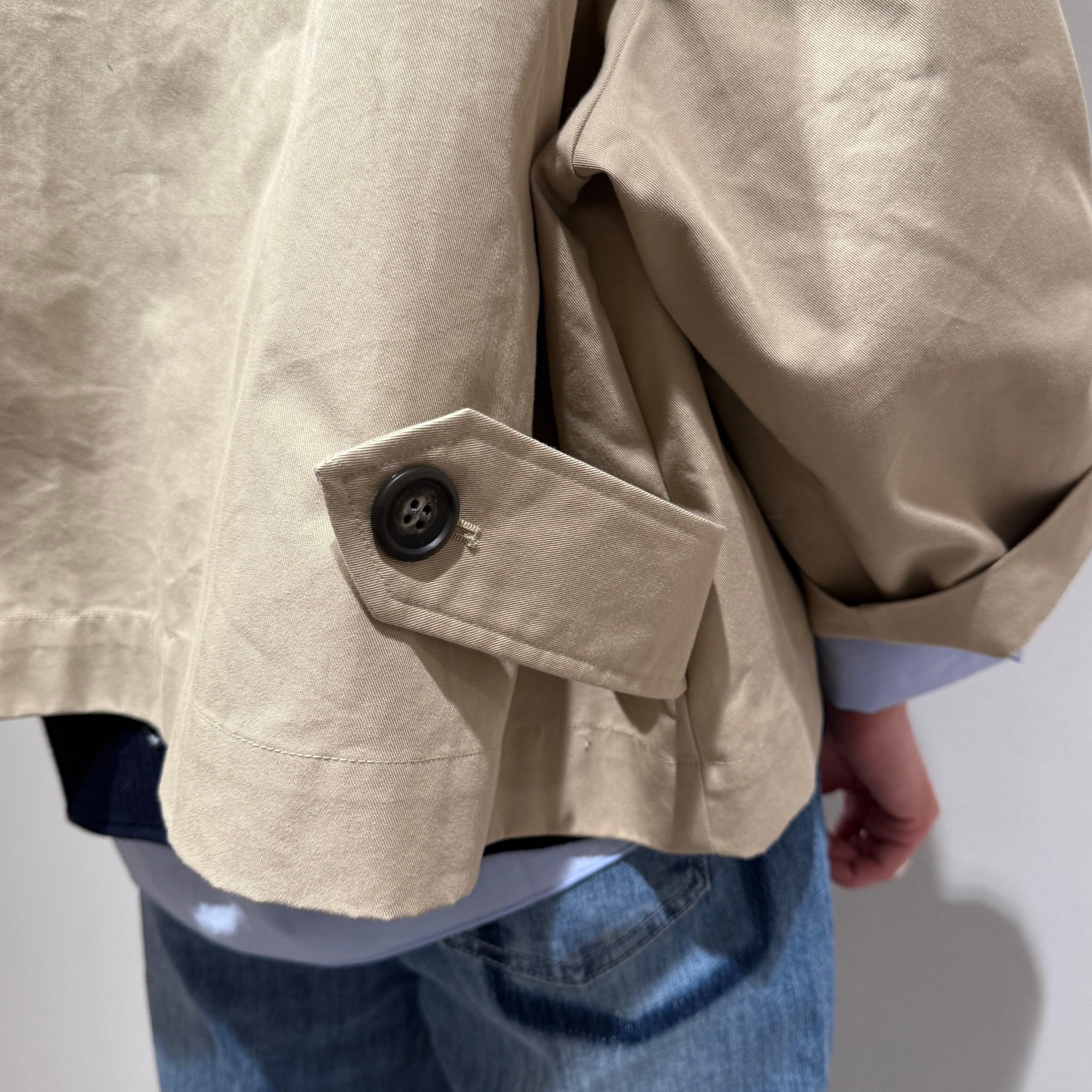 ポリエステルとコットンを混紡した糸で織られたツイル生地を使用したトレンチカラージャケット。