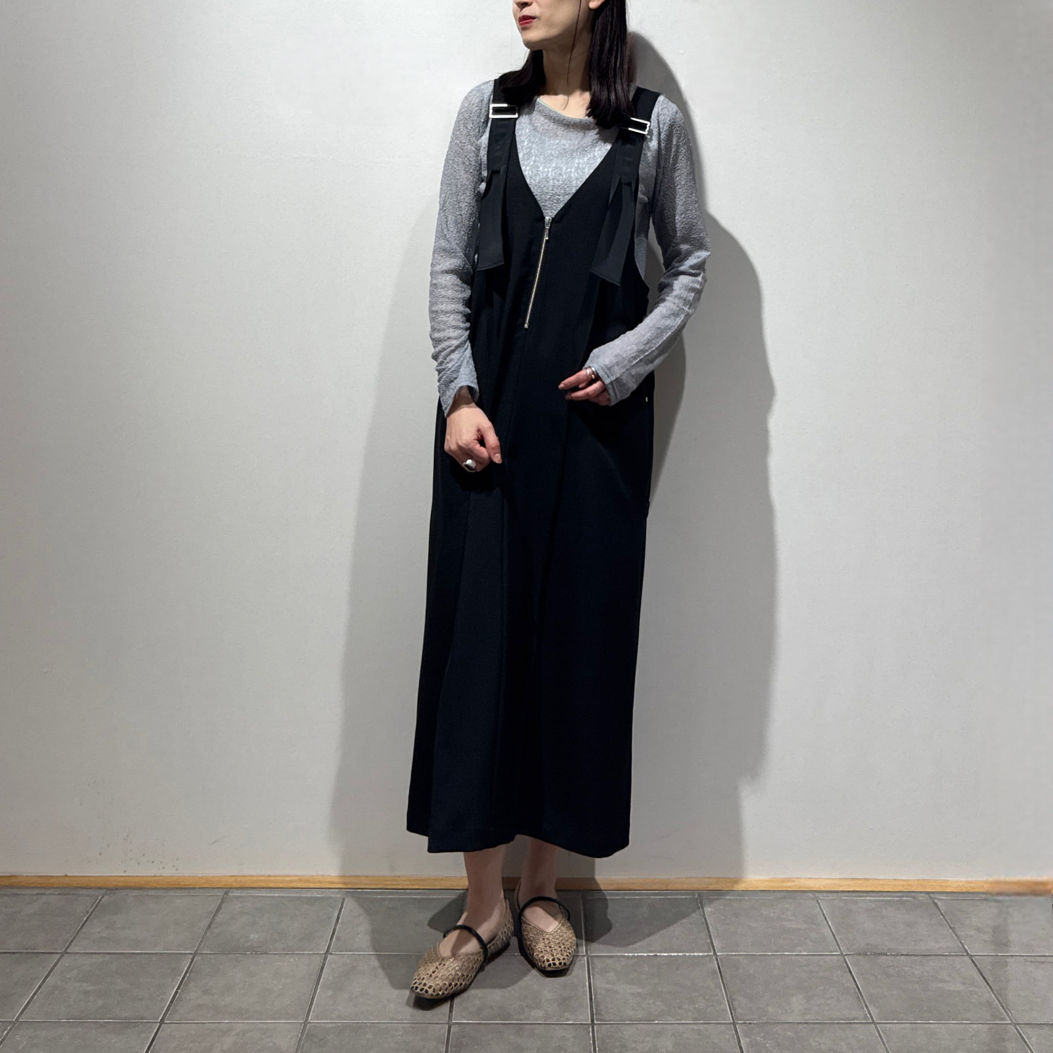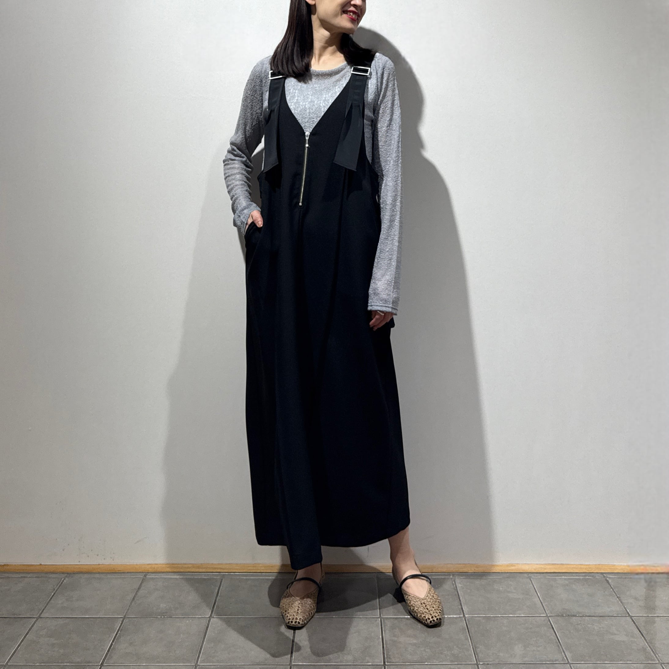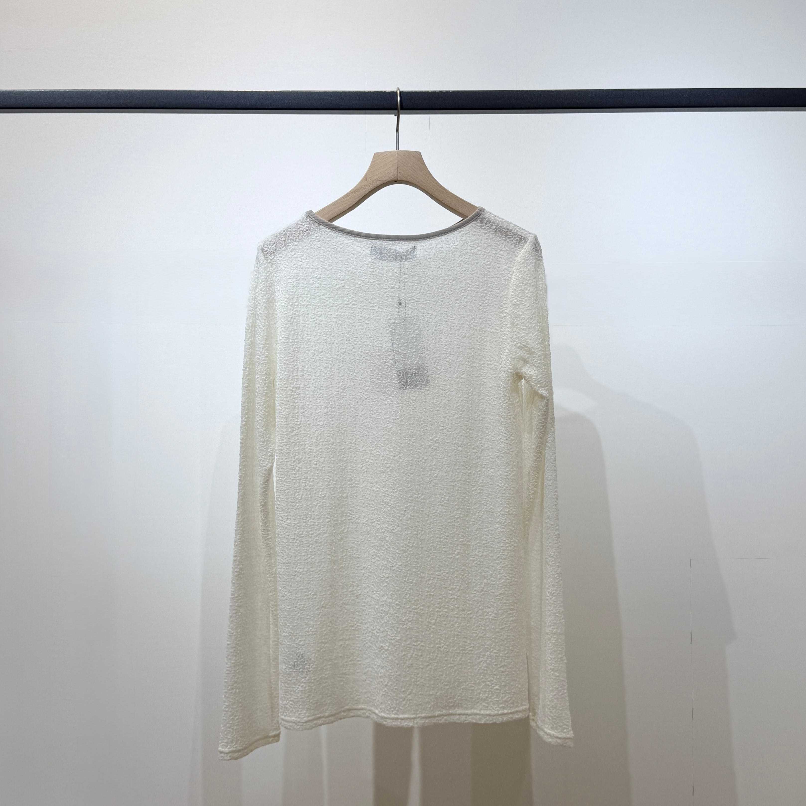 身体のラインを拾いすぎない程よいサイジングで華奢見えを演出し、ネックの配色がさりげないアクセントに。