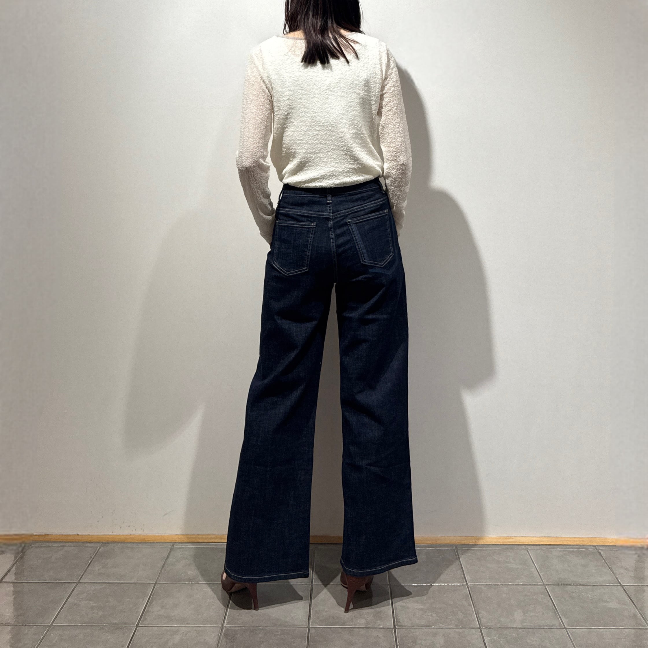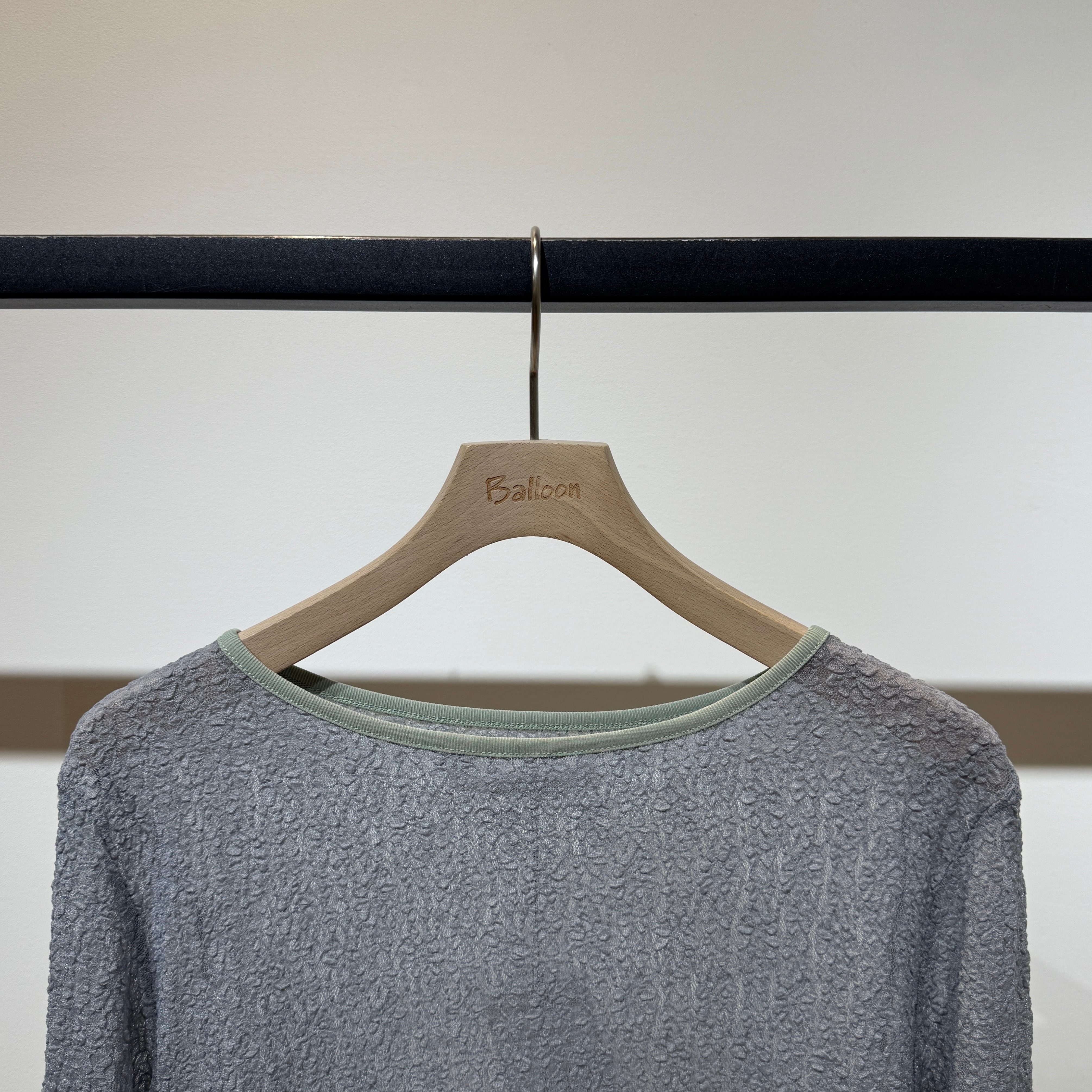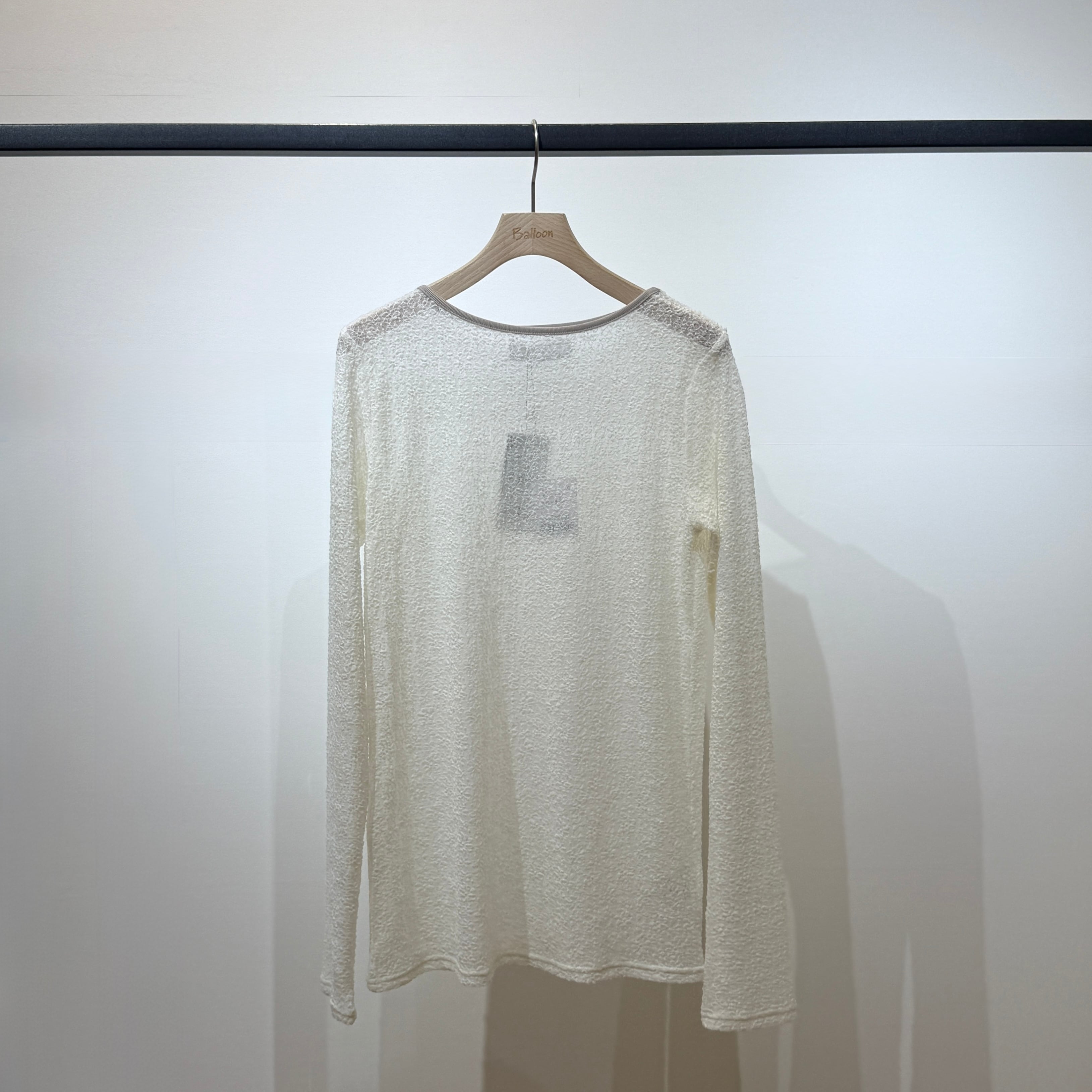 身体のラインを拾いすぎない程よいサイジングで華奢見えを演出し、ネックの配色がさりげないアクセントに。
