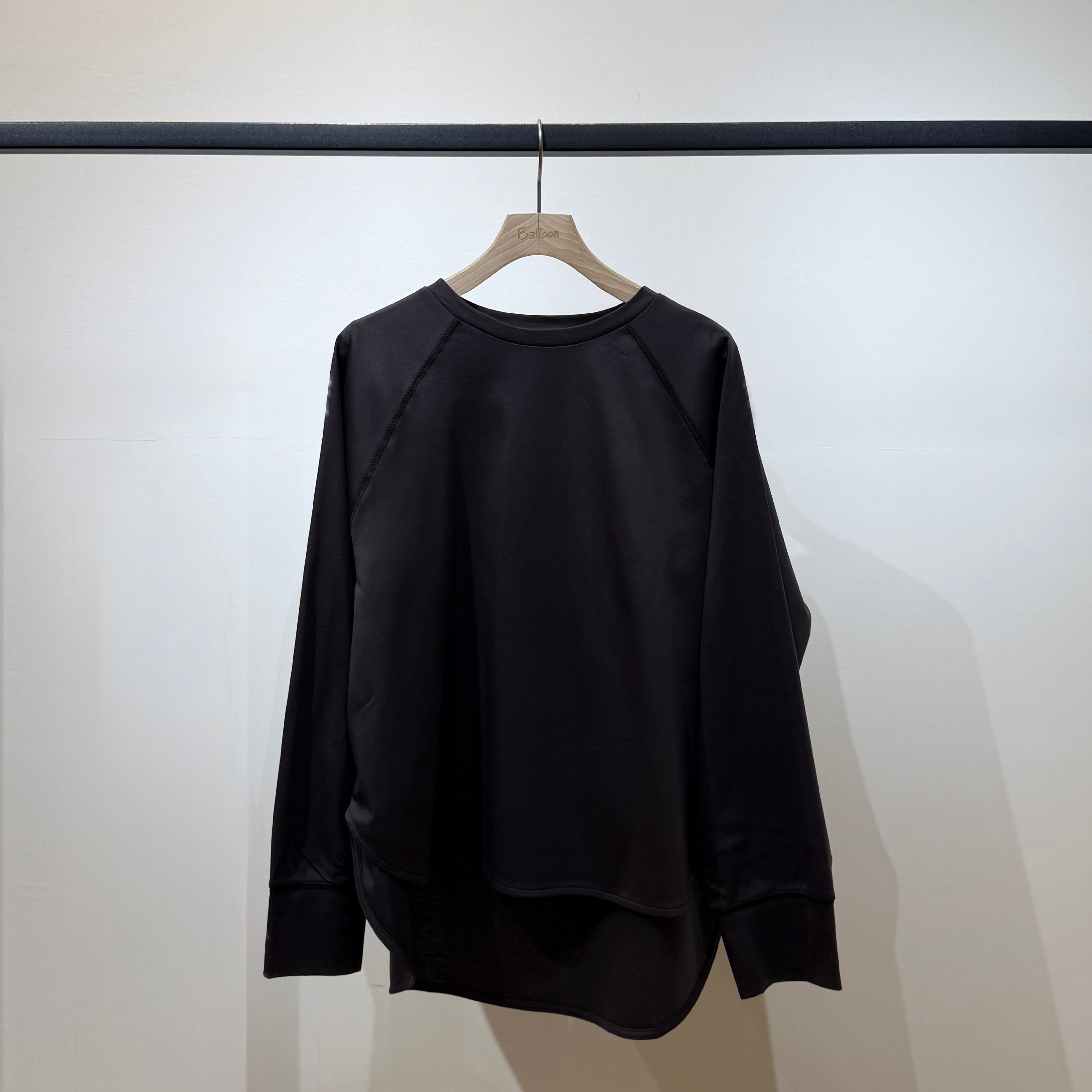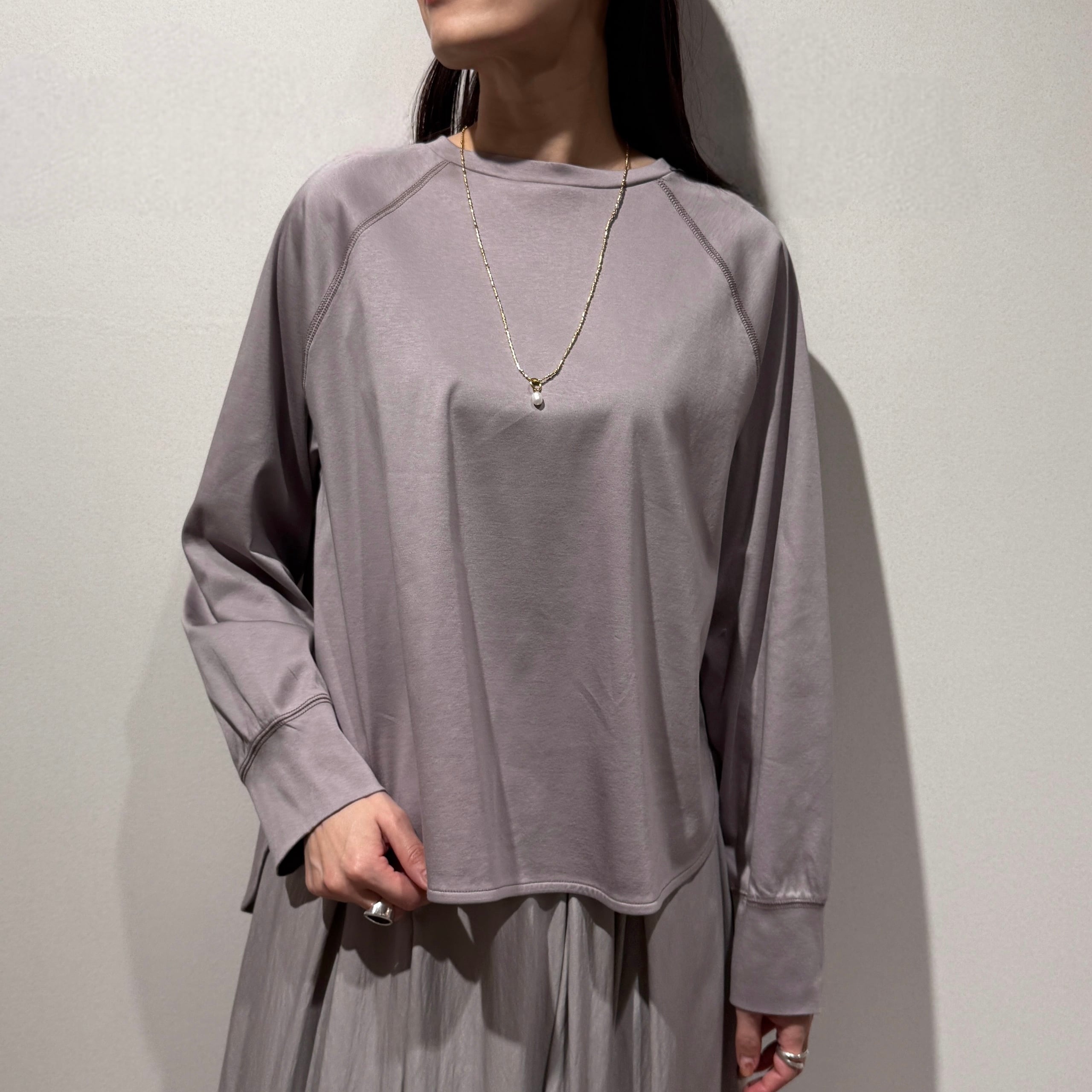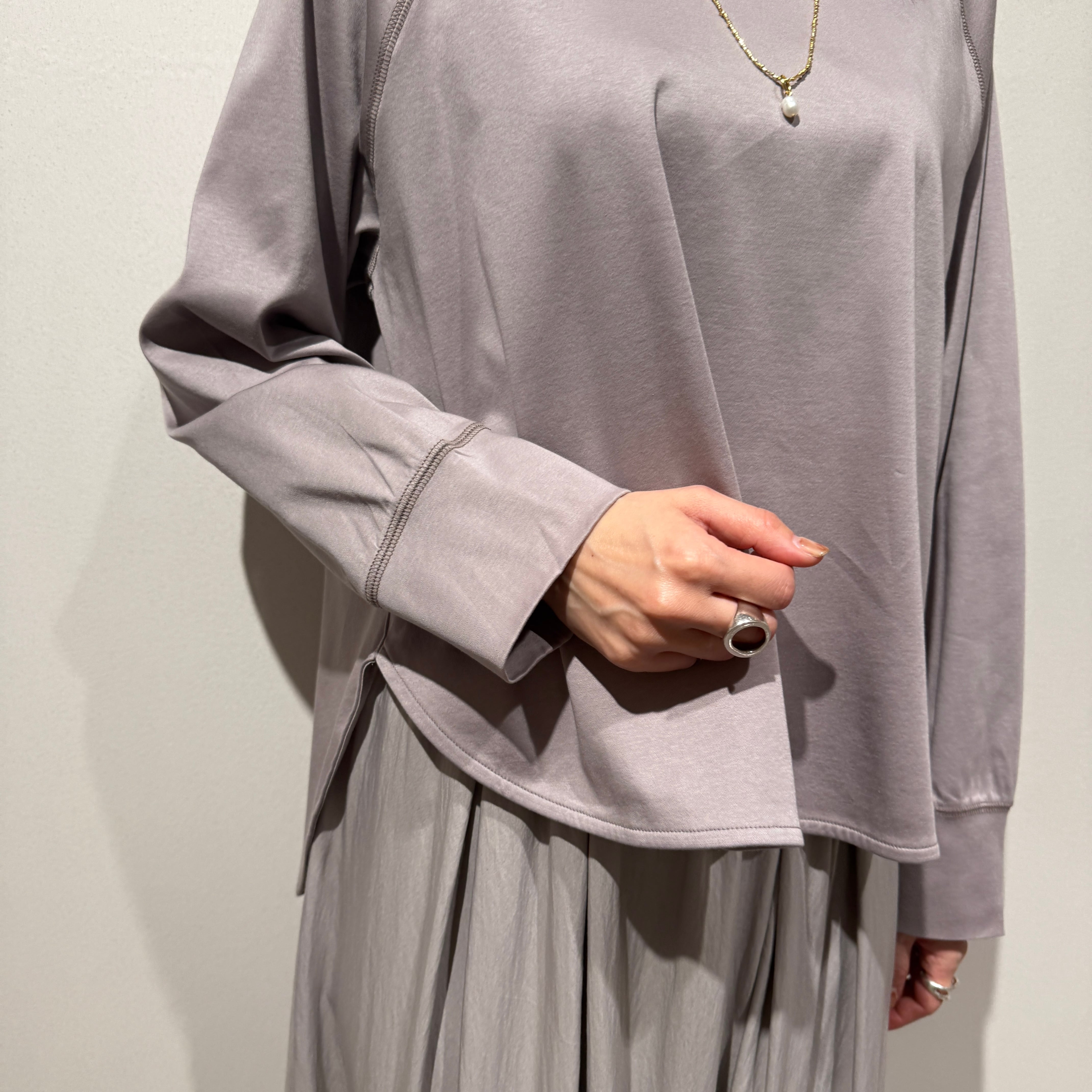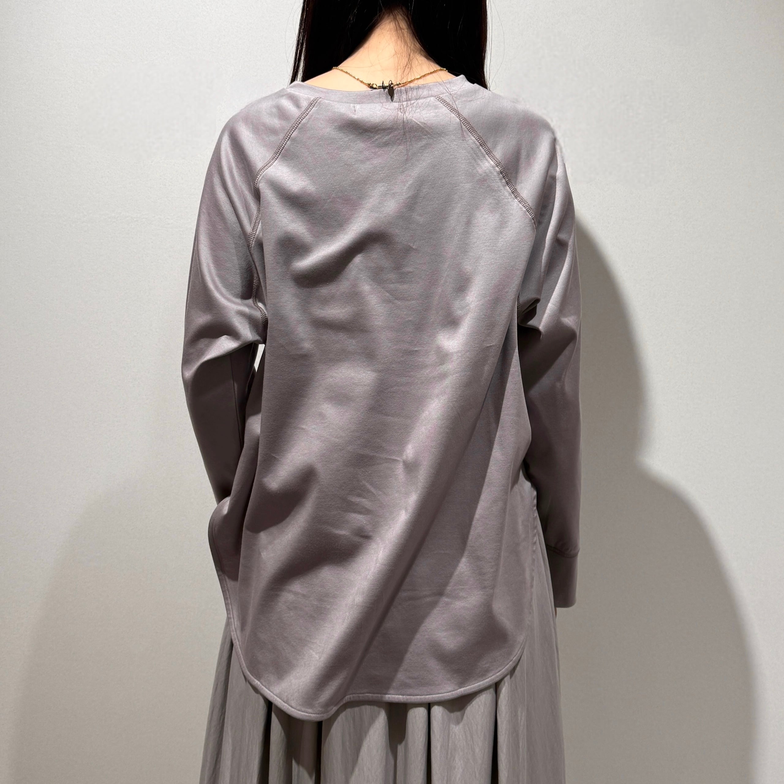 ラグランスリーブのゆったり設計に、前後差のある着丈とラウンド裾で抜け感のあるシルエット。