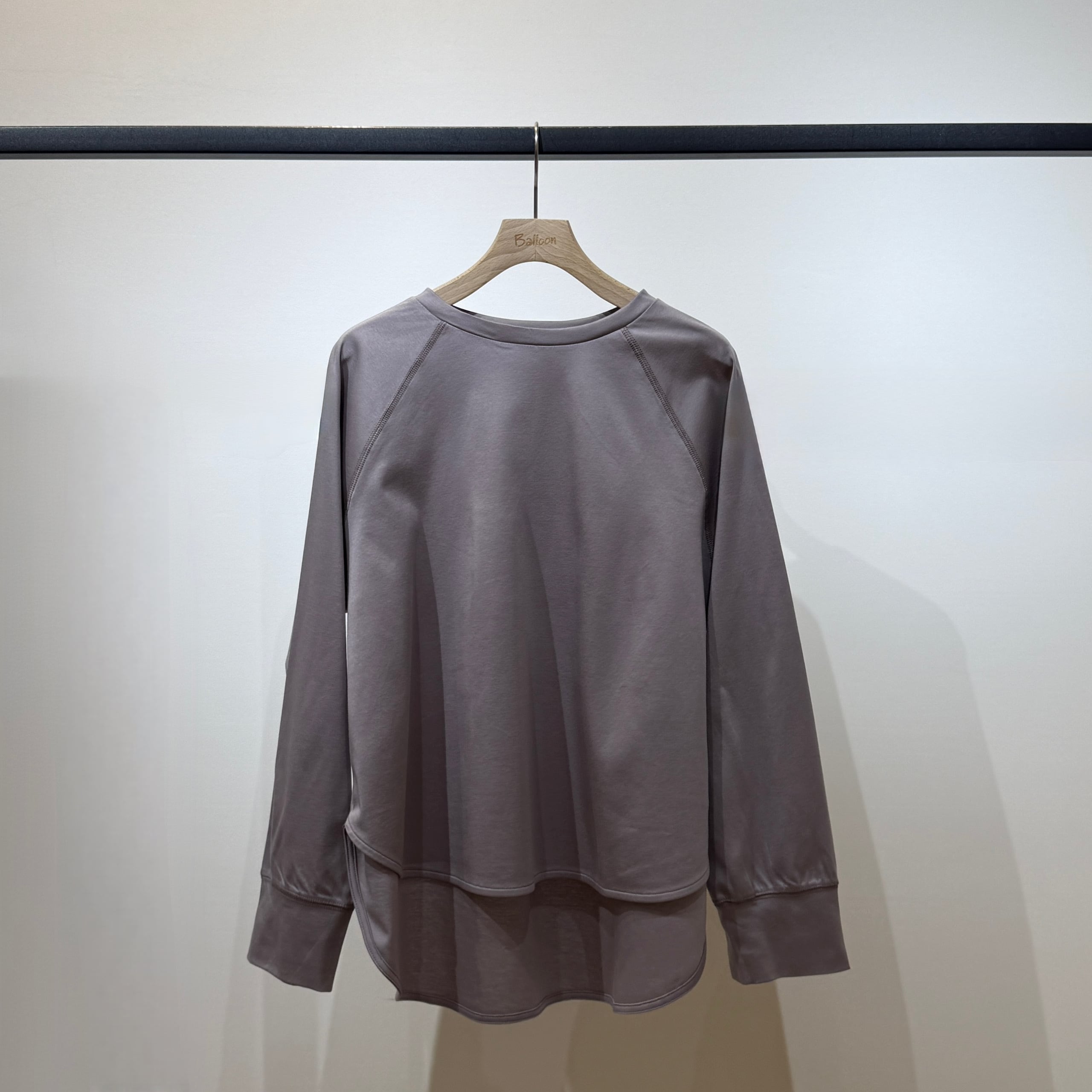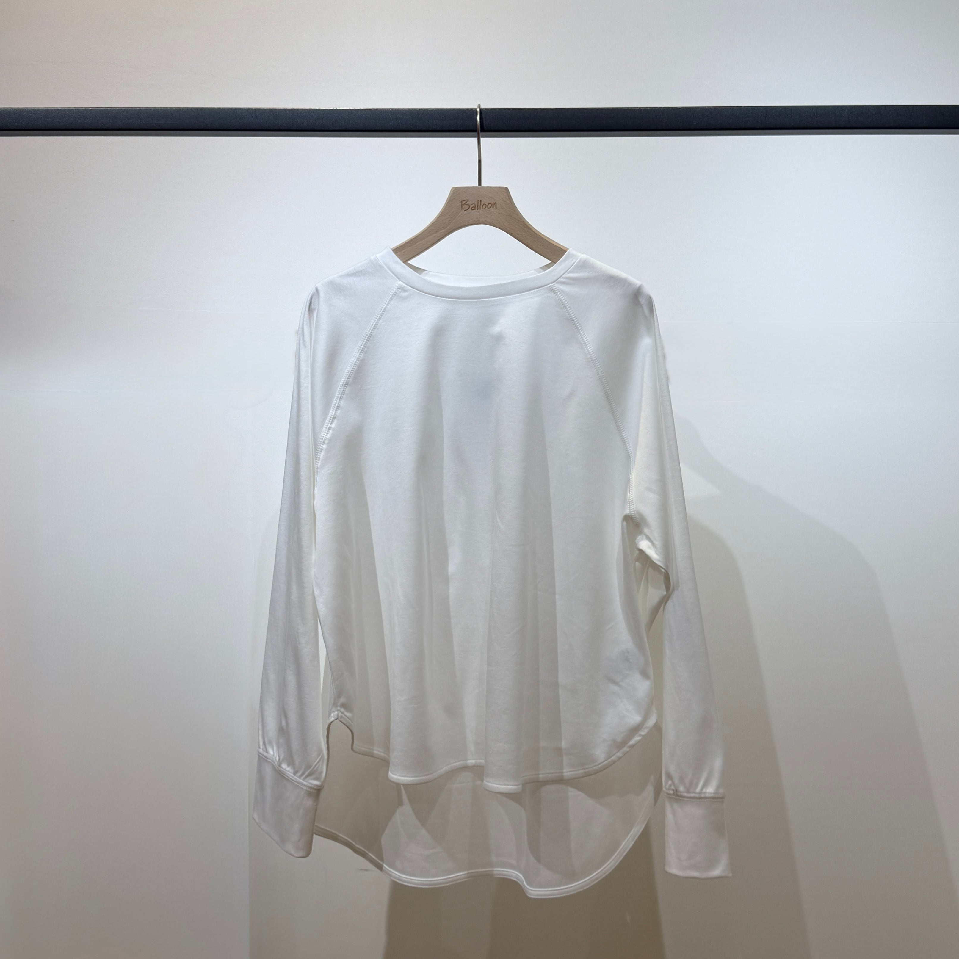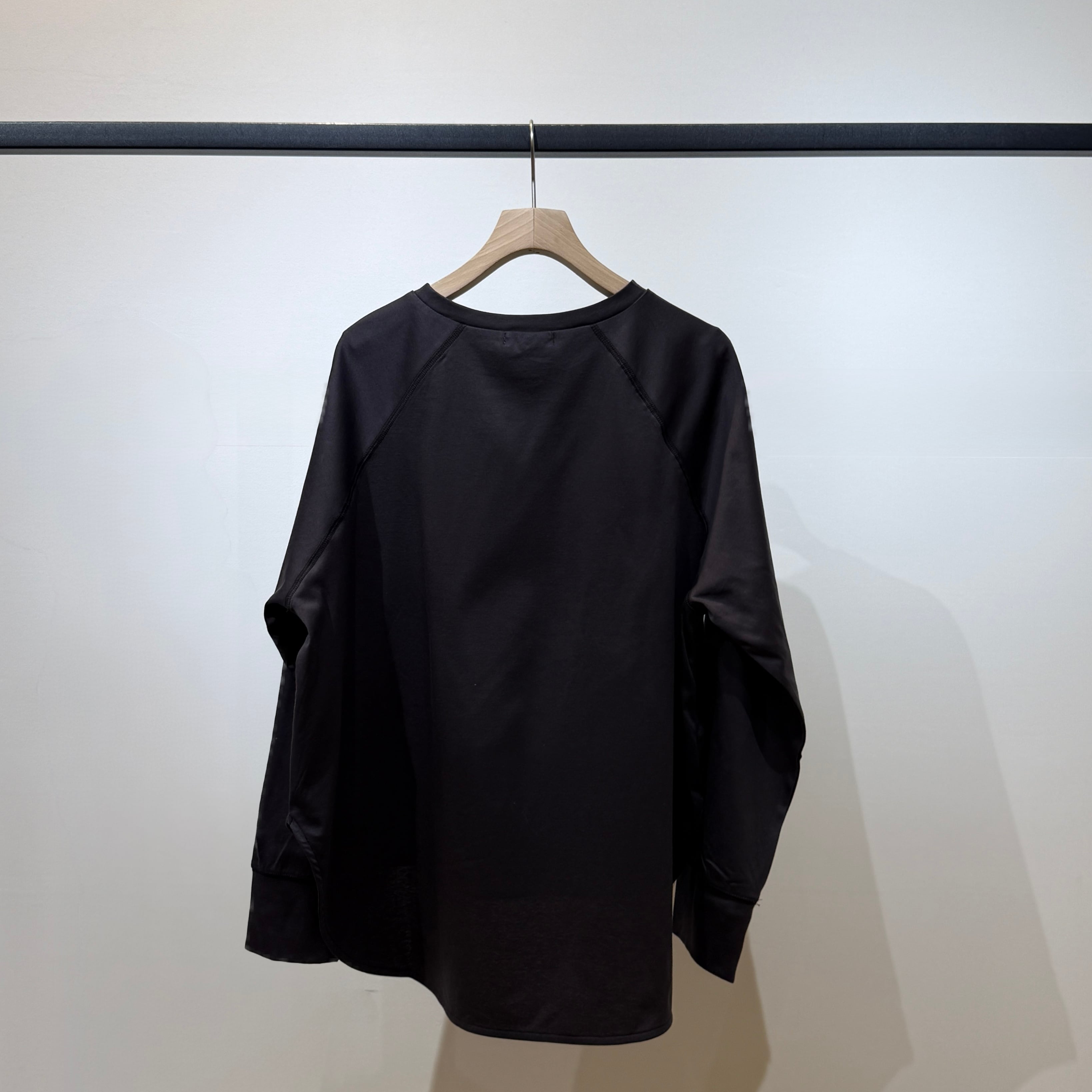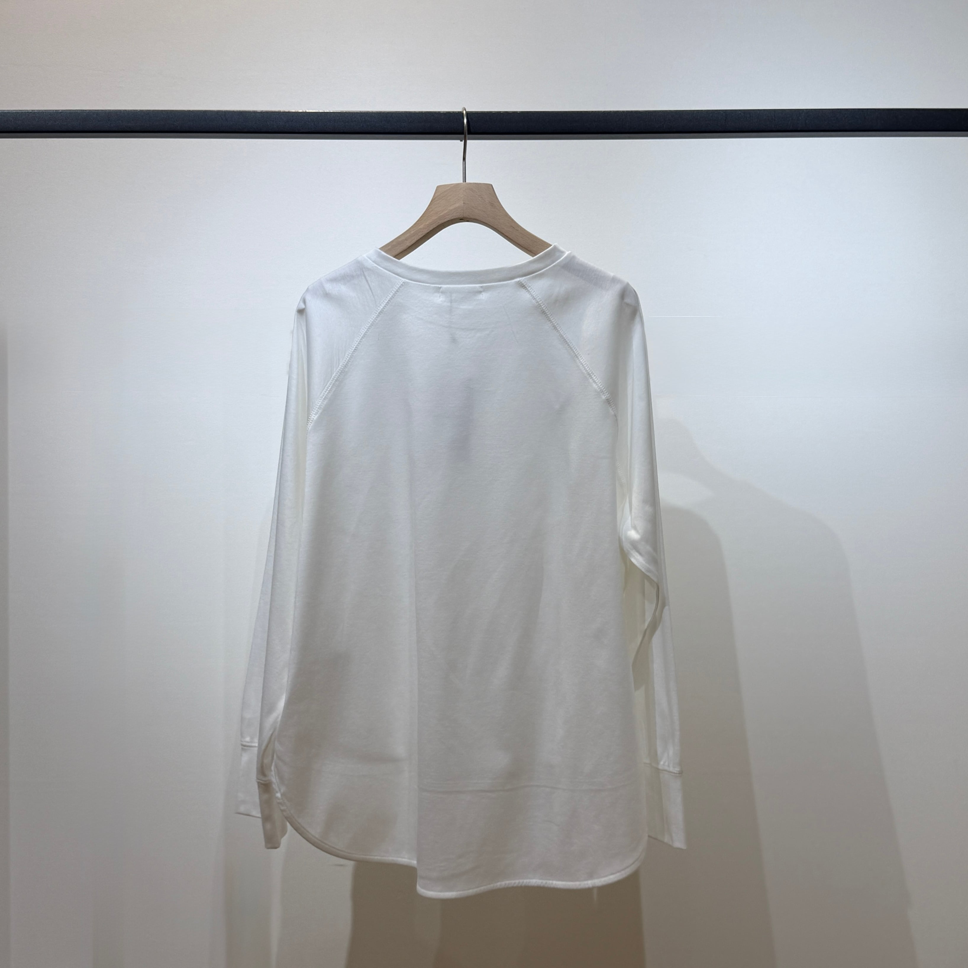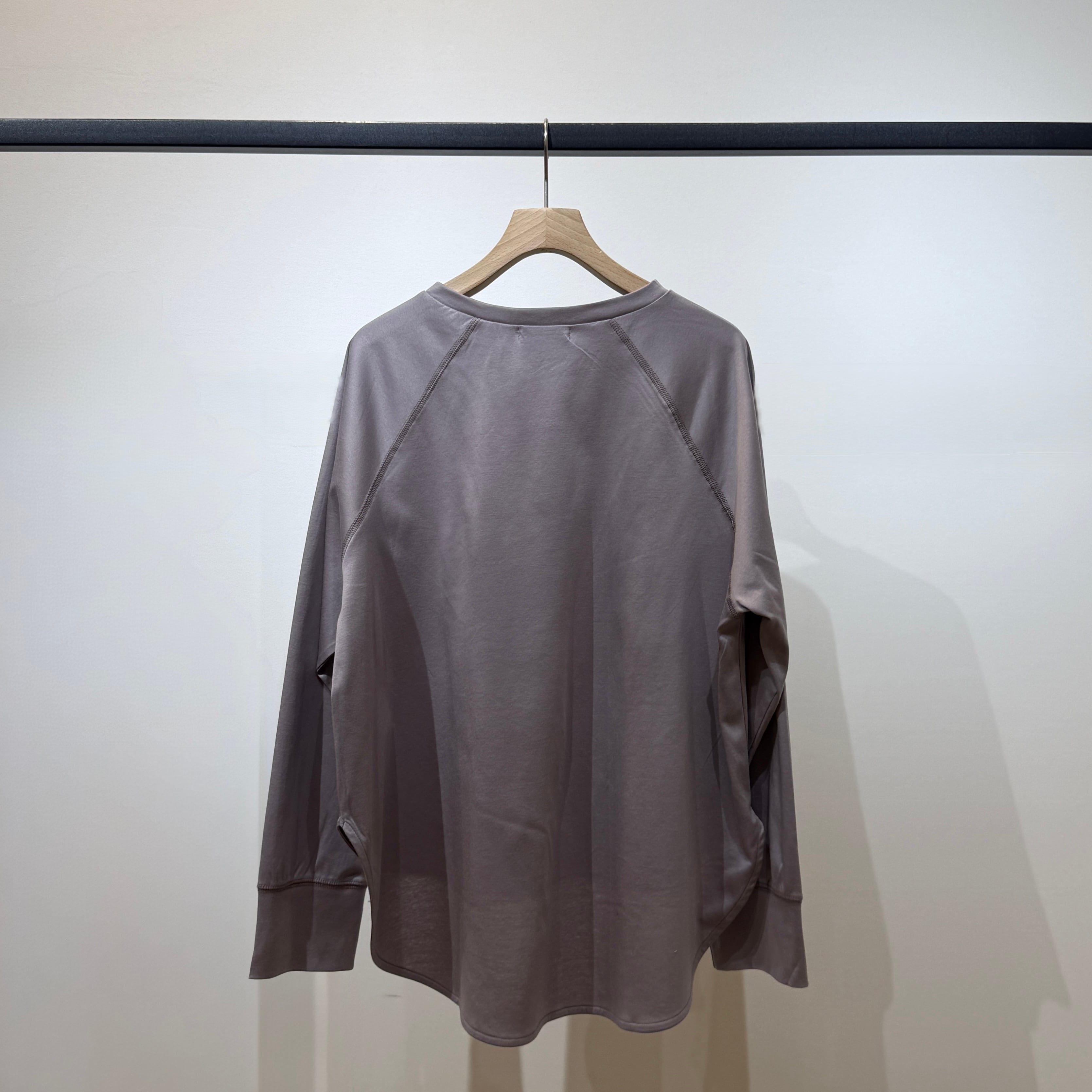 ラグランスリーブのゆったり設計に、前後差のある着丈とラウンド裾で抜け感のあるシルエット。